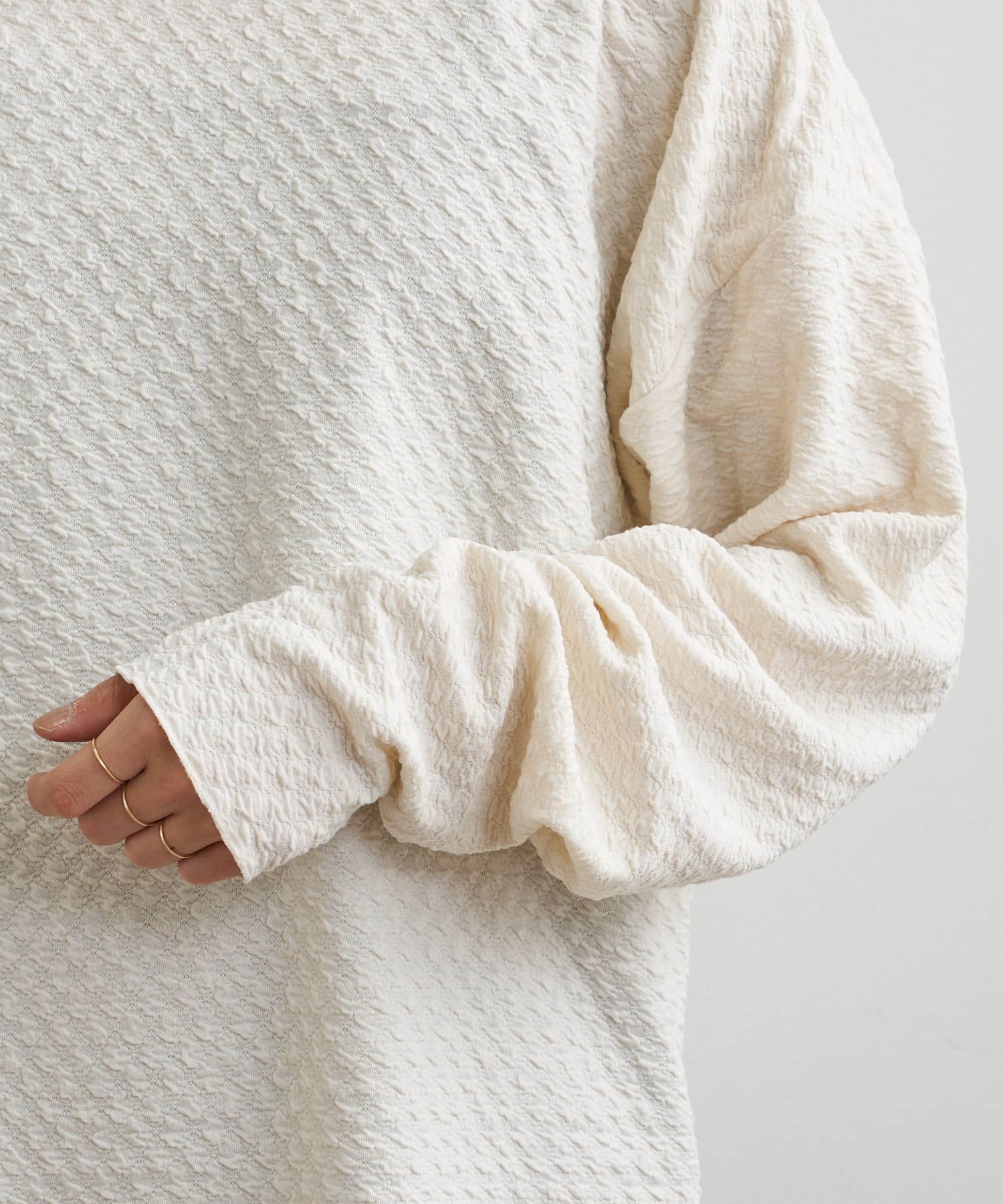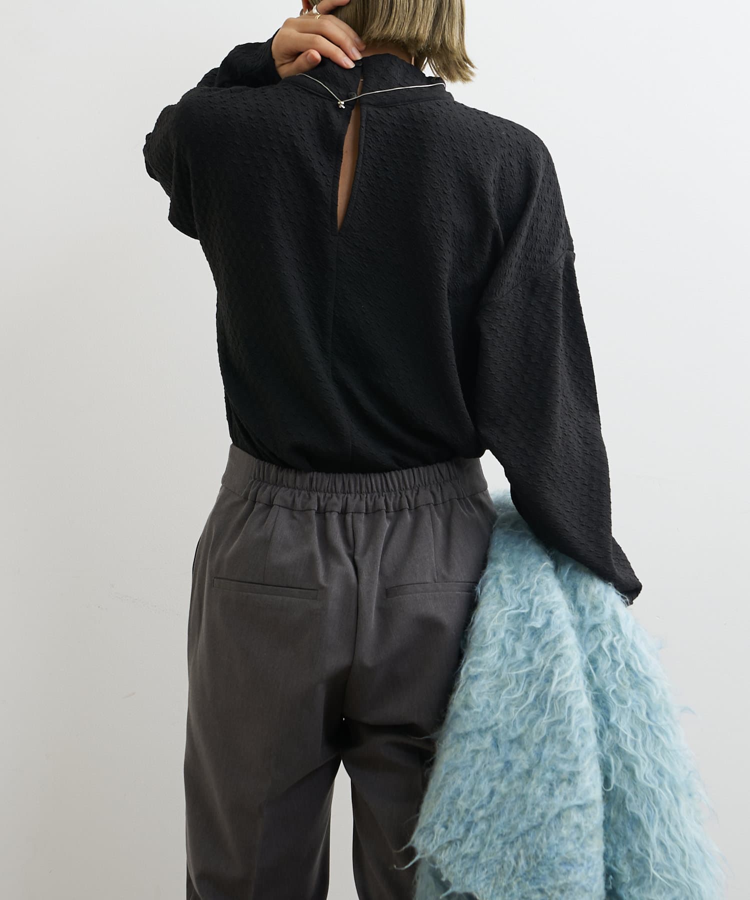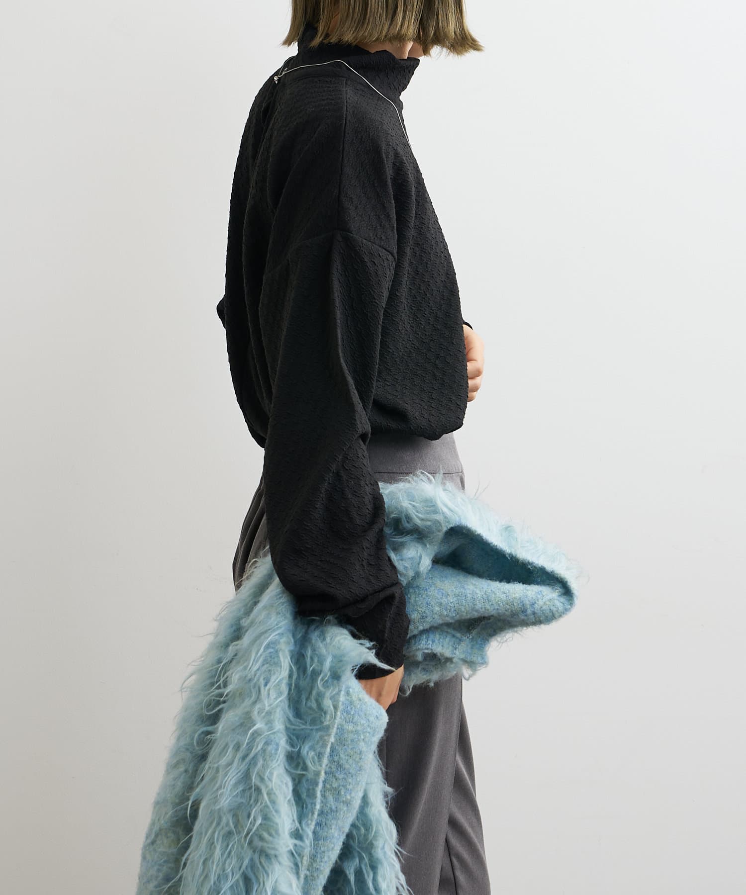 ・ぽこぽことした凹凸のある素材が特徴的で、ニットとの合わせはもちろん一枚でも様になるハイネックプルオーバー。
