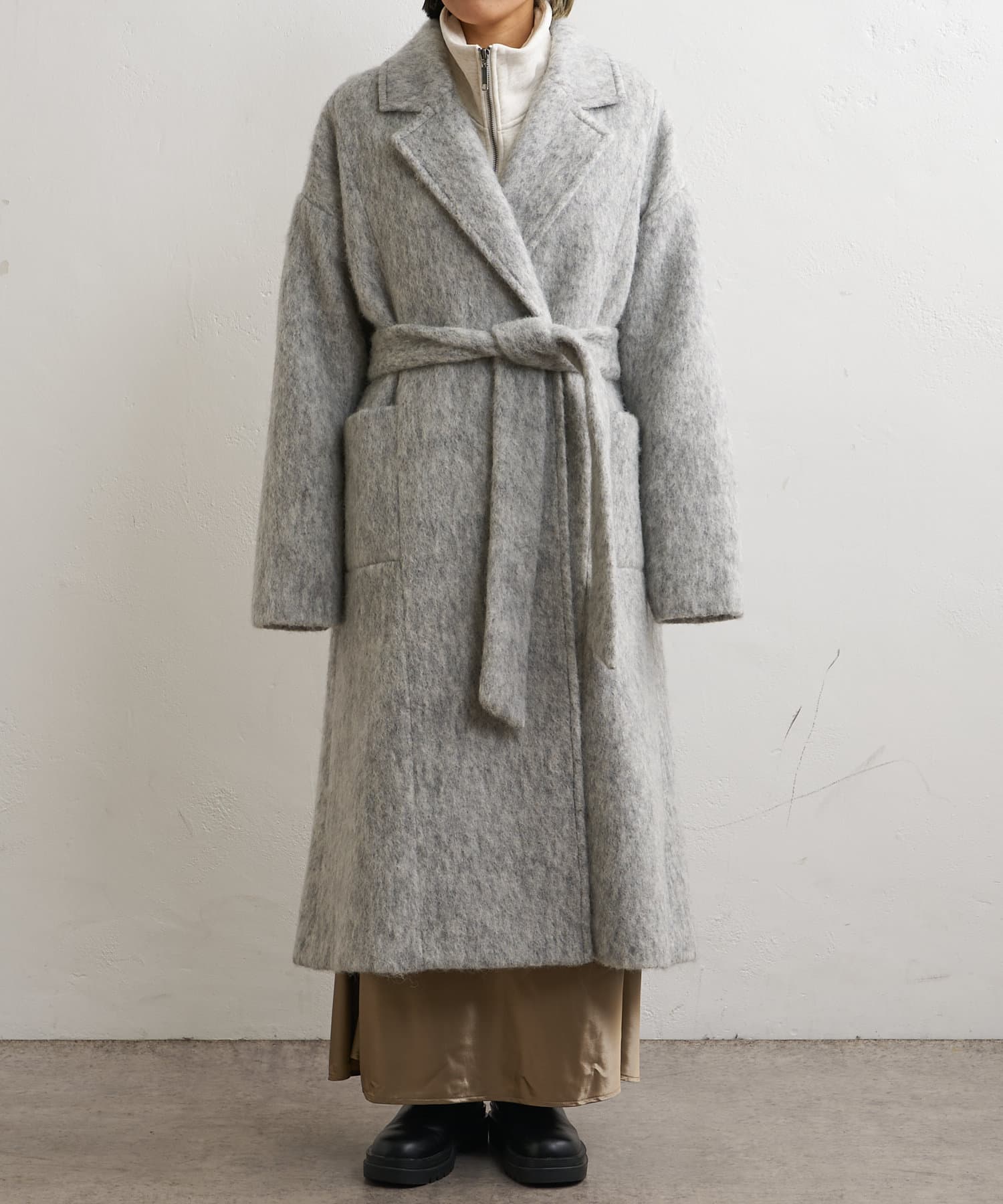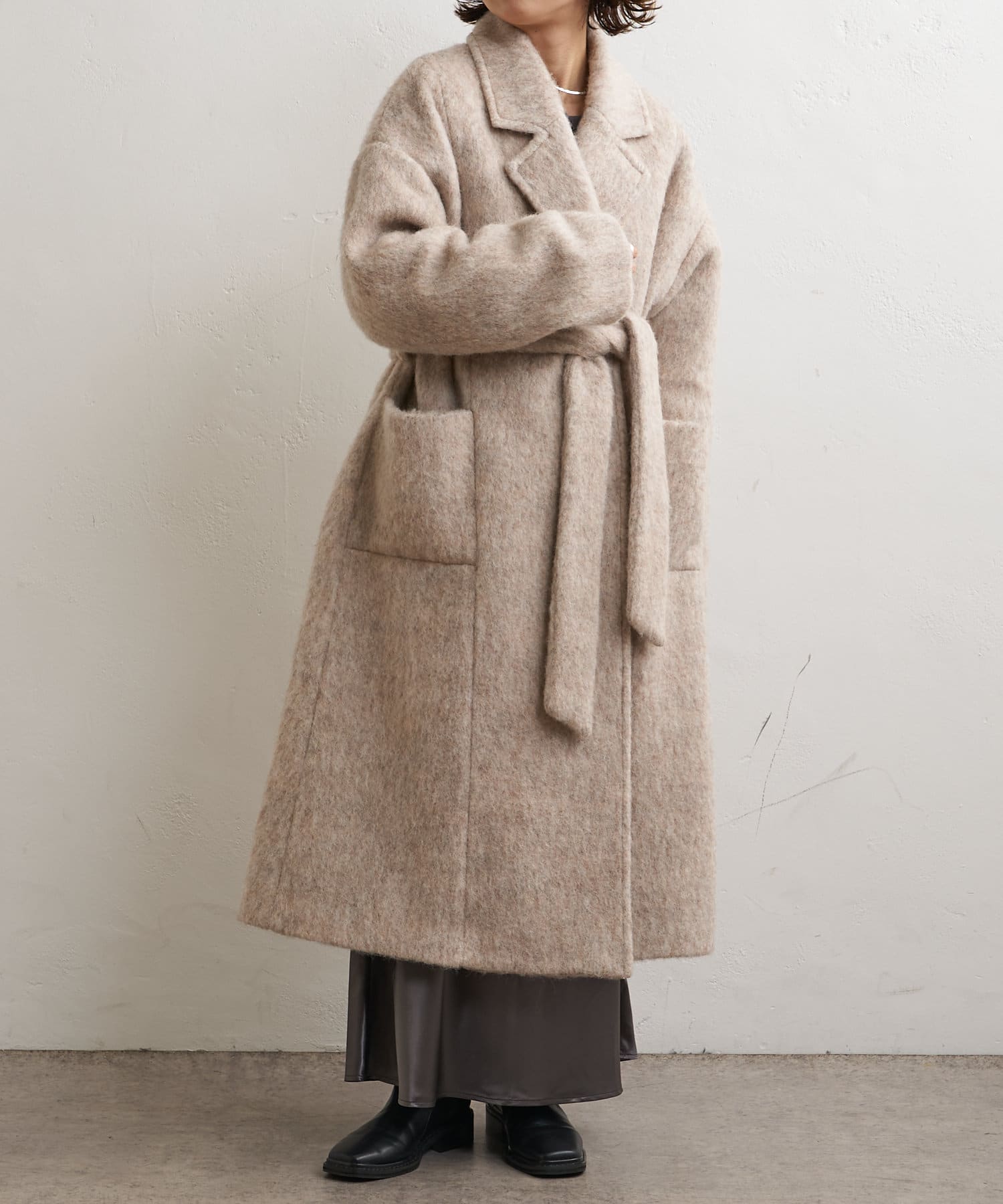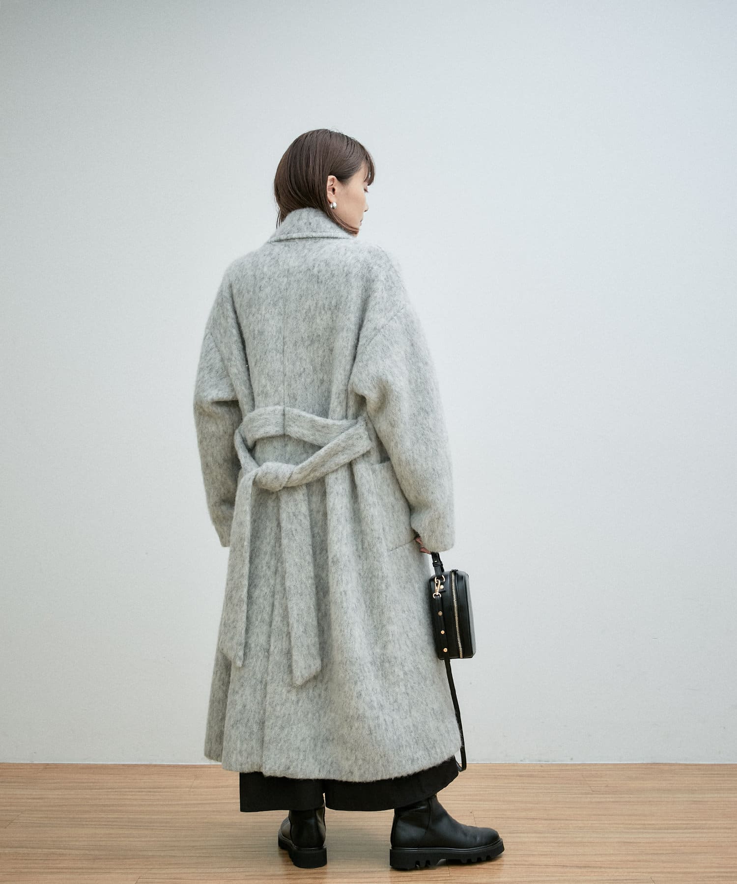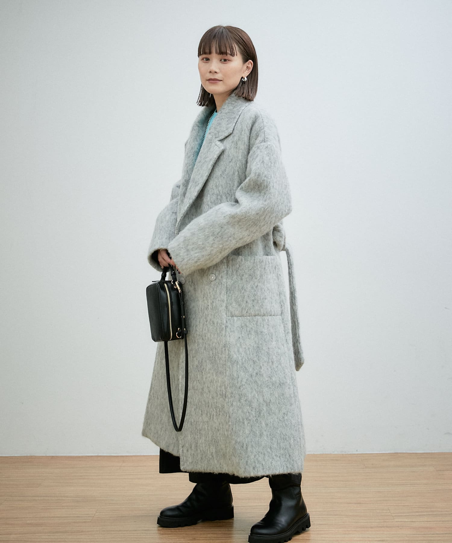 ・同素材のベルトをラフに結んだ着こなしはもちろん、羽織っての着用も様になる今季おすすめコートです。
