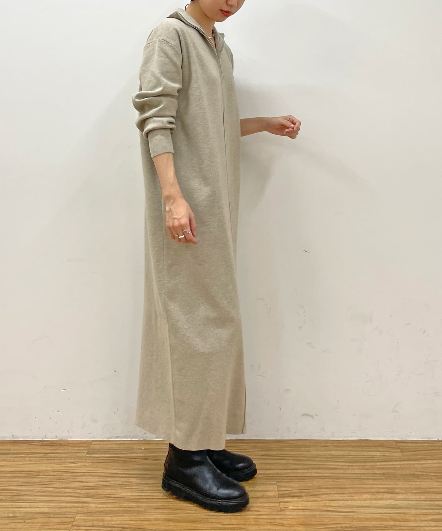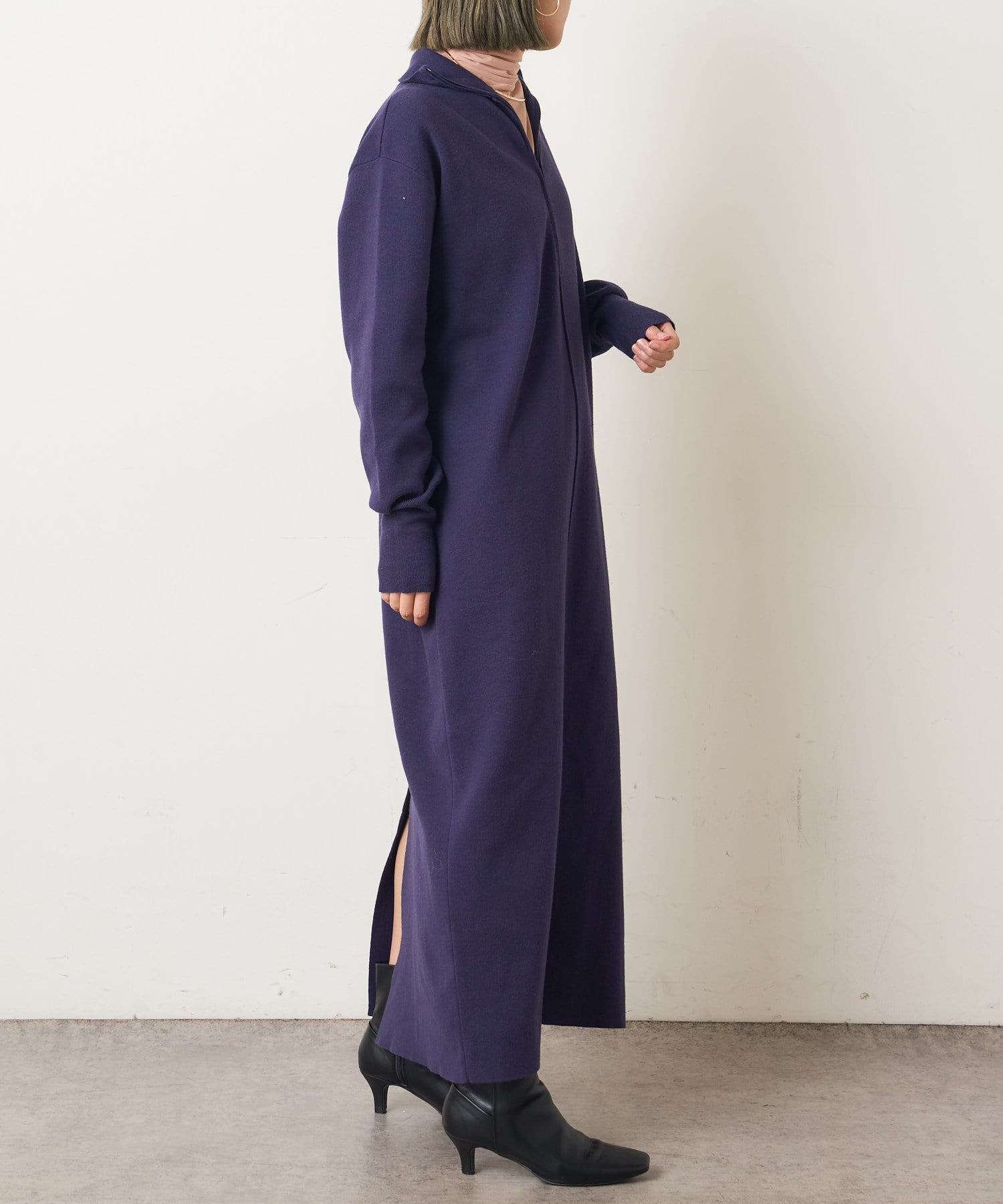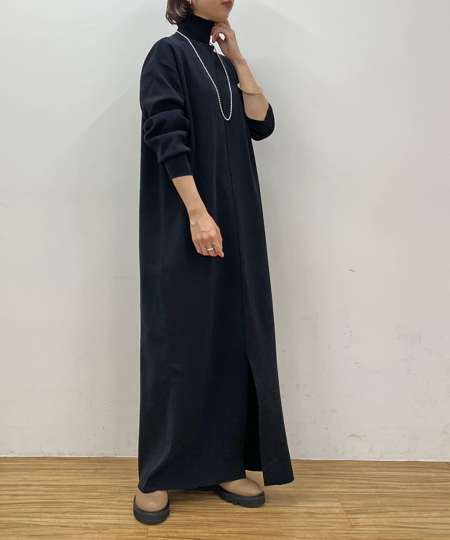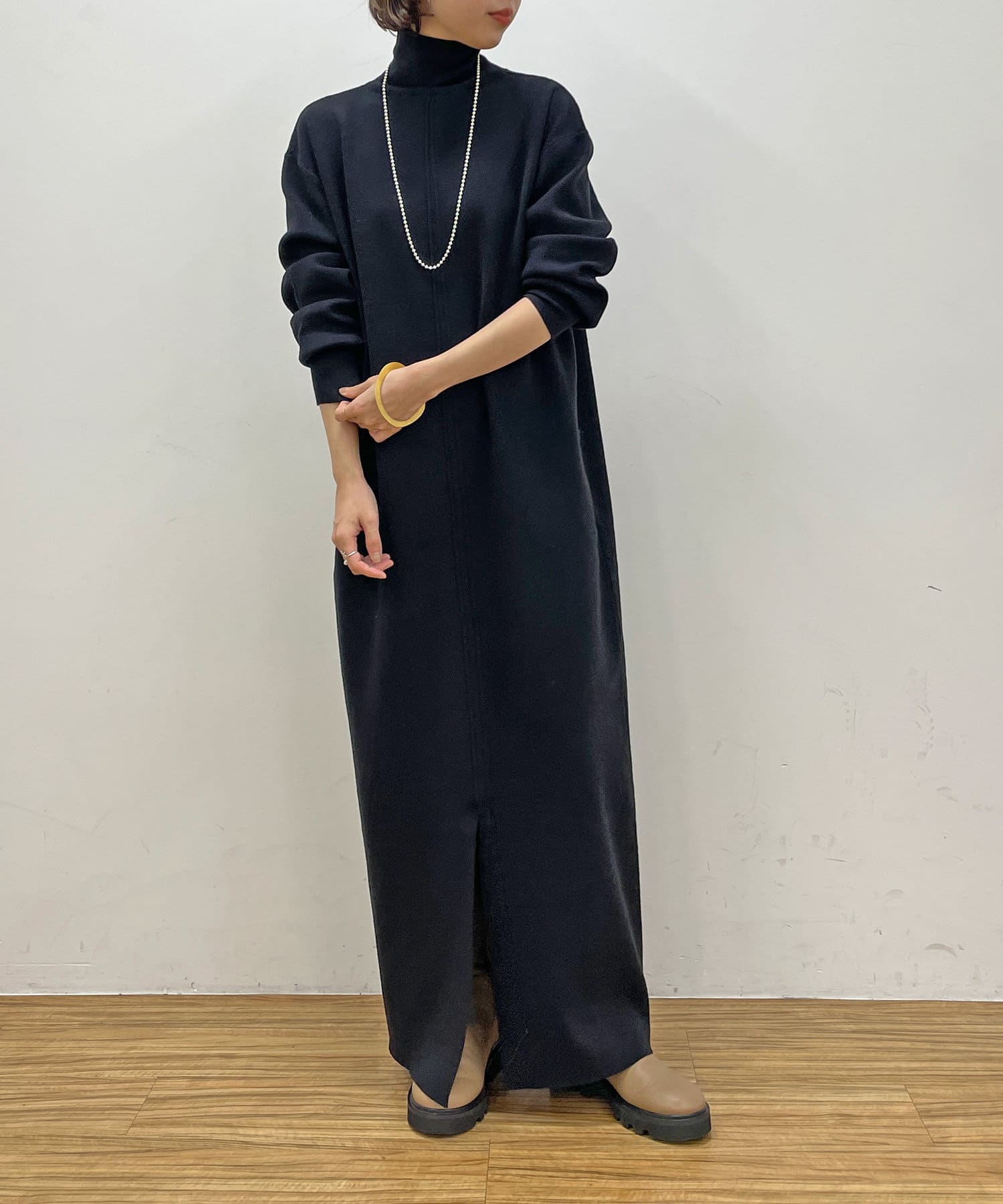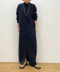 ・重たくなりがちなニットワンピースですが、裾にスリットがあるので、抜け感も出るデザインです。