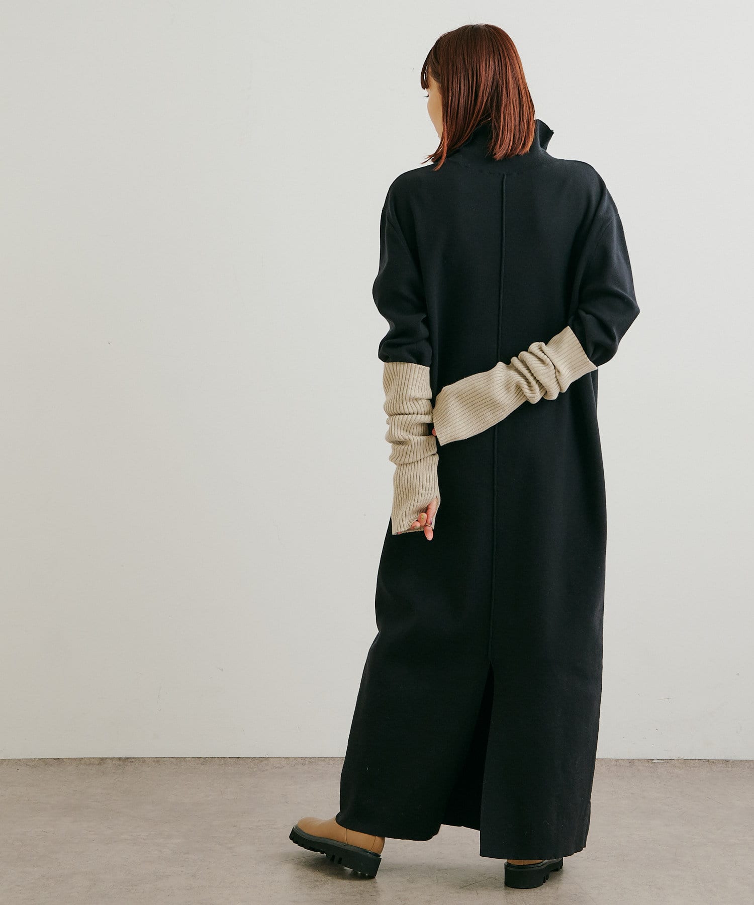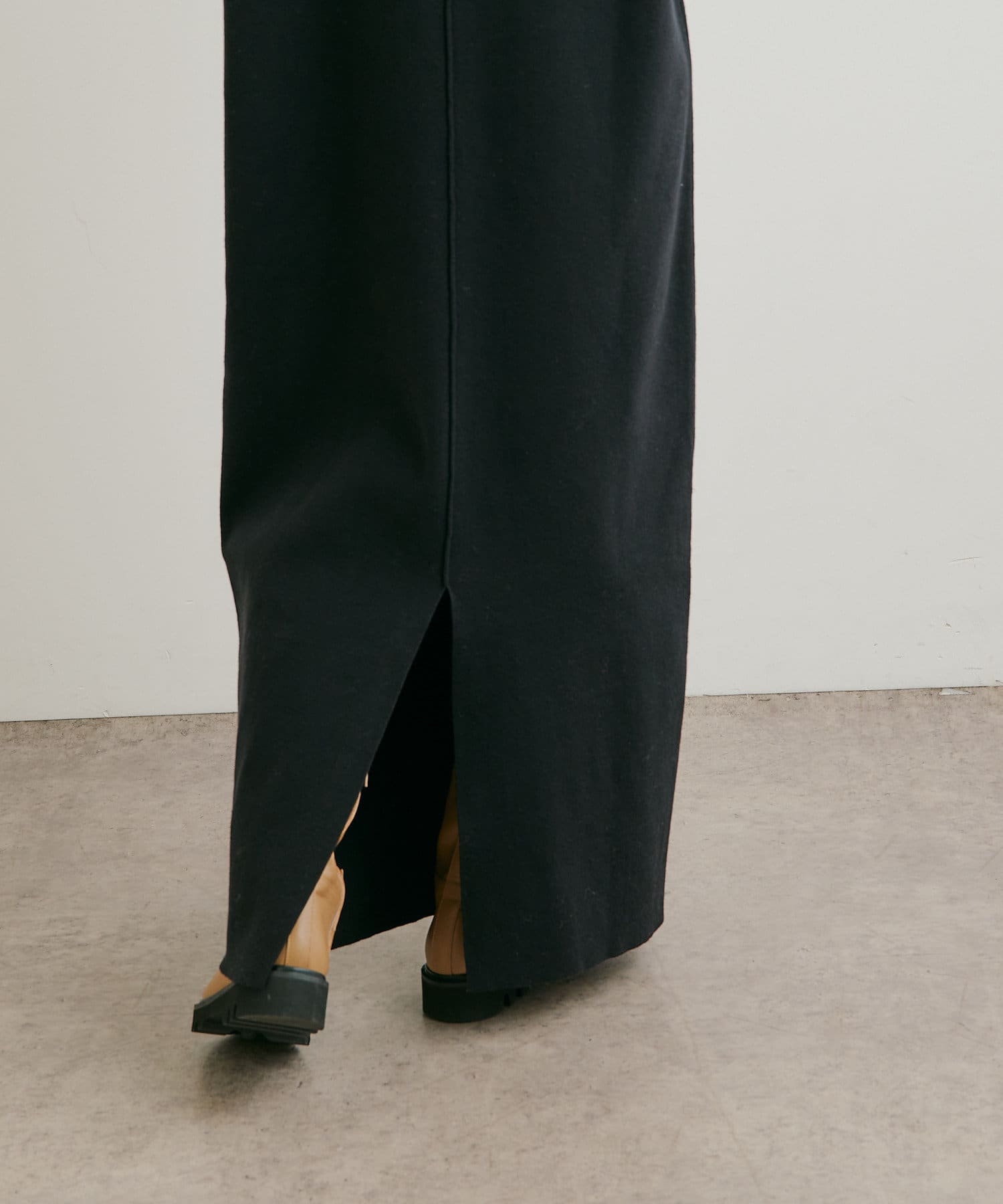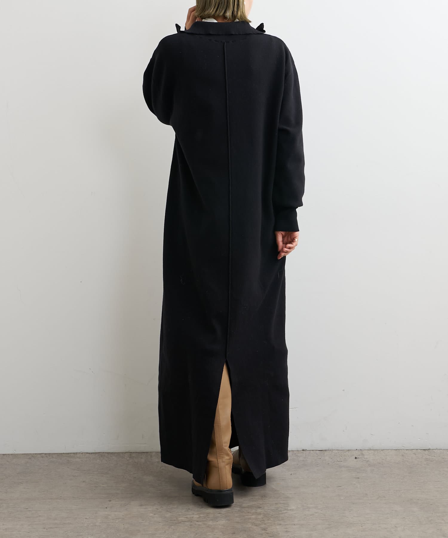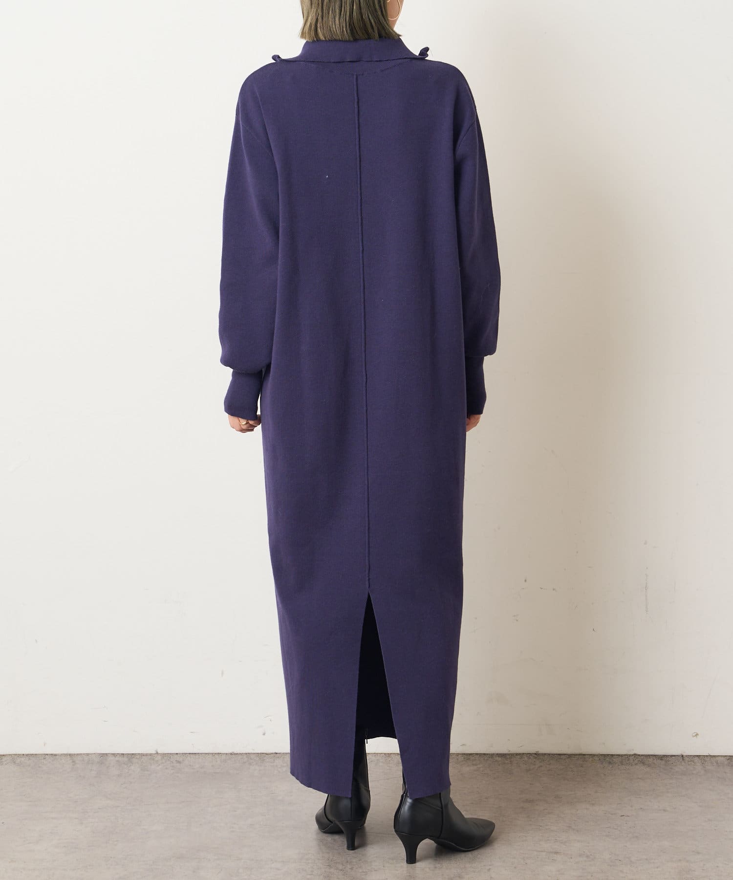 ・重たくなりがちなニットワンピースですが、裾にスリットがあるので、抜け感も出るデザインです。
