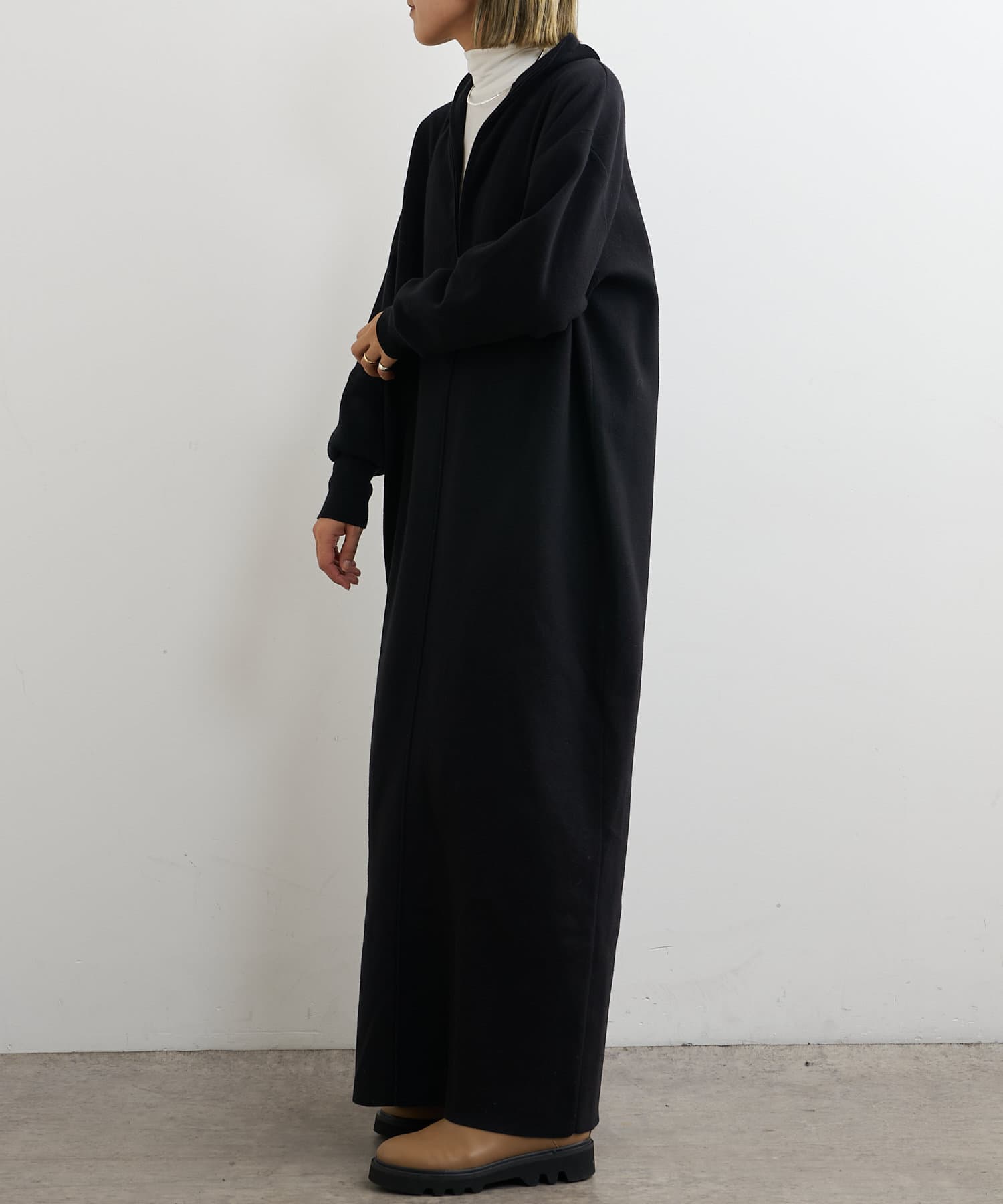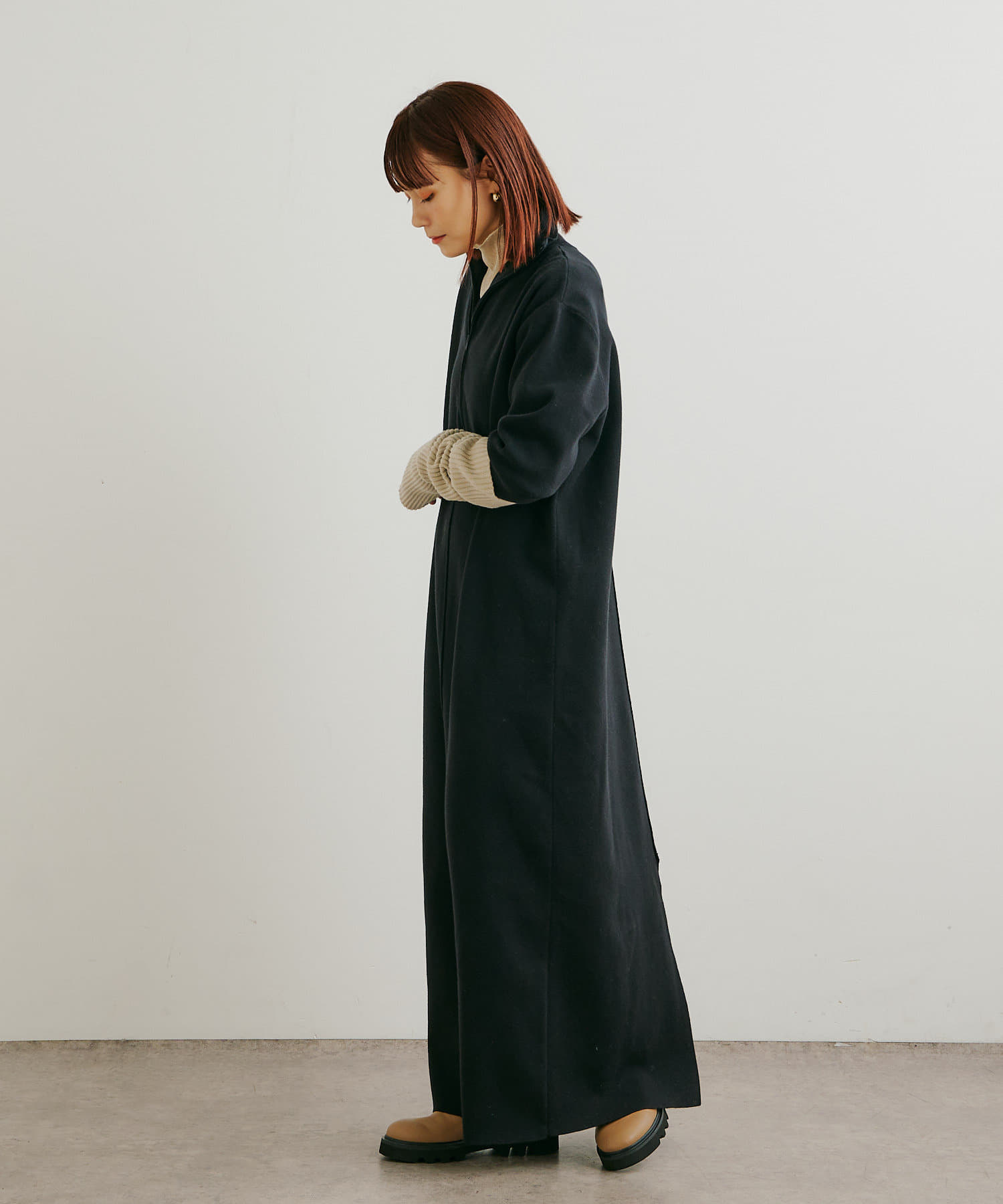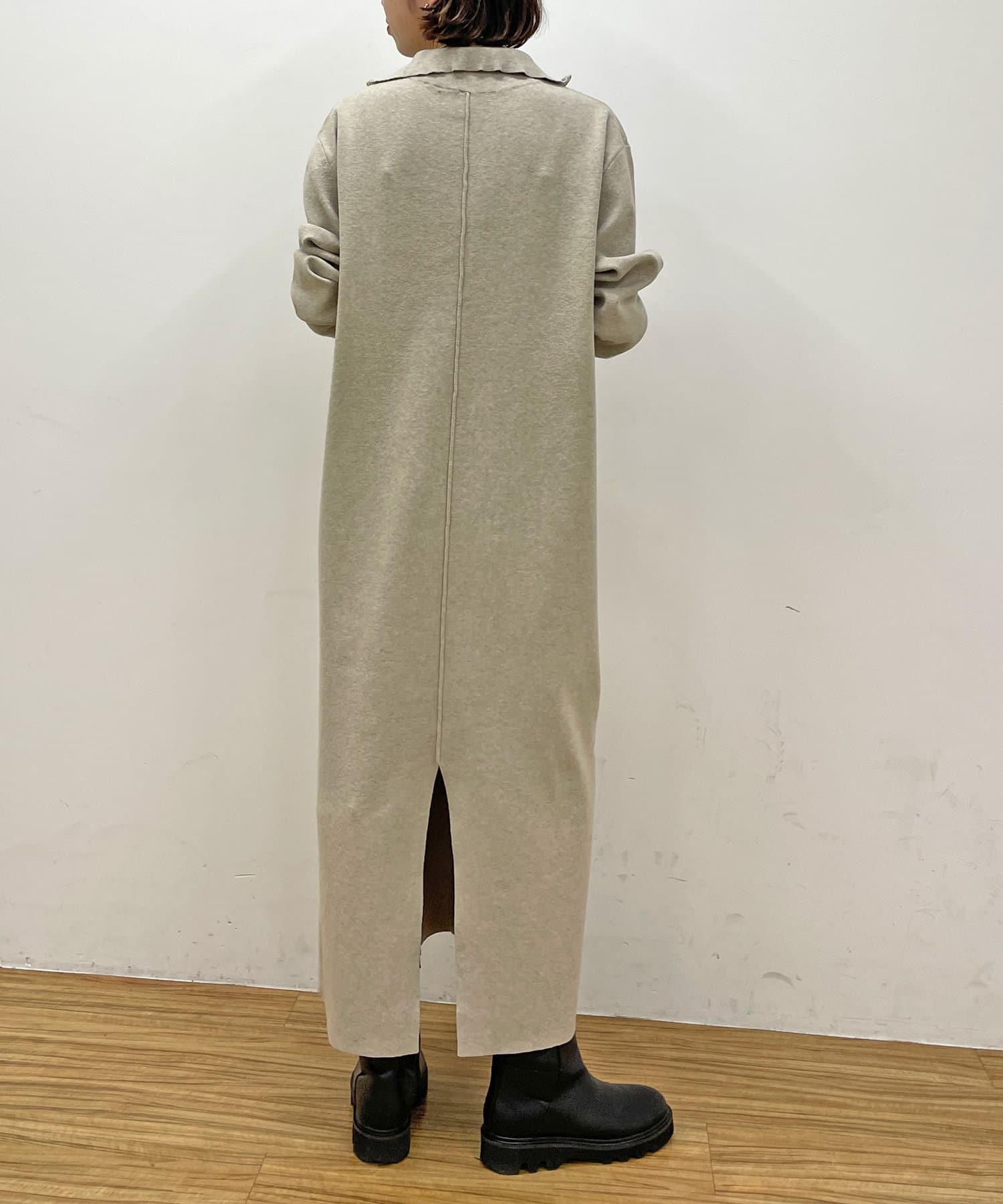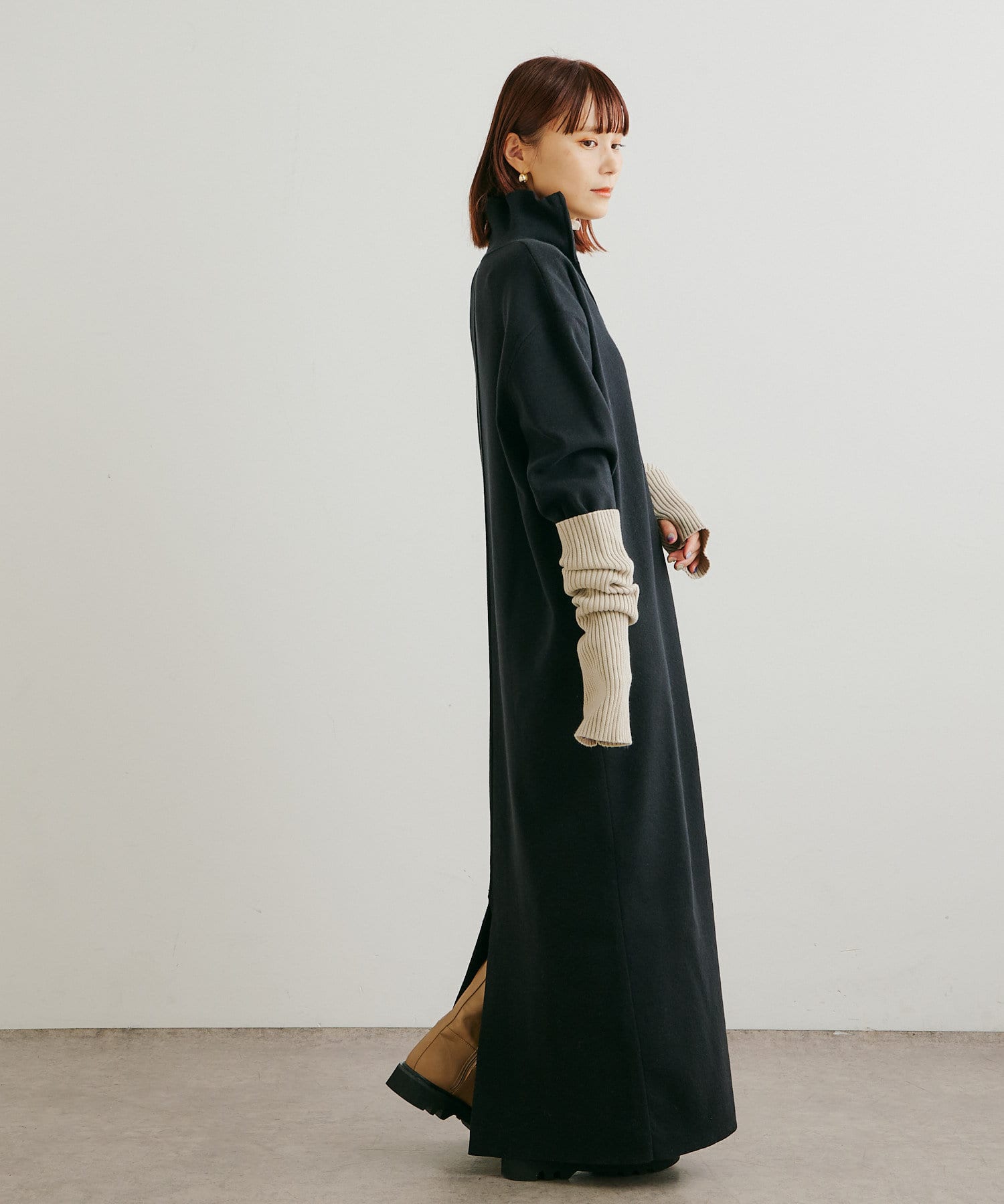 ・重たくなりがちなニットワンピースですが、裾にスリットがあるので、抜け感も出るデザインです。