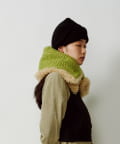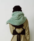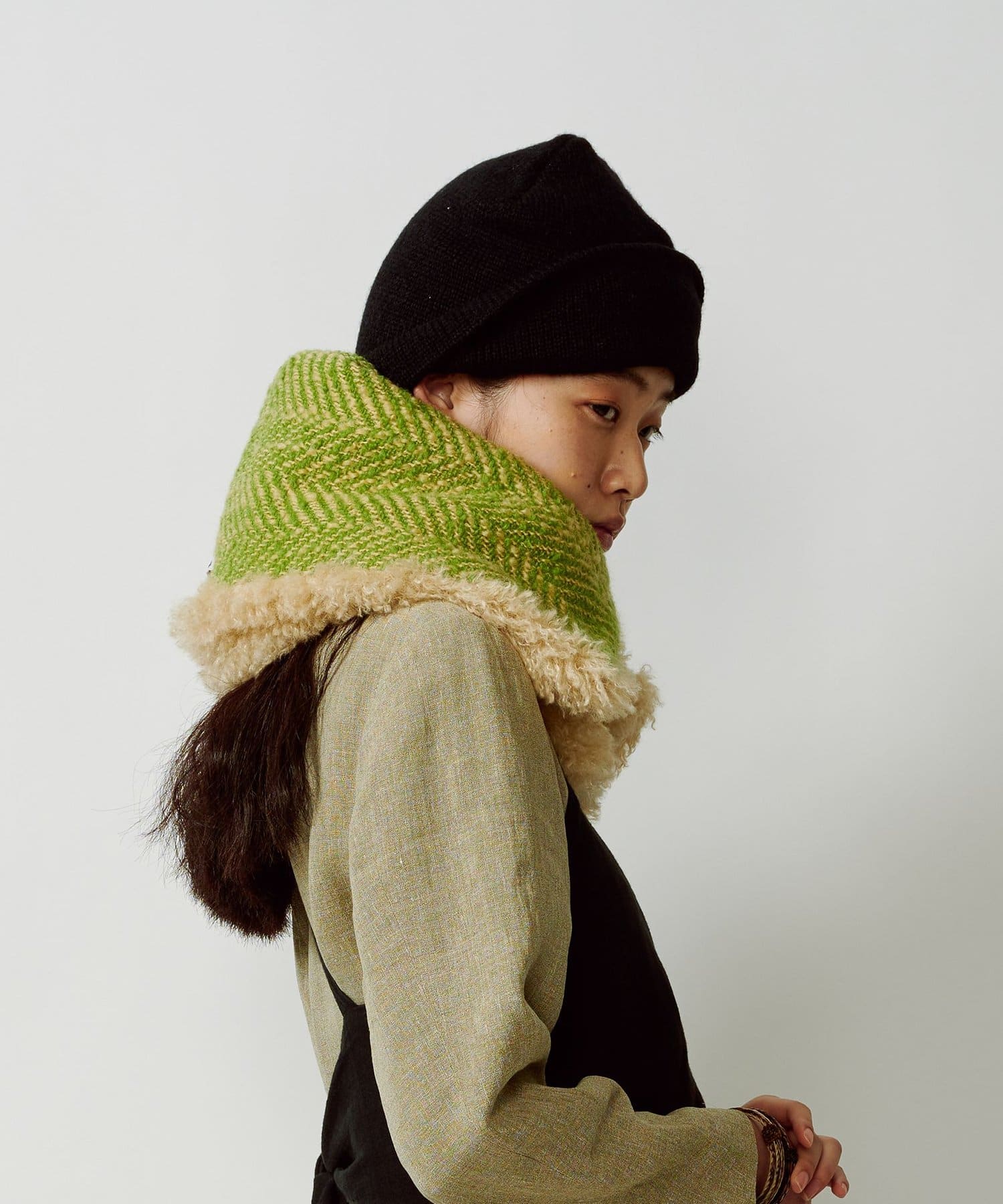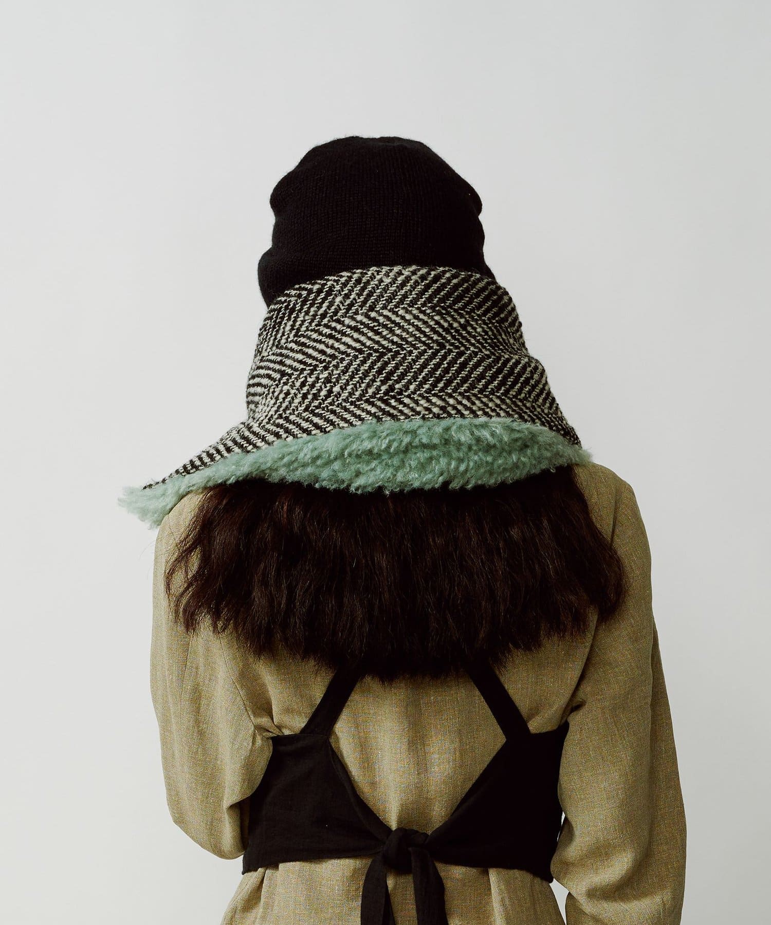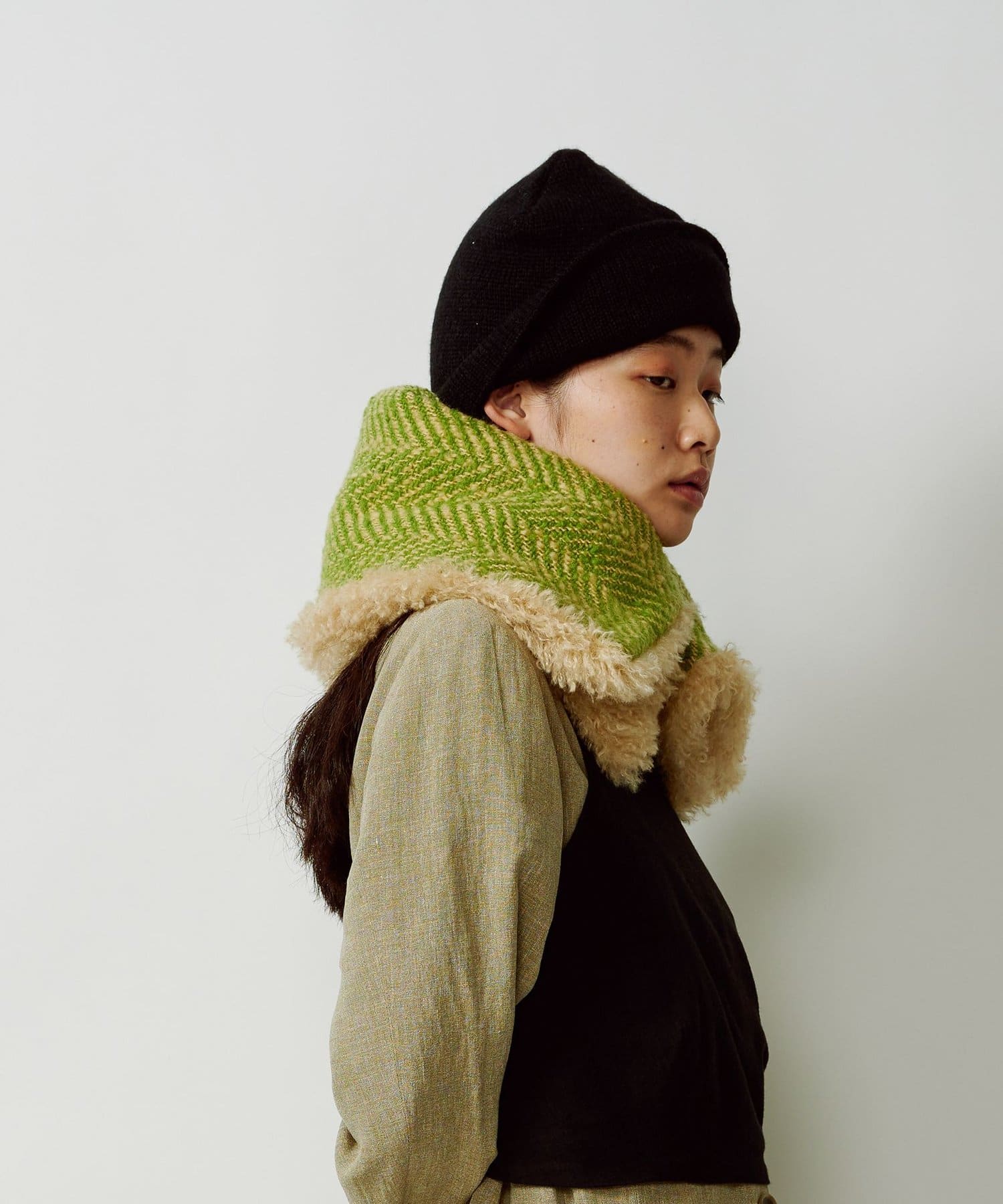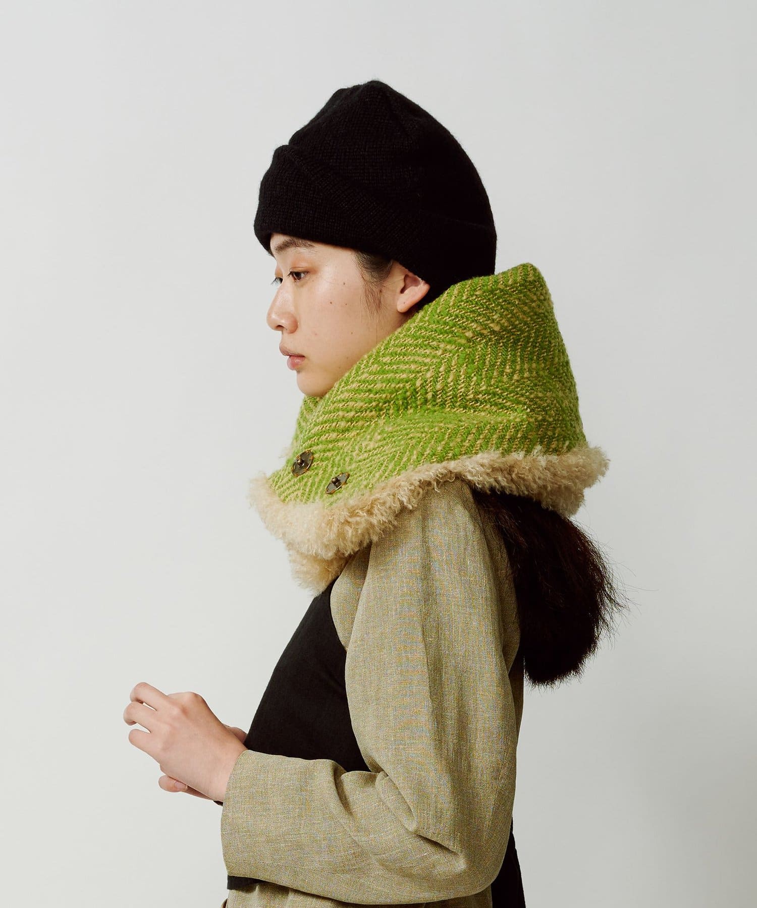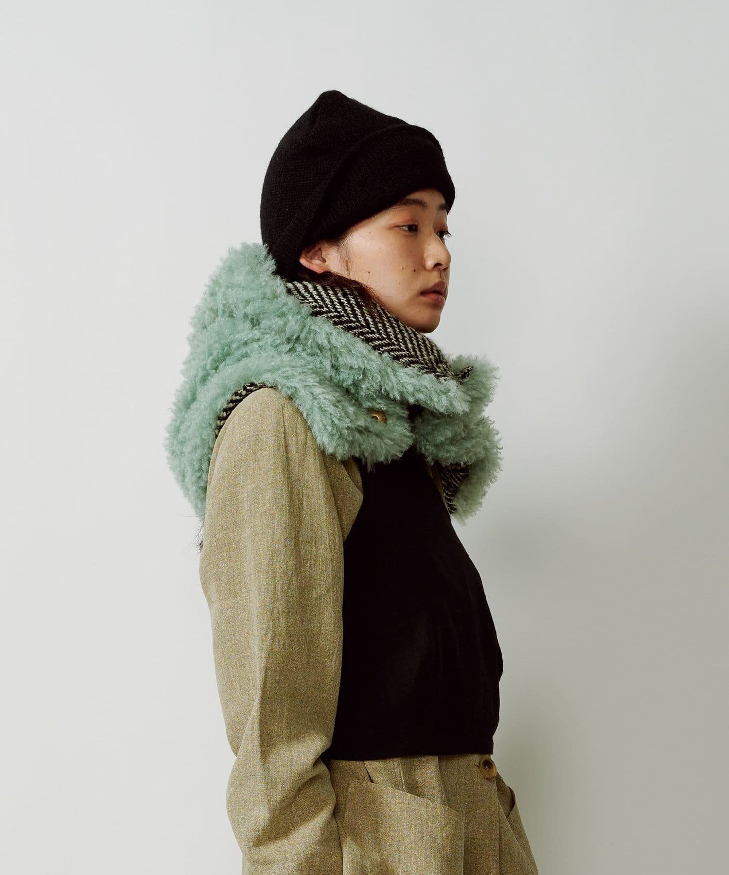 3セットついているスナップボタンの止め方で様々な合わせ方が可能。寒い日には首をしっかりと覆い、ボリュームが欲しいときにはつけ襟やケープ、フードのような合わせ方にも。