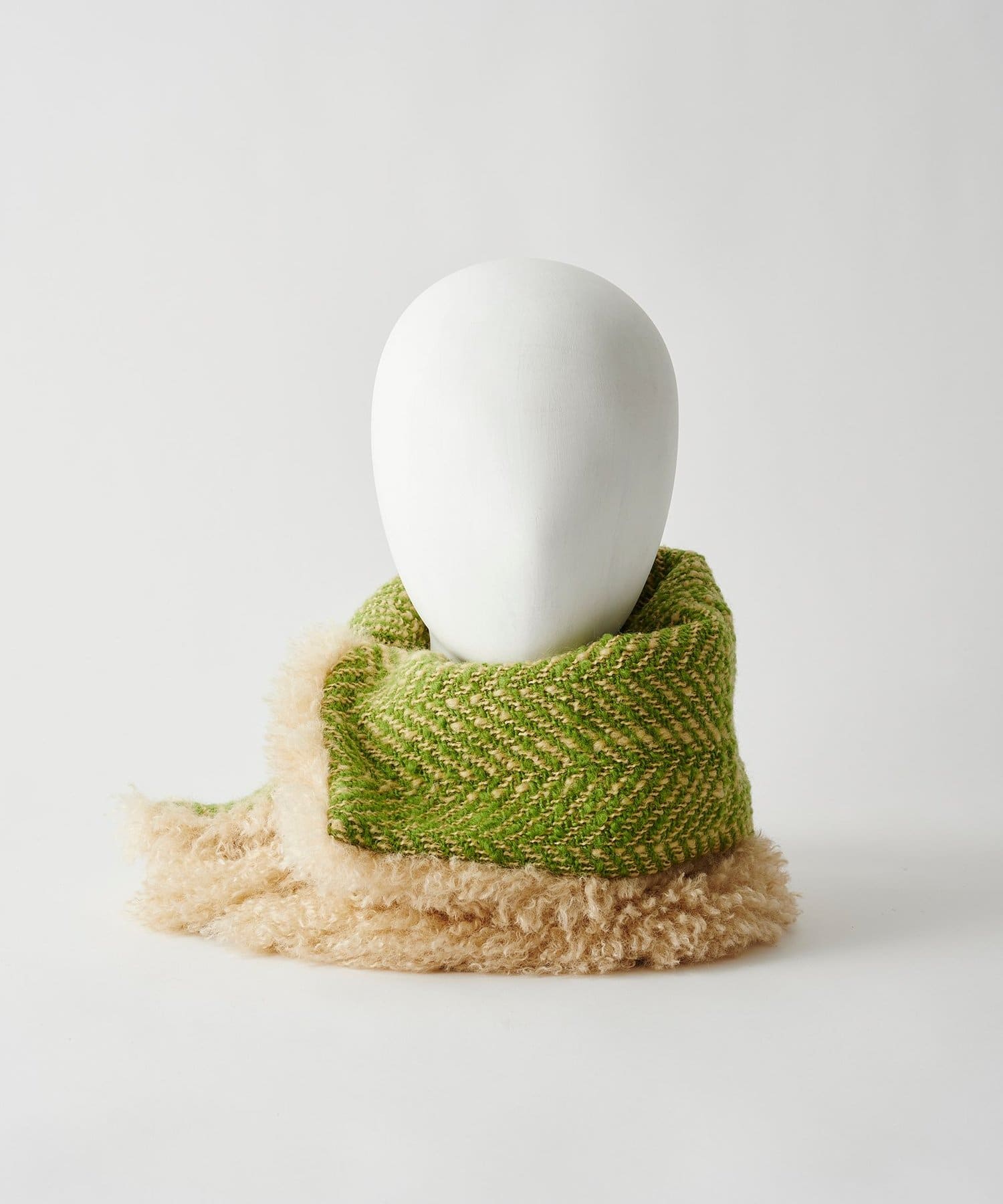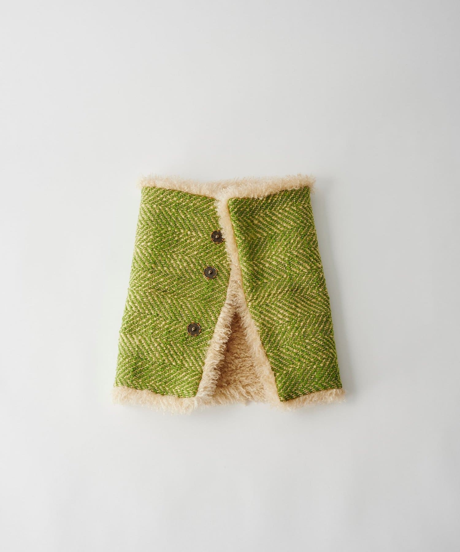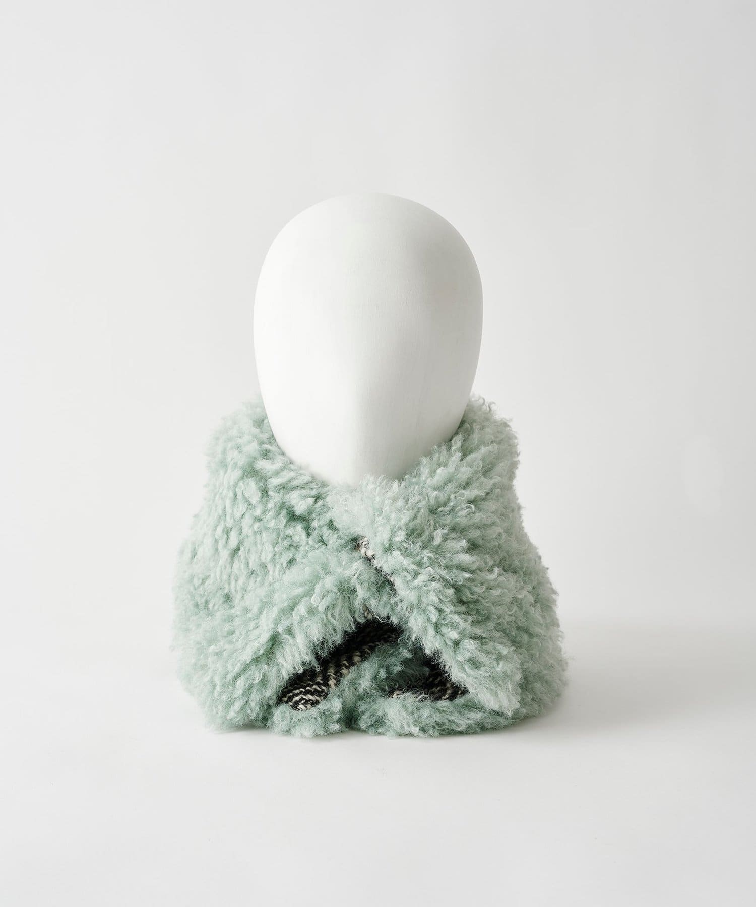 表は気持ちいい肌触りのカーリーフェイクファー。裏は大きなヘリンボン柄のイタリアンツイード。リバーシブルで使用可能。