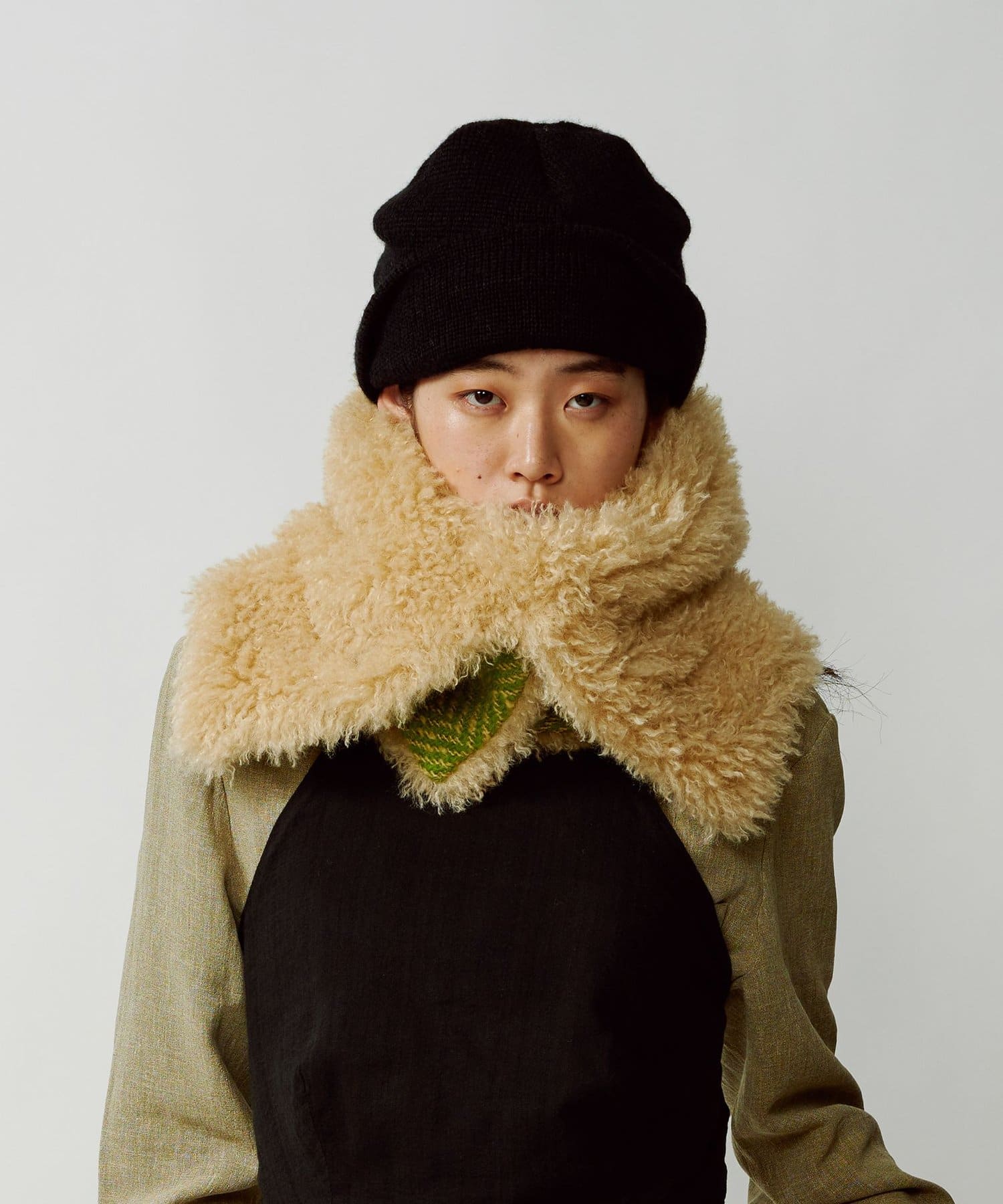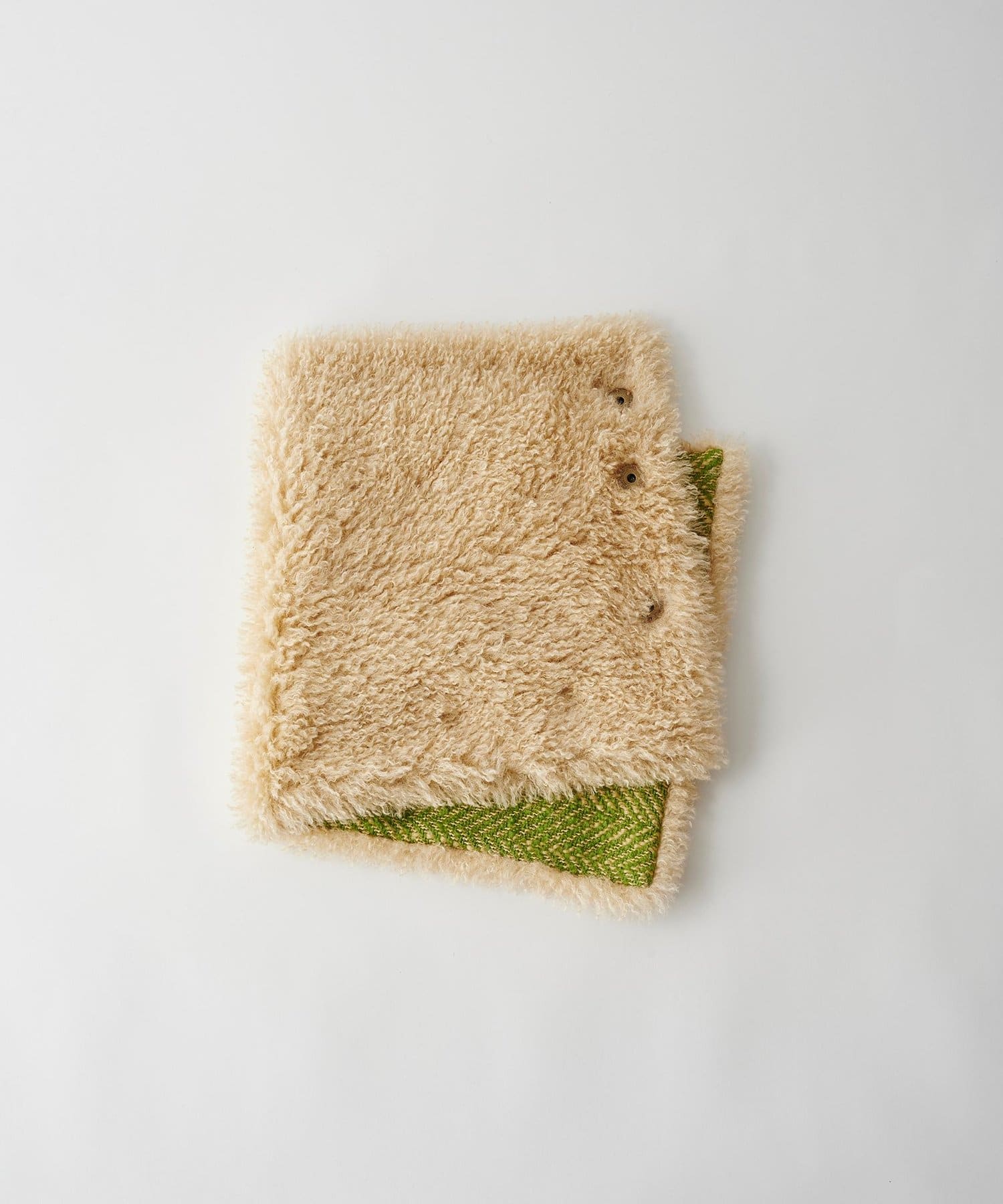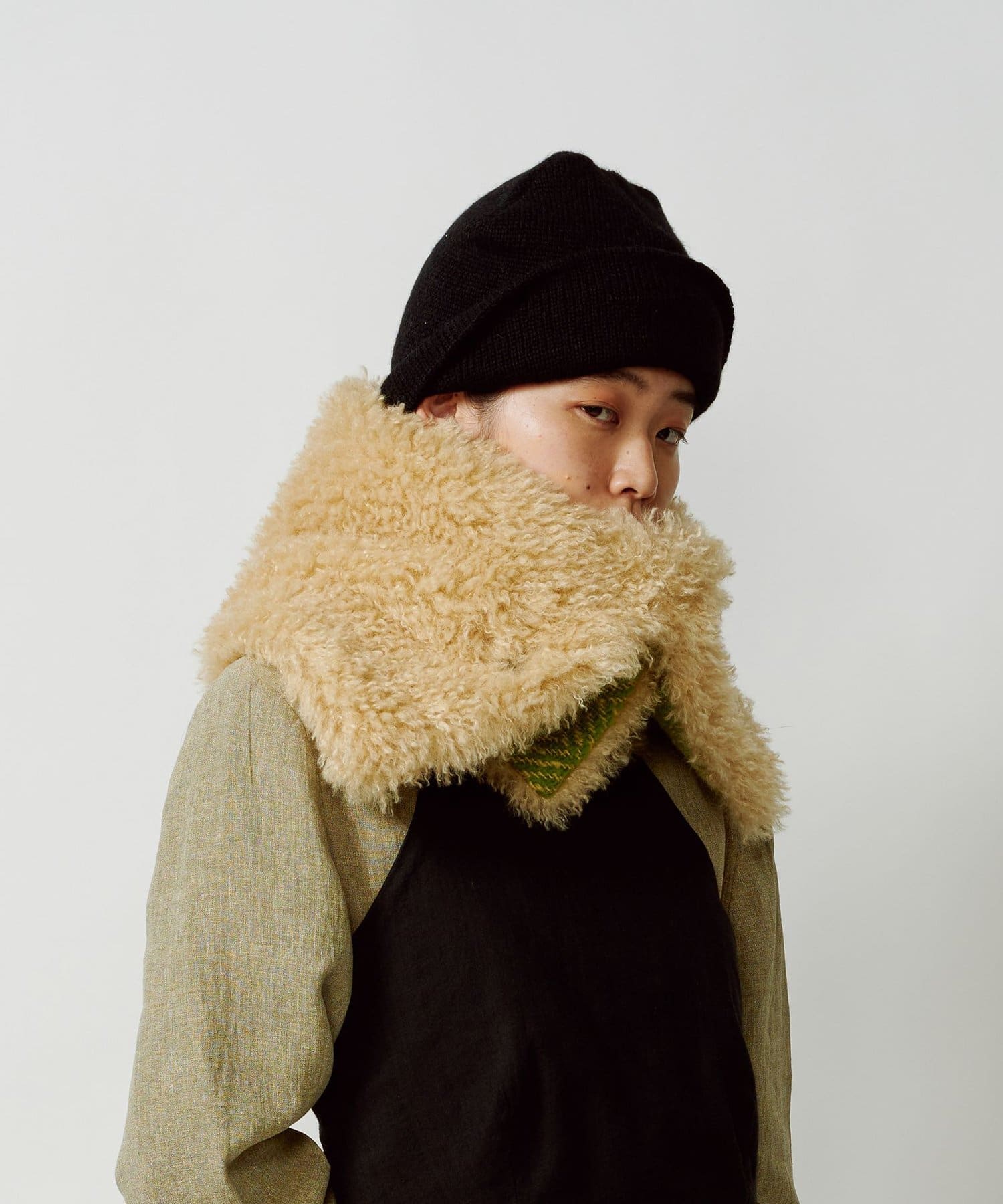 表は気持ちいい肌触りのカーリーフェイクファー。裏は大きなヘリンボン柄のイタリアンツイード。リバーシブルで使用可能。