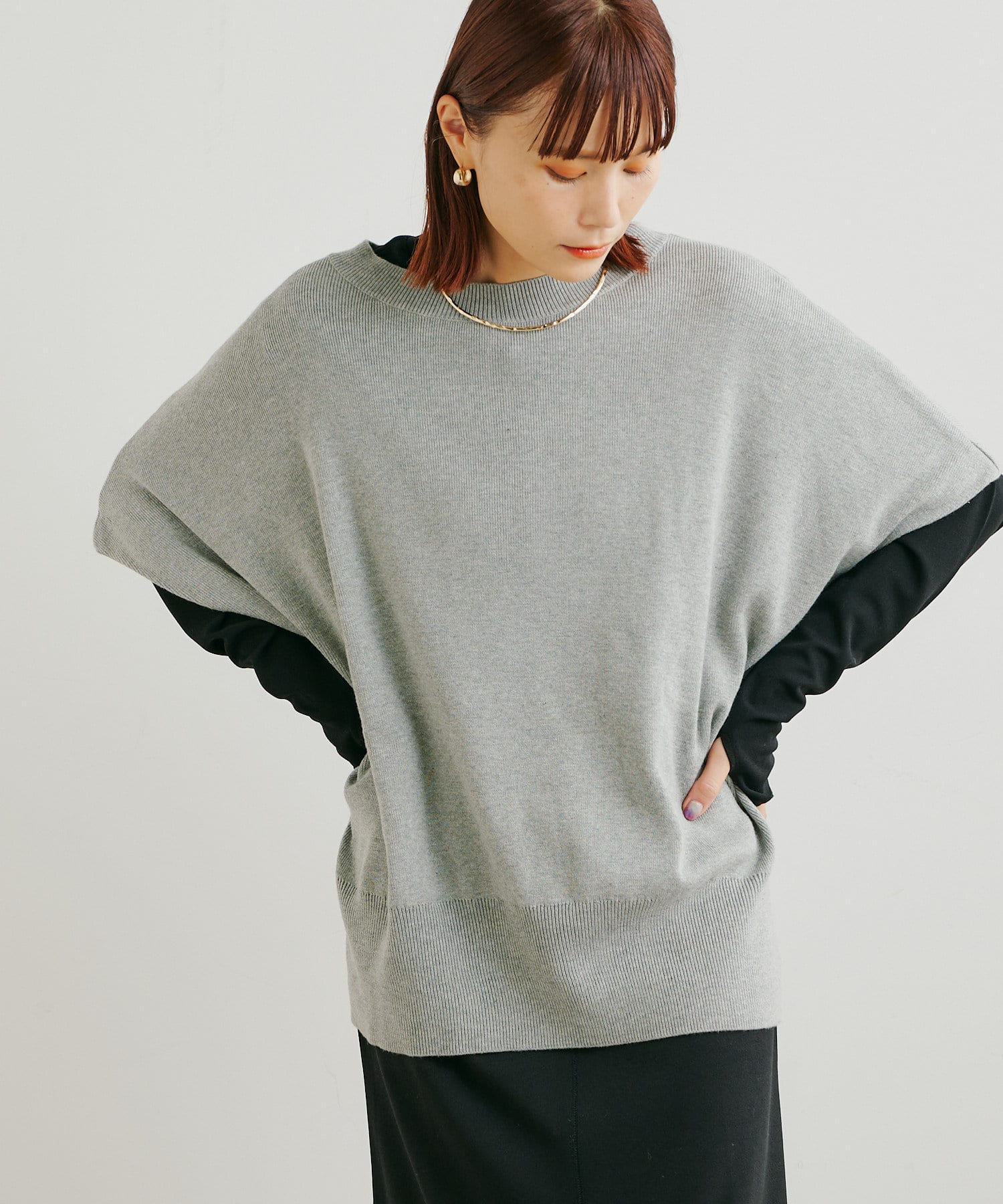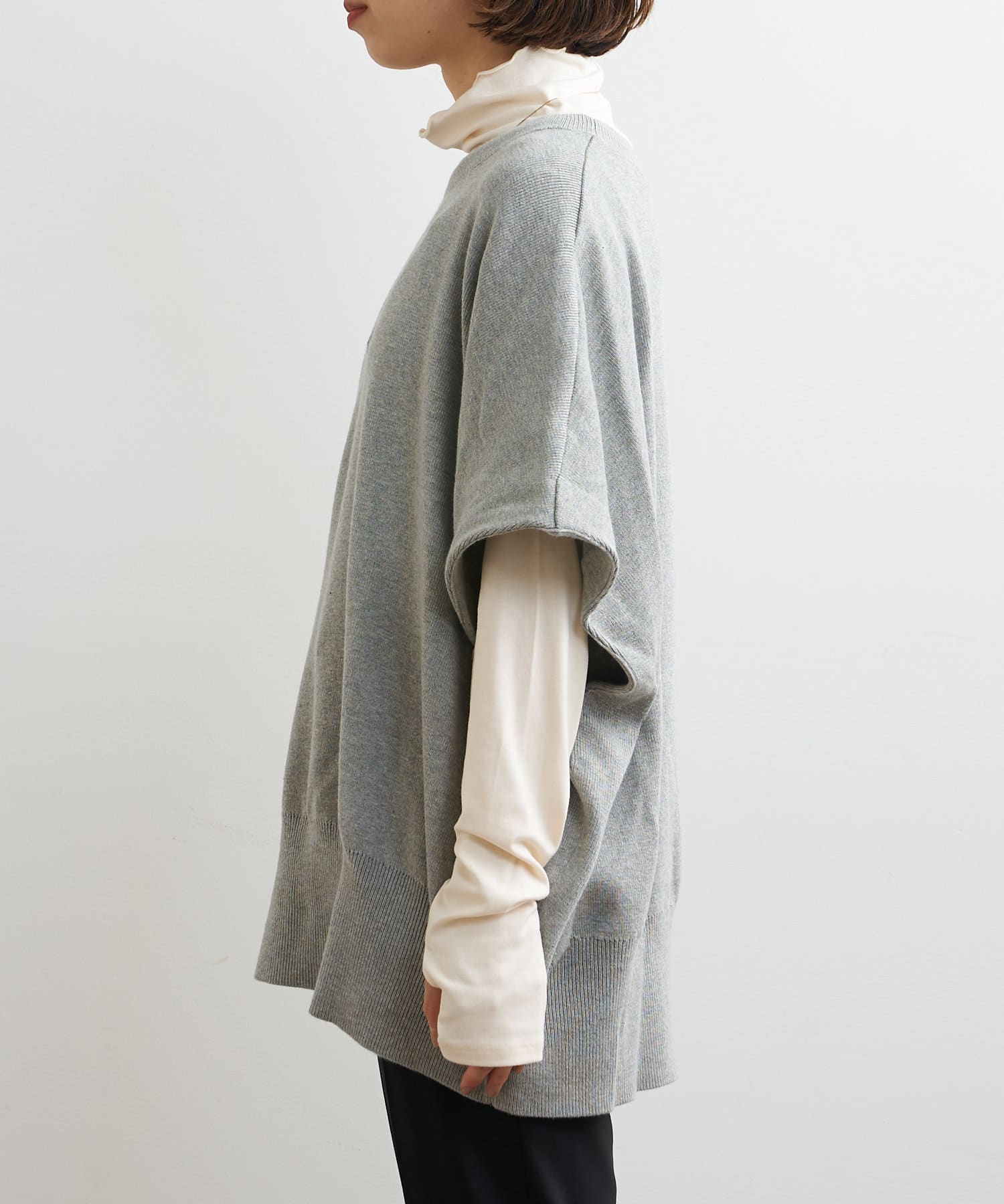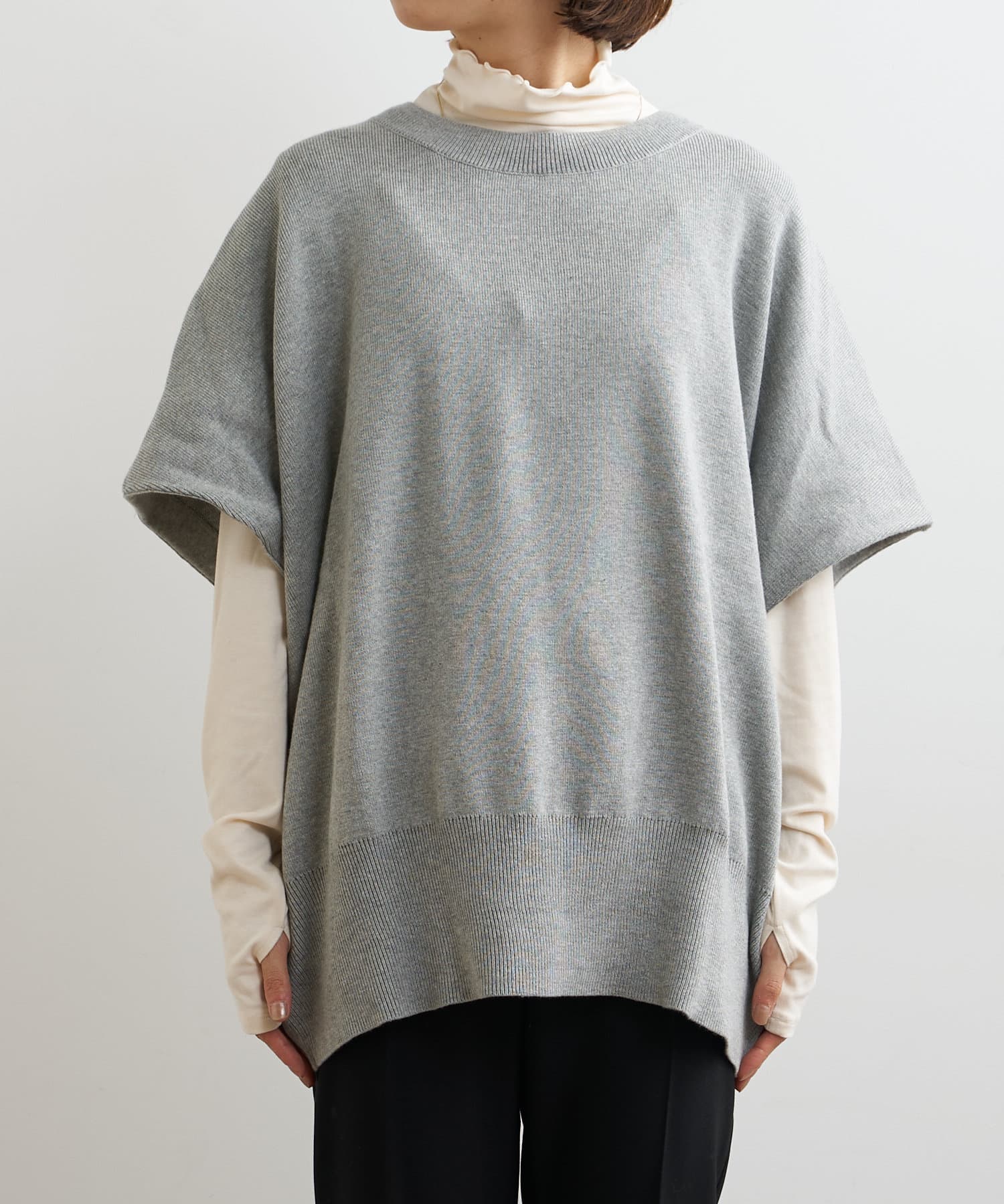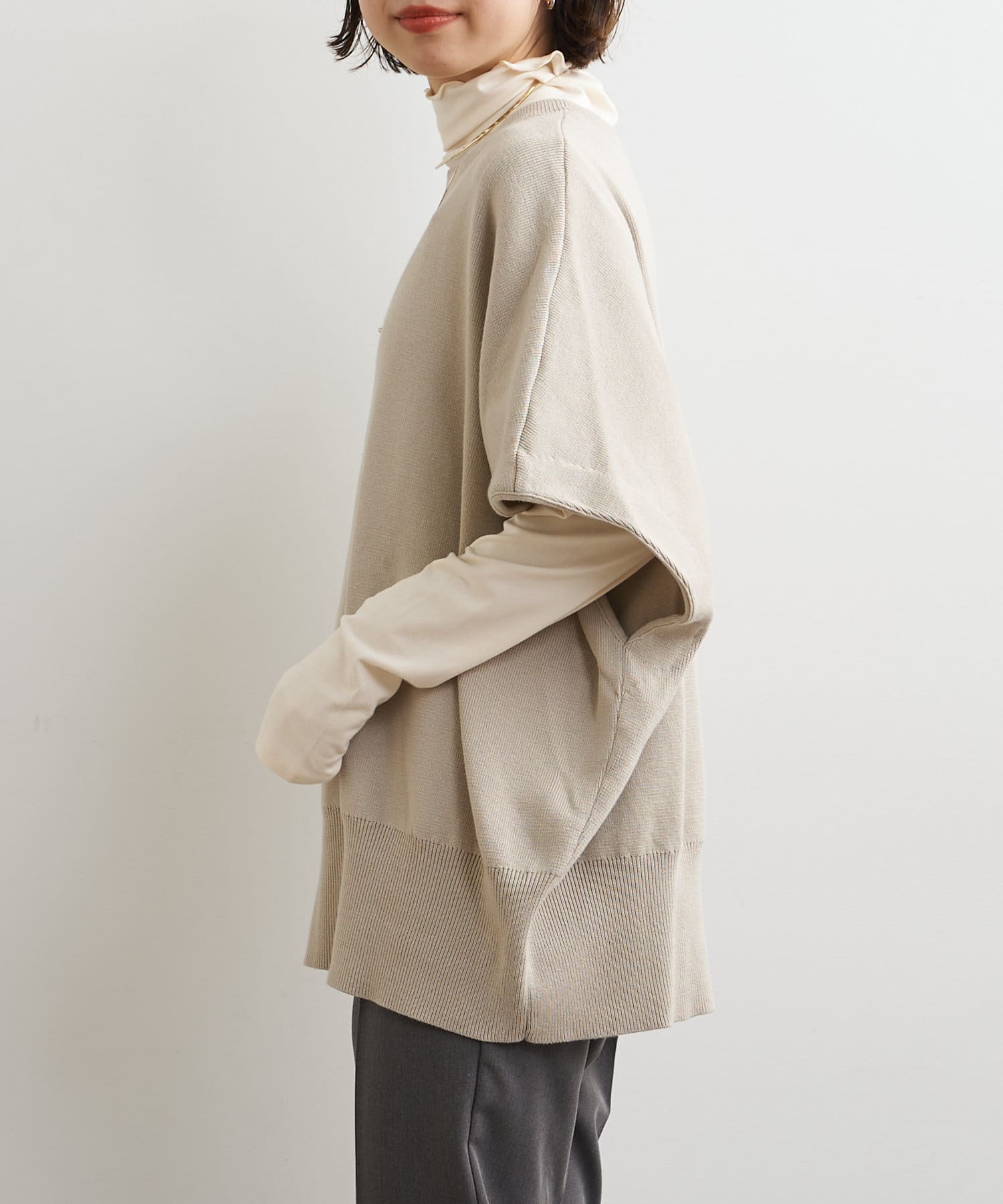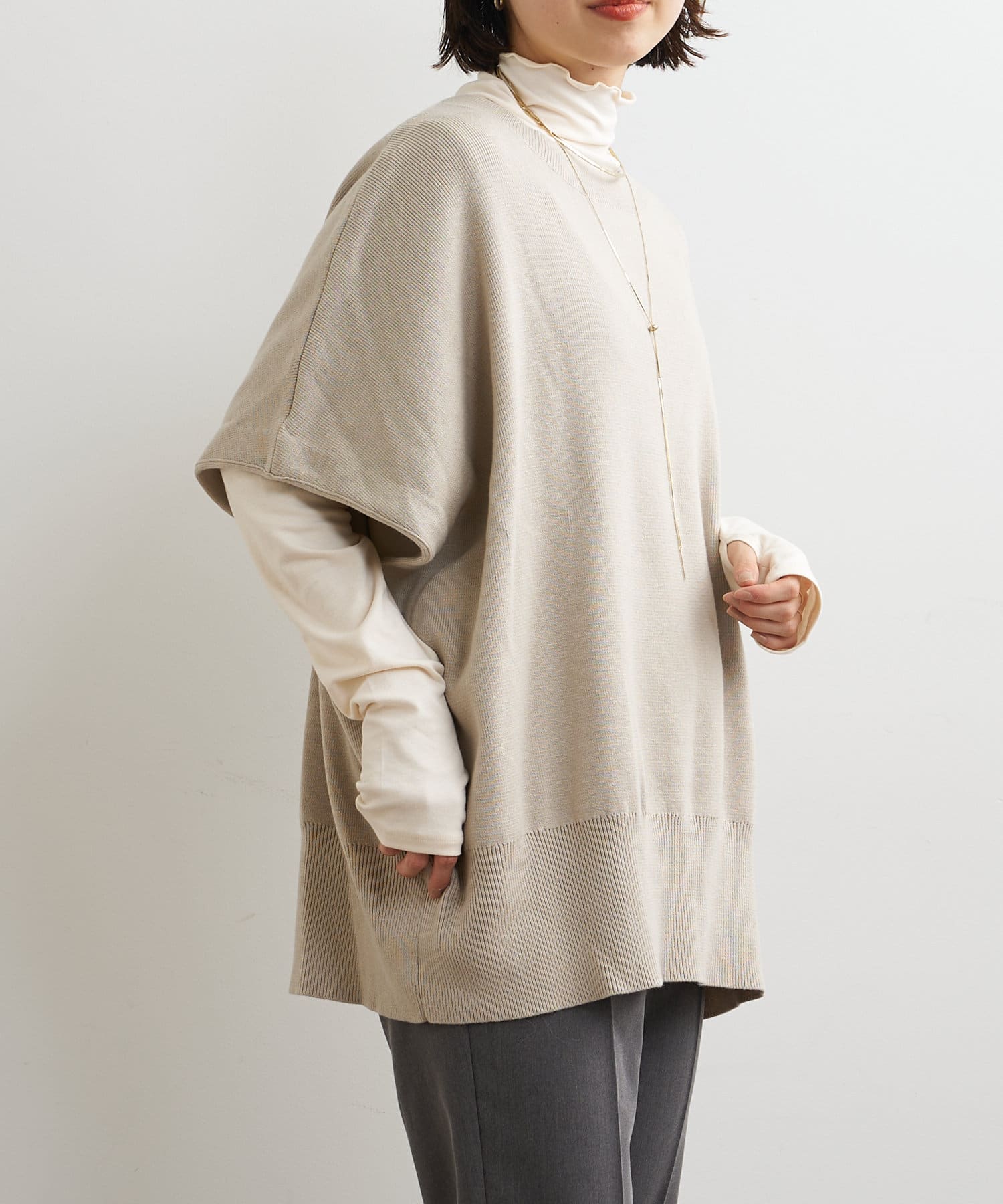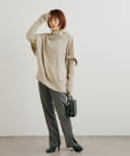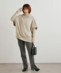 ・ニットプルオーバーはハイネックなどとレイヤードしてベスト風にも着れる一枚です。春先はトップスとしてメイン使いも◎