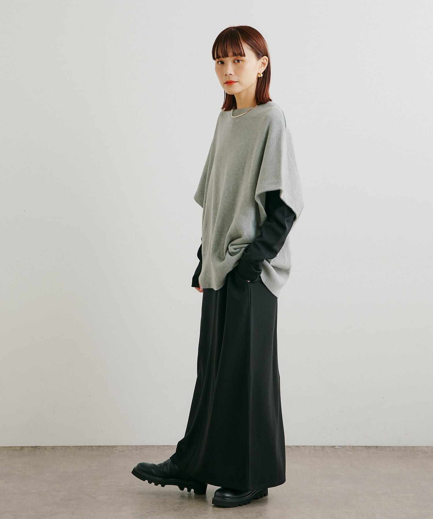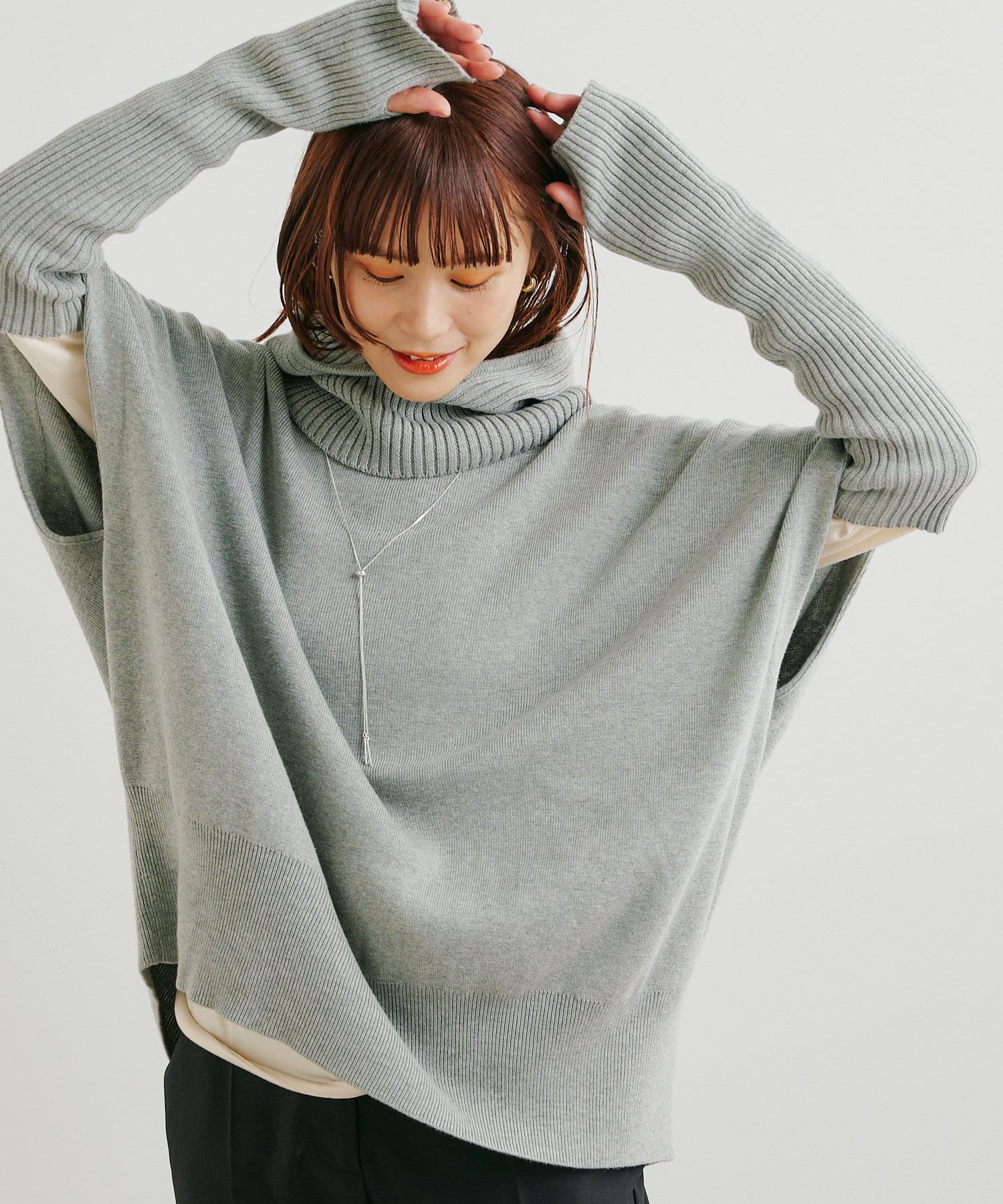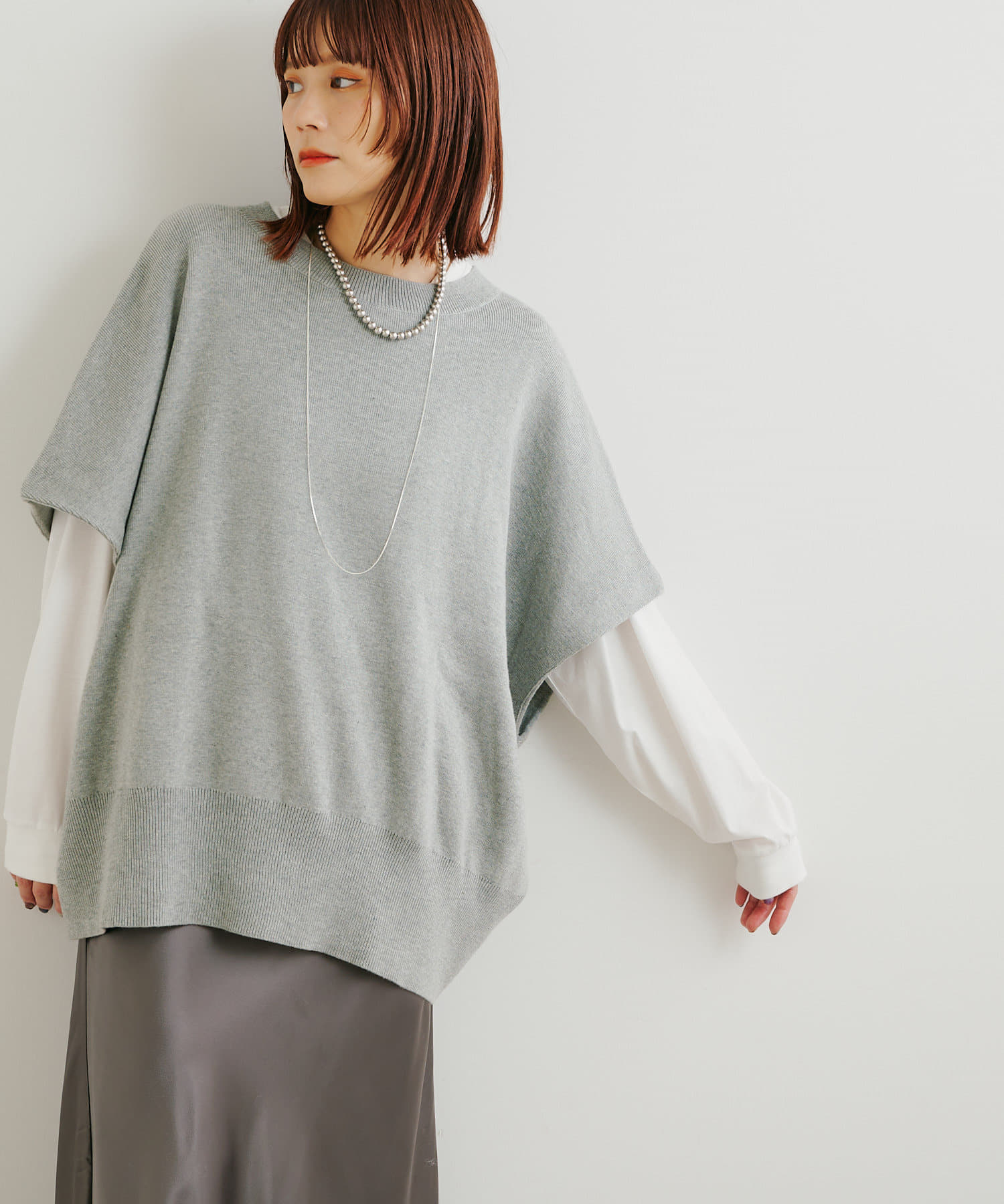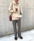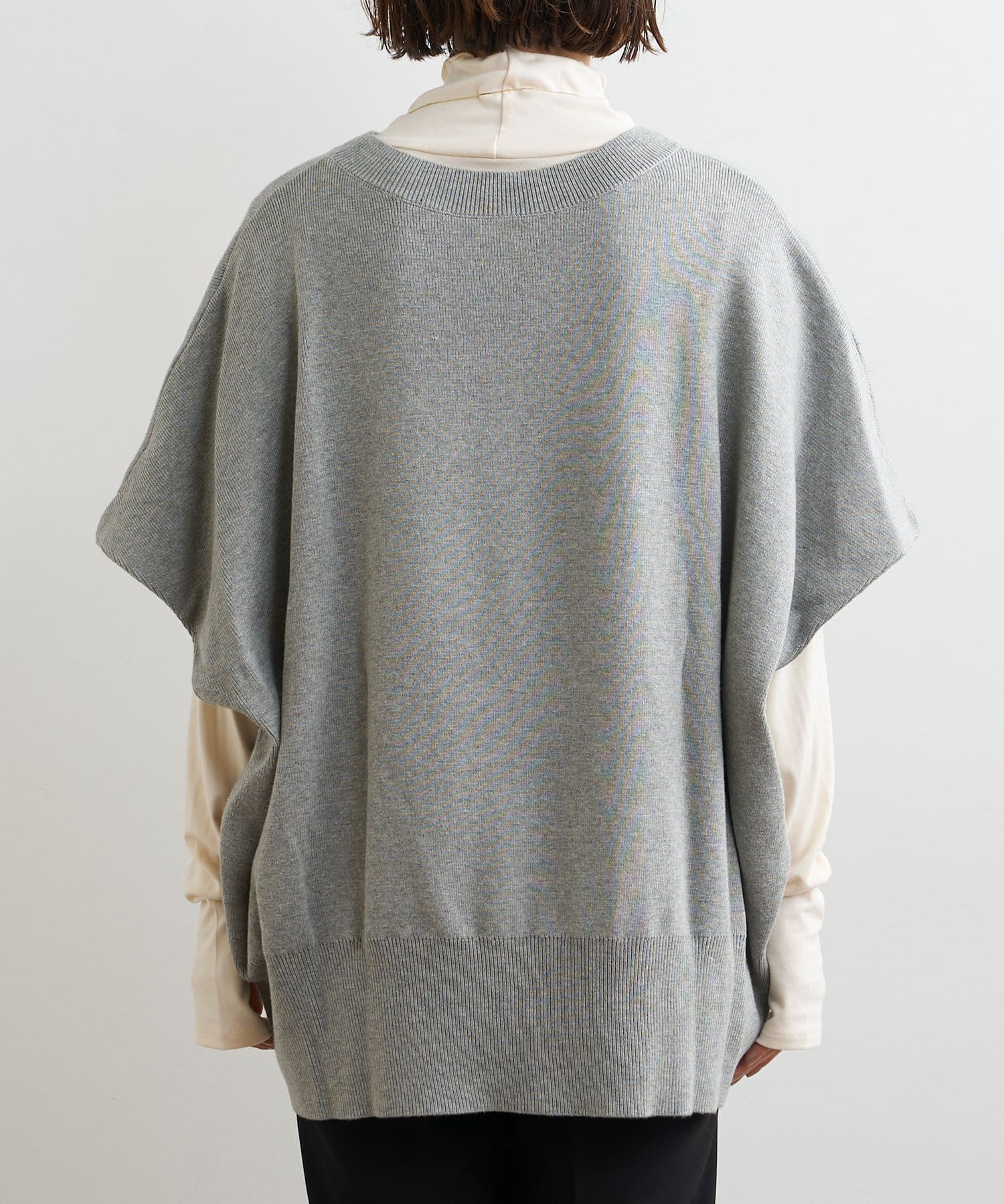 ・ニットプルオーバーはハイネックなどとレイヤードしてベスト風にも着れる一枚です。春先はトップスとしてメイン使いも◎