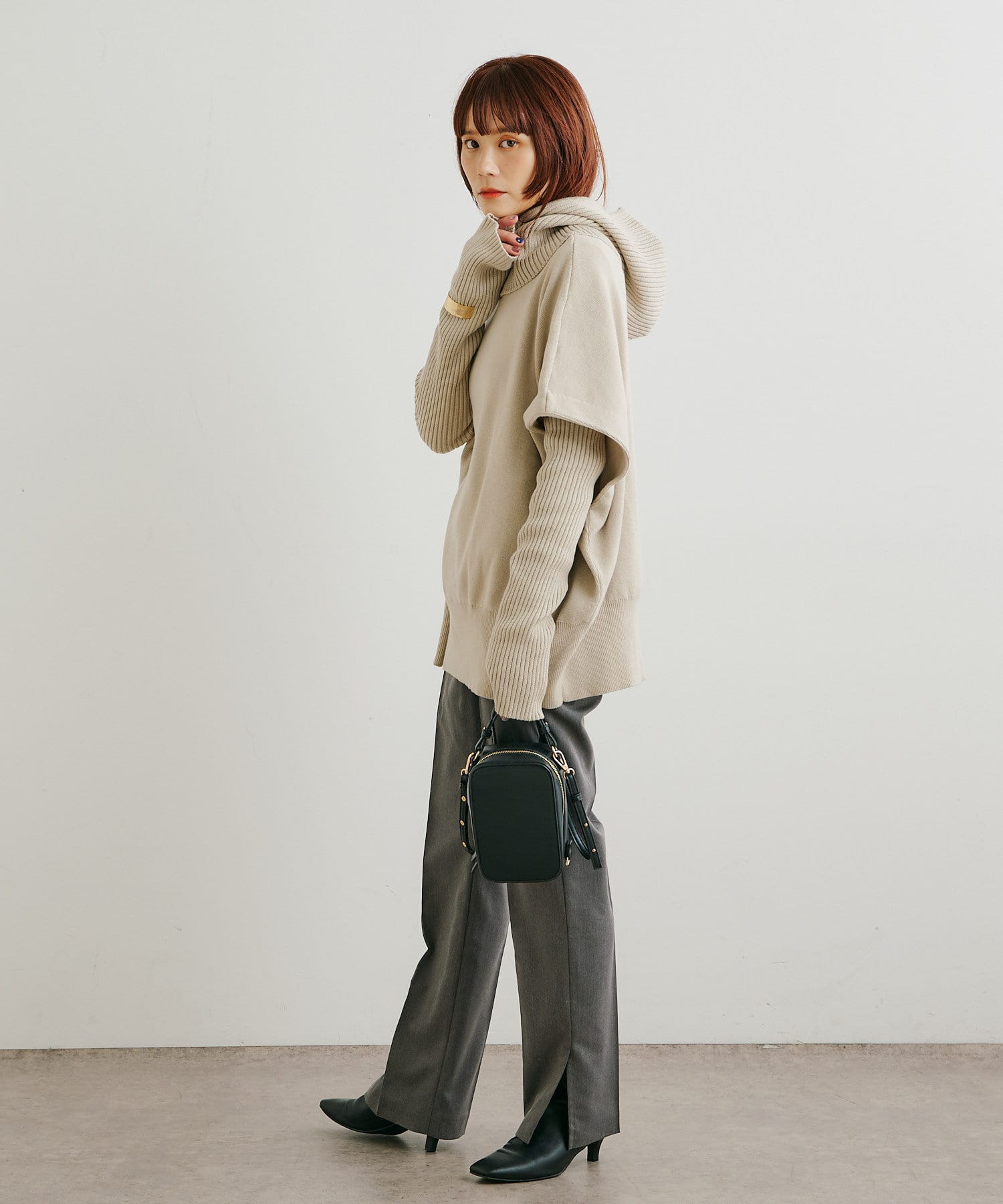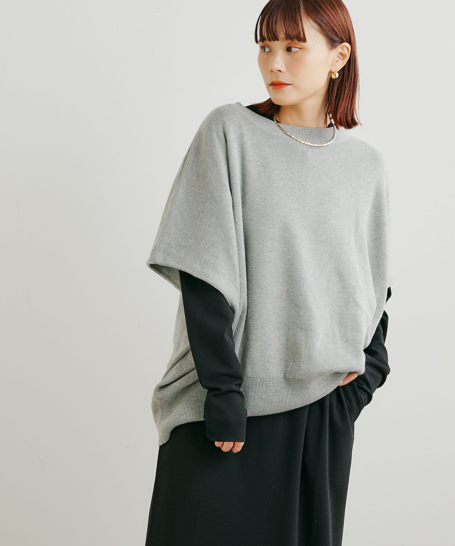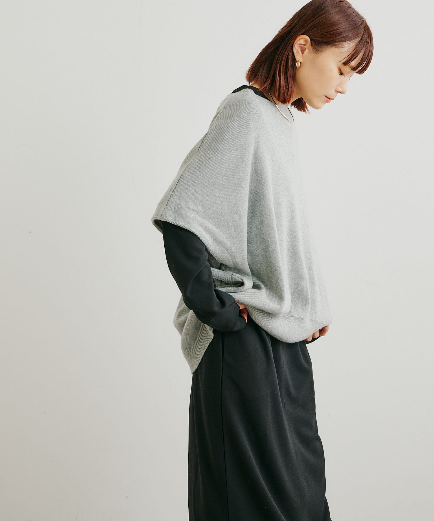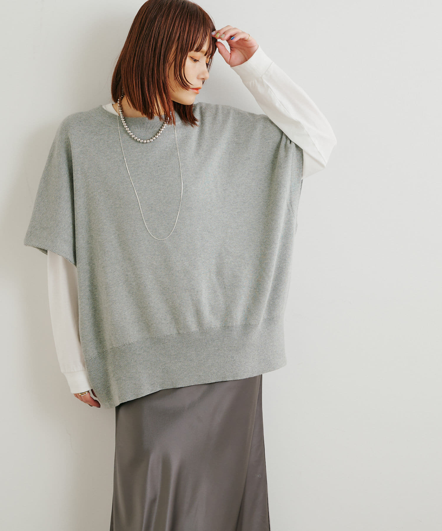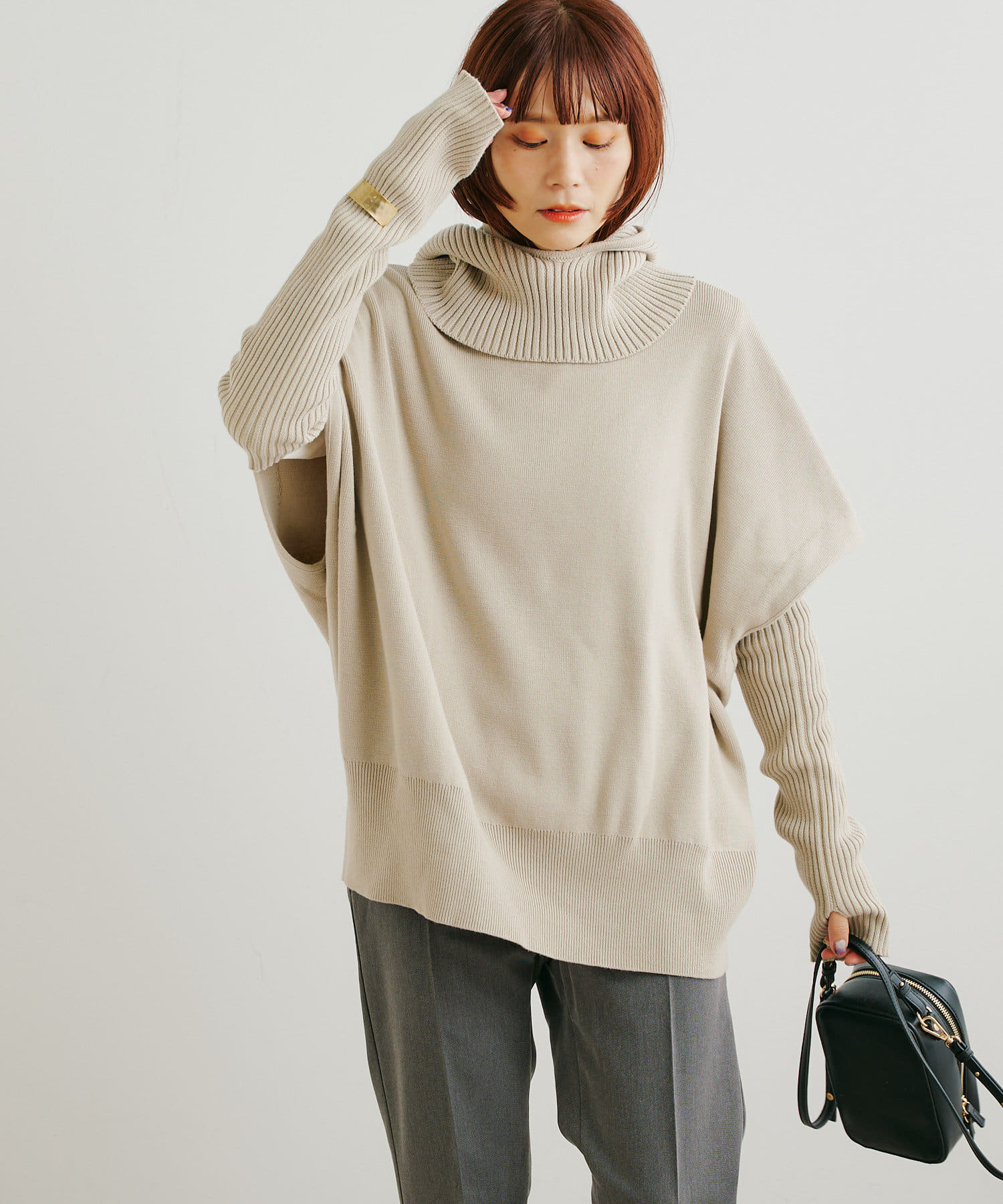 ・ニットプルオーバーはハイネックなどとレイヤードしてベスト風にも着れる一枚です。春先はトップスとしてメイン使いも◎