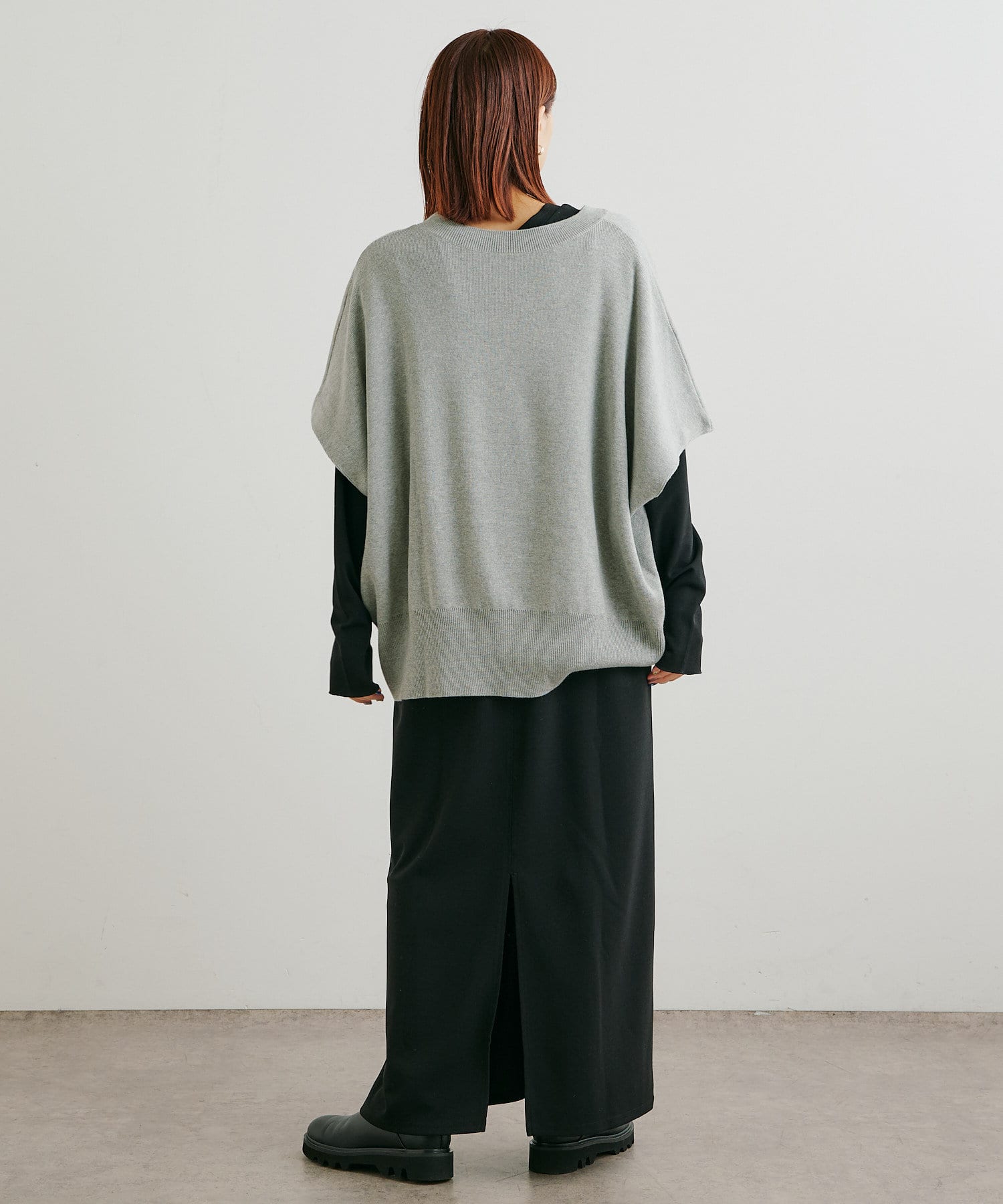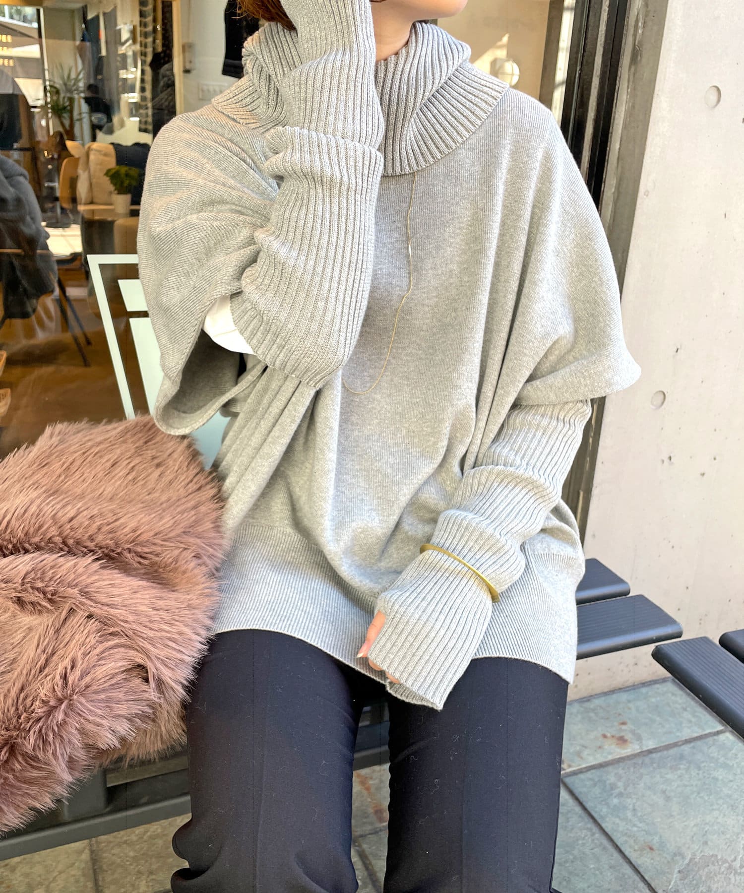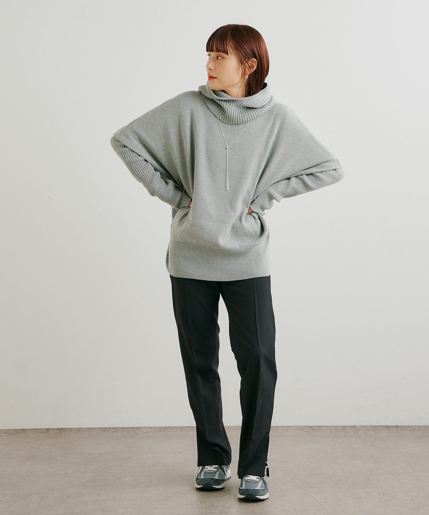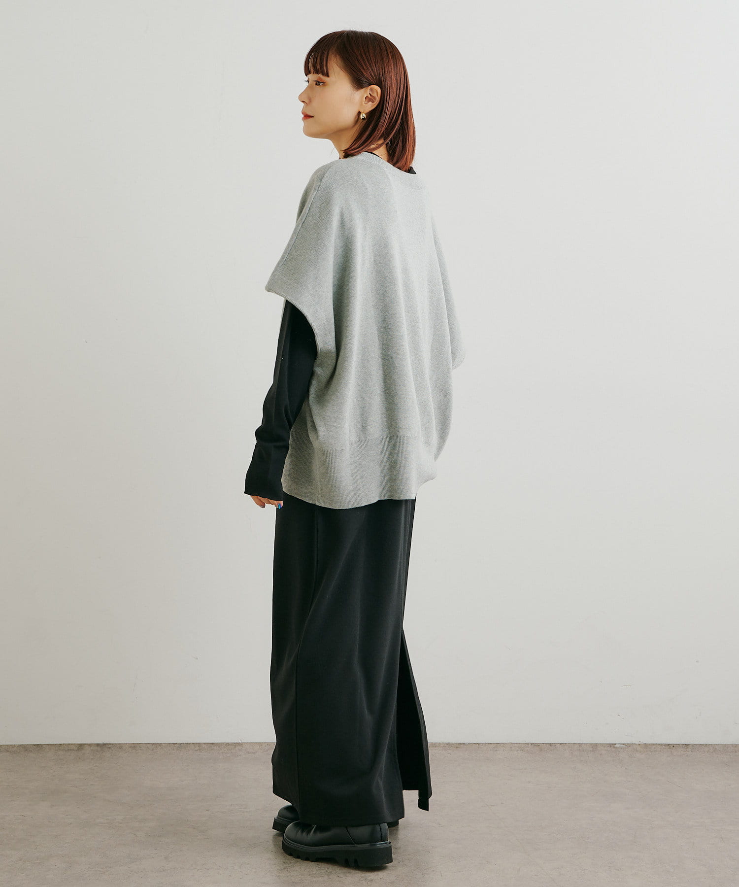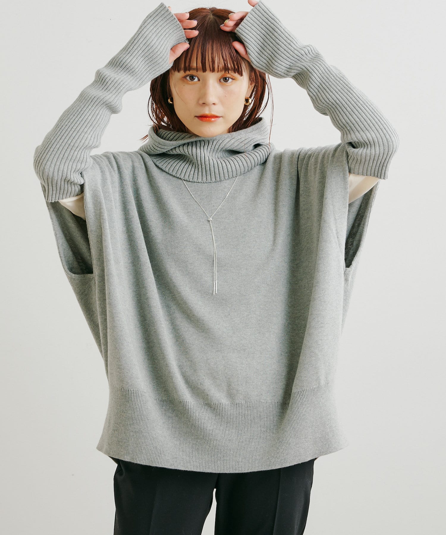 ・ニットプルオーバーはハイネックなどとレイヤードしてベスト風にも着れる一枚です。春先はトップスとしてメイン使いも◎