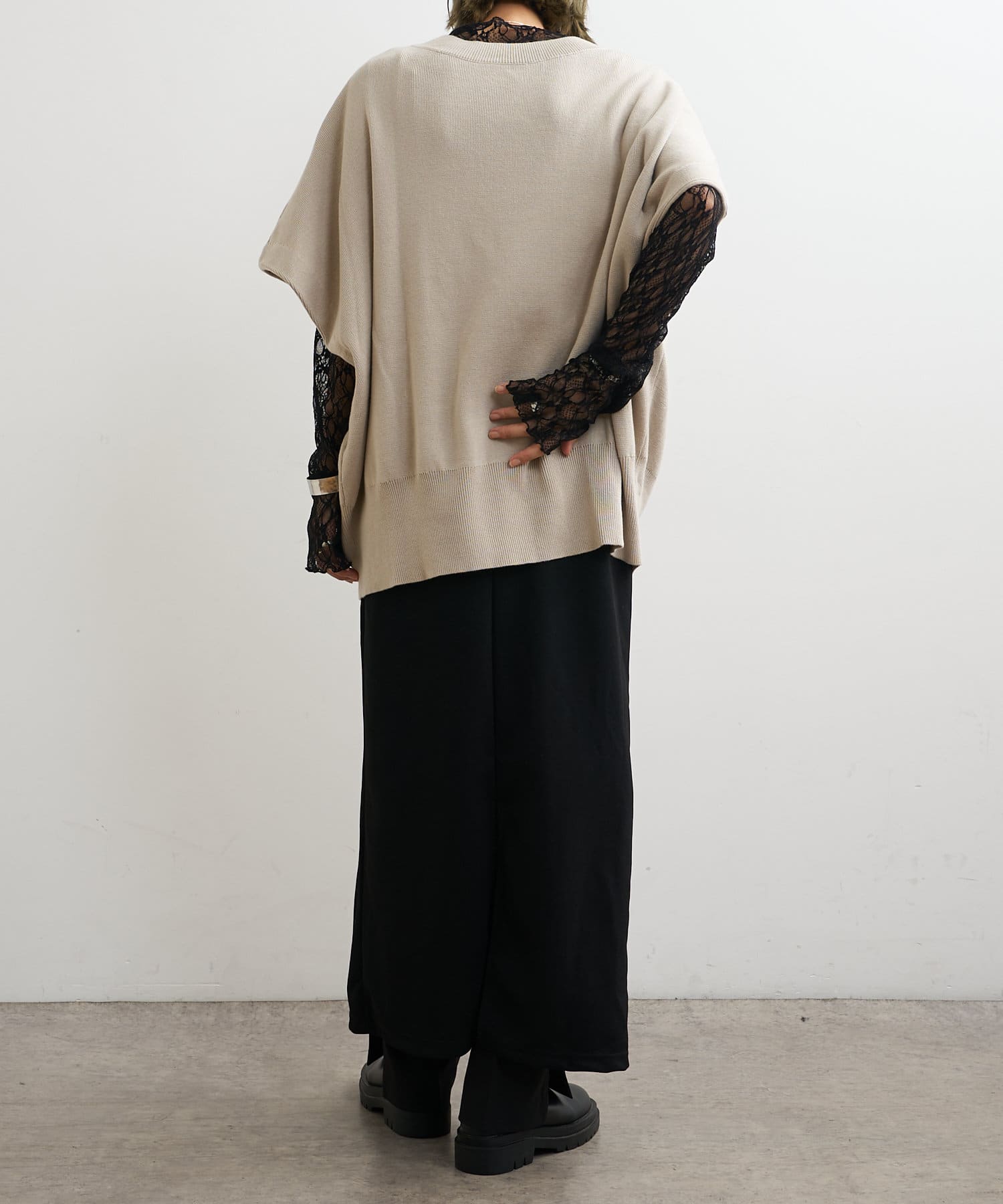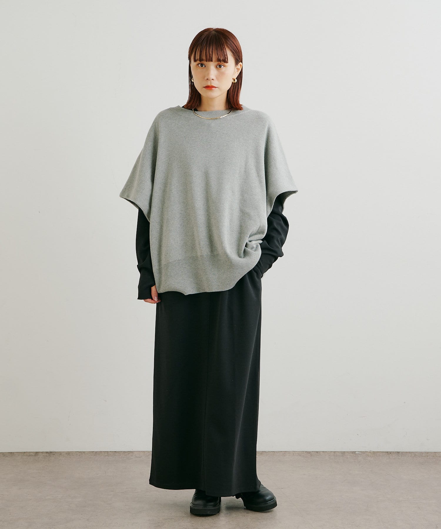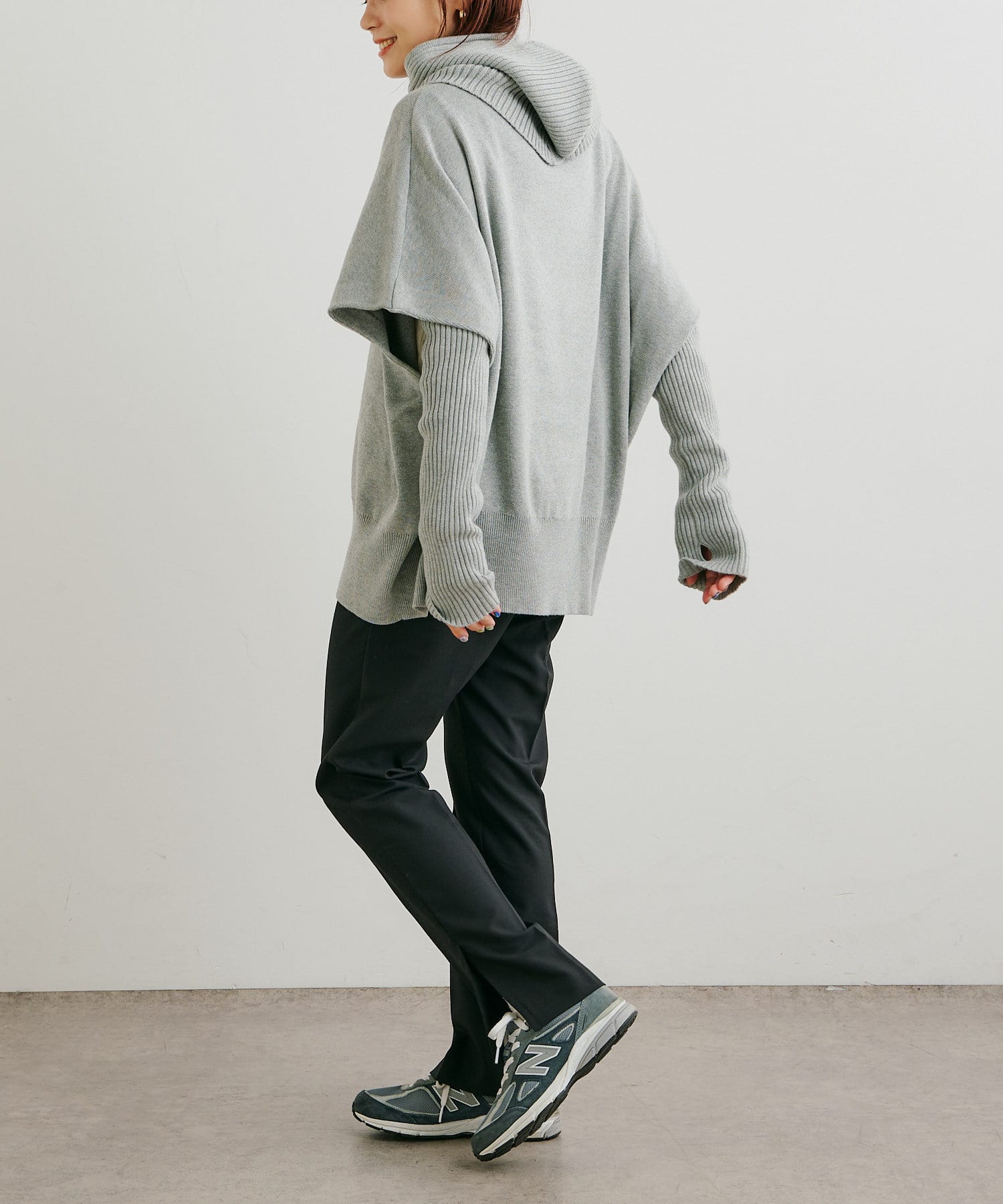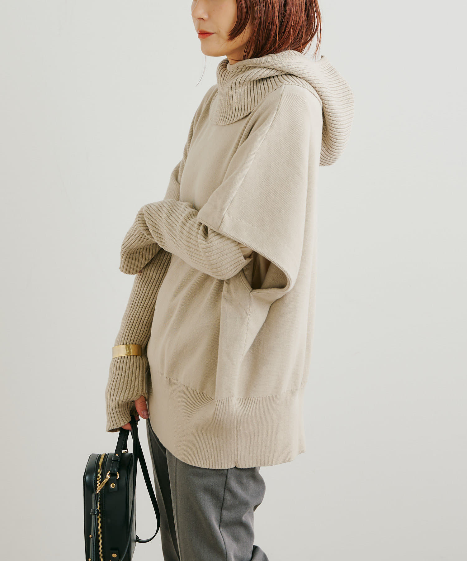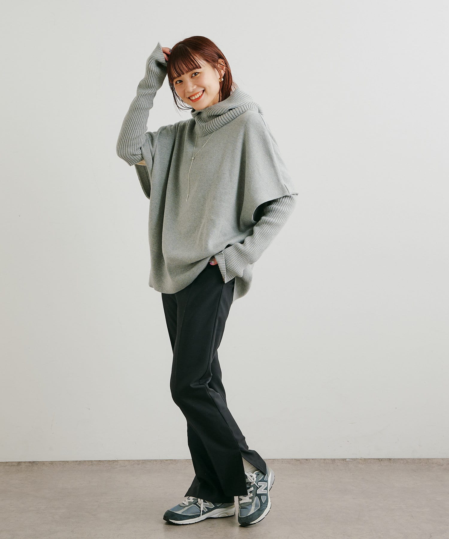・ニットプルオーバーはハイネックなどとレイヤードしてベスト風にも着れる一枚です。春先はトップスとしてメイン使いも◎