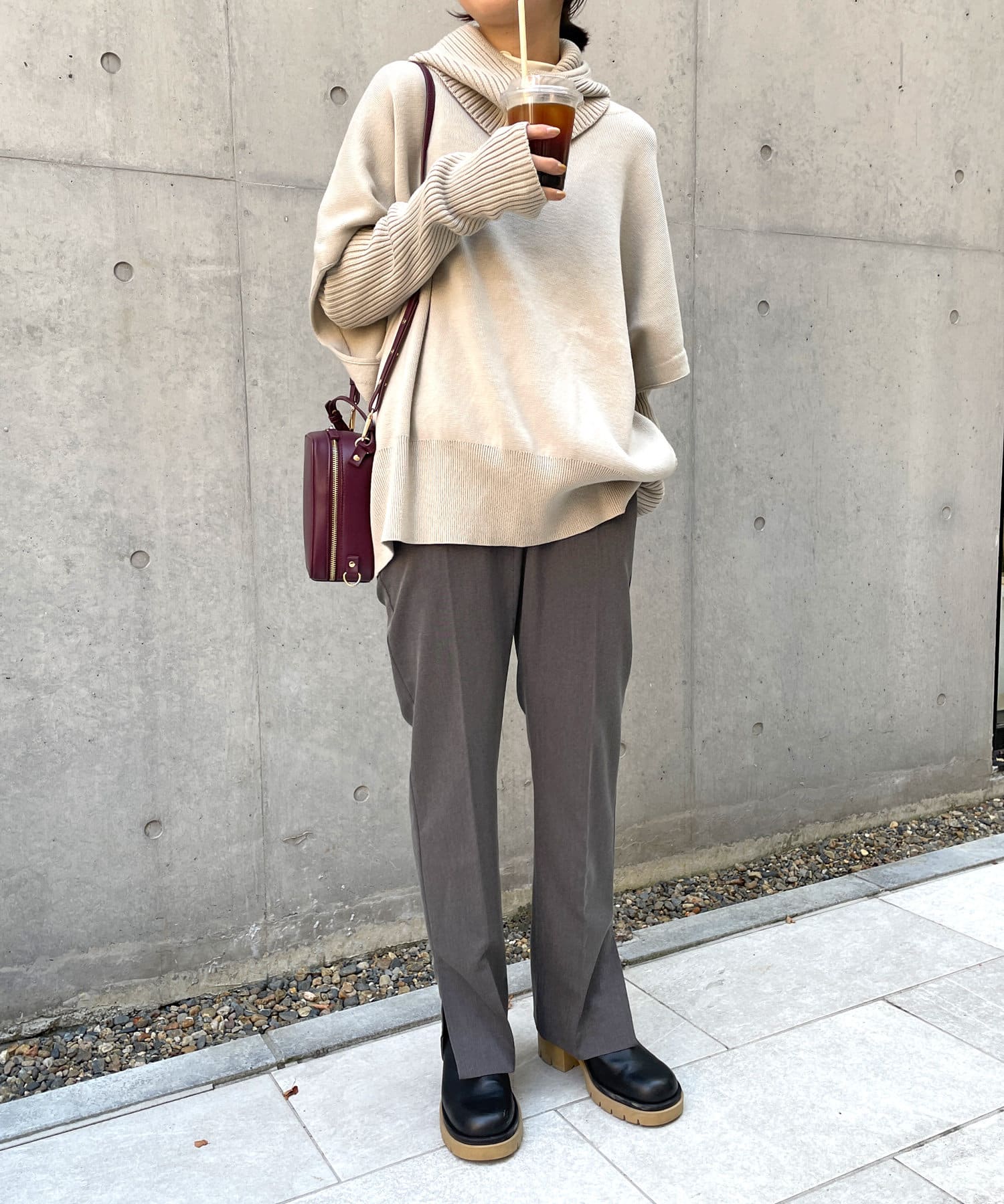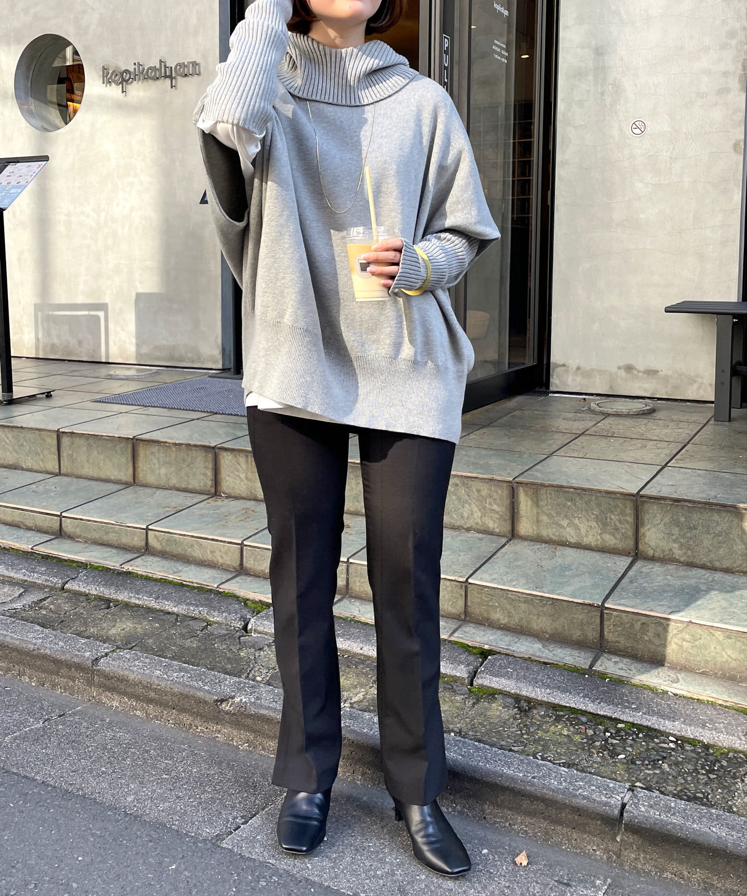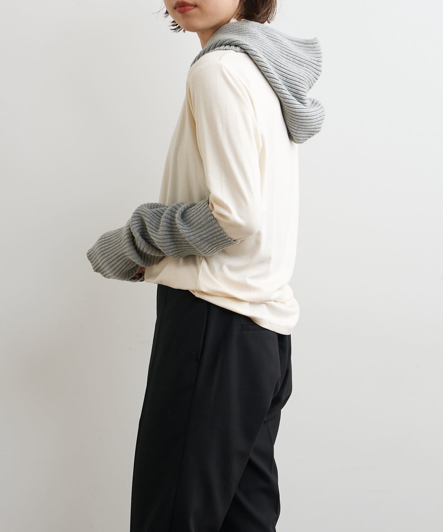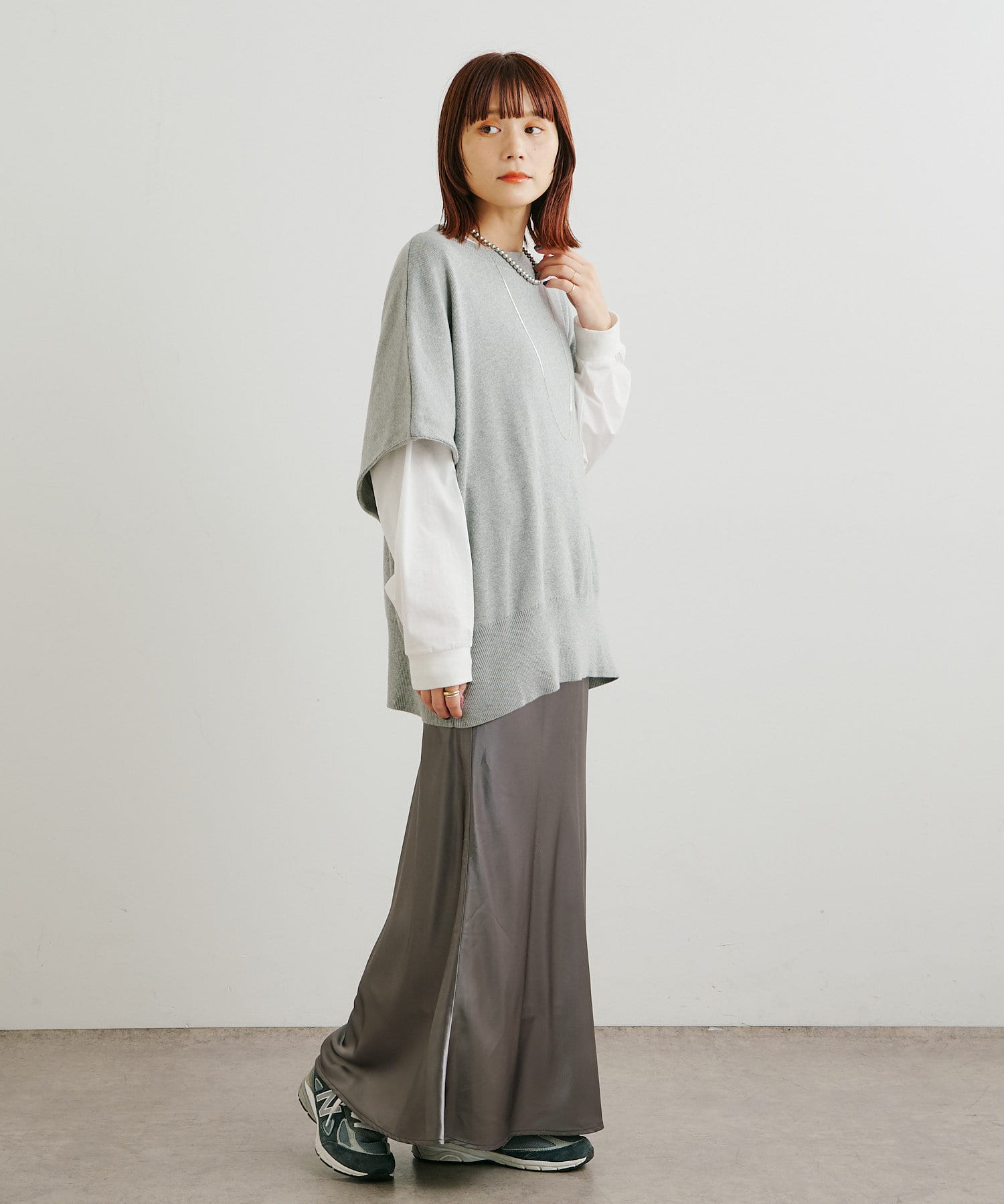 ・ニットプルオーバーはハイネックなどとレイヤードしてベスト風にも着れる一枚です。春先はトップスとしてメイン使いも◎