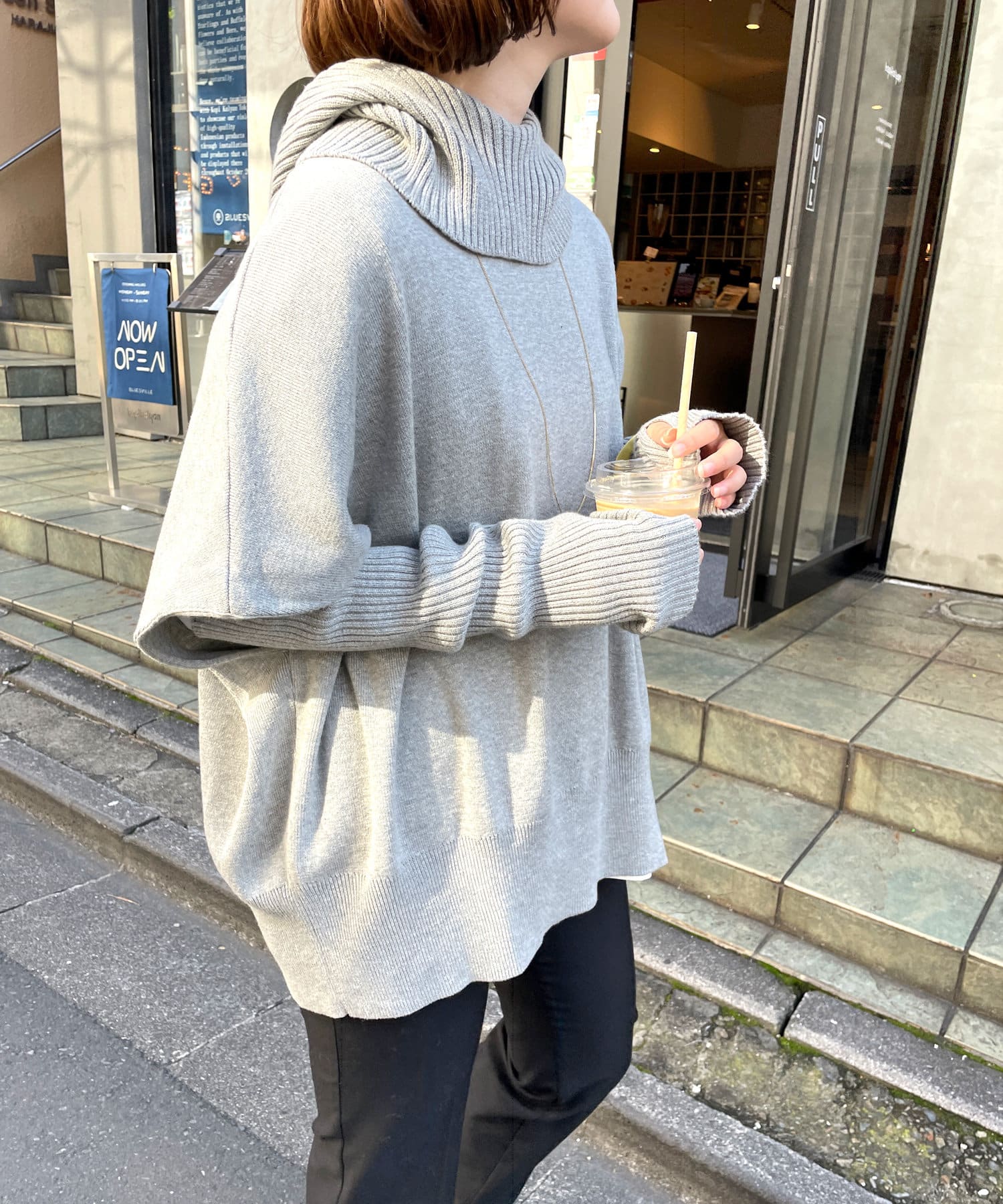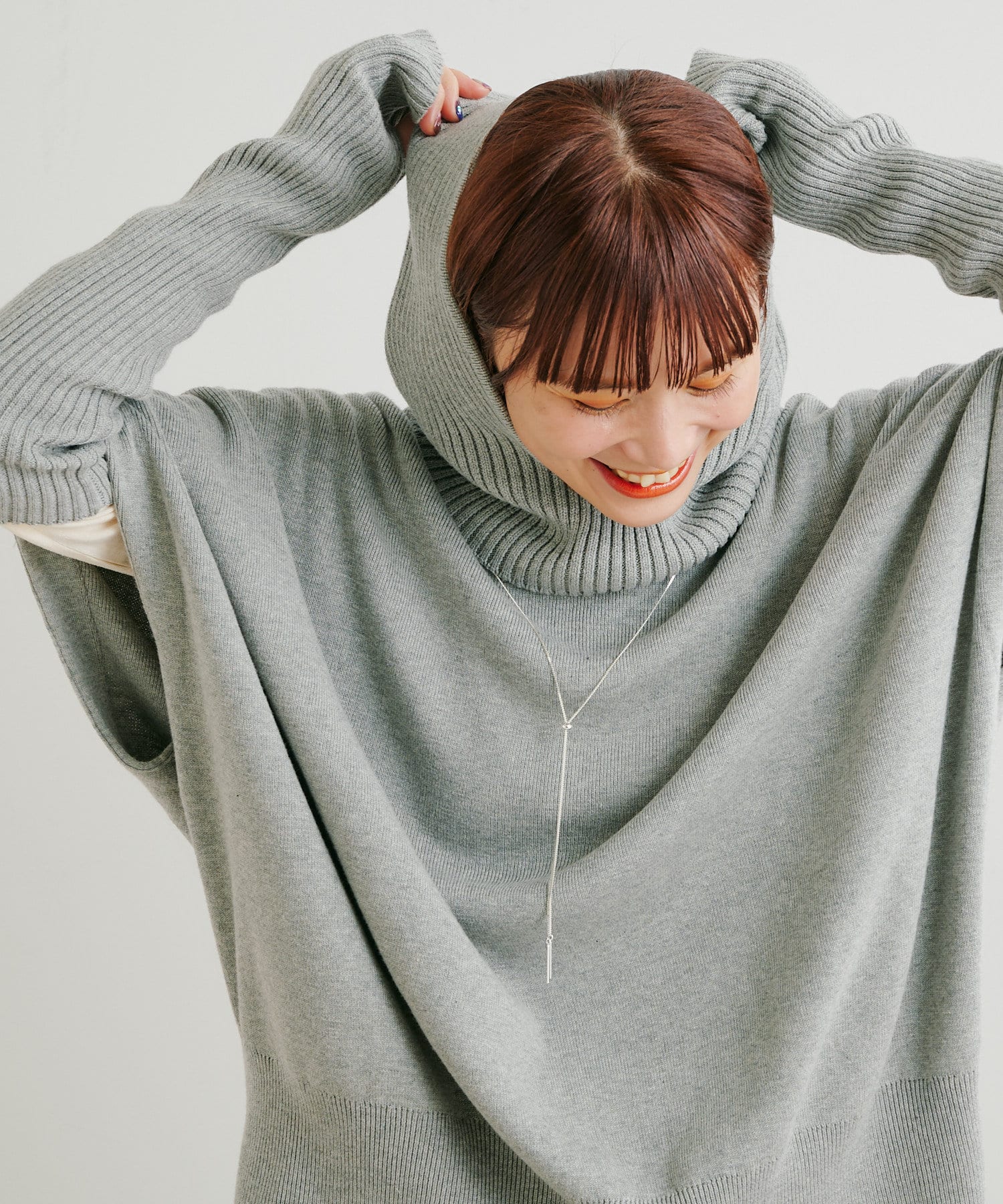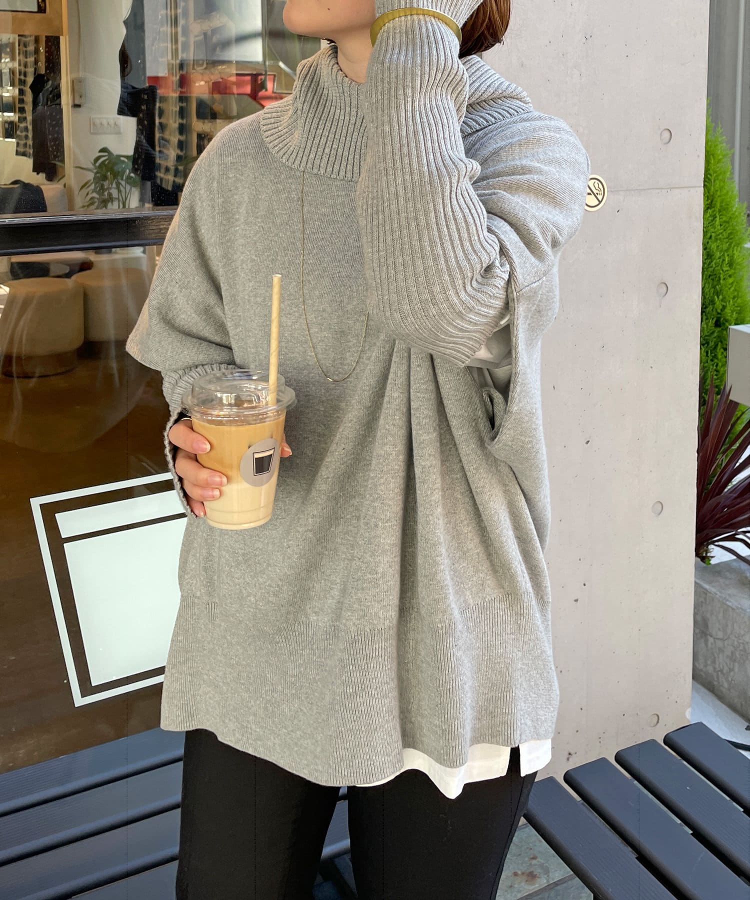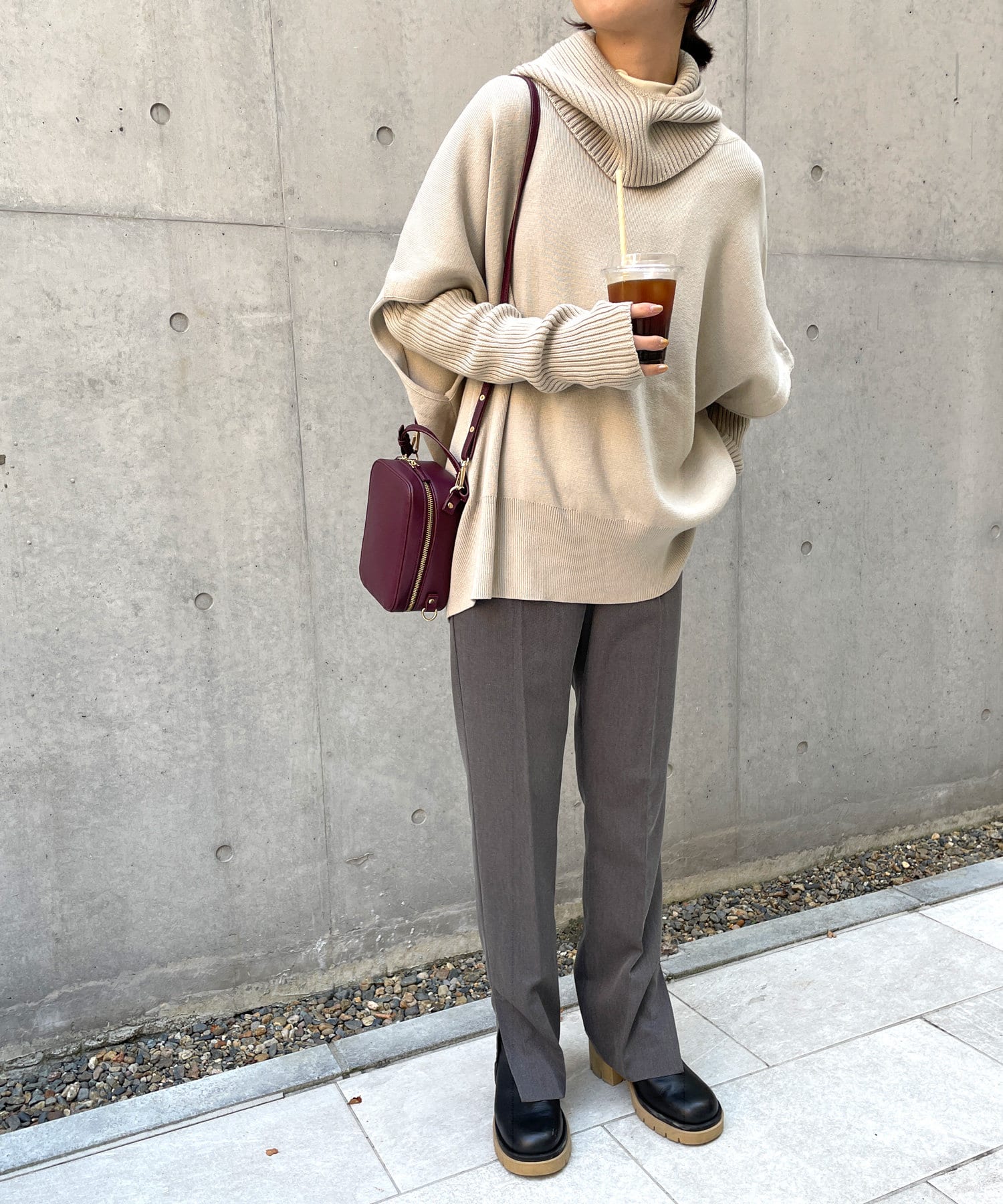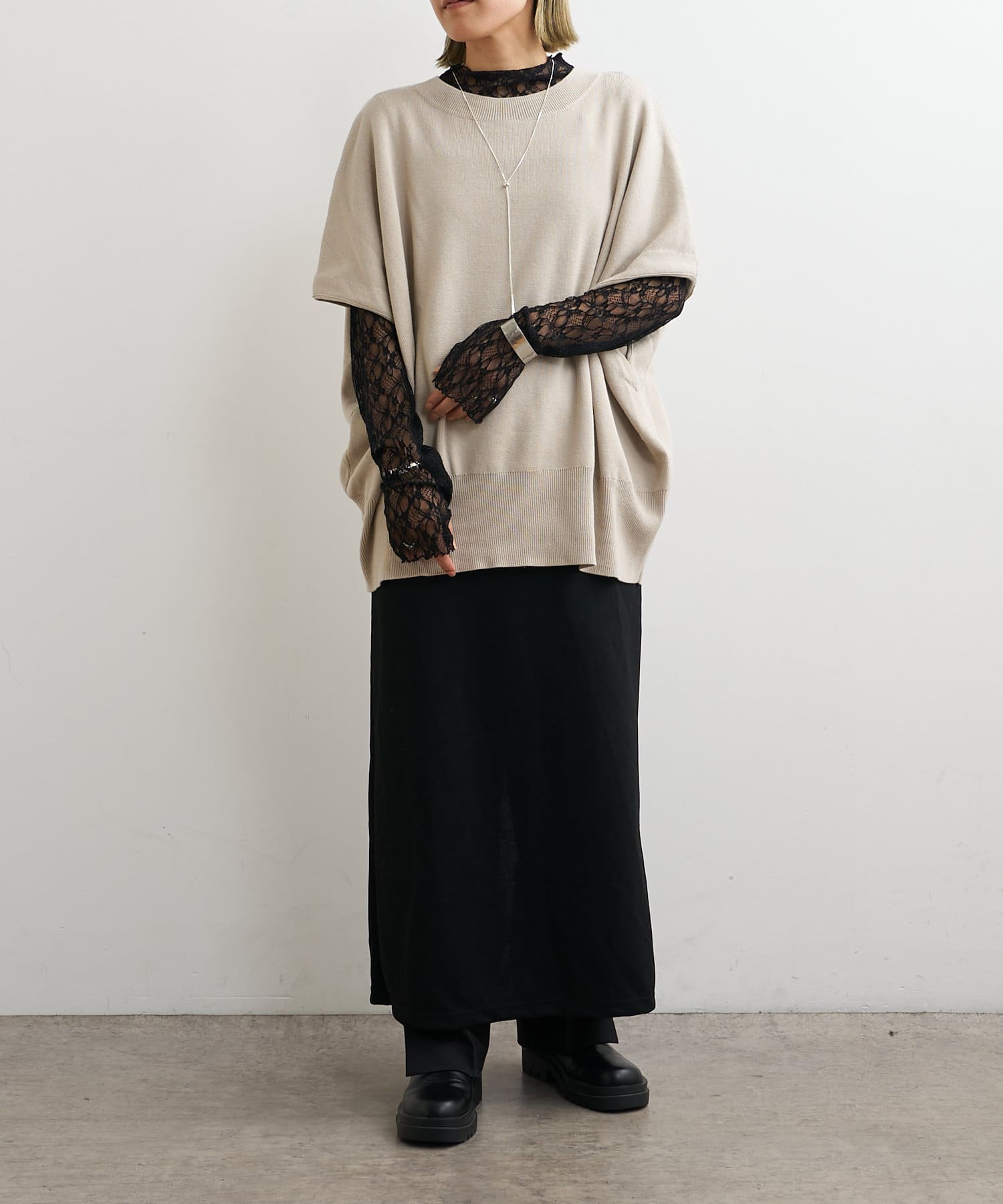 ・ニットプルオーバーはハイネックなどとレイヤードしてベスト風にも着れる一枚です。春先はトップスとしてメイン使いも◎