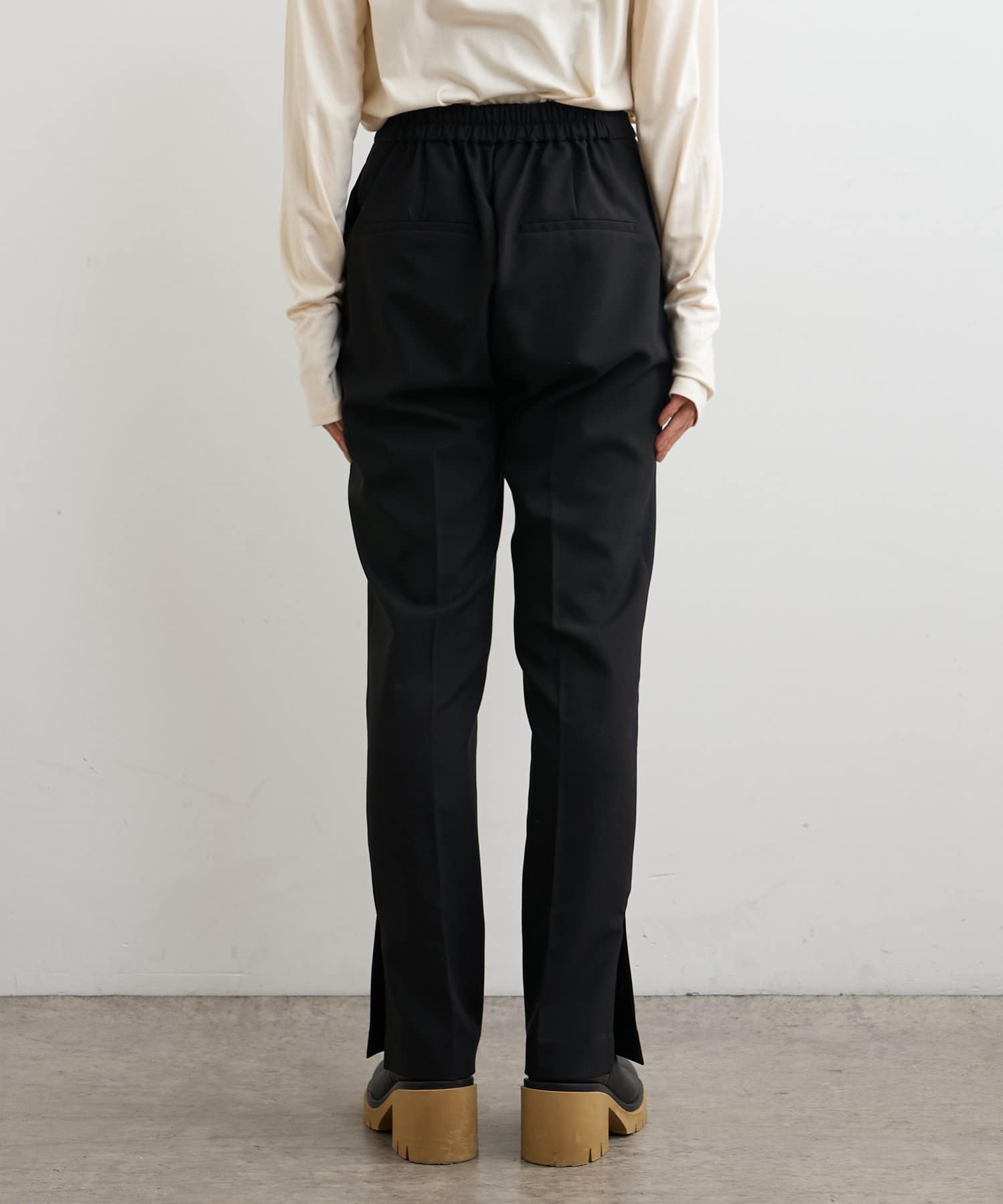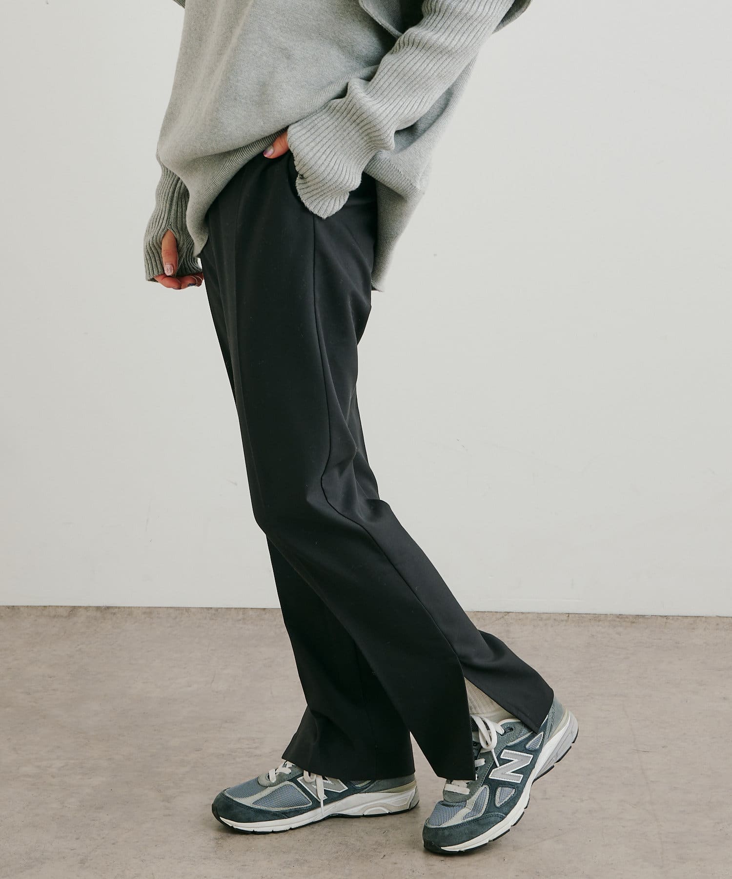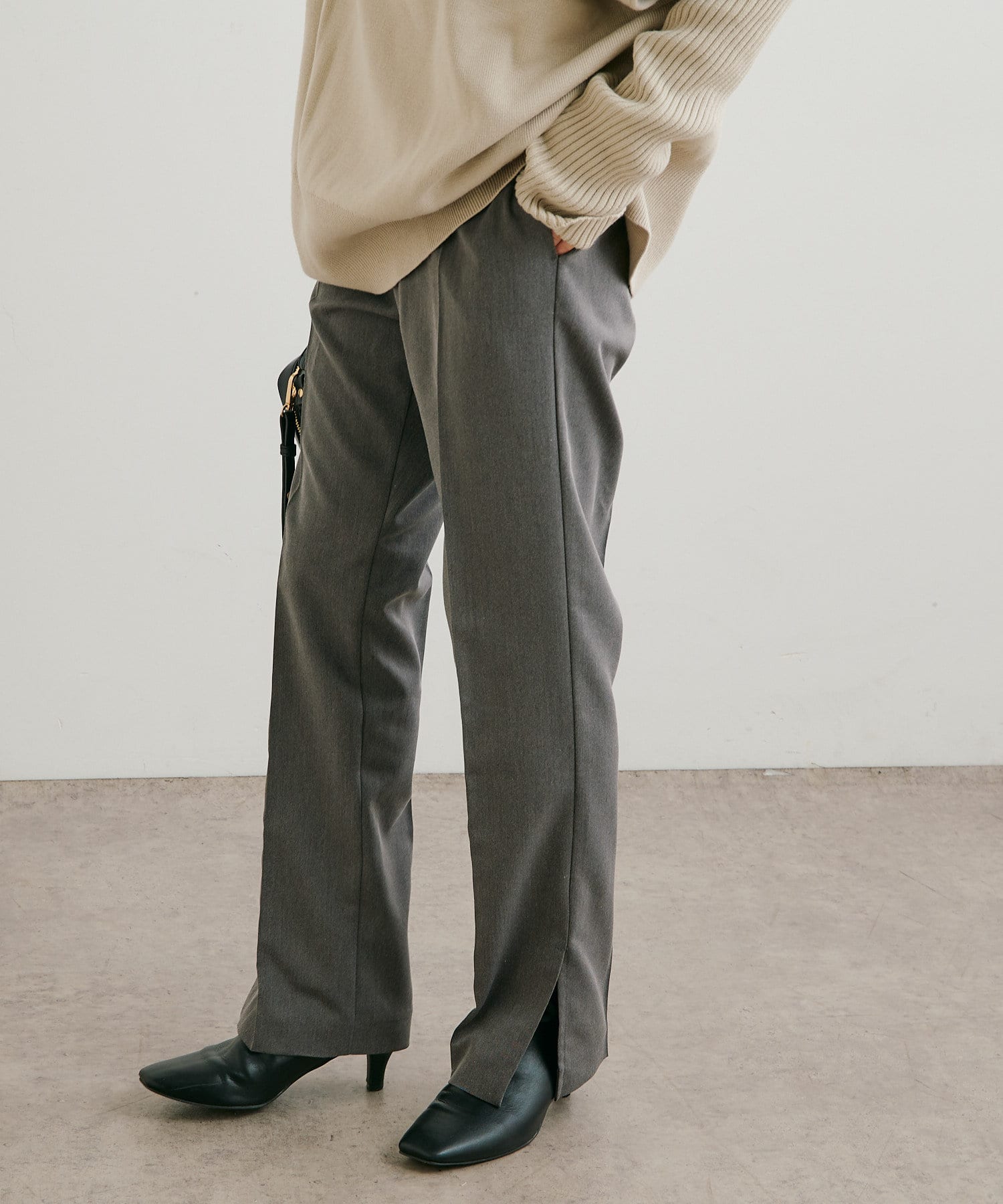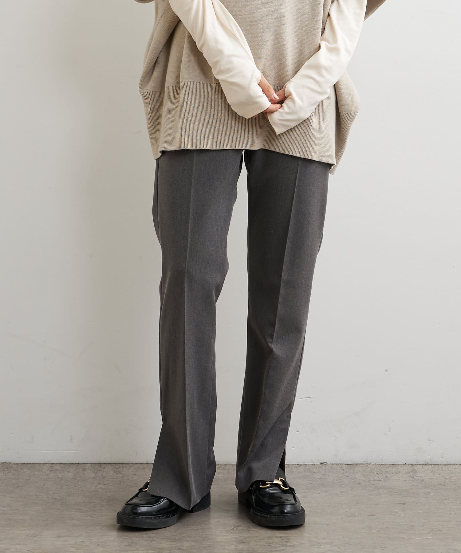 ・パンツは、裾のサイドスリットとセンタープレスのデザインが美脚に見せてくれます。