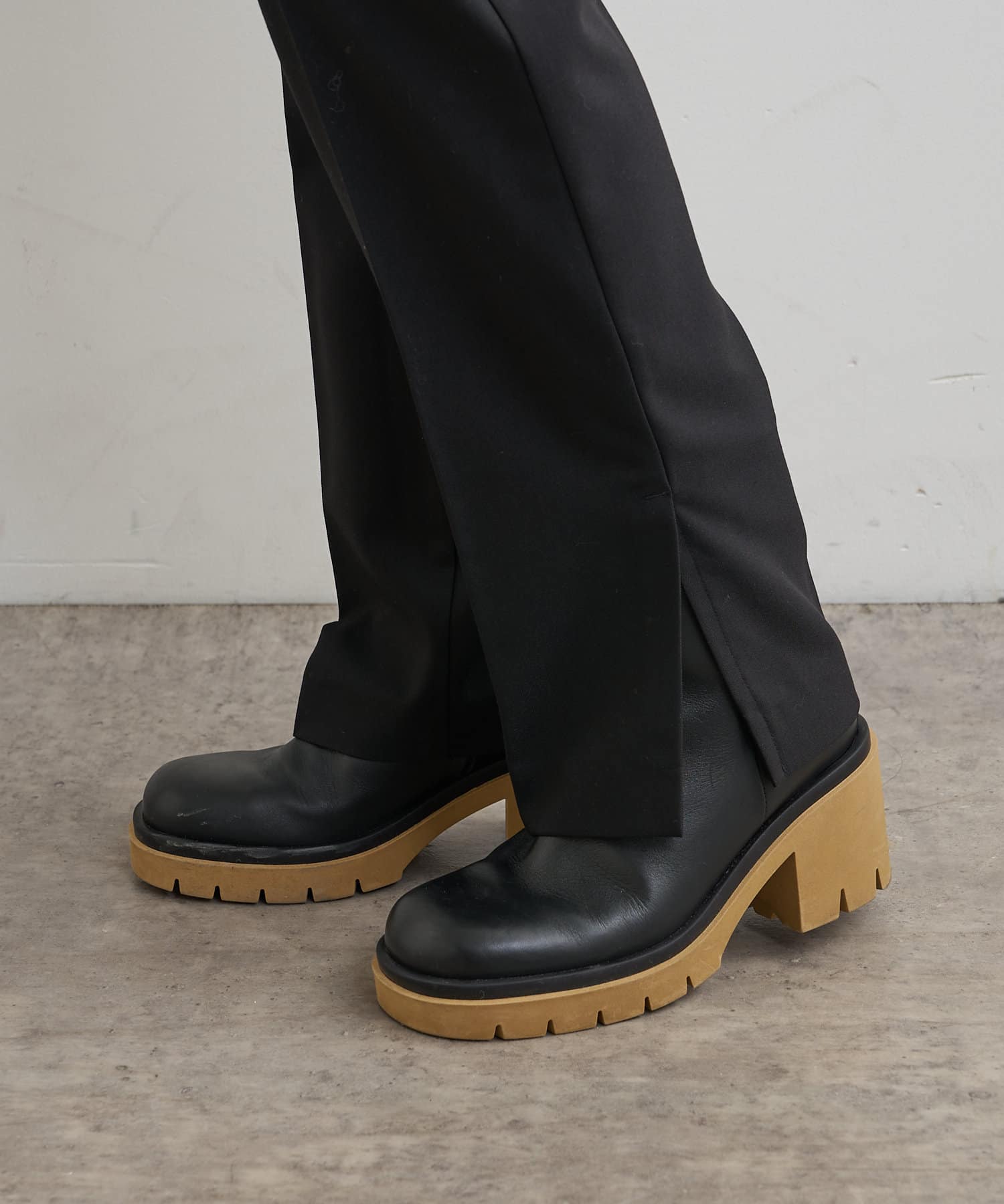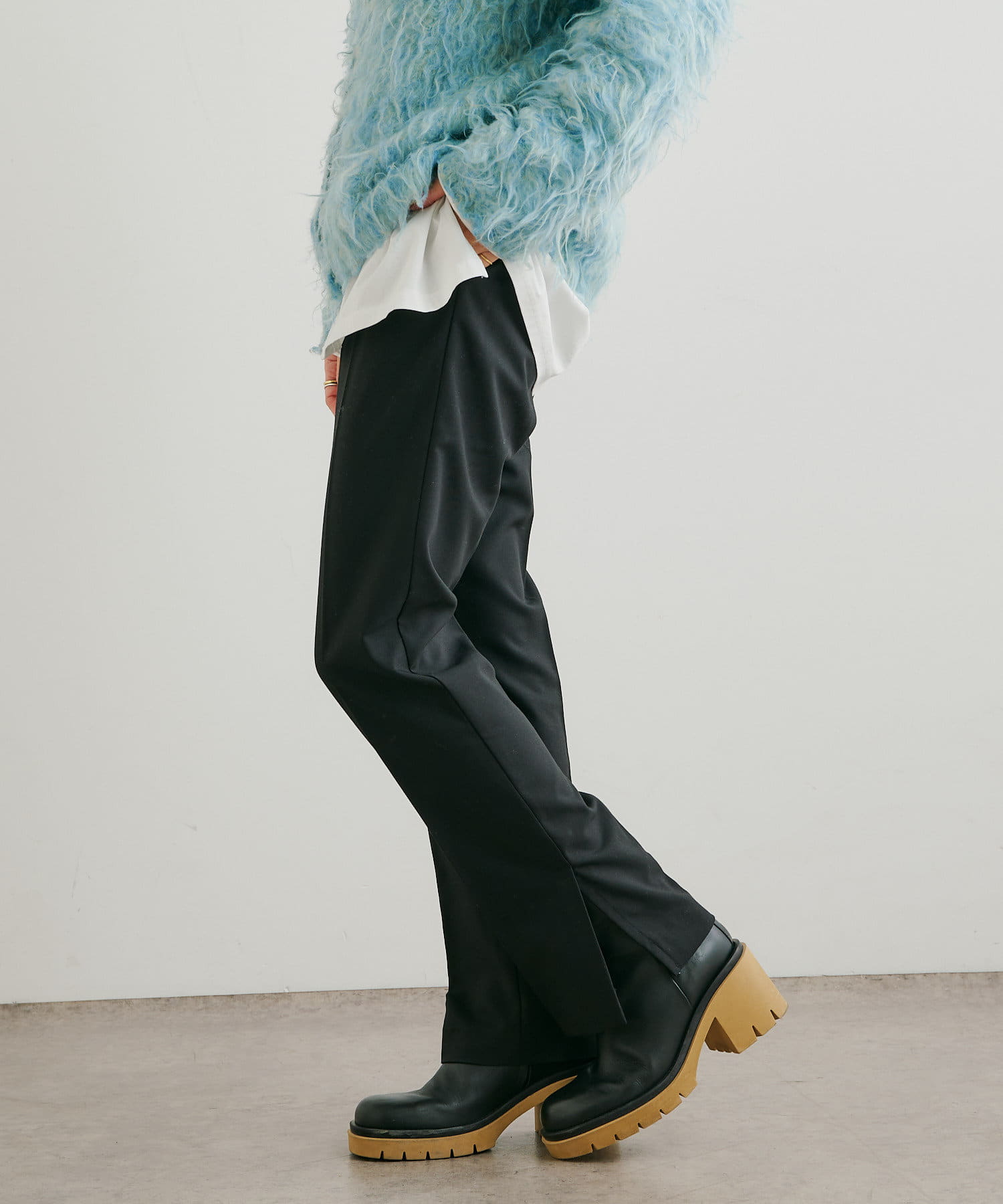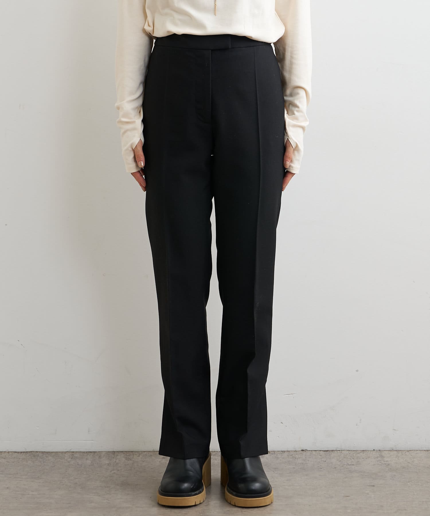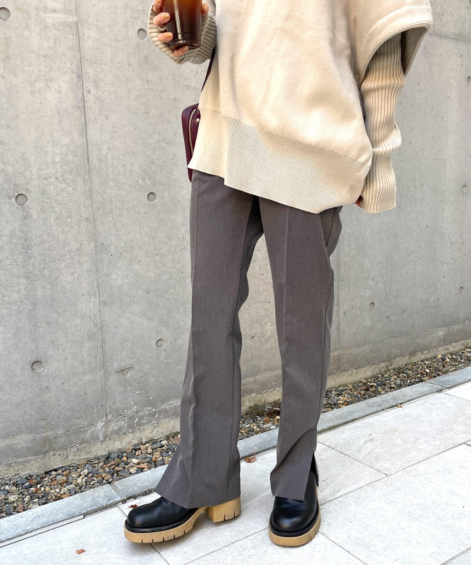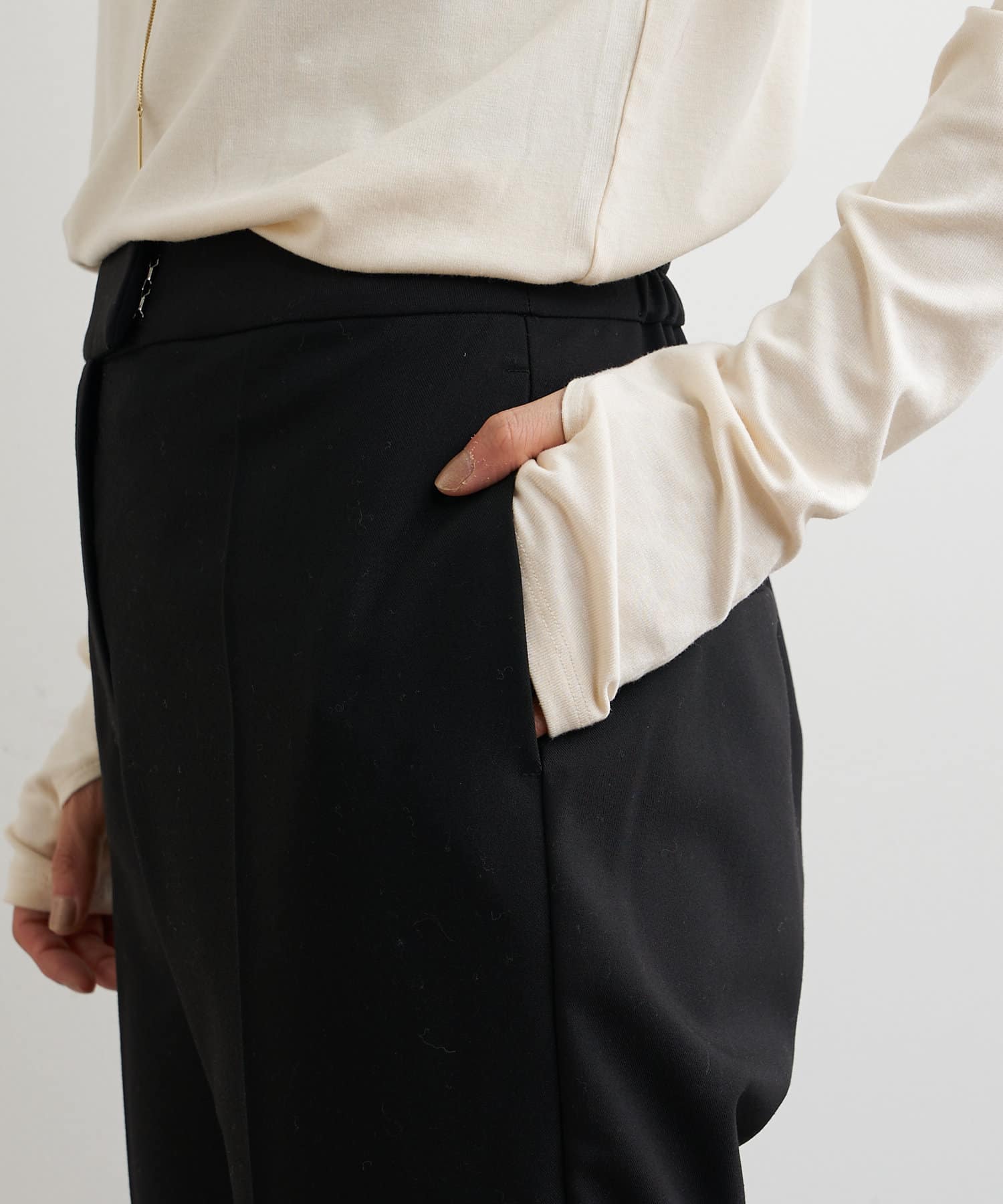 ・パンツは、裾のサイドスリットとセンタープレスのデザインが美脚に見せてくれます。
