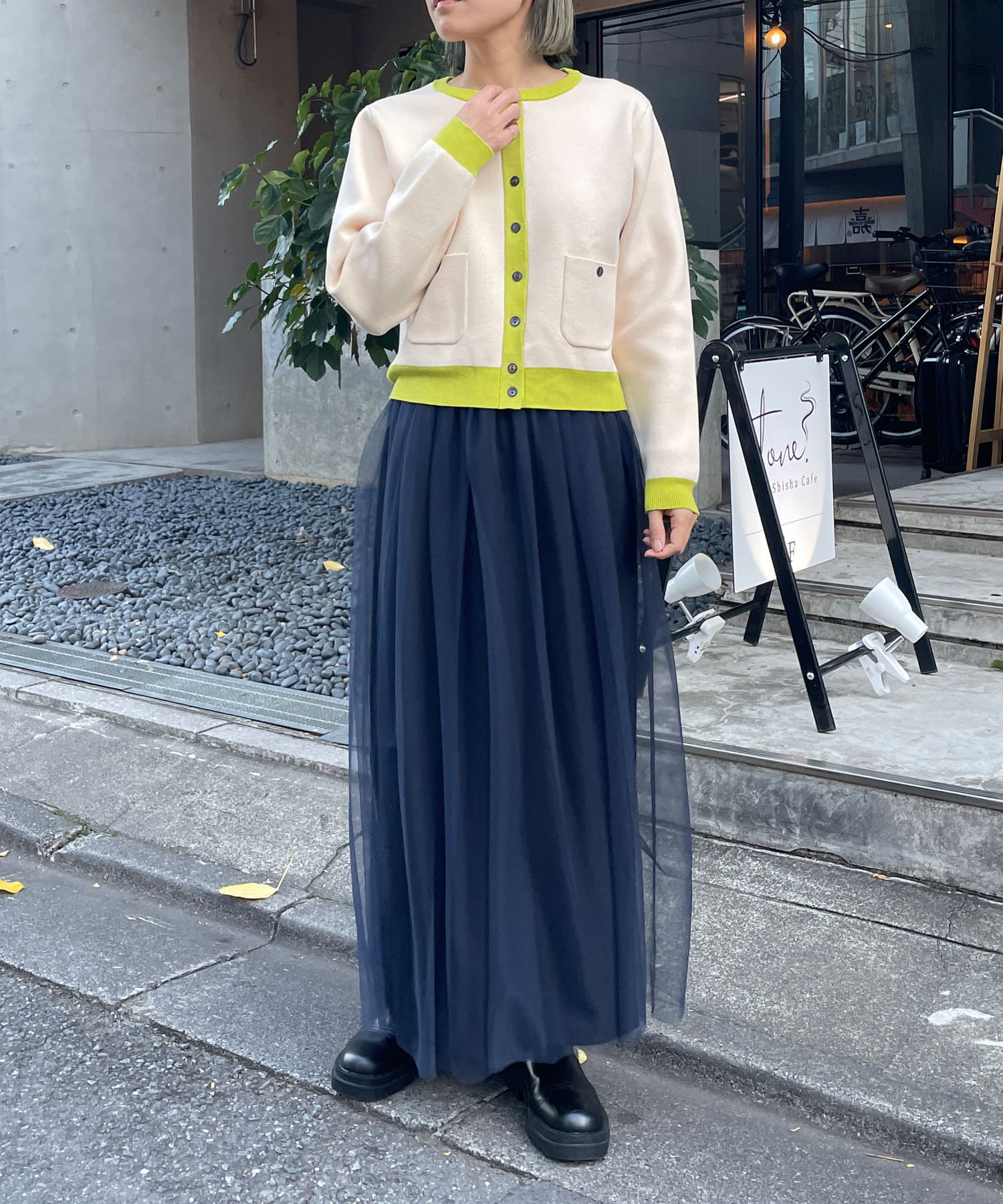 チュールが春にぴったりですし、珍しい色味ですごく可愛いです。ネイビーも気になります。たくさん着回せそうなのでコーディネートするのが楽しみです!