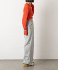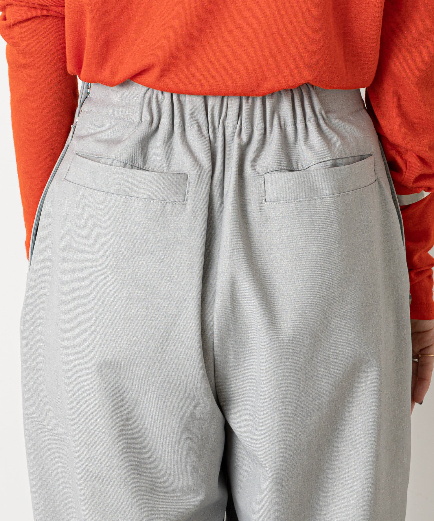 ・脚のラインを拾いずらいハリのある素材と、ややゆったりとしたシルエットが華奢見えしてくれます。