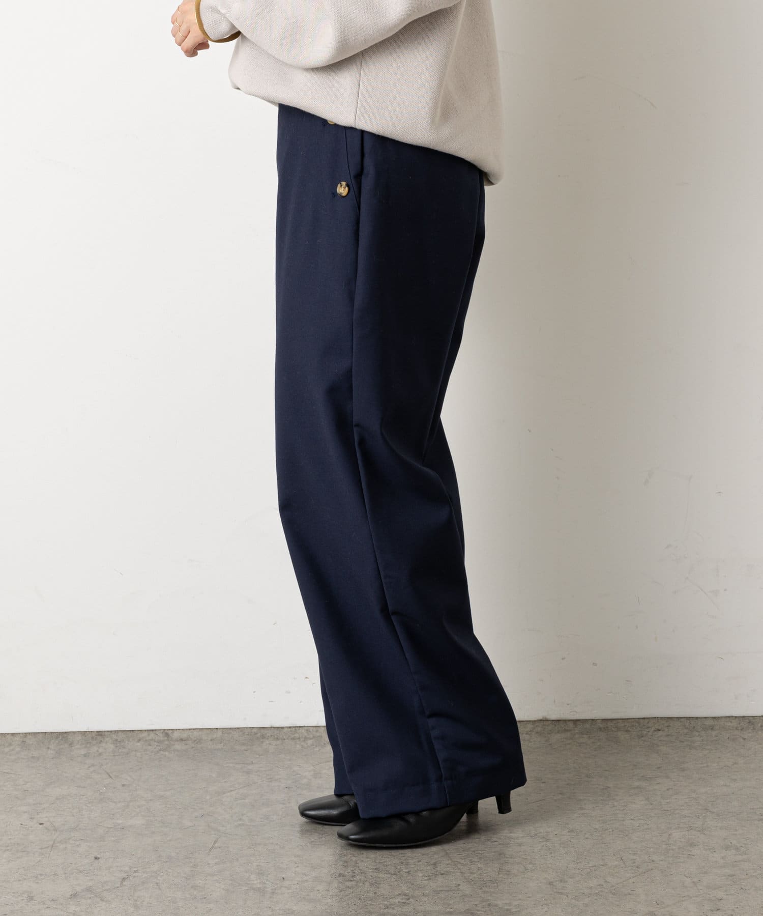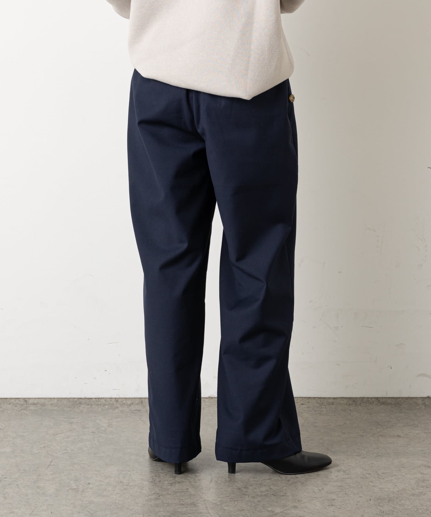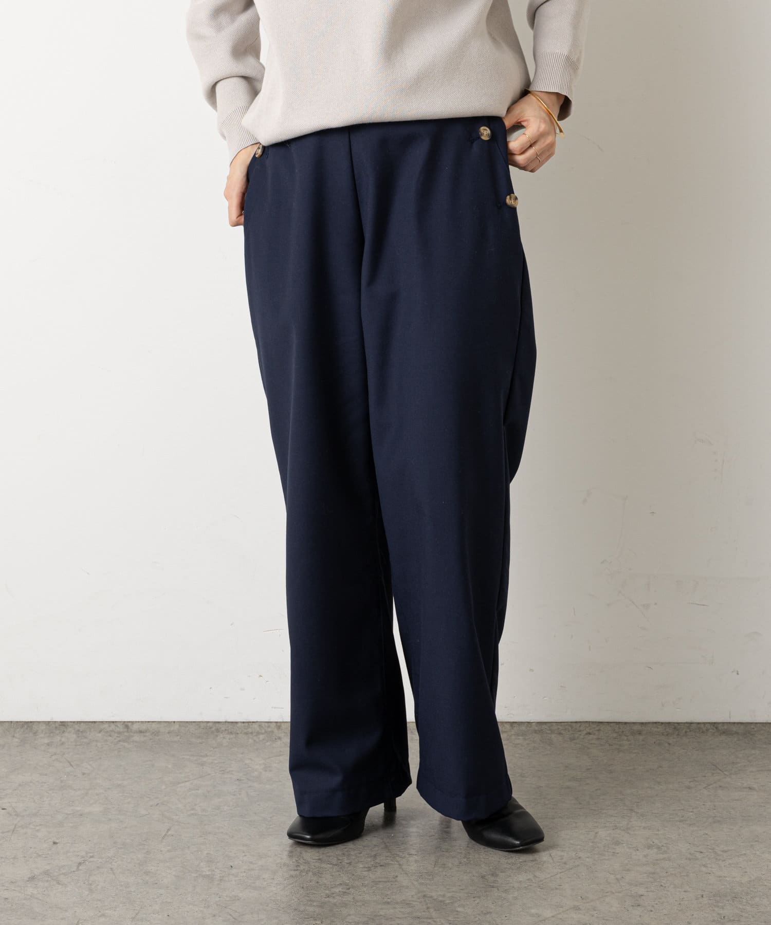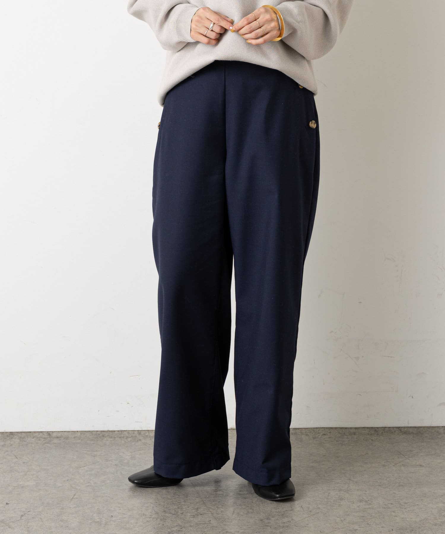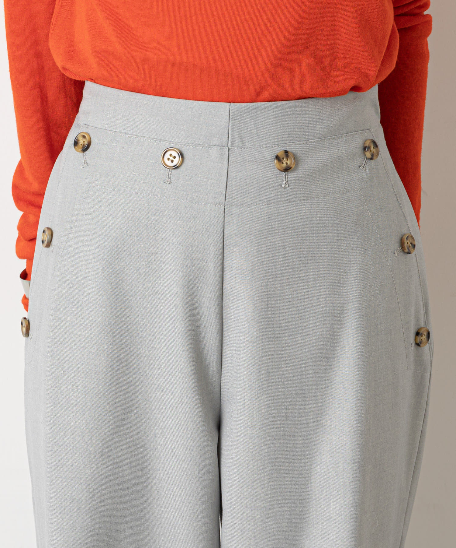 ・ウエストのボタンがコーディネートのアクセントになり、ウエストに目線が行くことでスタイルアップも効果もあるマリンパンツ。