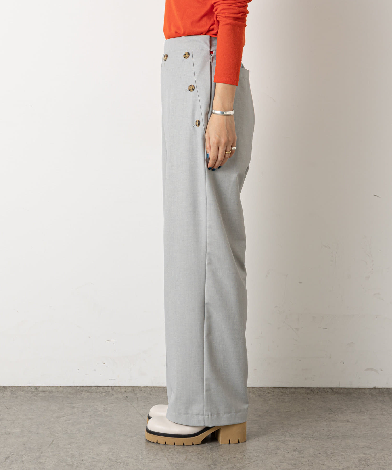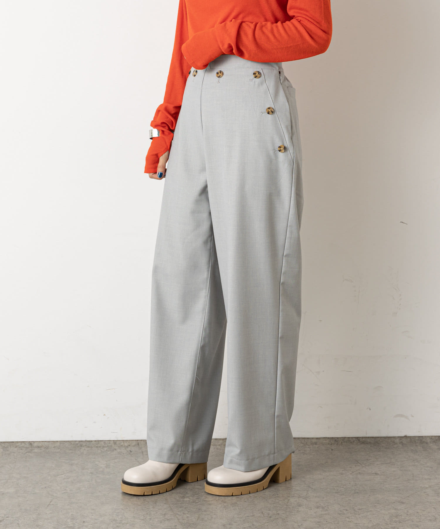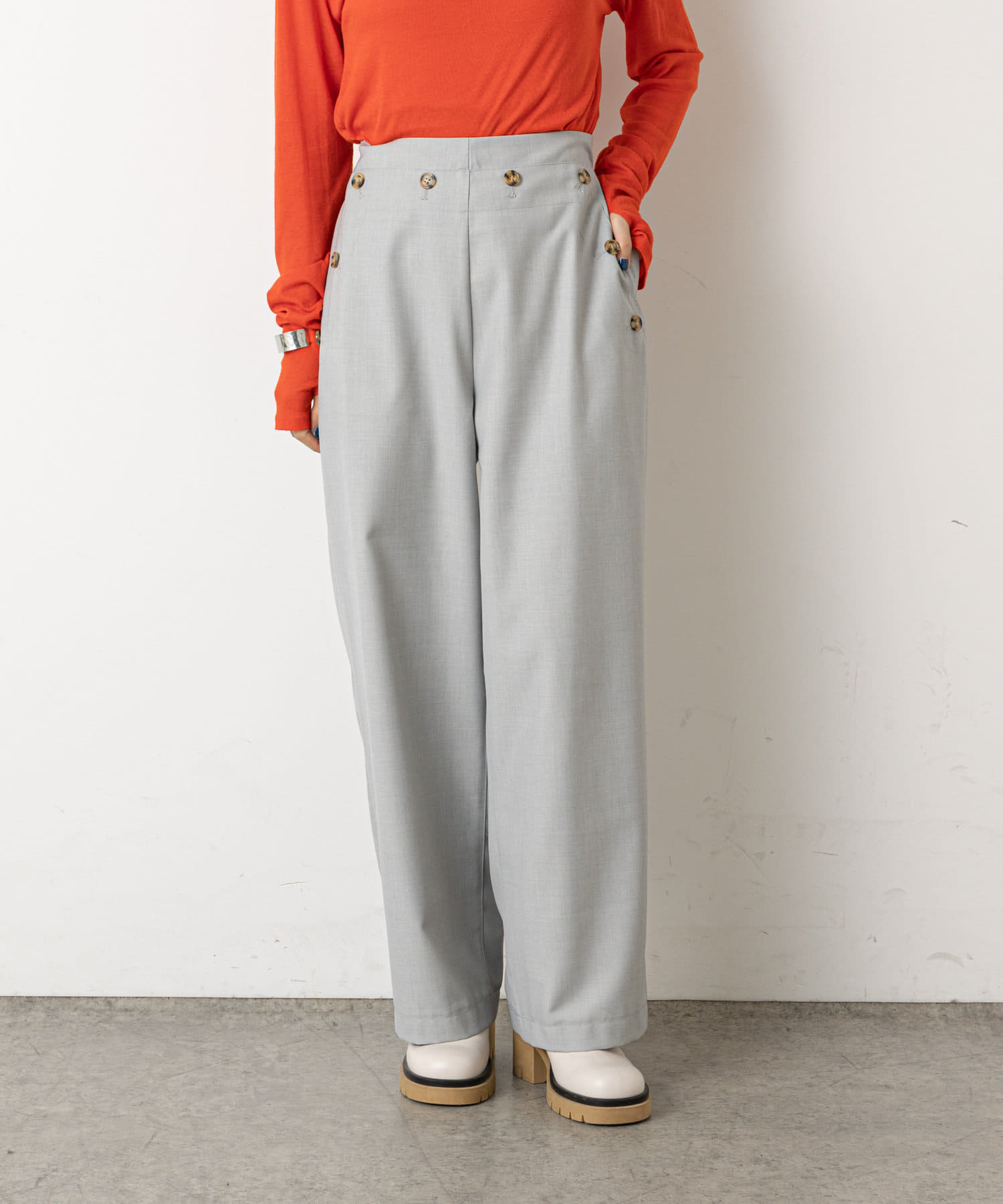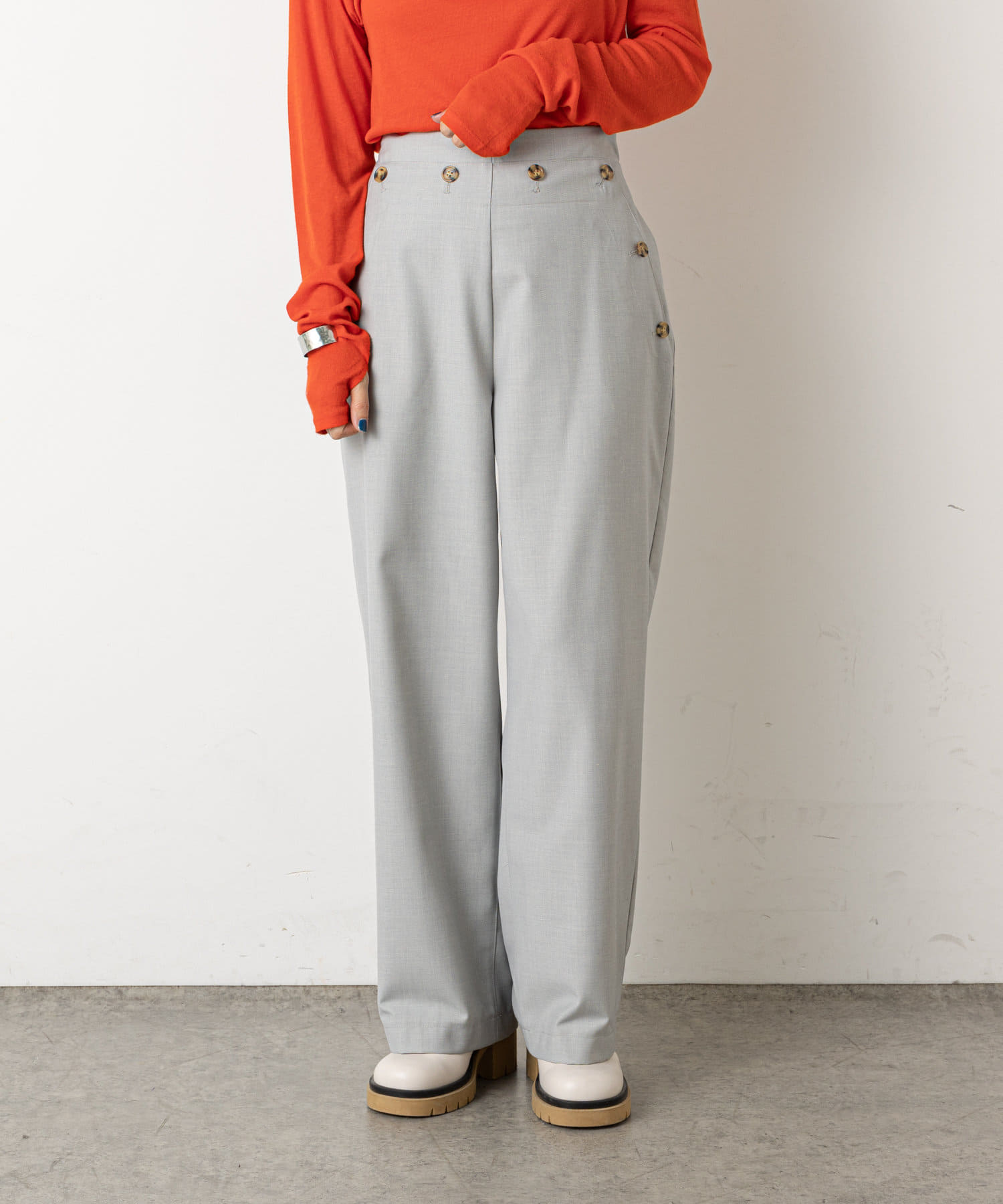 ・ウエストのボタンがコーディネートのアクセントになり、ウエストに目線が行くことでスタイルアップも効果もあるマリンパンツ。