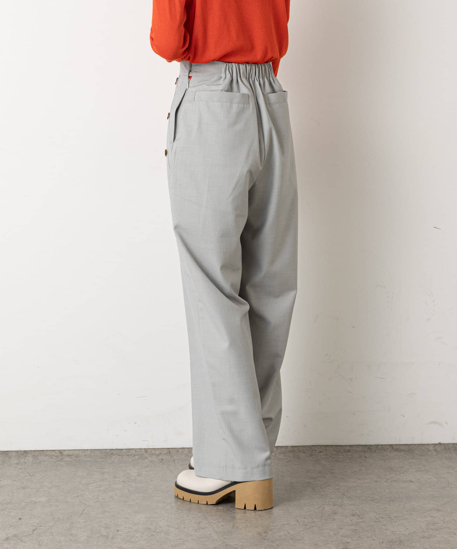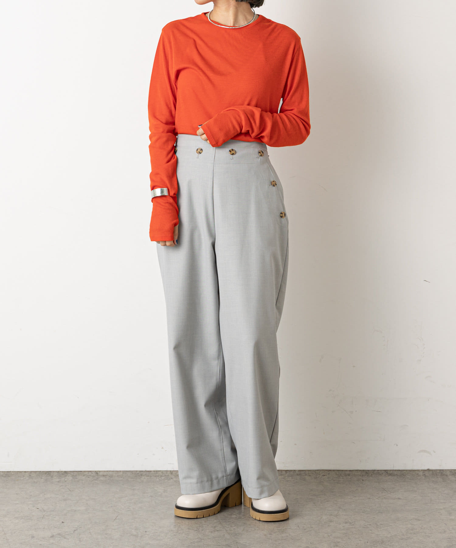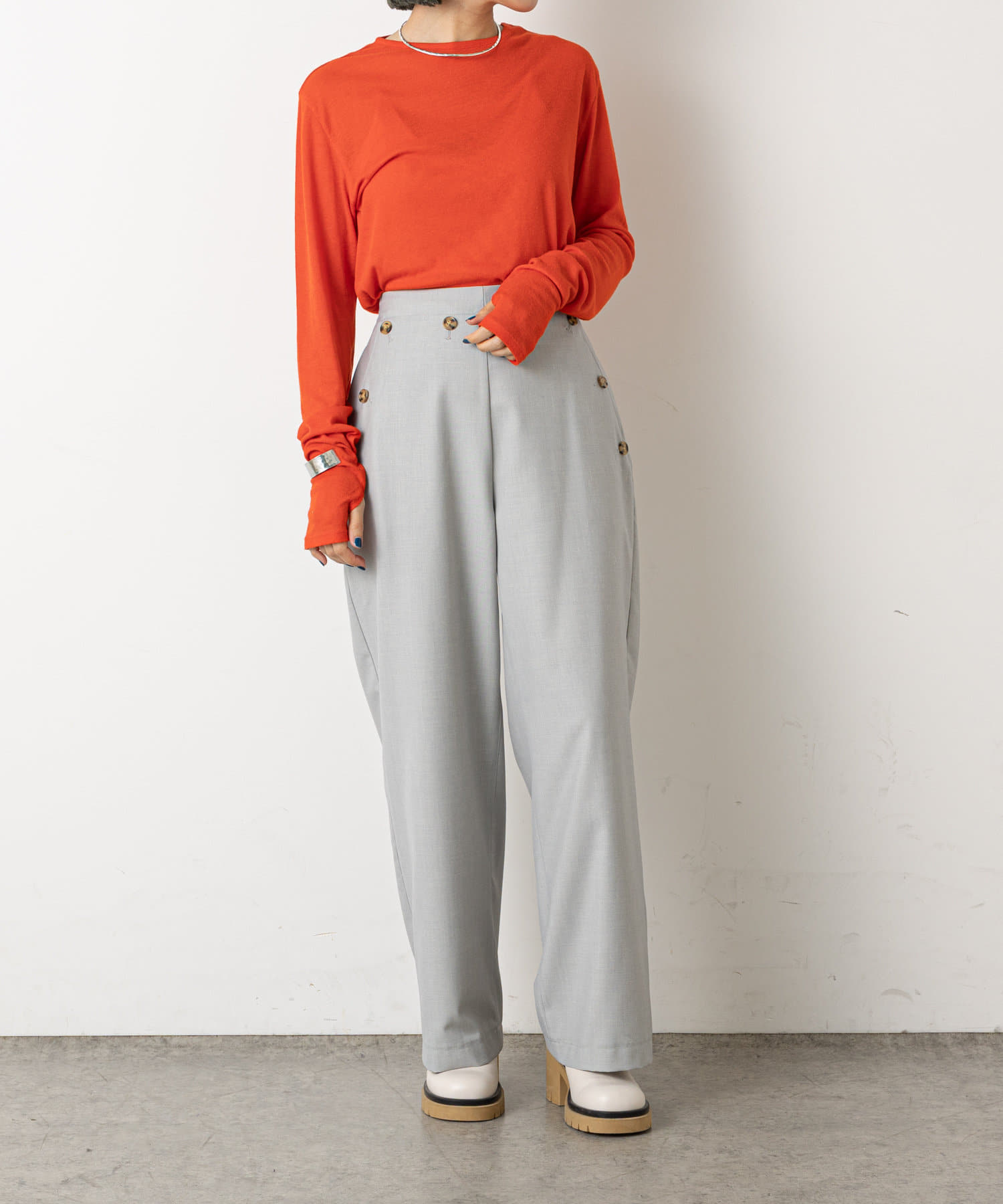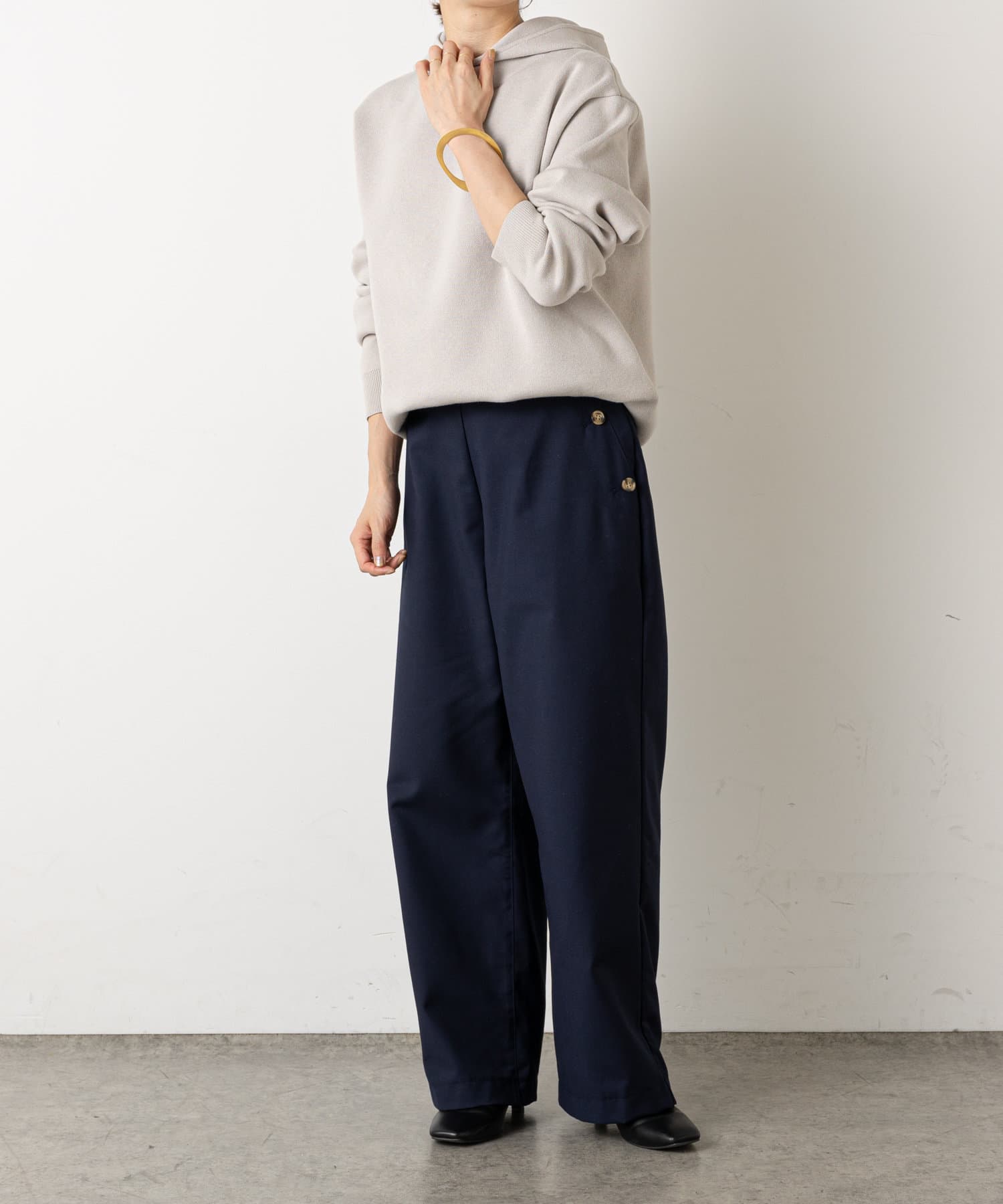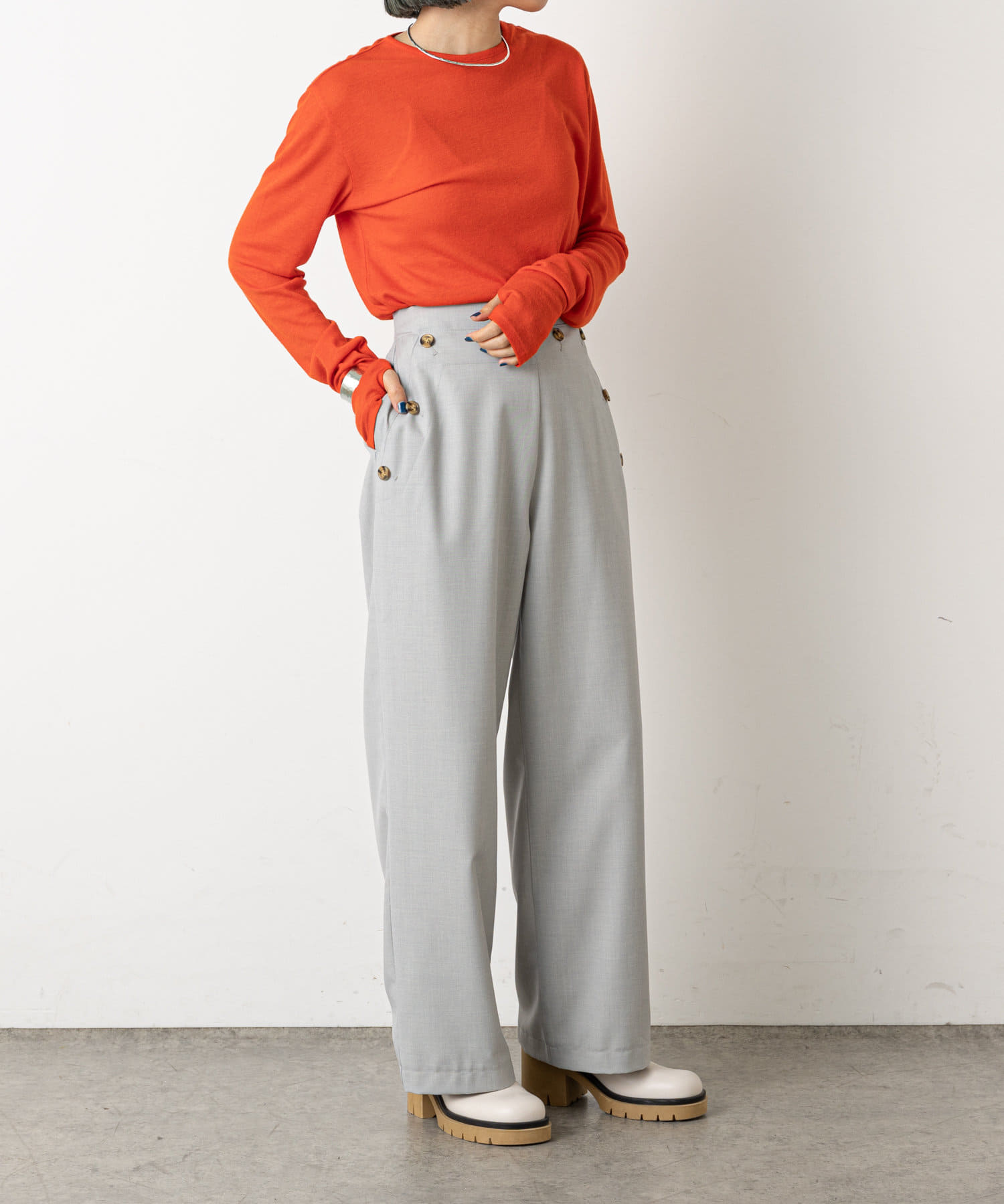 ・ウエストのボタンがコーディネートのアクセントになり、ウエストに目線が行くことでスタイルアップも効果もあるマリンパンツ。