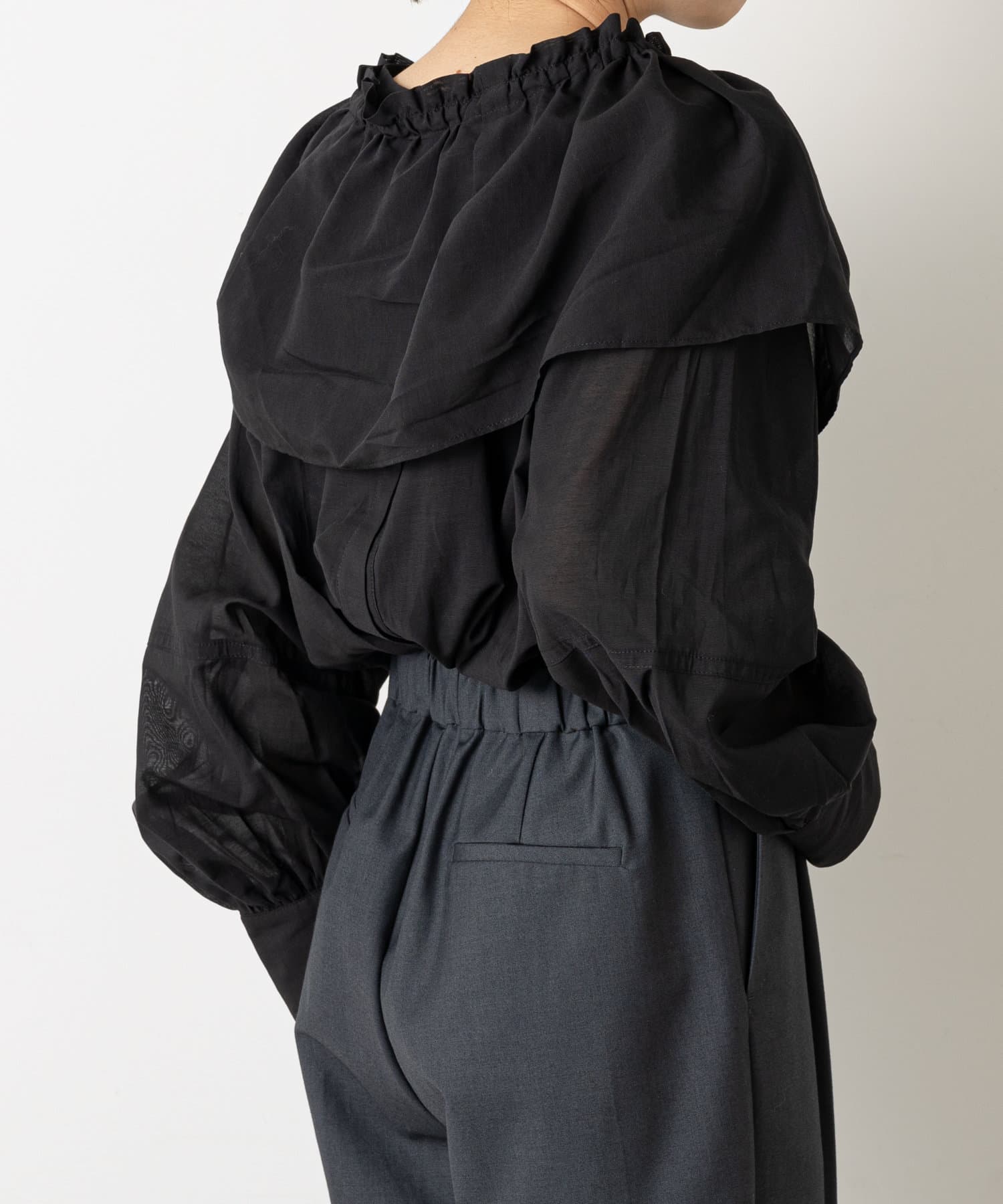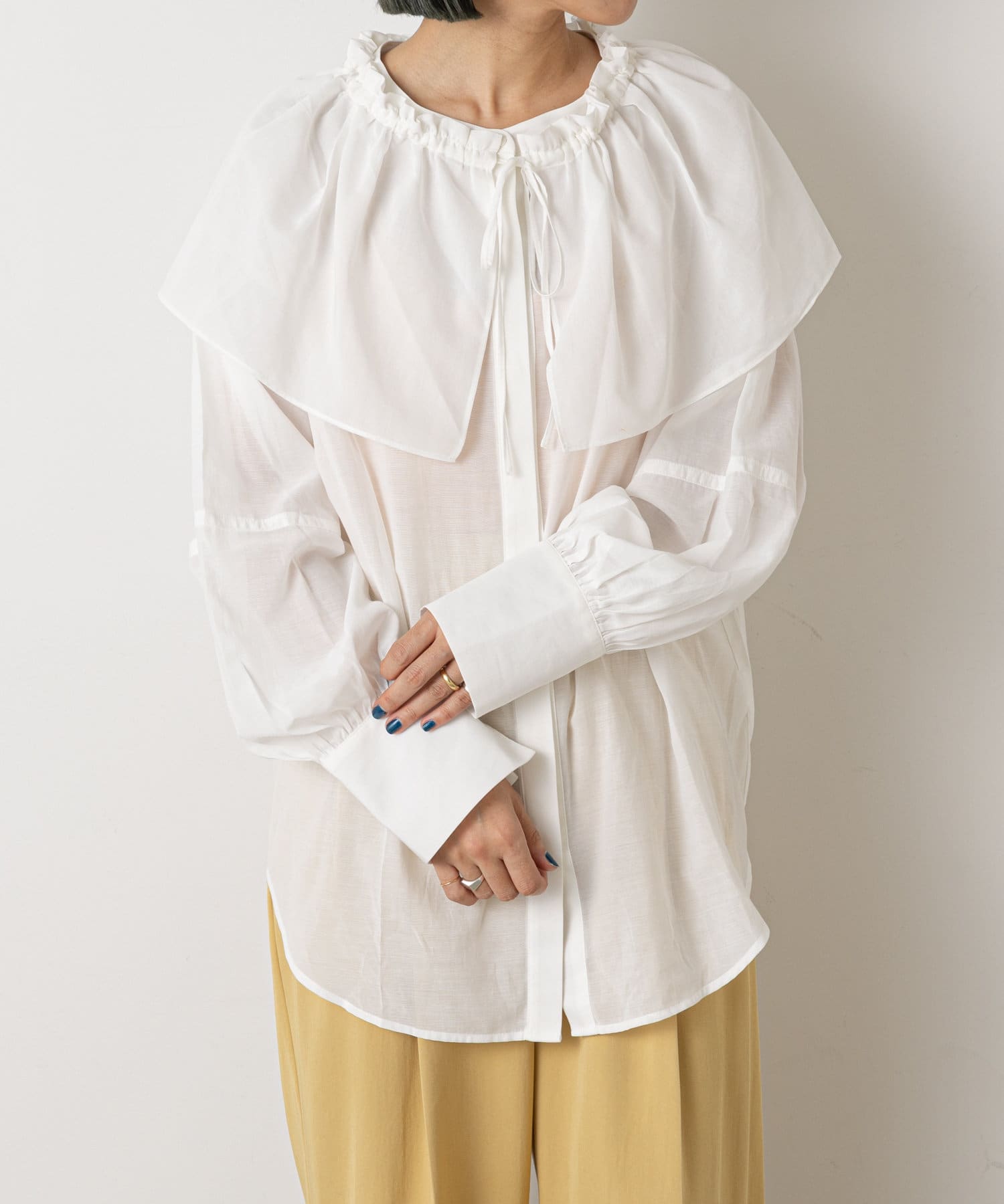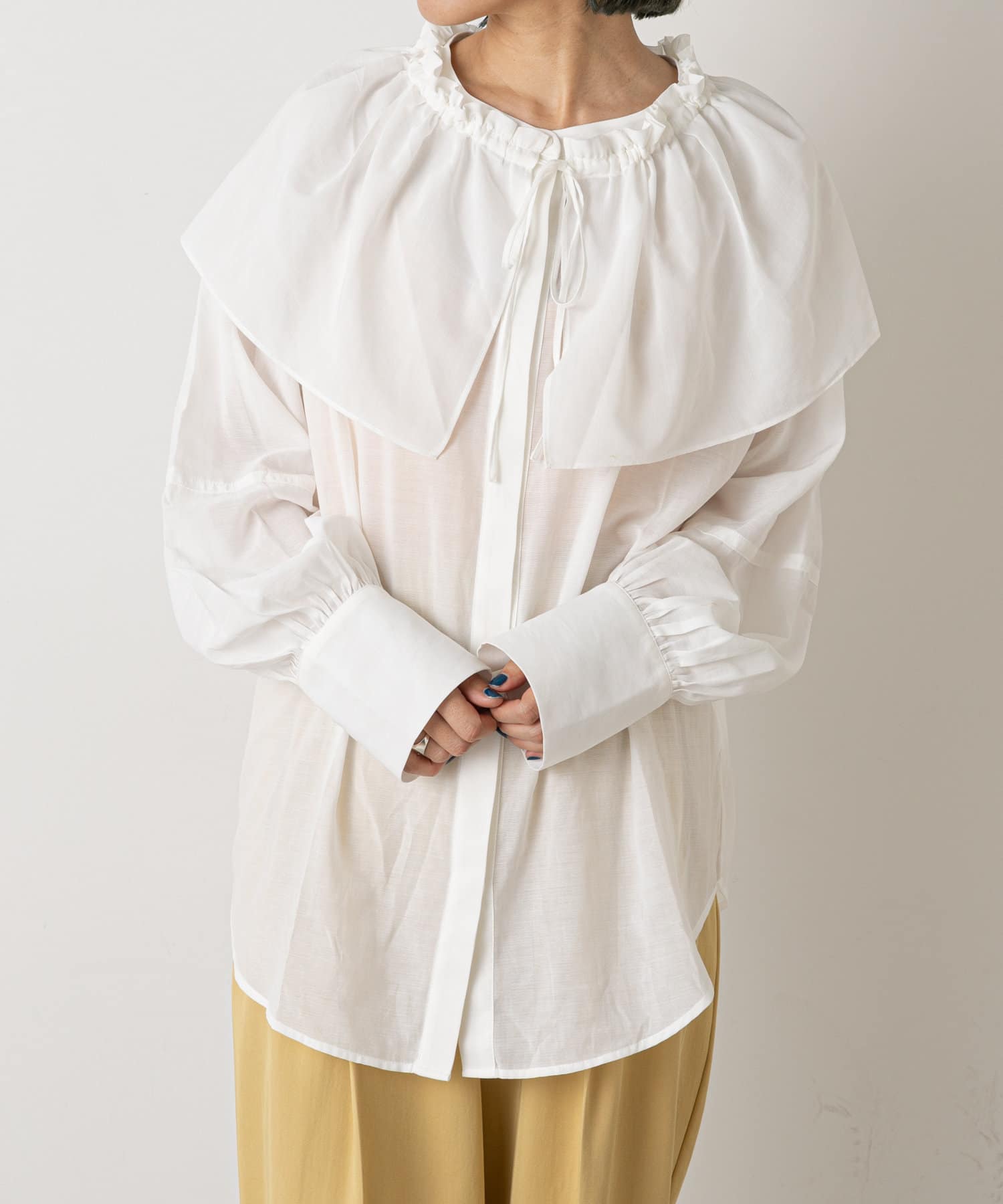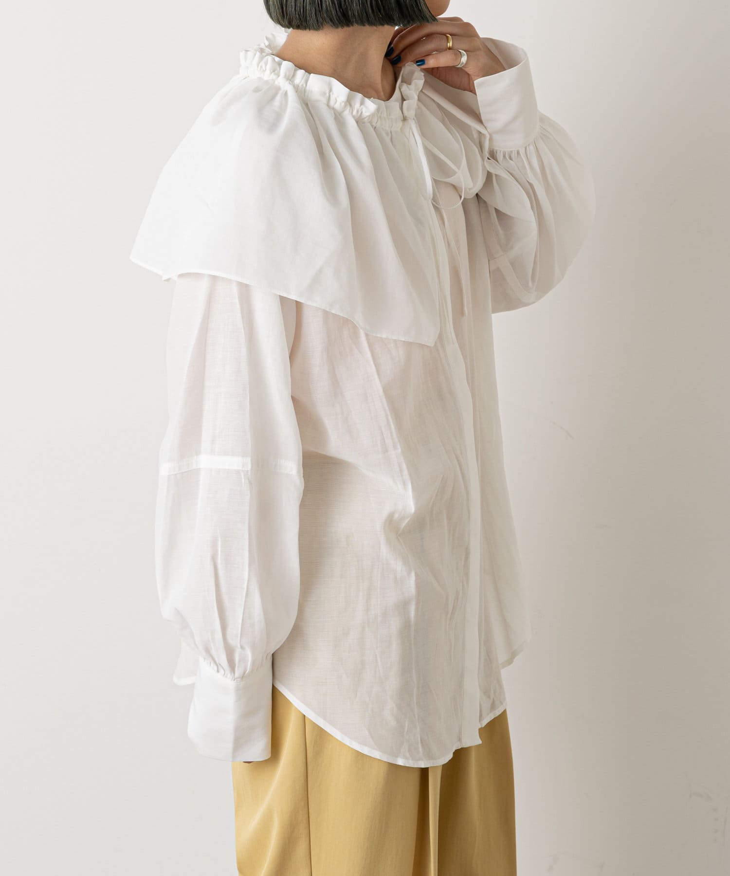 ・付属のフリル襟を首元に付けたり、たすき掛けするスタイルなど雰囲気を変えて着ていただけます。