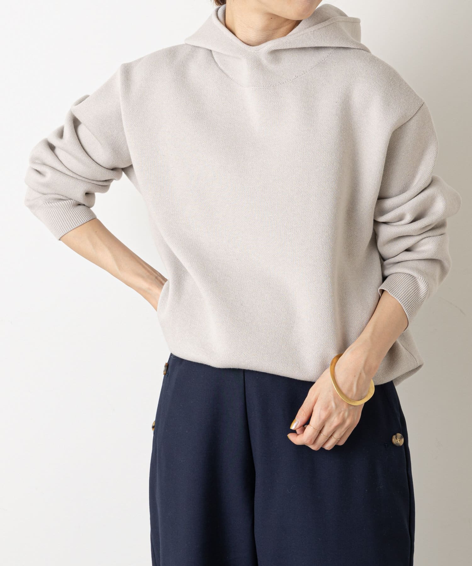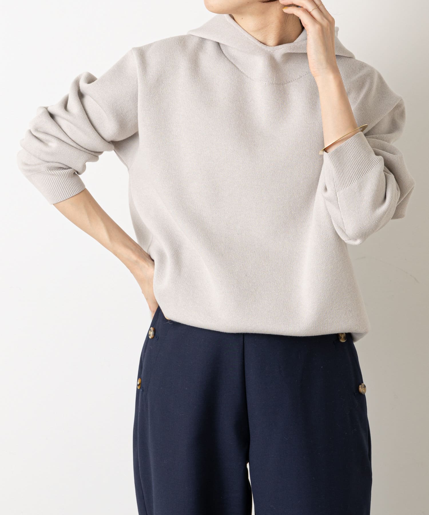 ・シンプルでありながらフードがカジュアルな印象のニット。