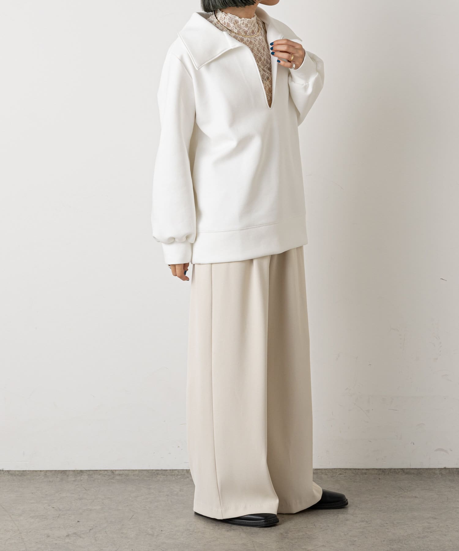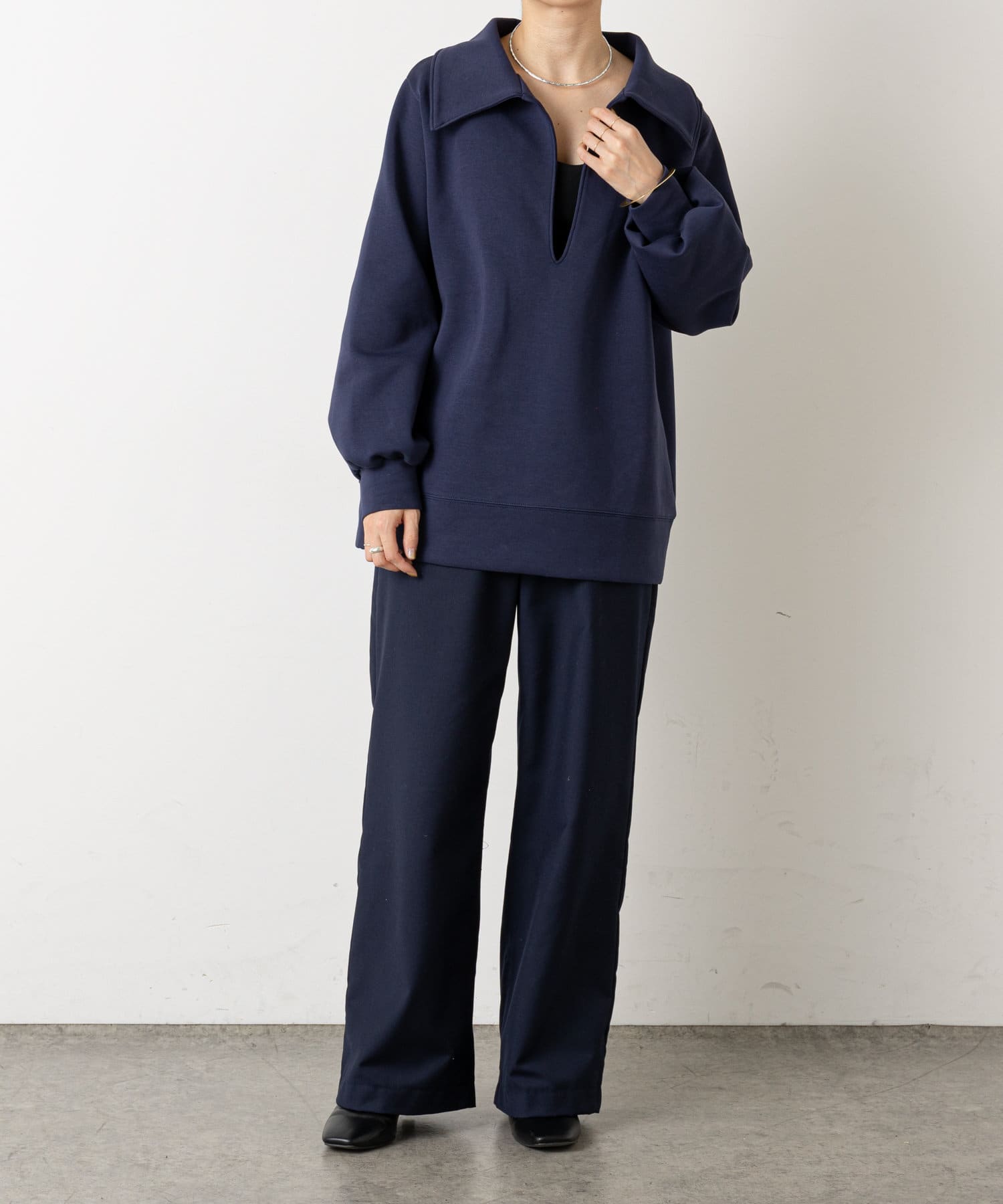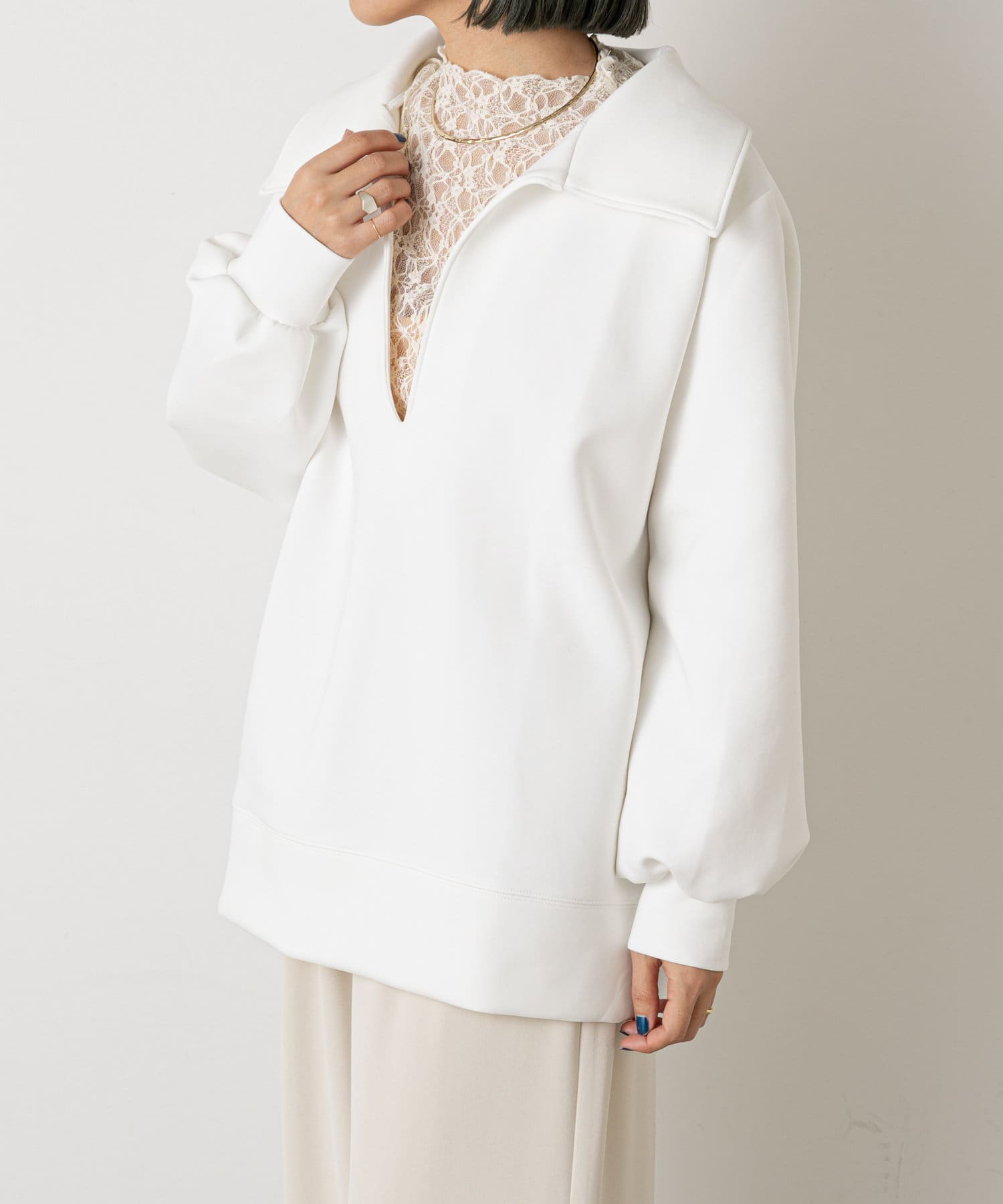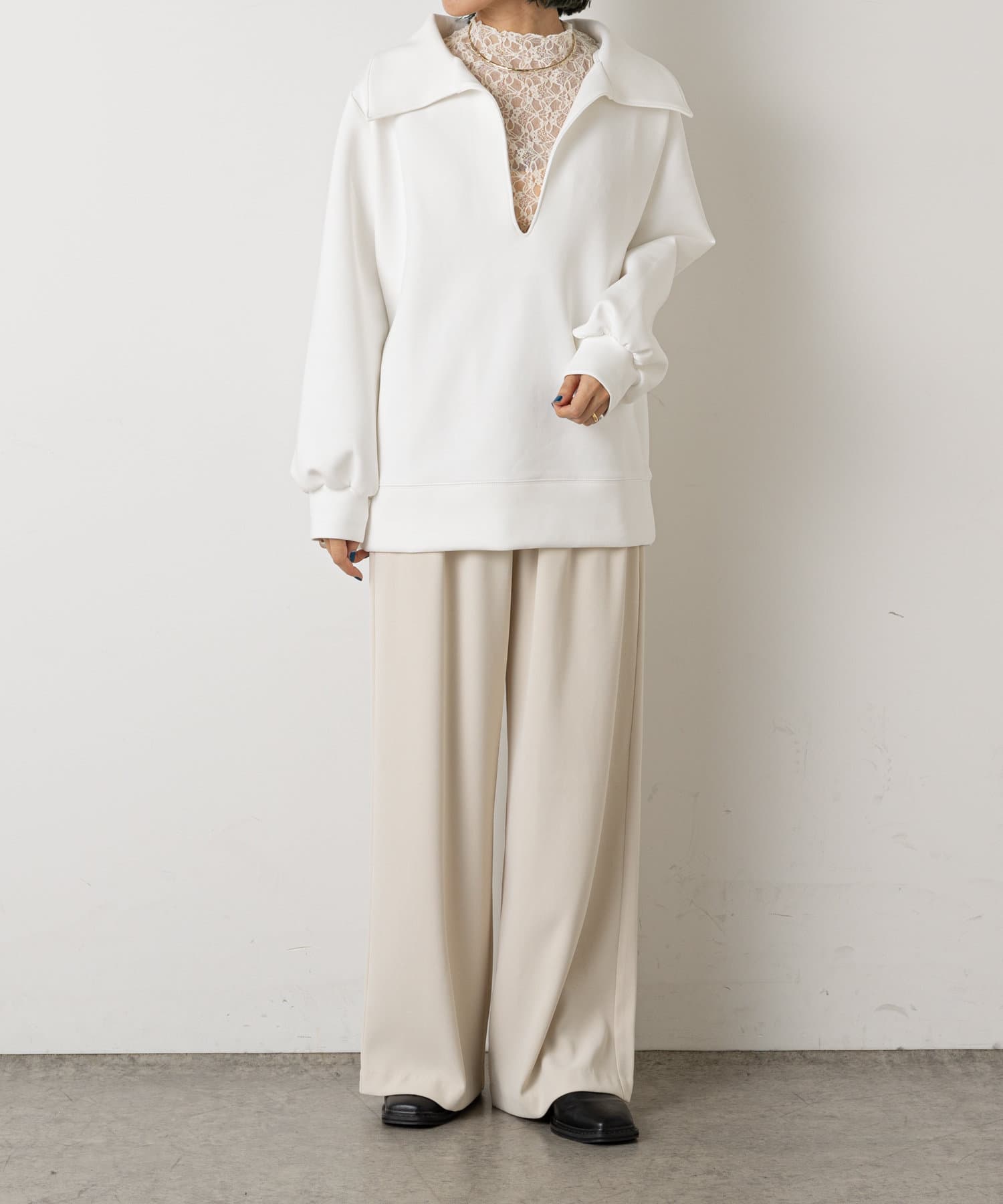 ・深めに開いたネックと襟がポイントになり、コーディネートのメイン使いとして、幅広いレイヤードスタイルが楽しめるアイテムです。