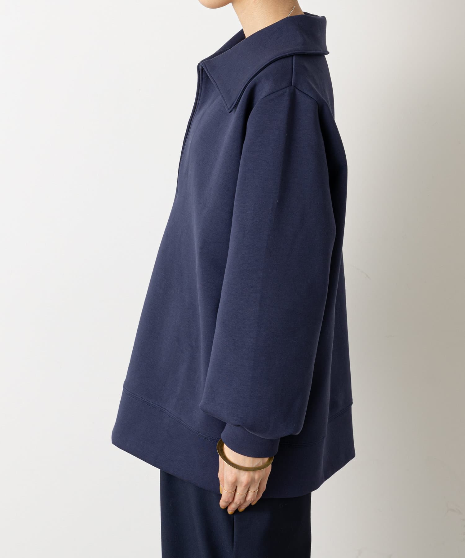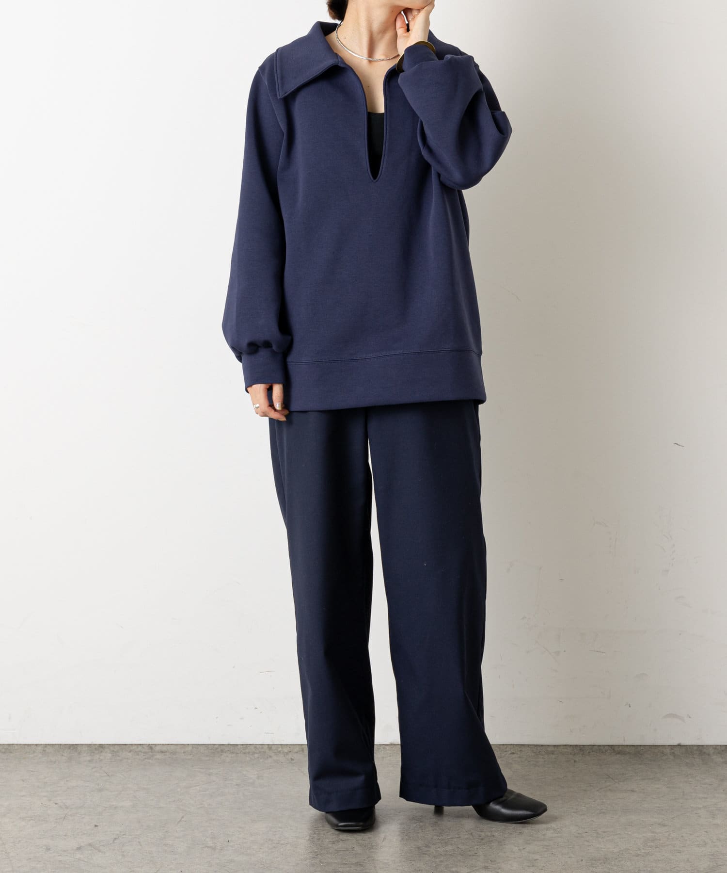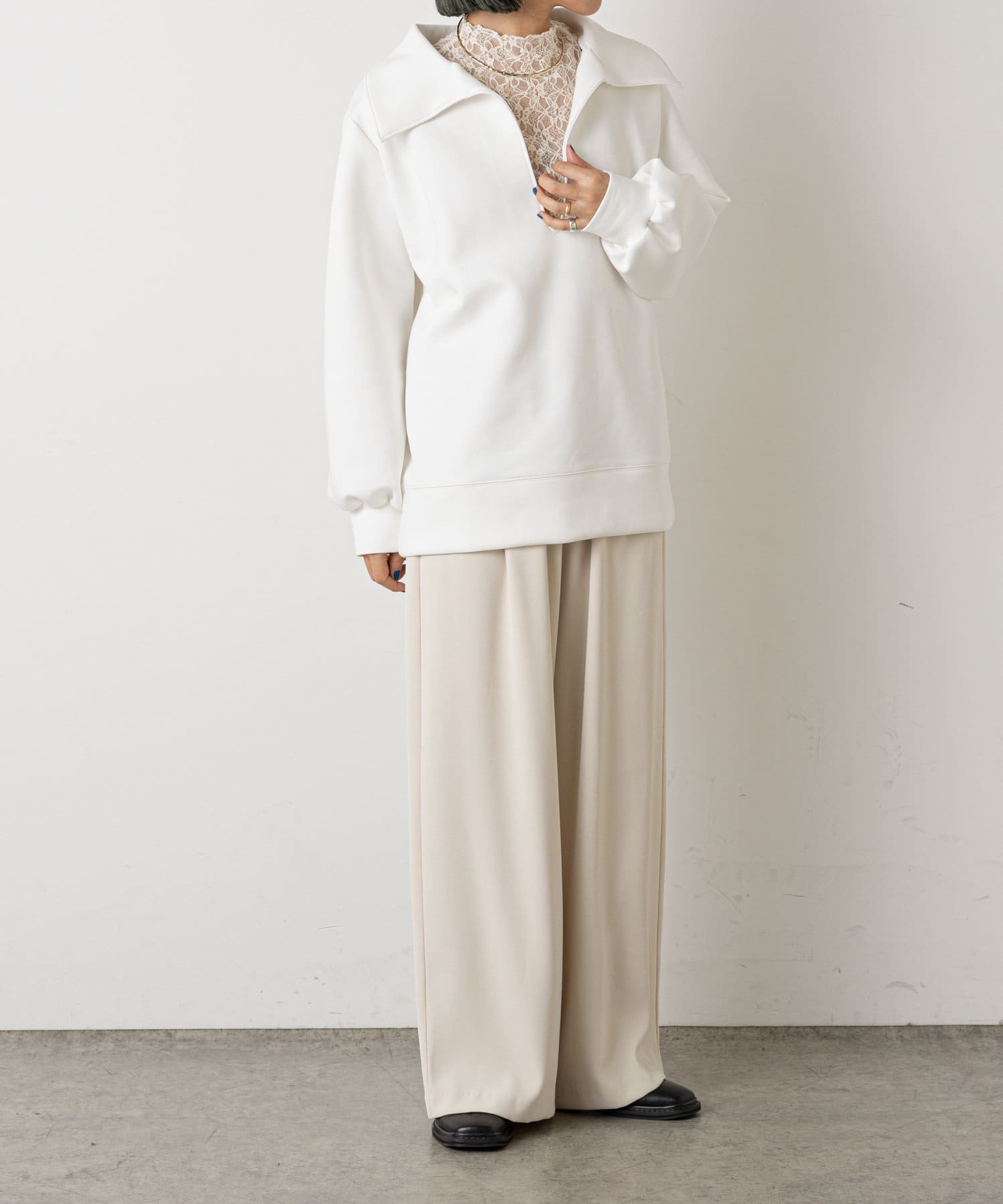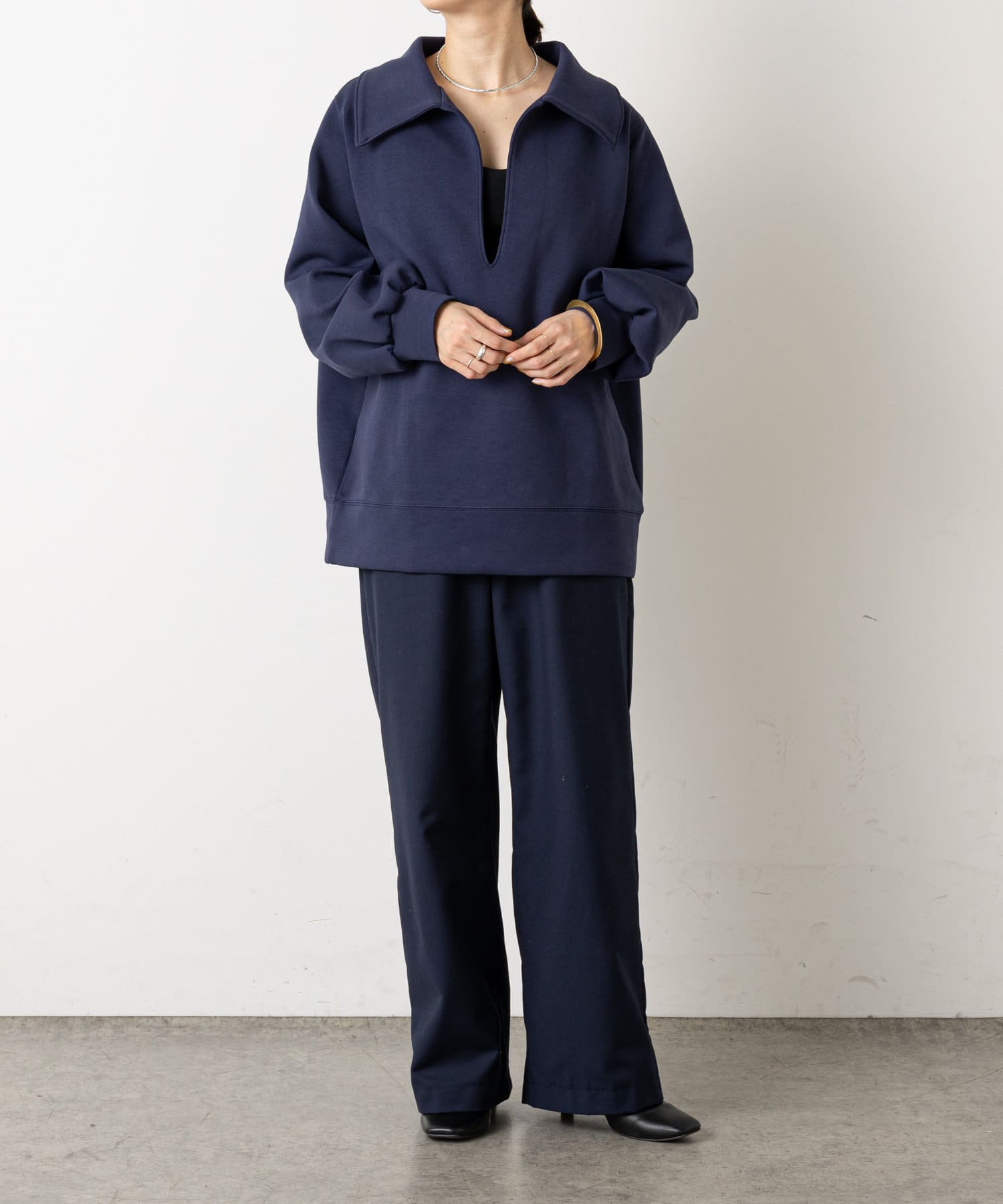 ・深めに開いたネックと襟がポイントになり、コーディネートのメイン使いとして、幅広いレイヤードスタイルが楽しめるアイテムです。