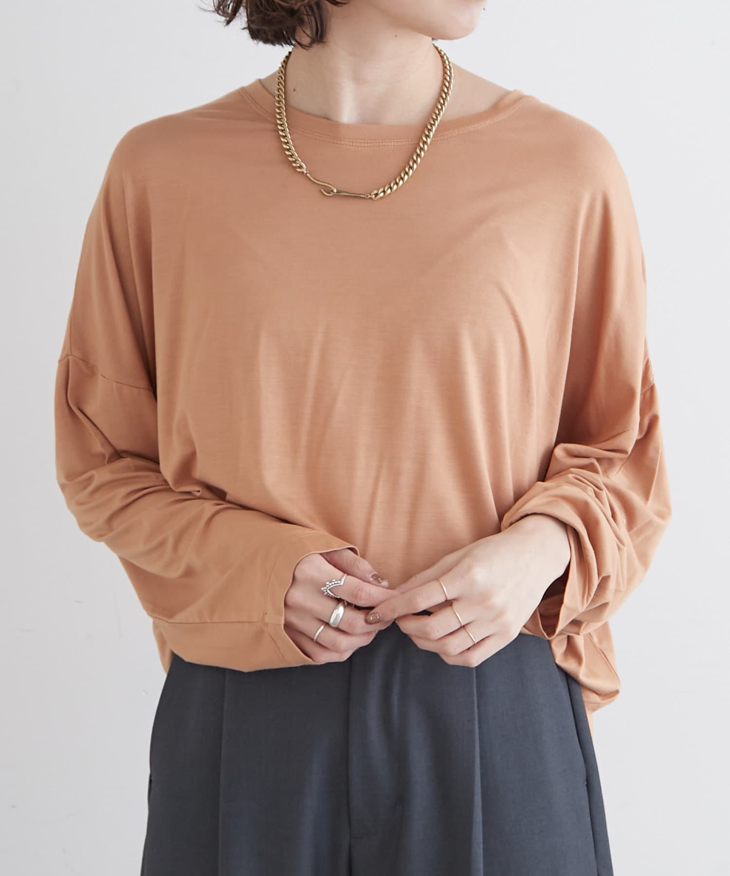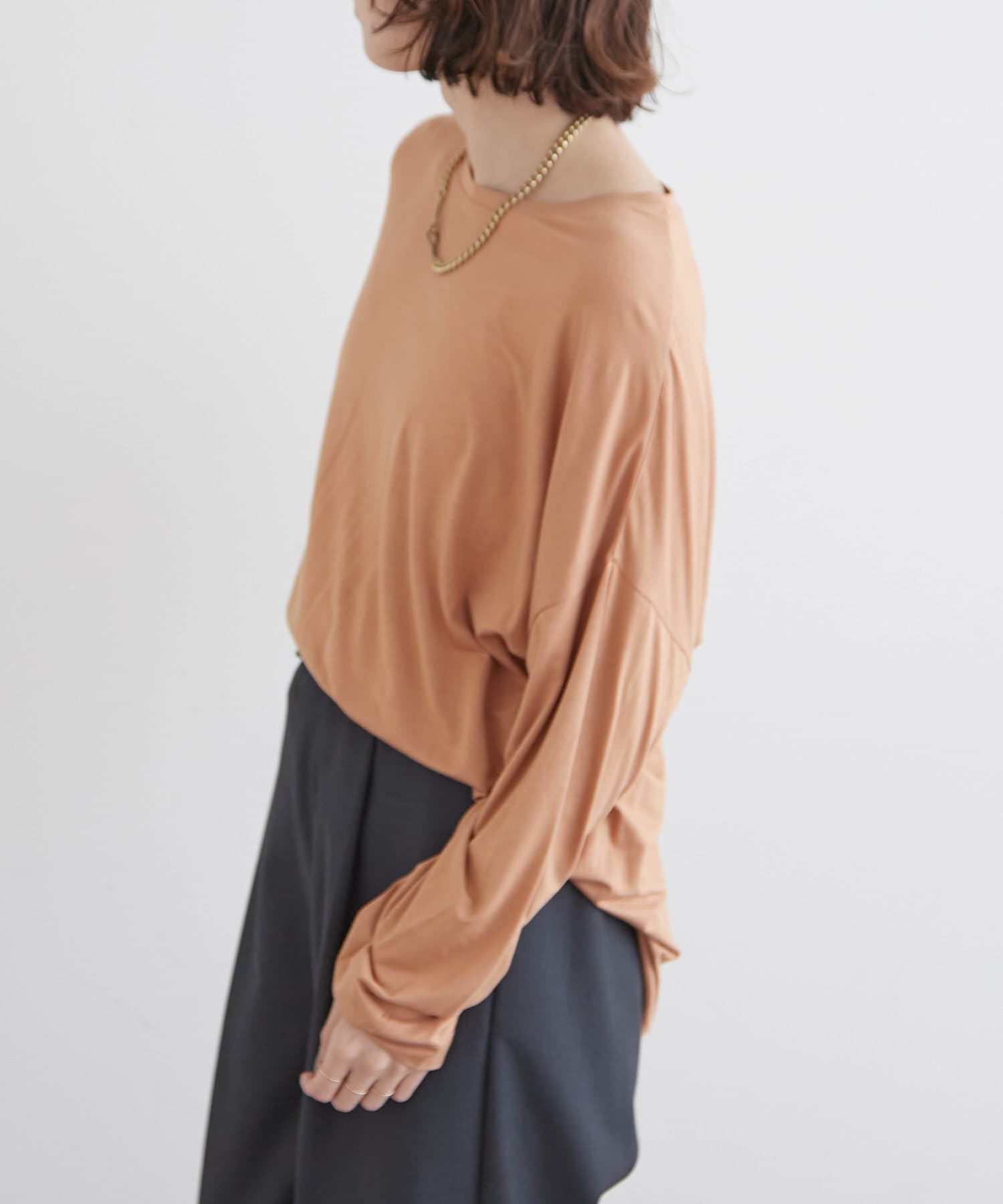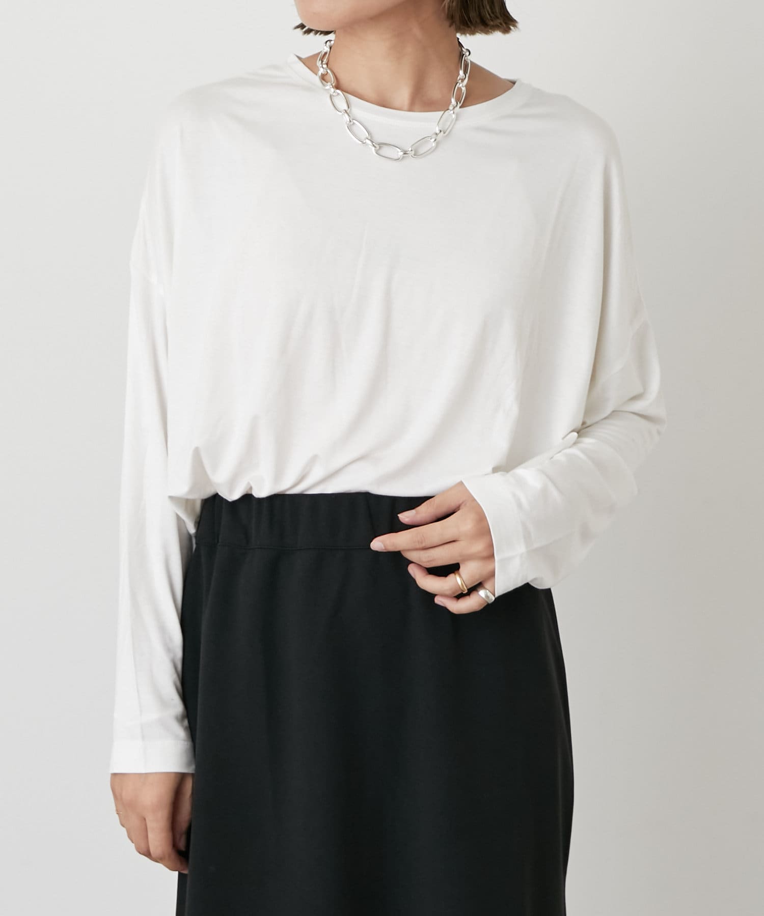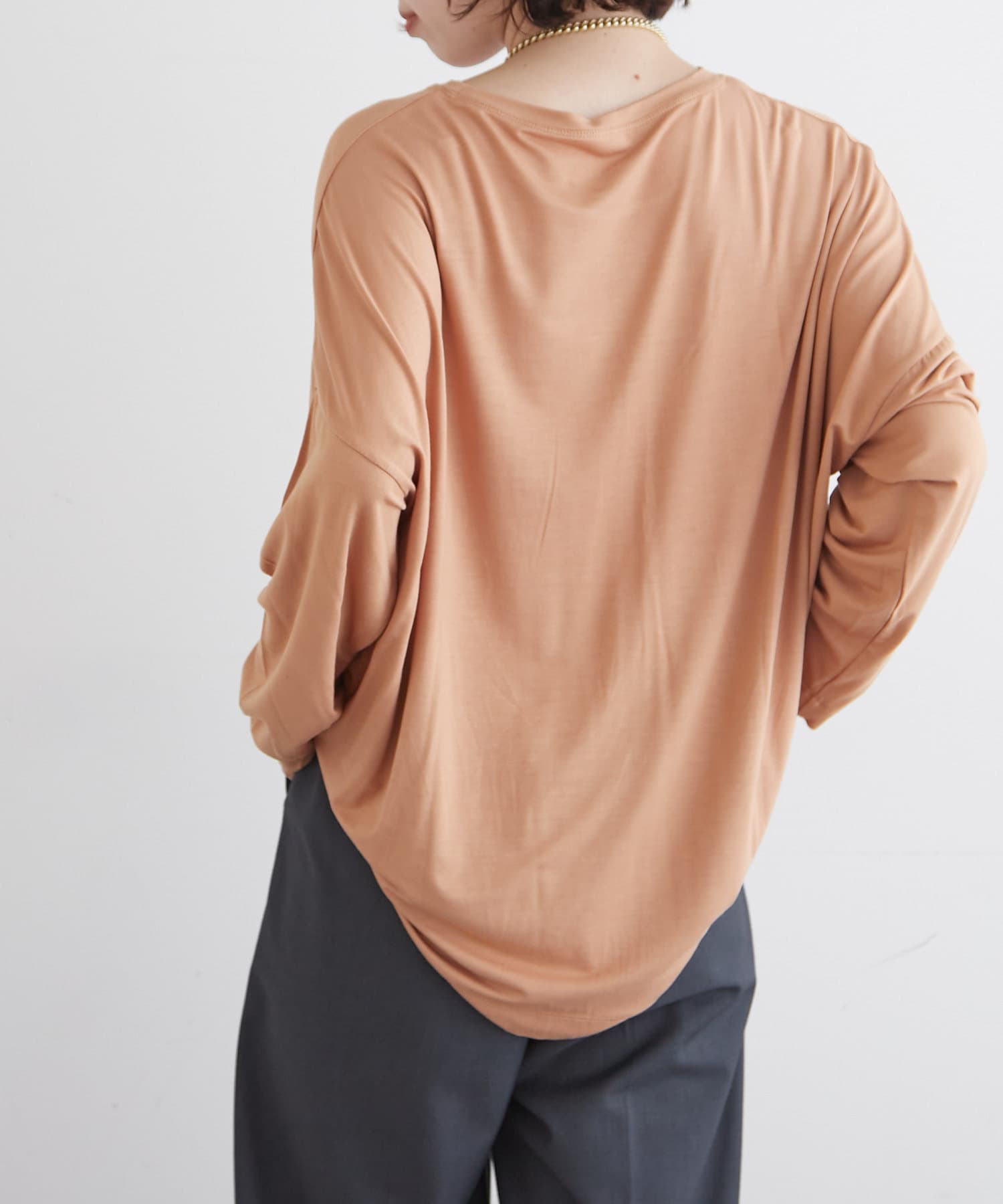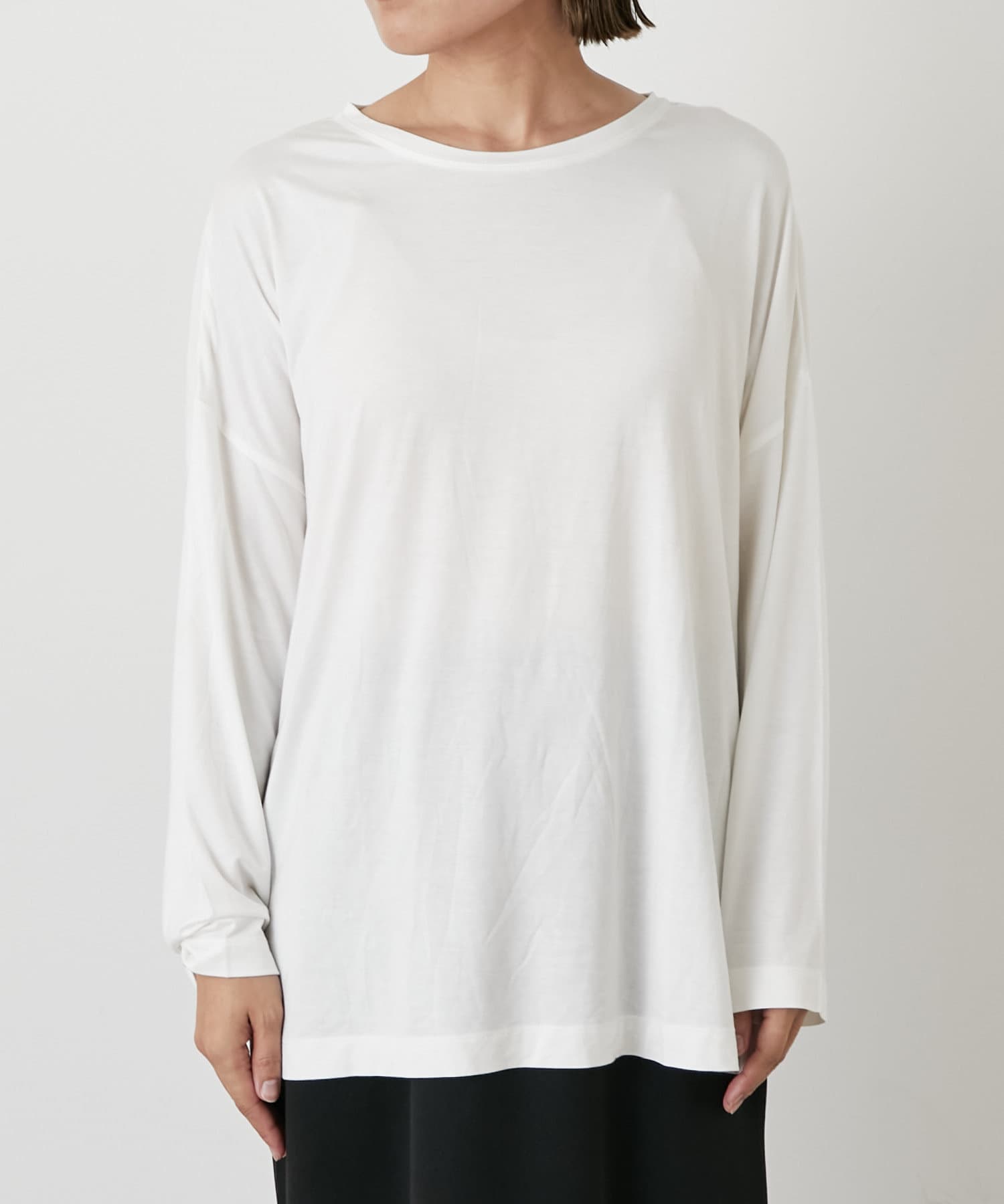 ・柔らかく肌馴染みの良い生地を使用しており、程よいシアー感が今年らしいレイヤードにもぴったりな一枚。