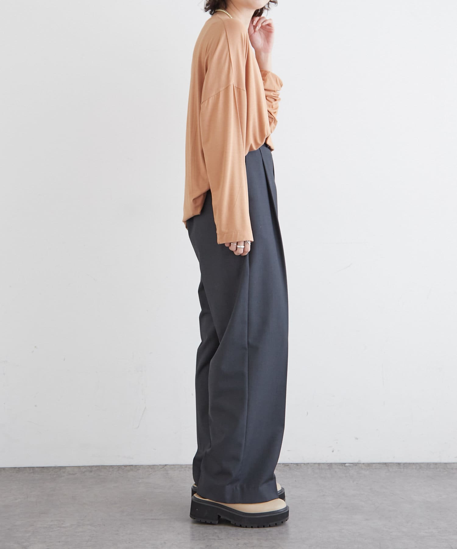 ・ゆとりのあるサイジングとヒップが隠れる丈感なので、さりげなくスタイルカバーも出来る優秀アイテム◎
