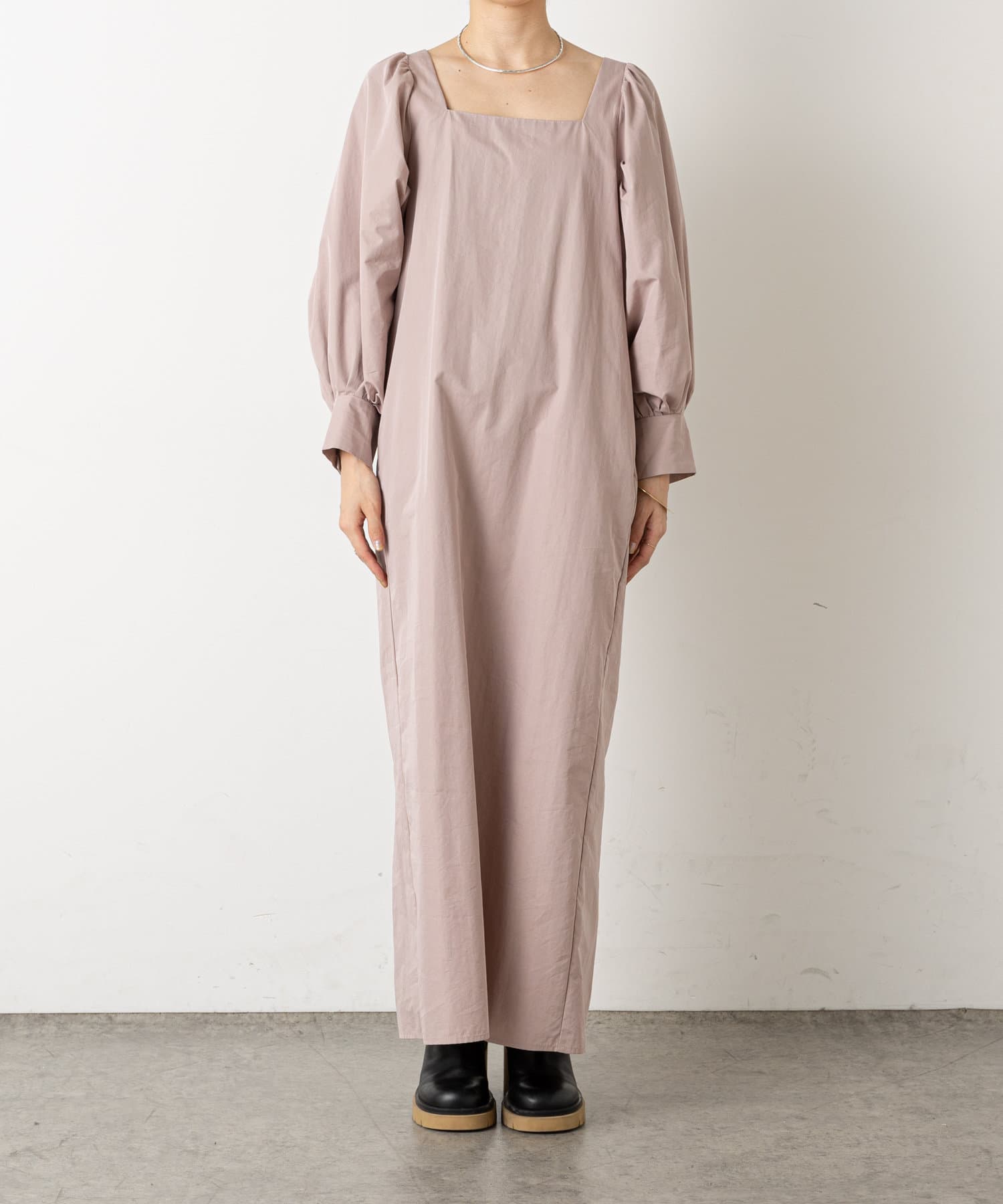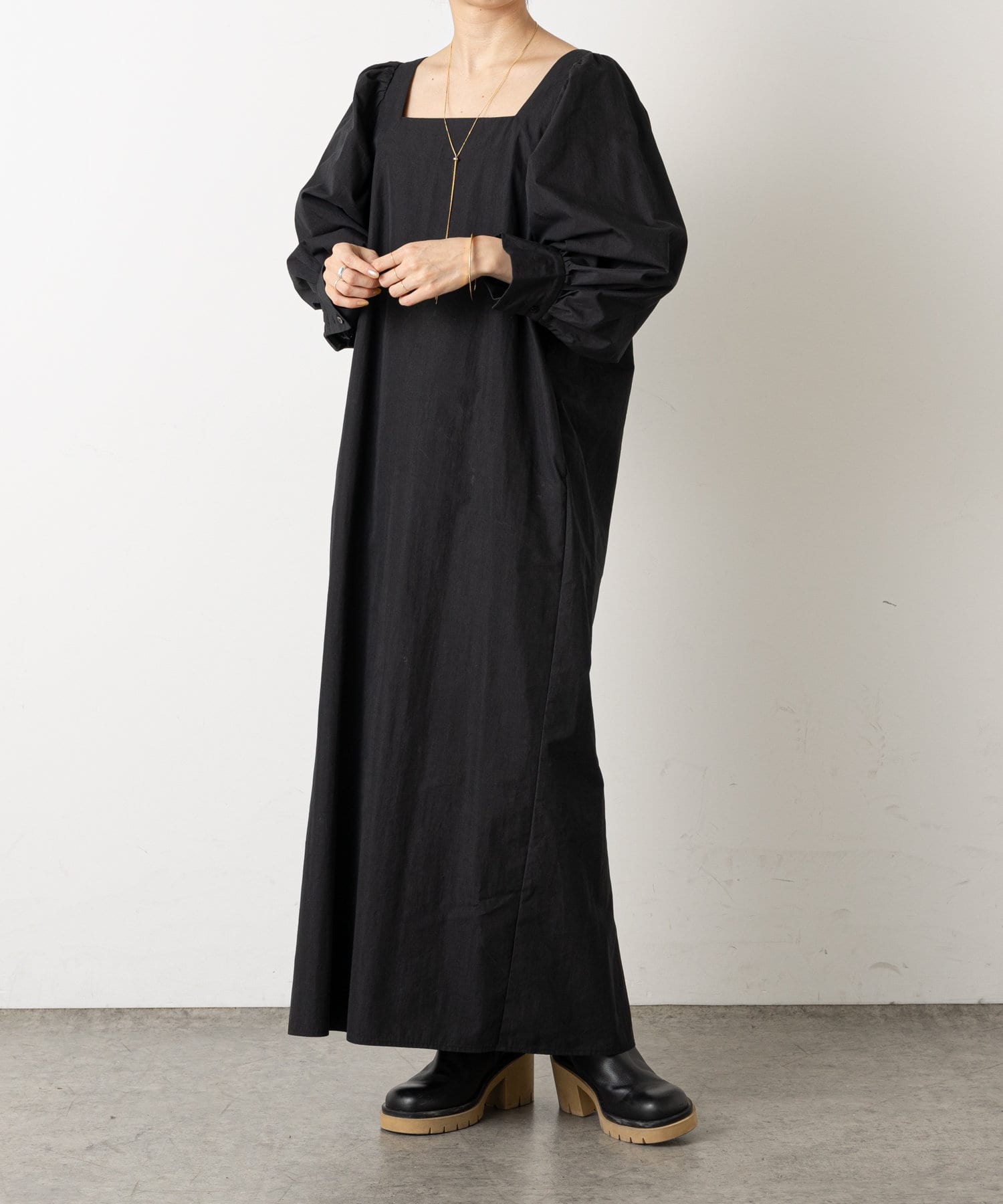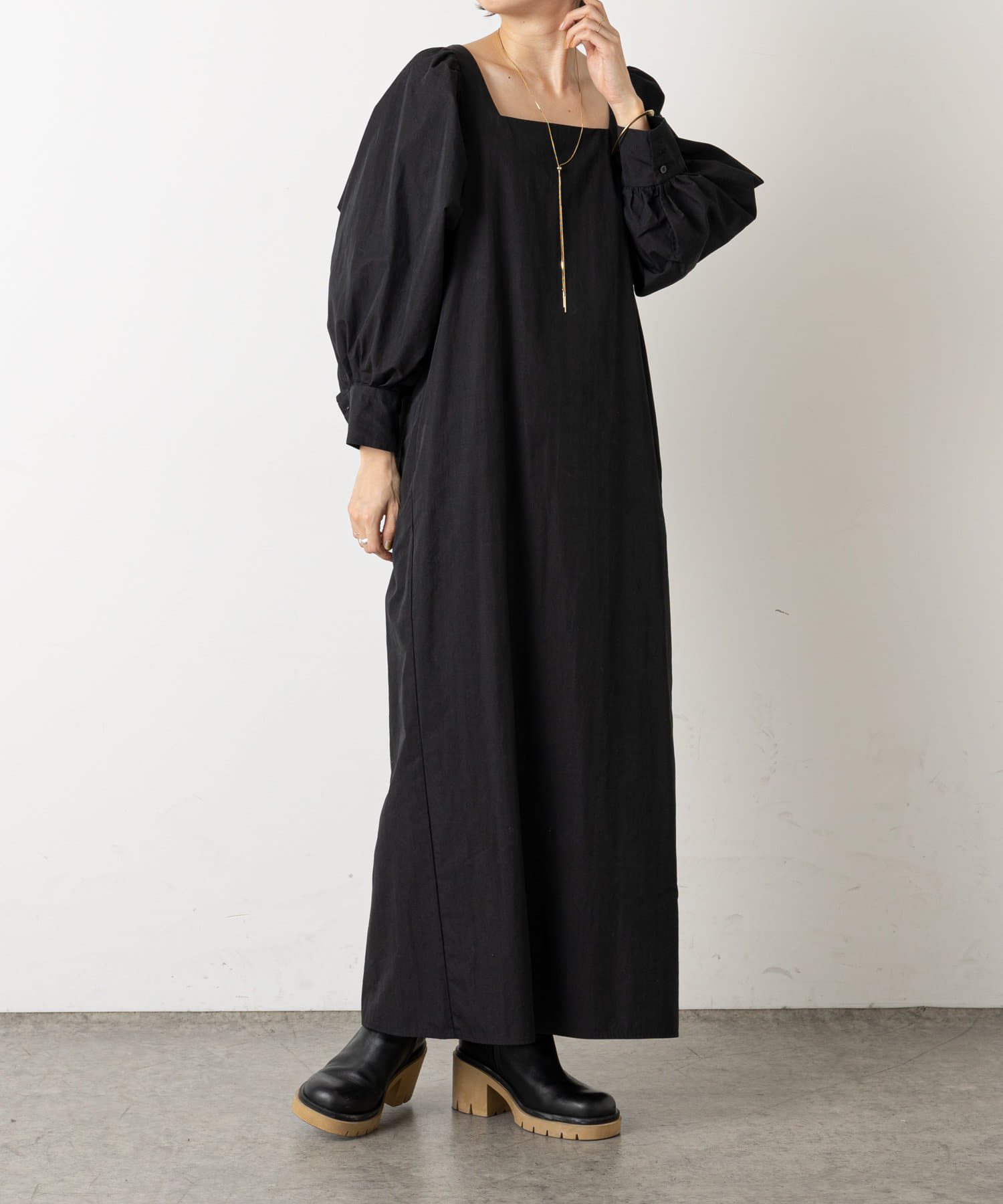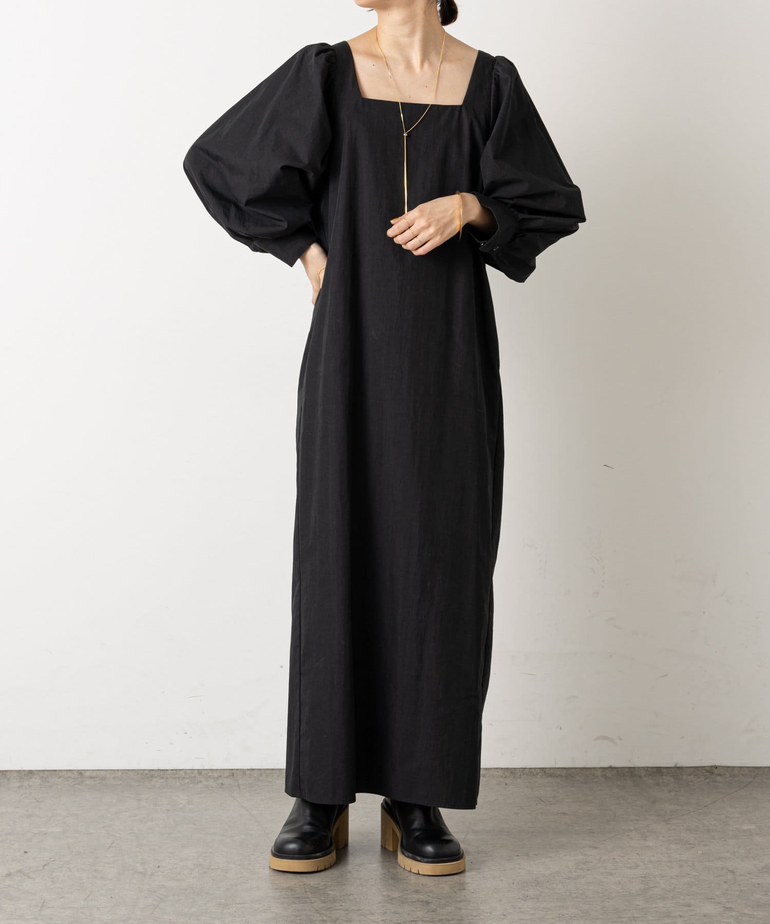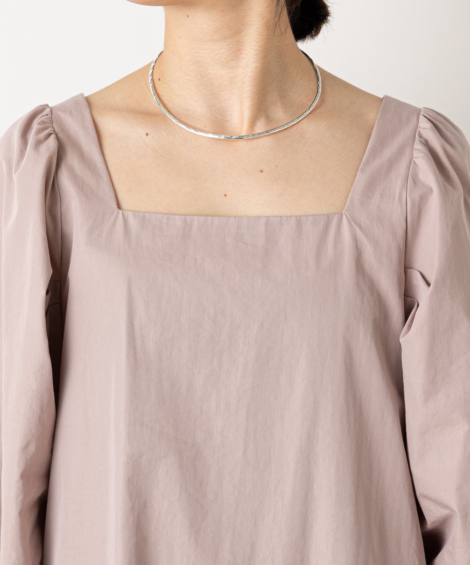 ・深めに開いたスクエアネックが大人っぽく、首回りをすっきりとみせてくれます。首元や手首が程よく見せられるため、アクセサリーとの相性もぴったりです。