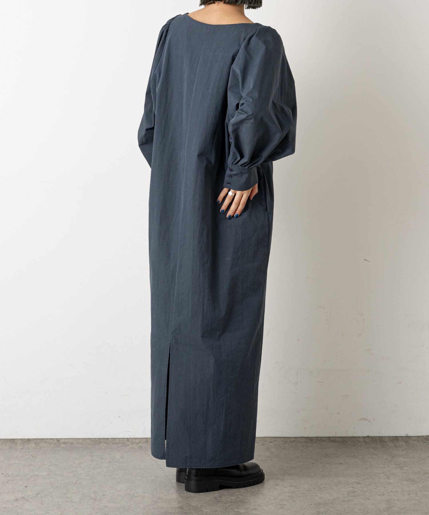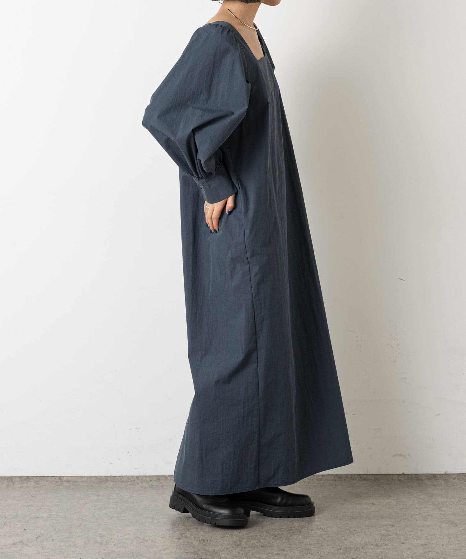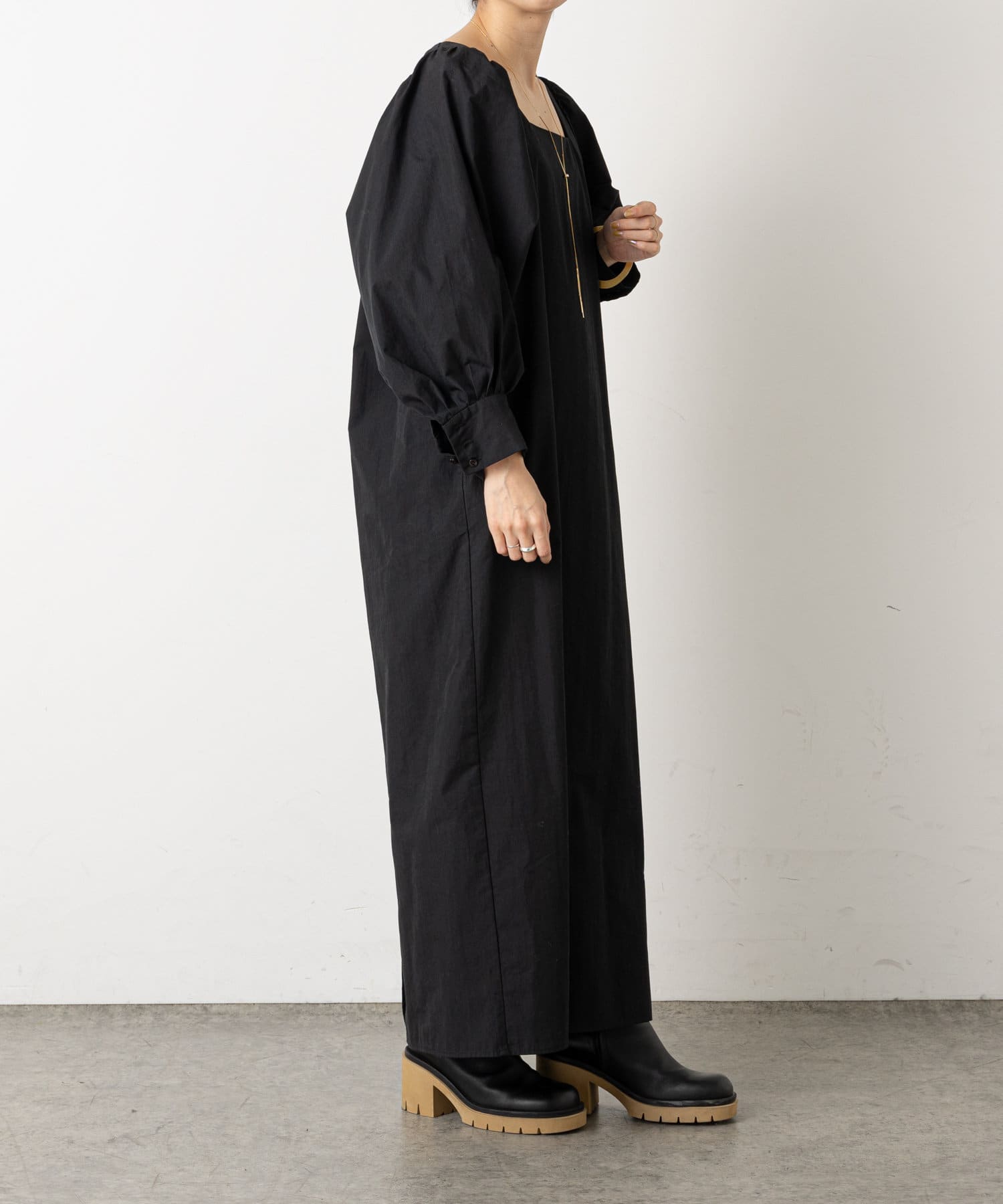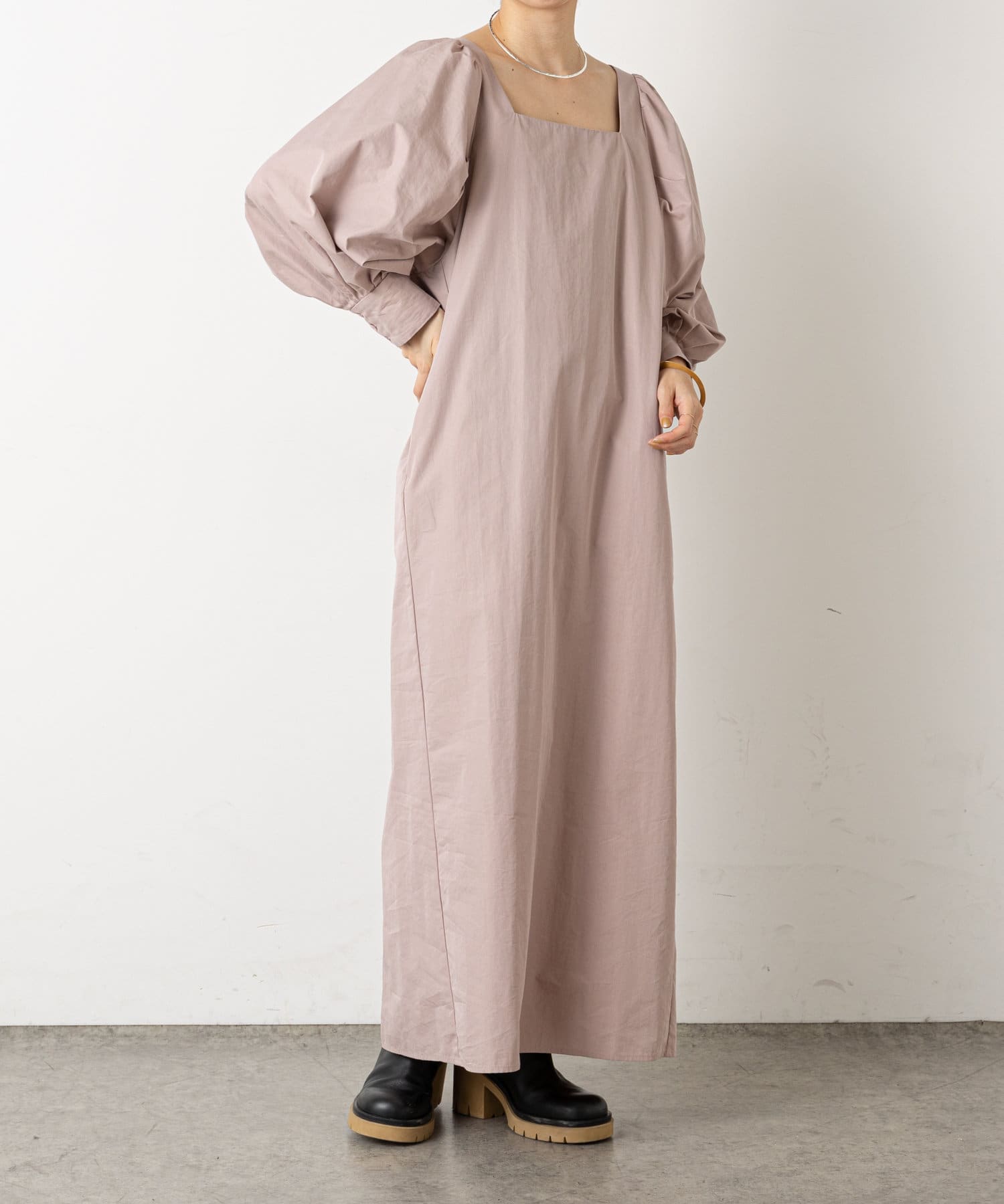 ・深めに開いたスクエアネックが大人っぽく、首回りをすっきりとみせてくれます。首元や手首が程よく見せられるため、アクセサリーとの相性もぴったりです。