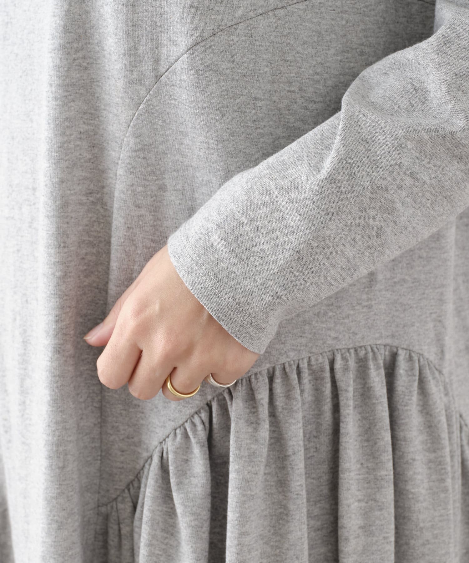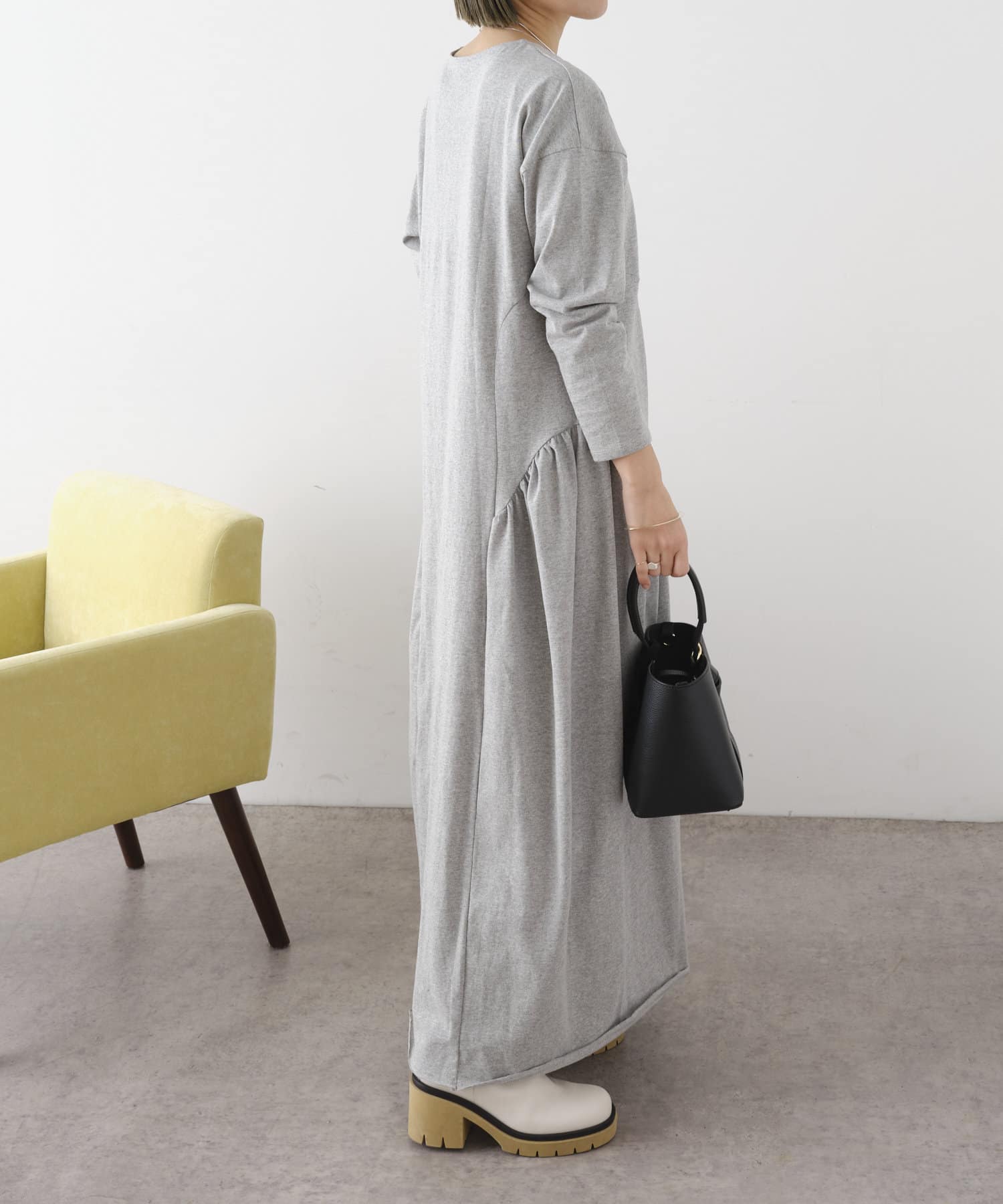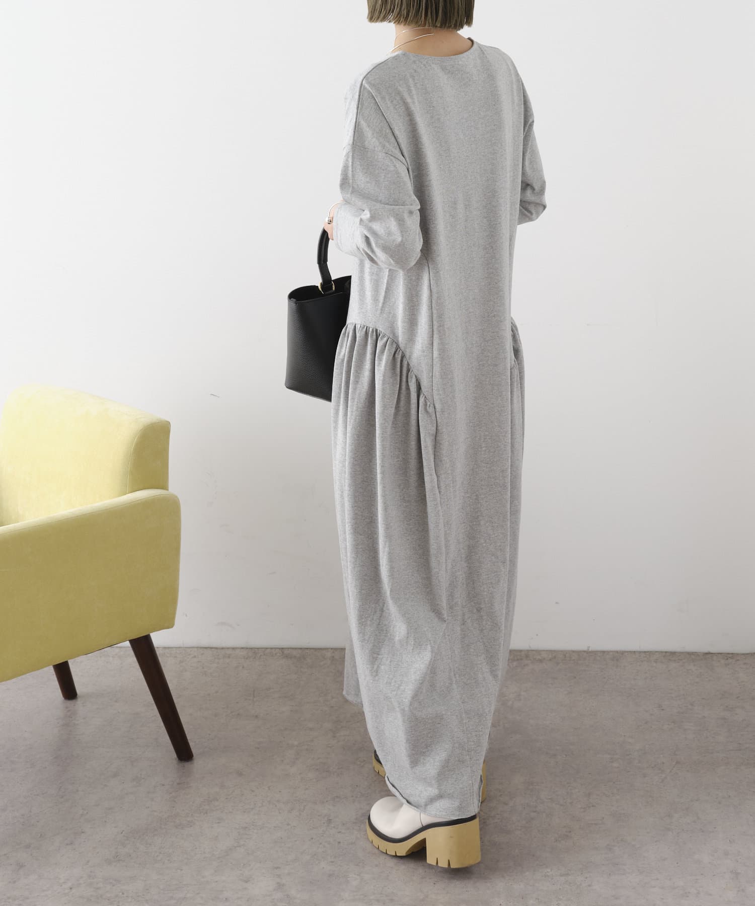 シンプルだけどギャザーデザインだったり拘りのあるワンピース。大人っぽく綺麗めな印象。ただ、バレエシューズでは床に裾がつきます。裾を踏む心配もしたくないので着丈がもう少し短めだったらよかったなぁと思いました。