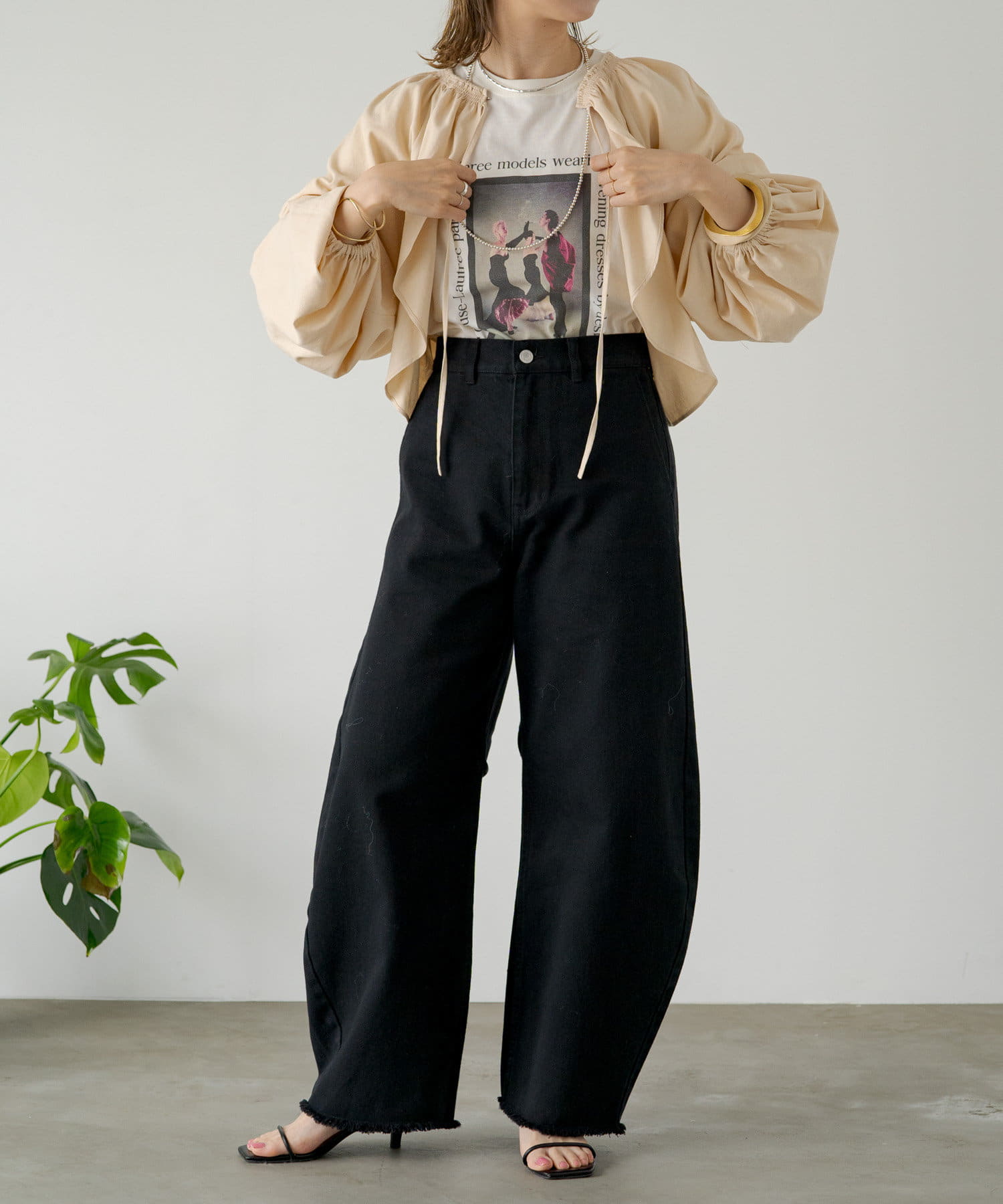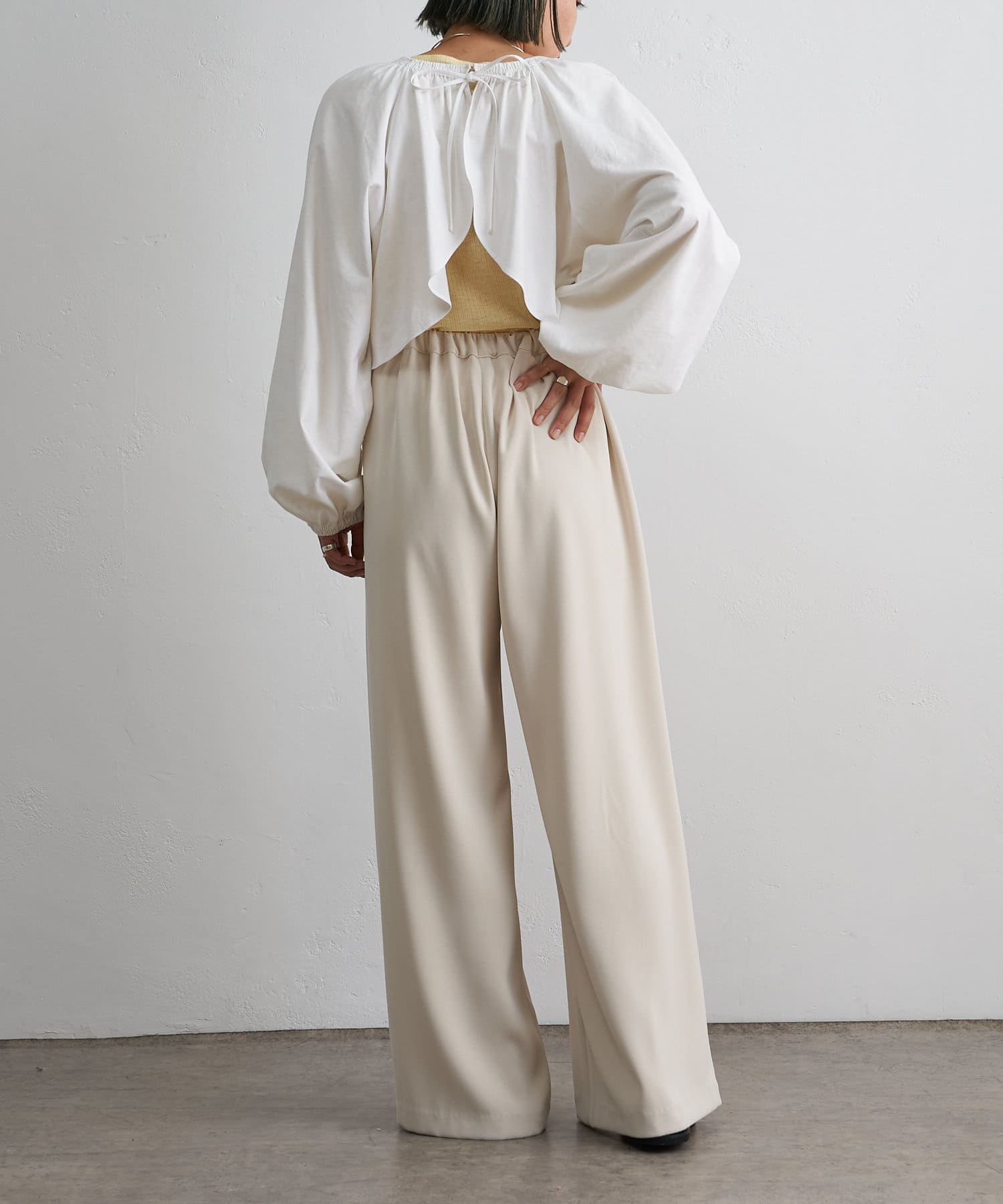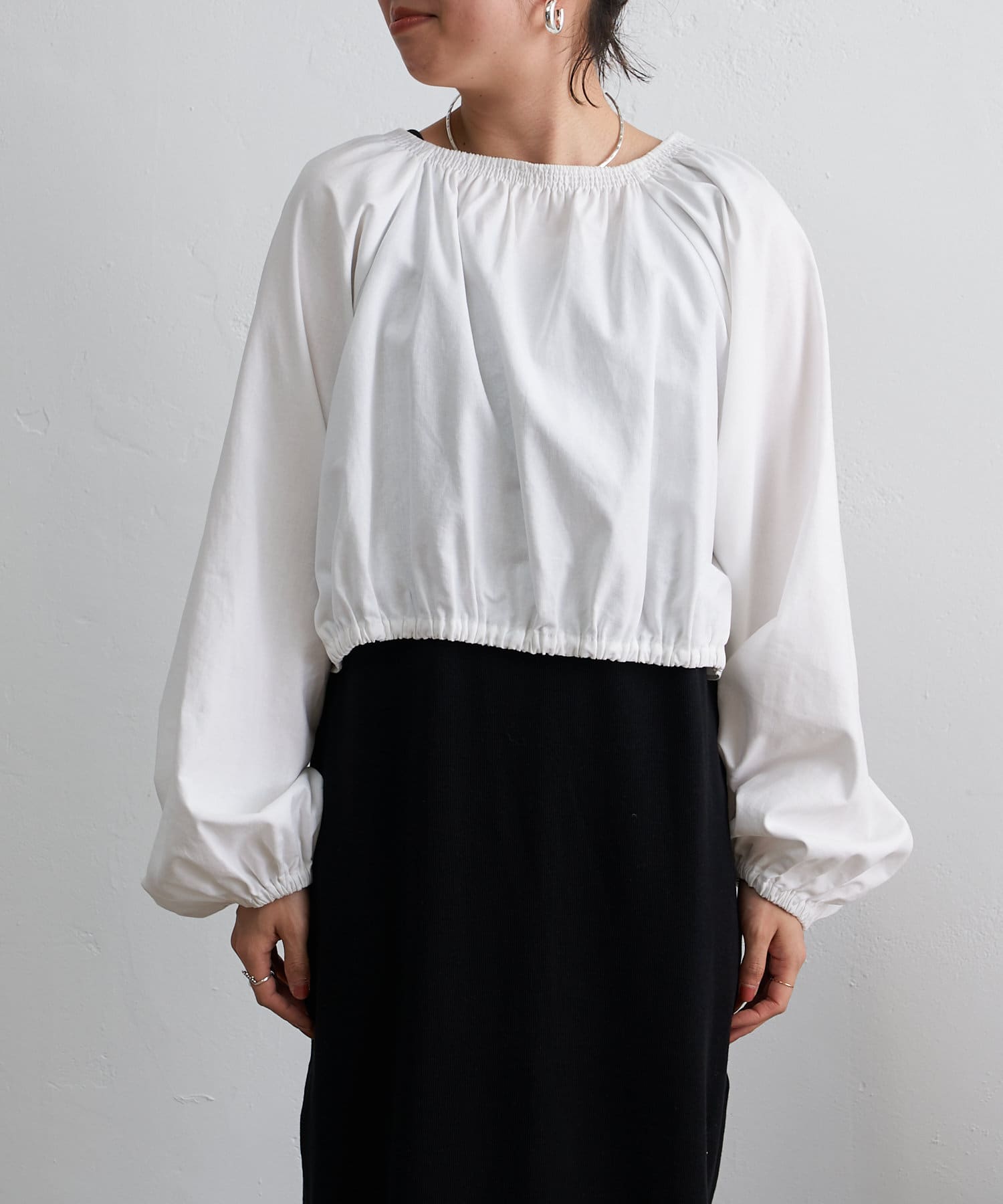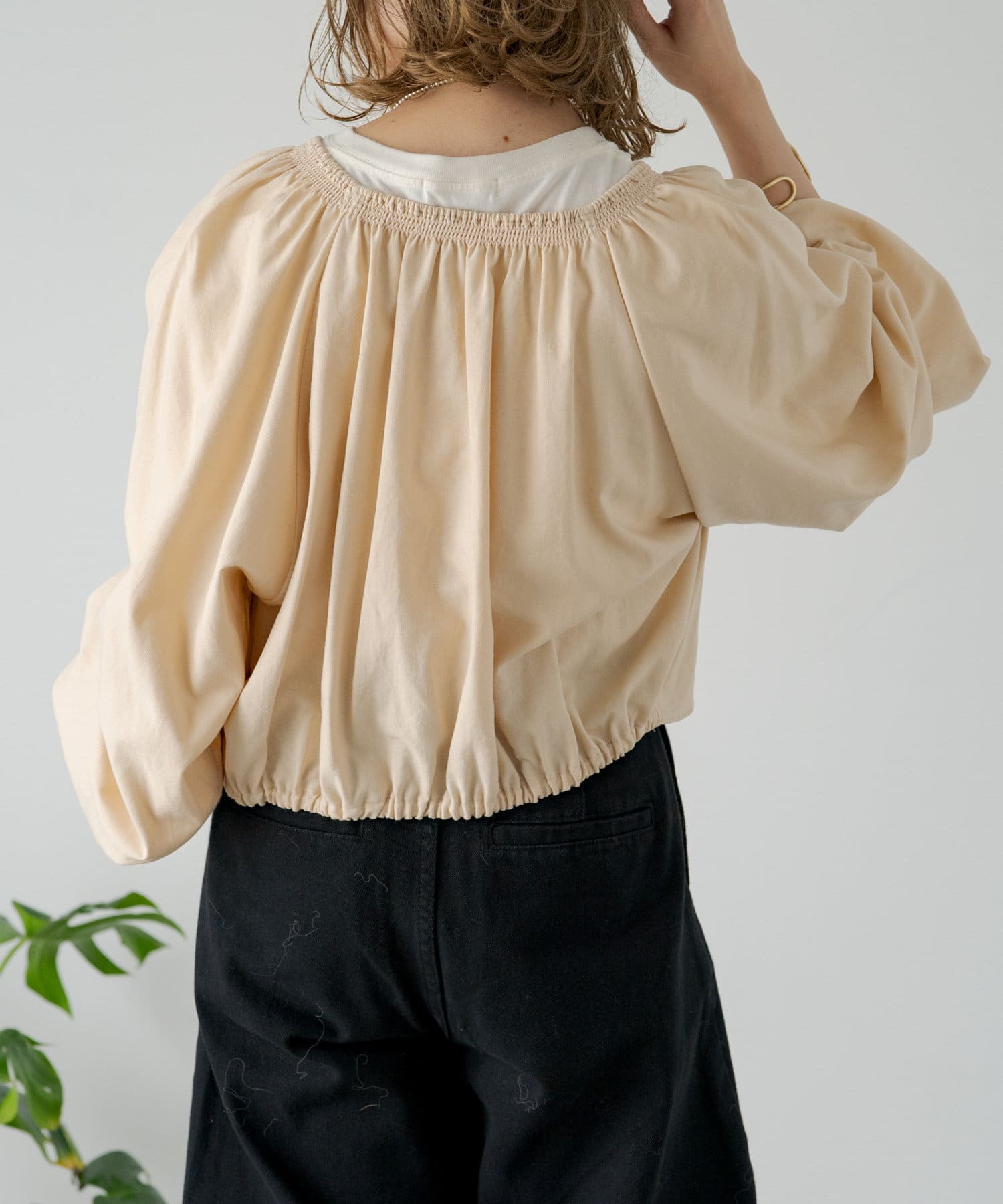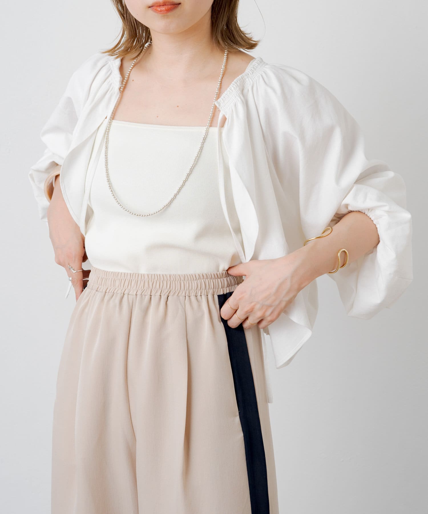 ・程よい袖ボリュームがポイントになりながらも、旬なショート丈でバランスが取りやすい一着。