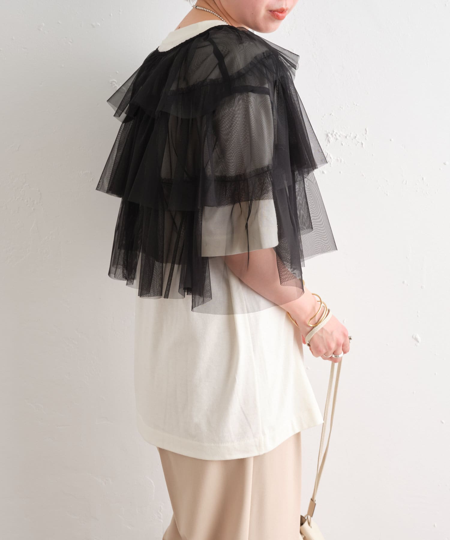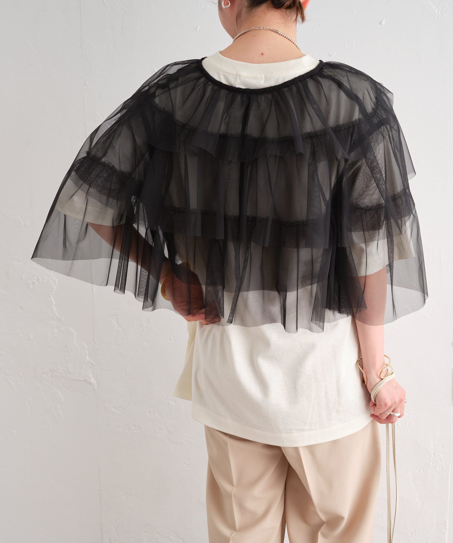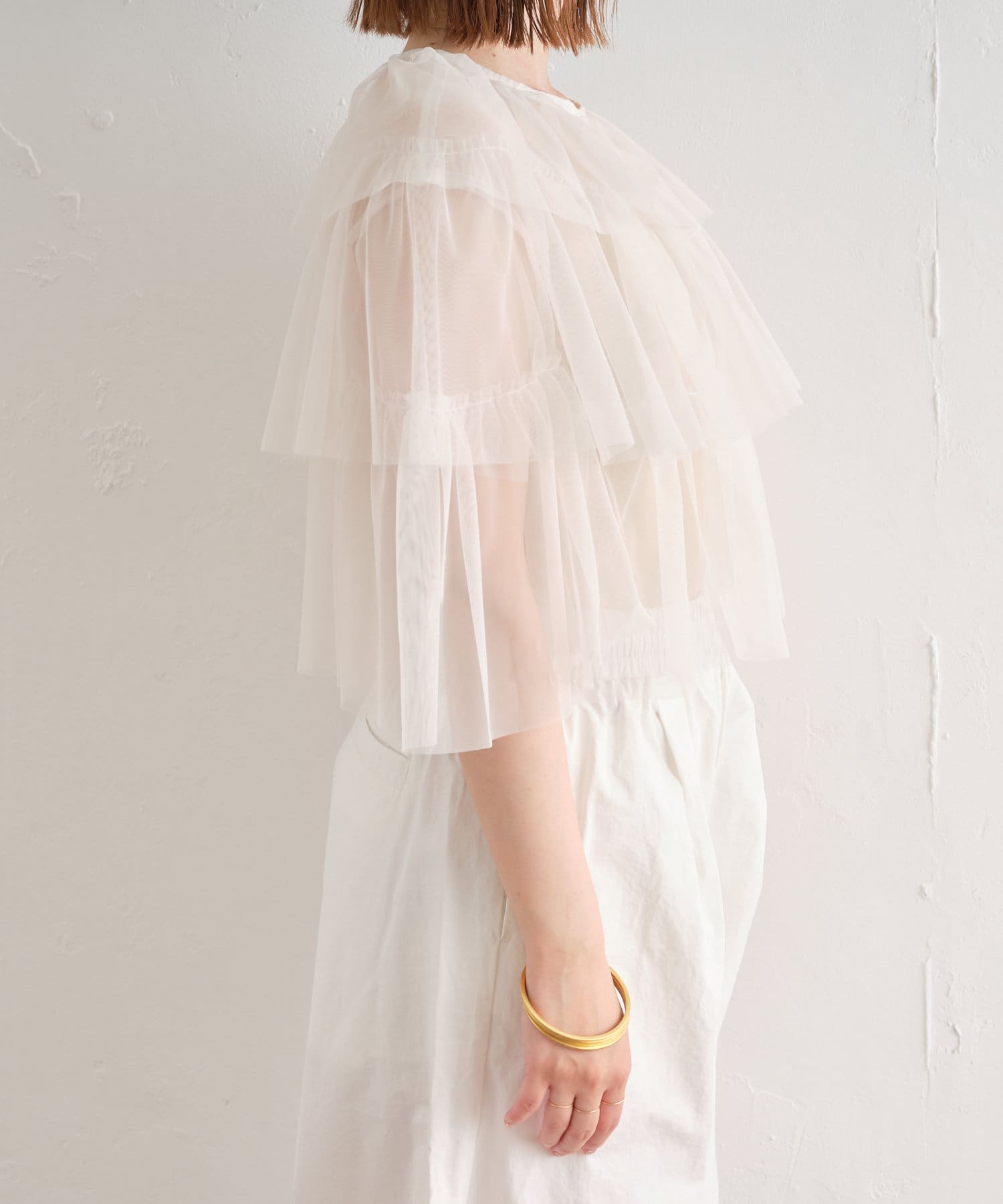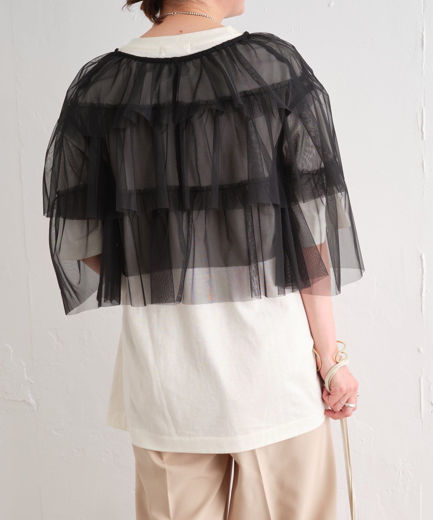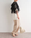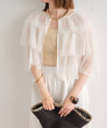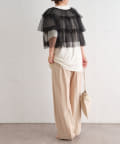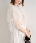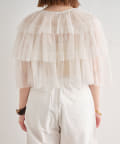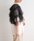 ・チュール素材が華やかで女性らしいティアードブラウス。着用するだけで存在感のあるアイテム。