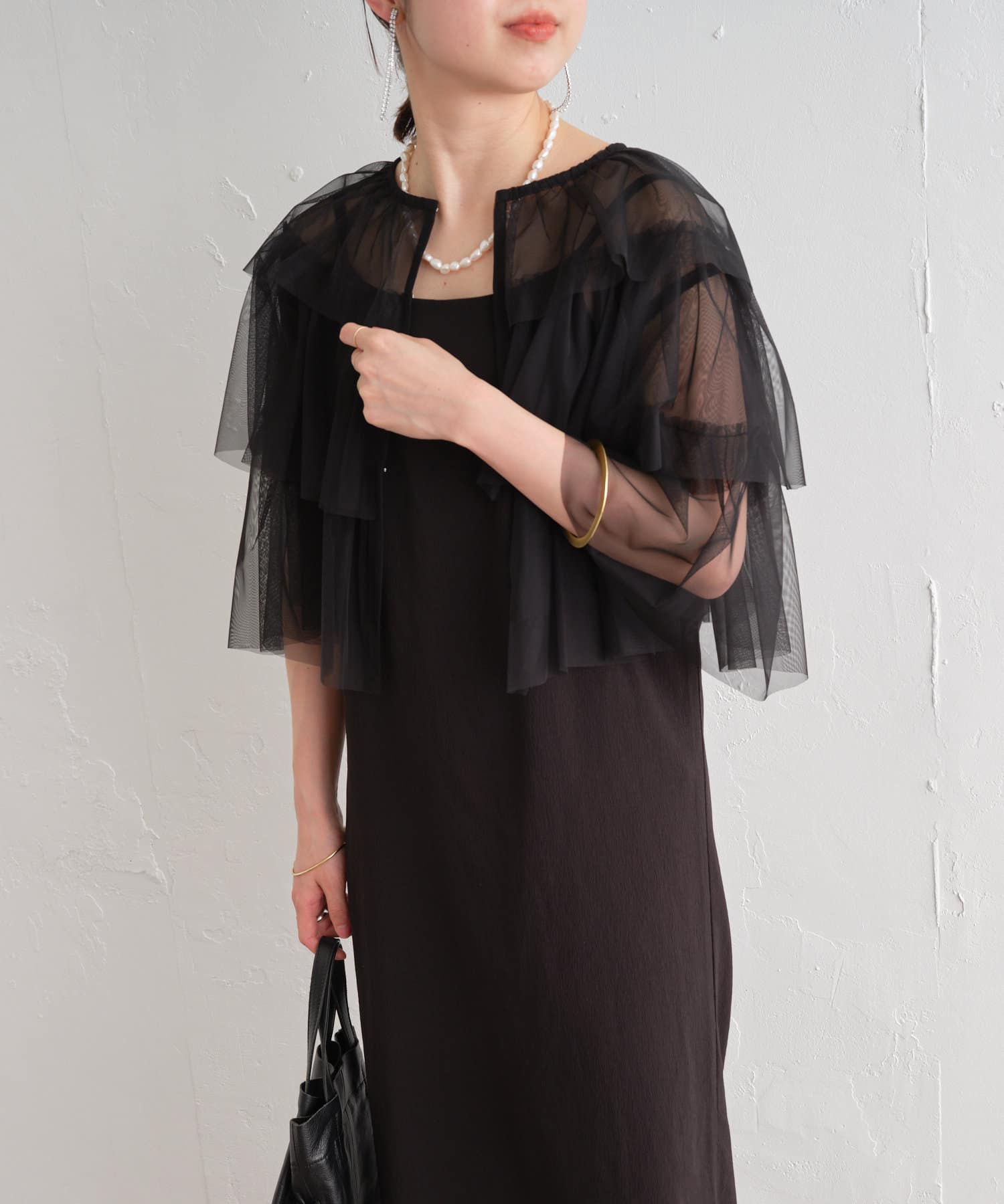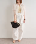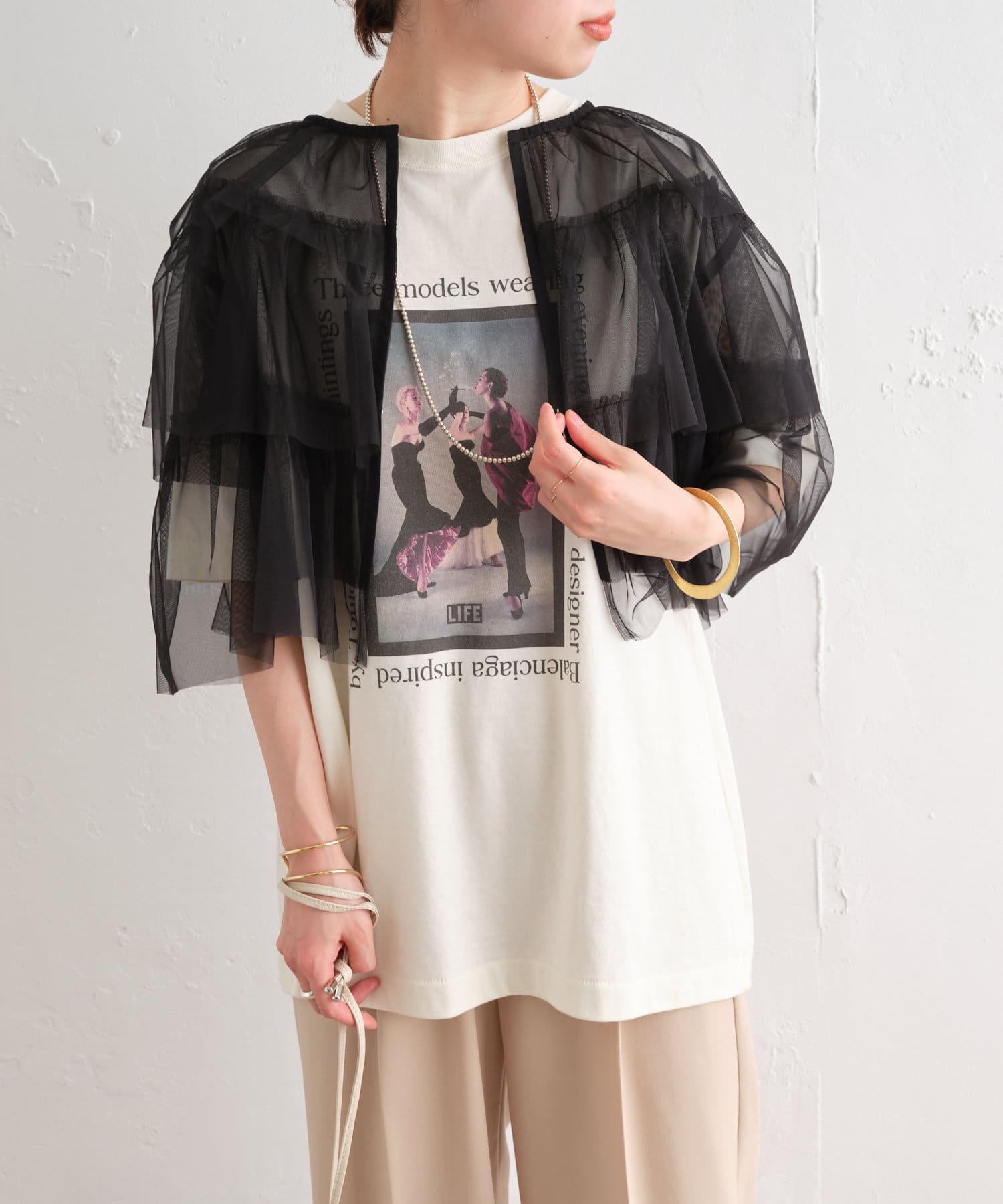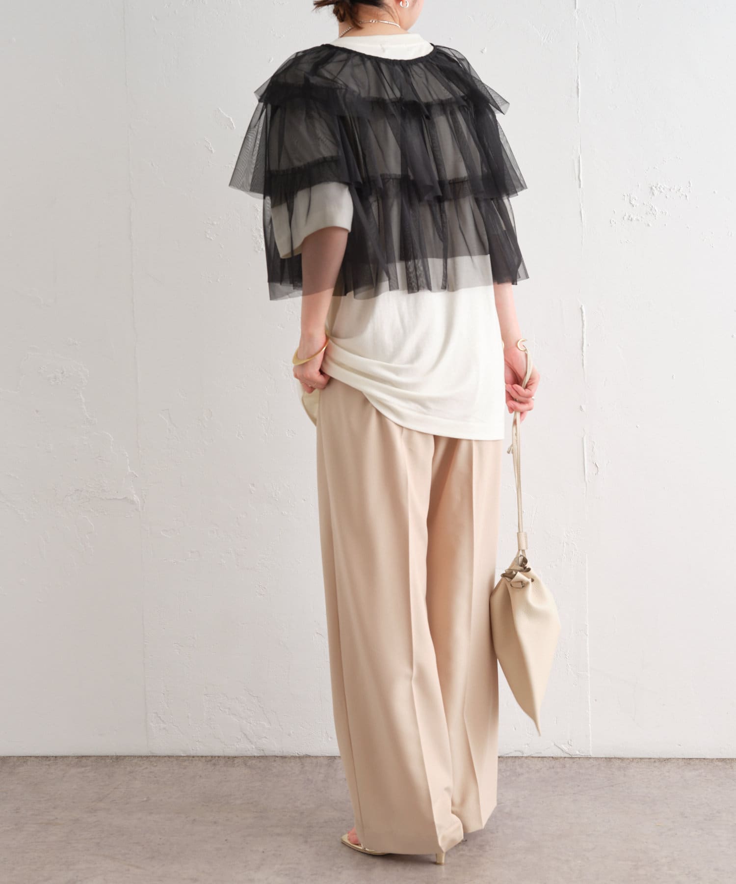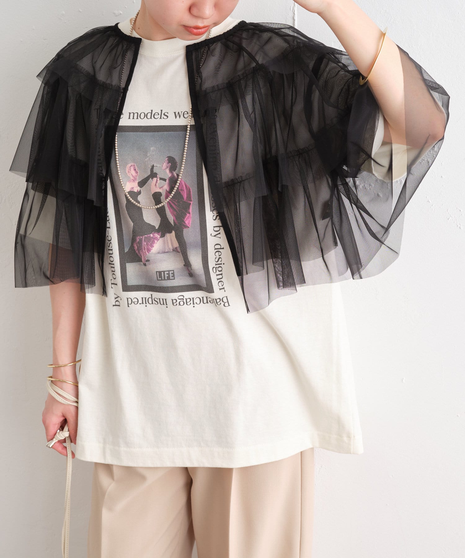 ・チュール素材が華やかで女性らしいティアードブラウス。着用するだけで存在感のあるアイテム。