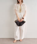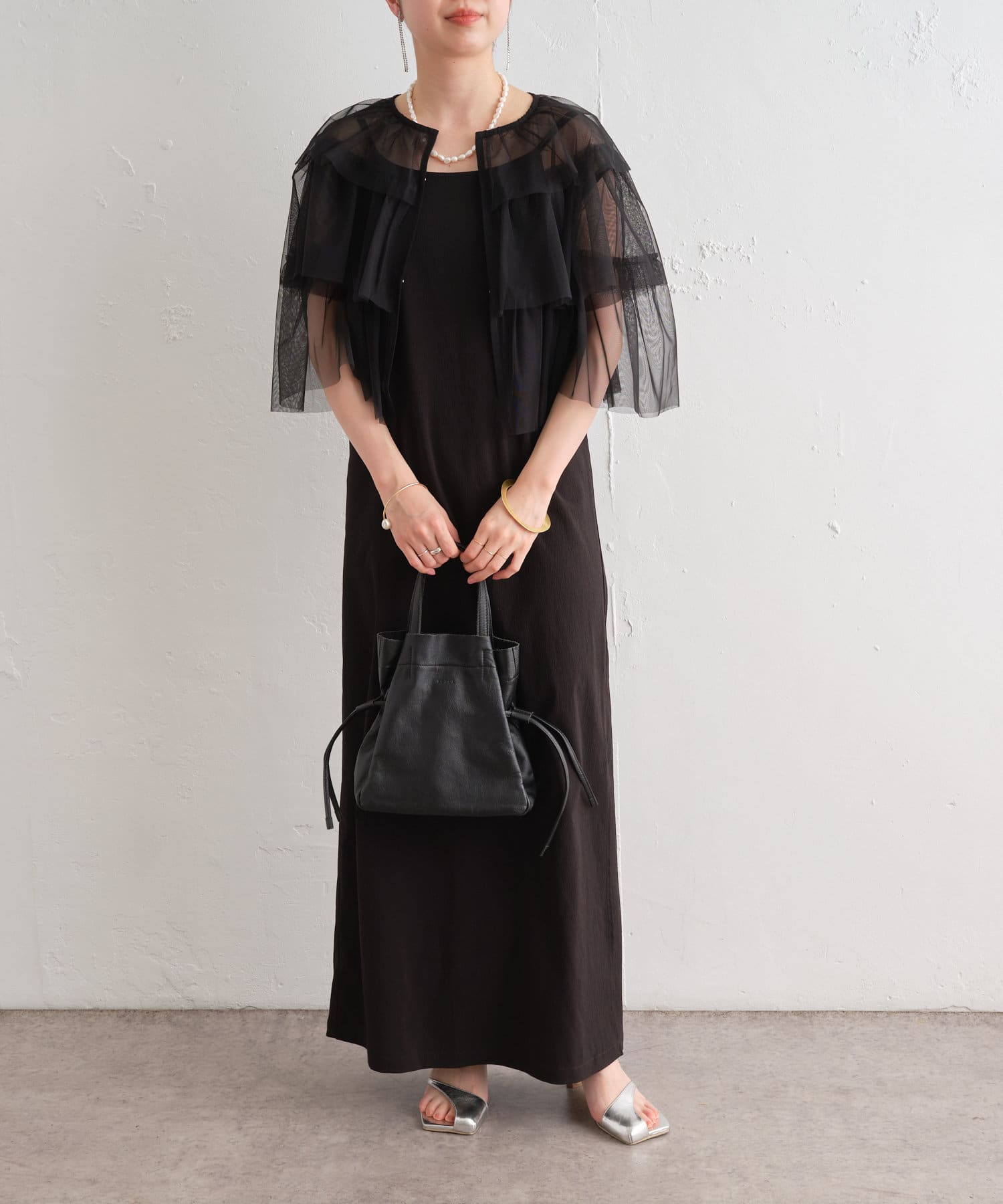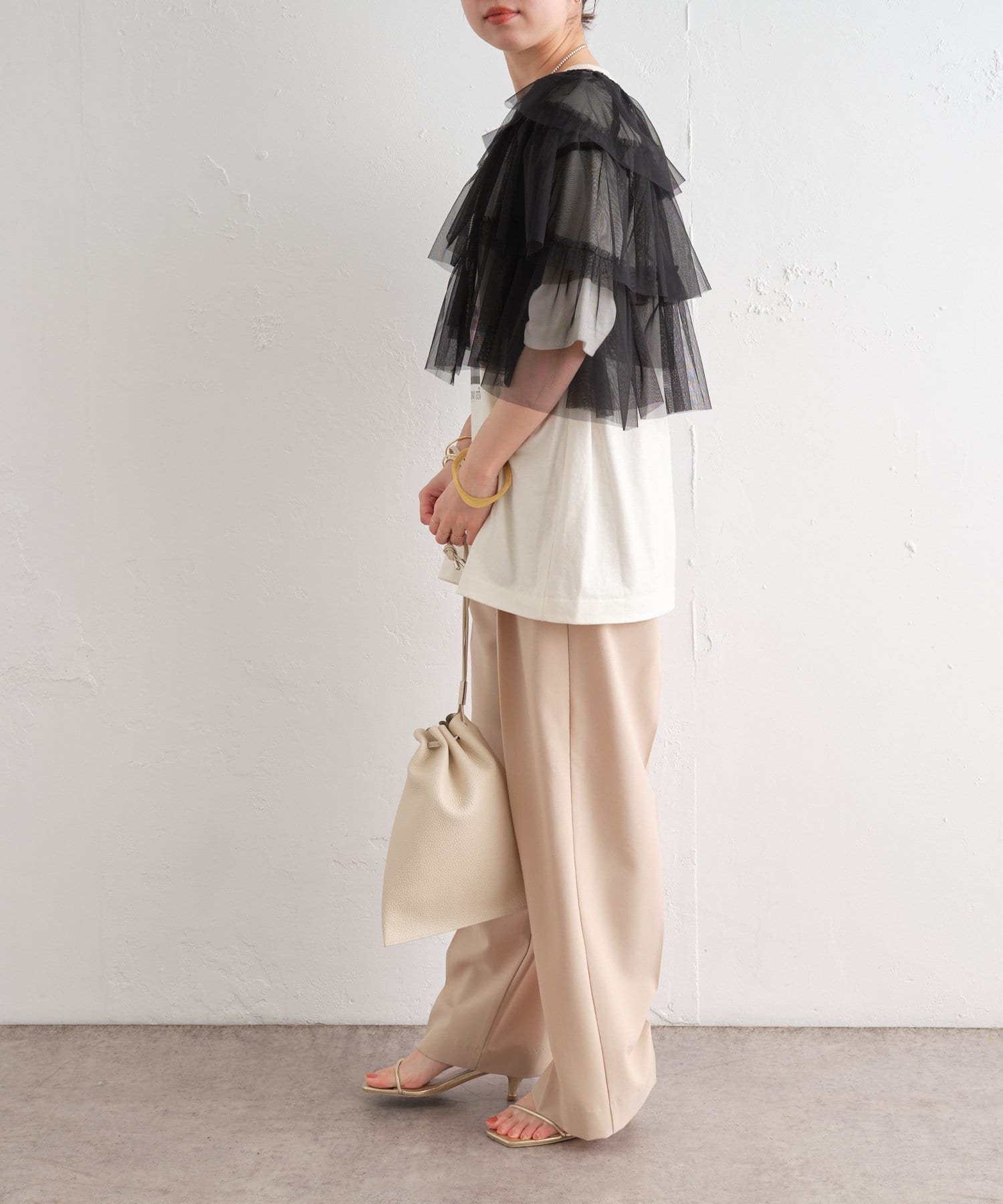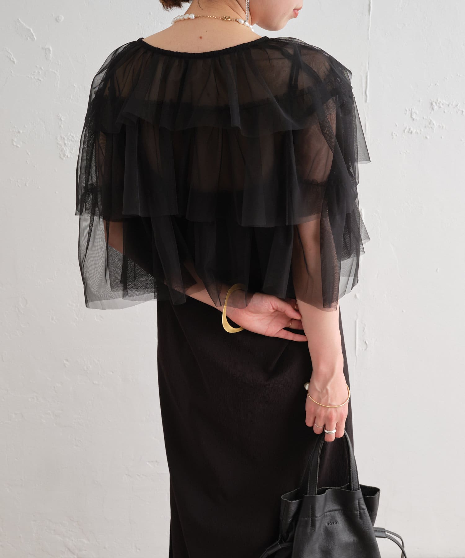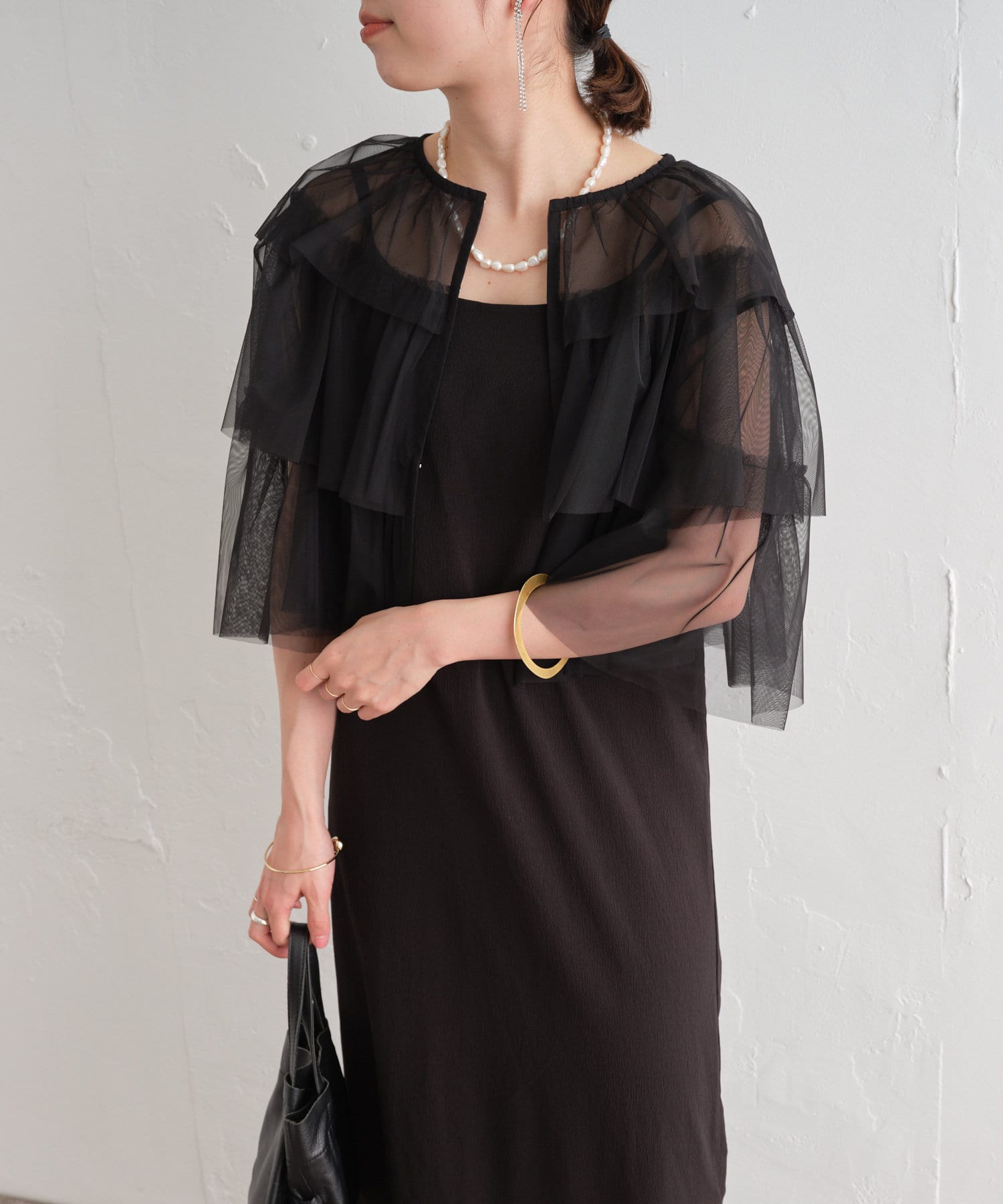 ・チュール素材が華やかで女性らしいティアードブラウス。着用するだけで存在感のあるアイテム。
