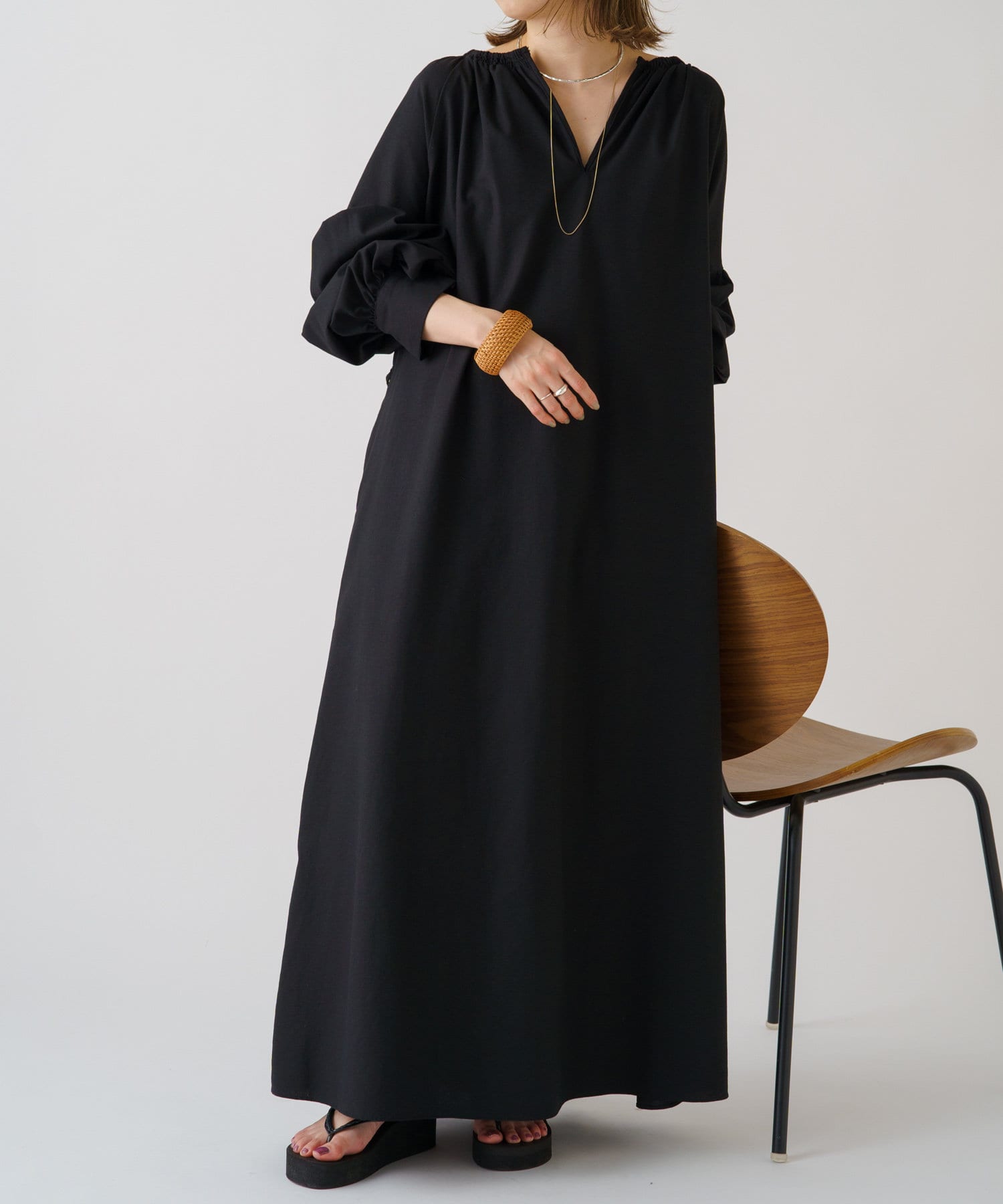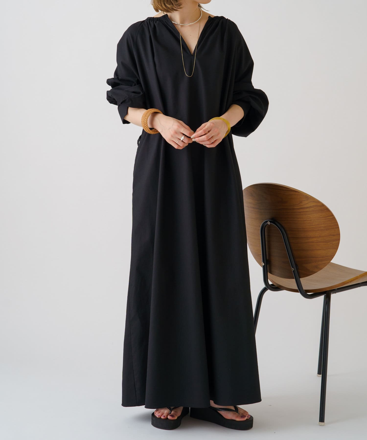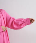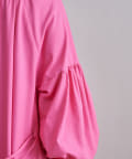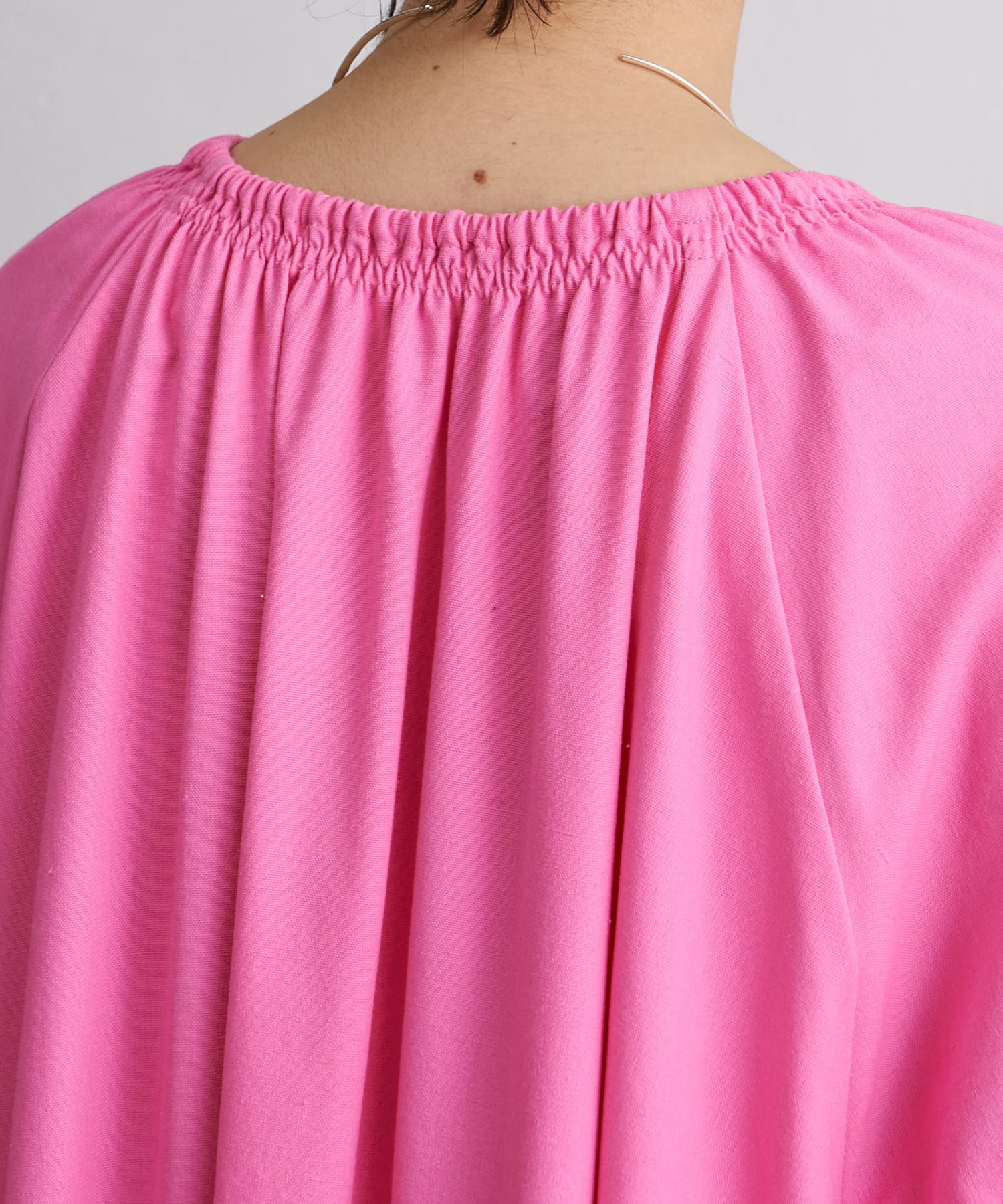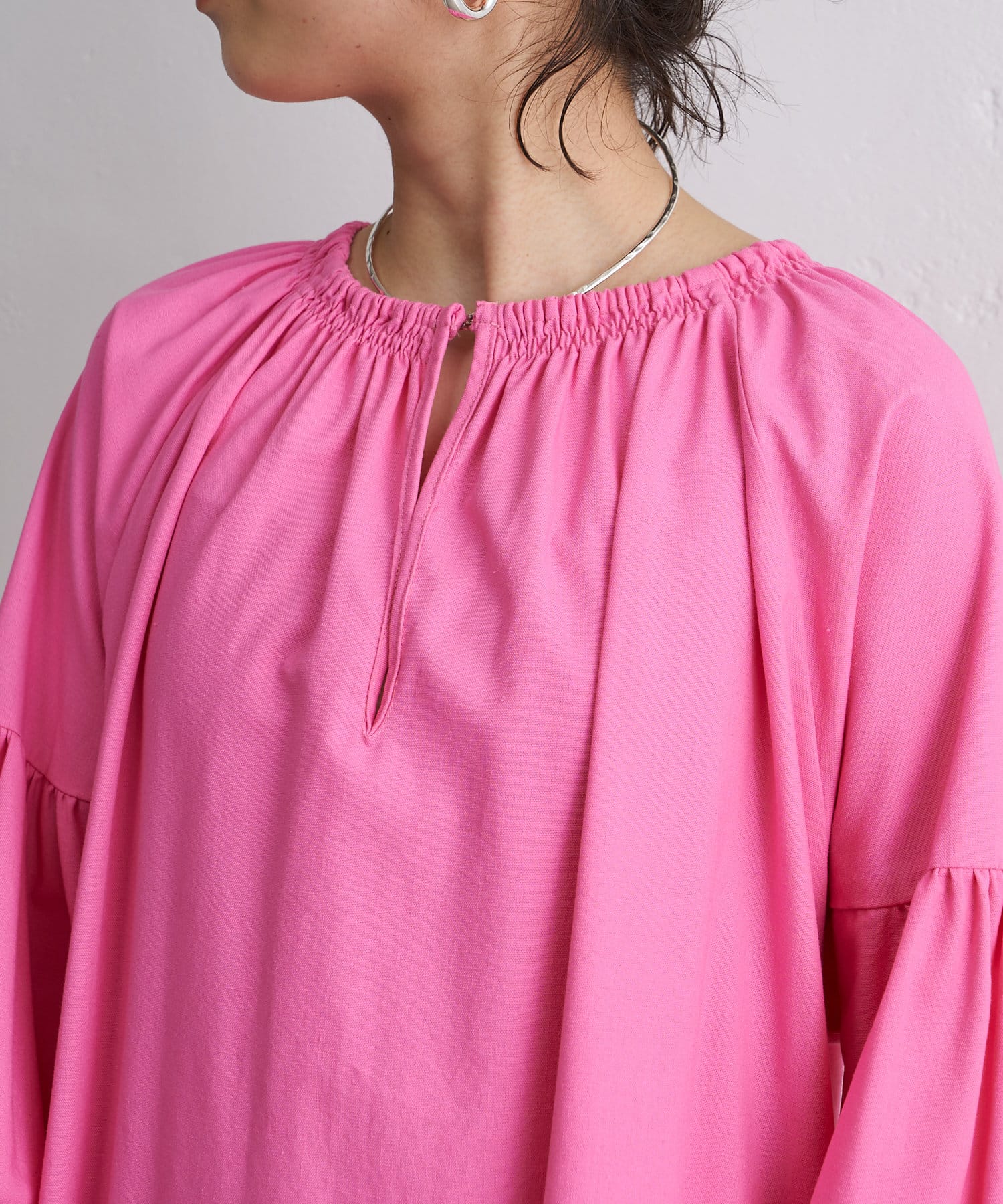 ・肩落ちのボリューム袖と女性らしい首元のシャーリングデザインがさりげなくポイントに。