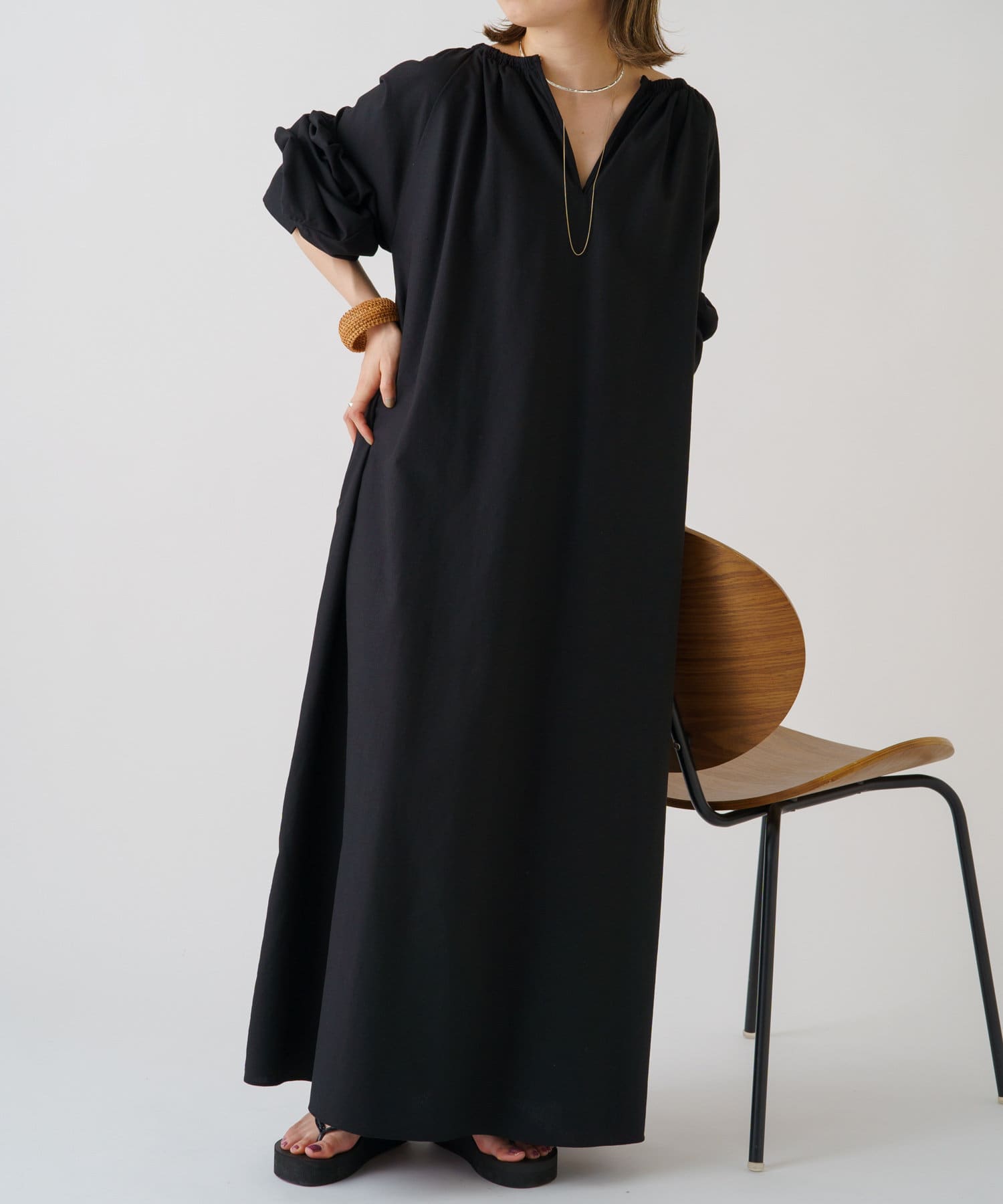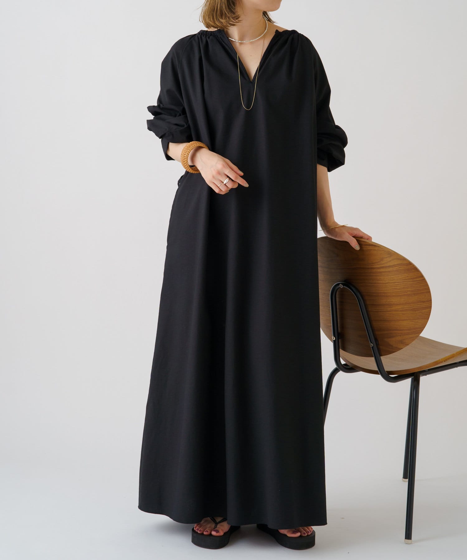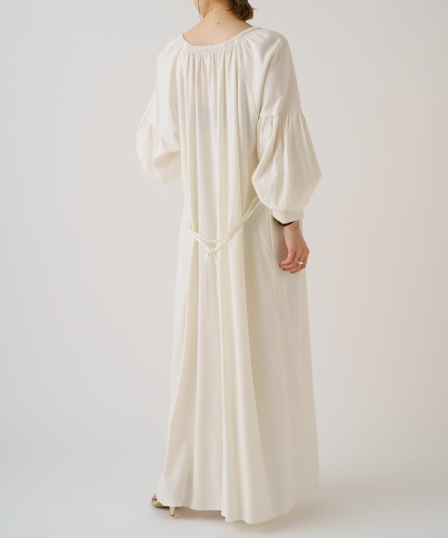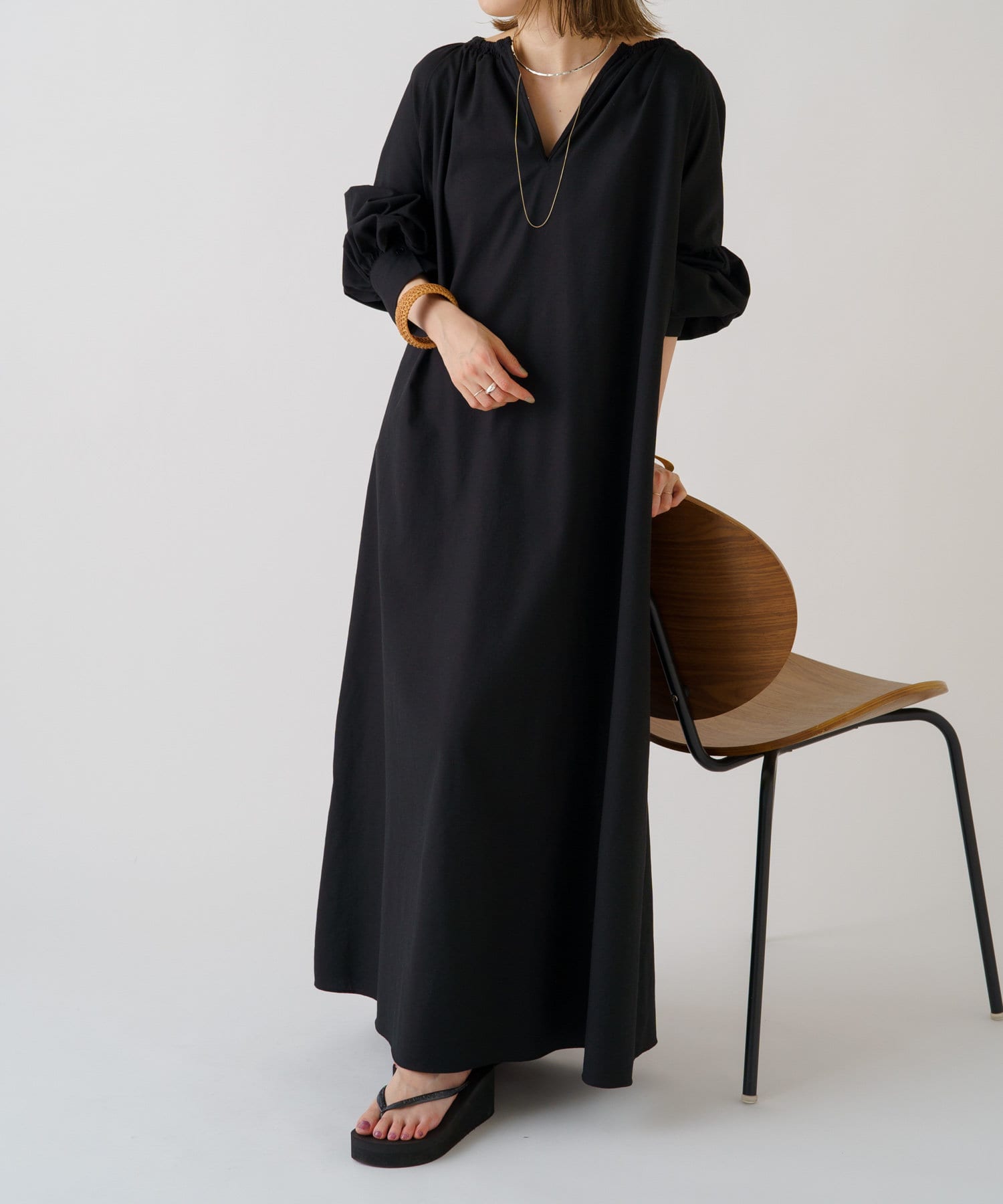 ・肩落ちのボリューム袖と女性らしい首元のシャーリングデザインがさりげなくポイントに。