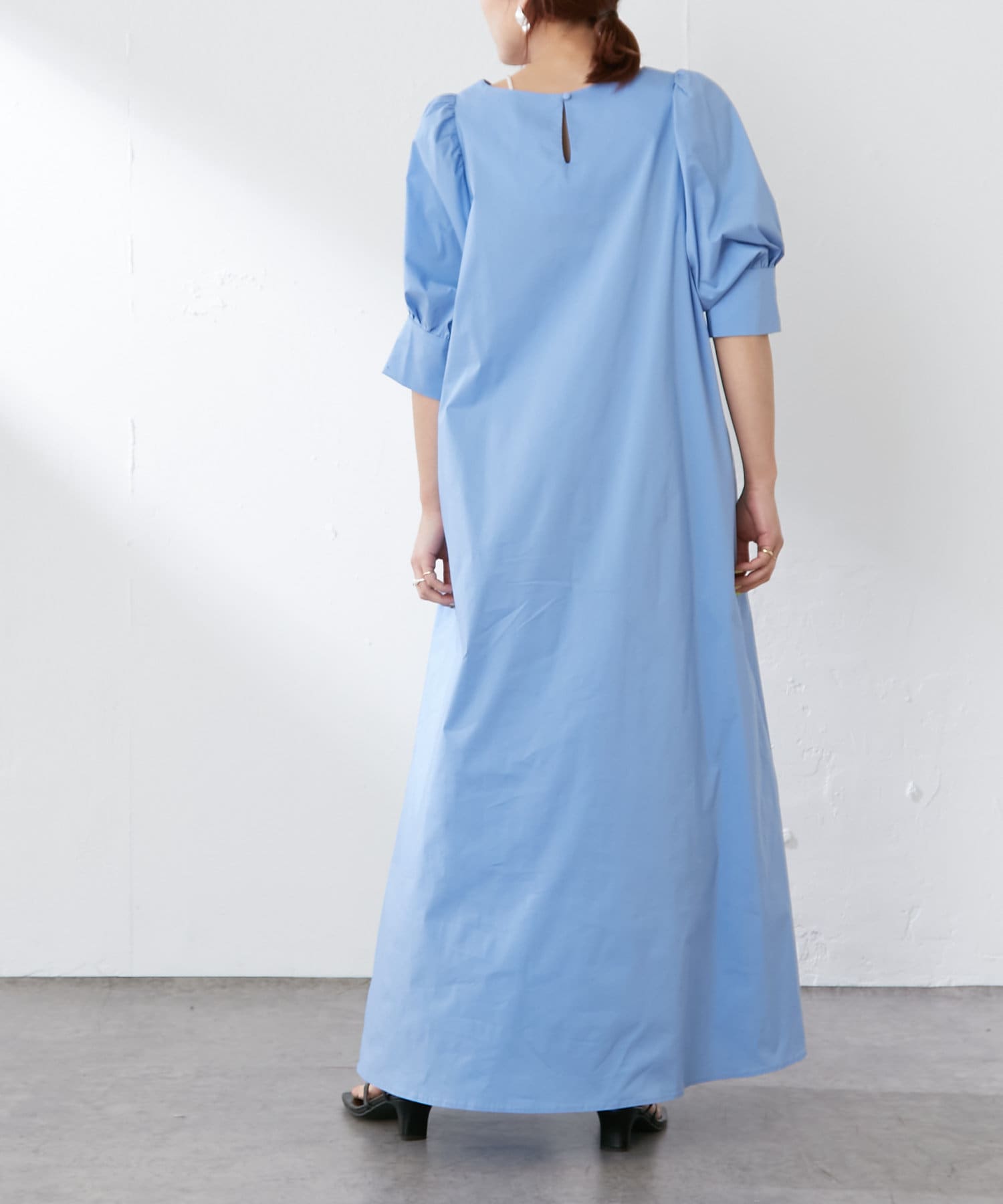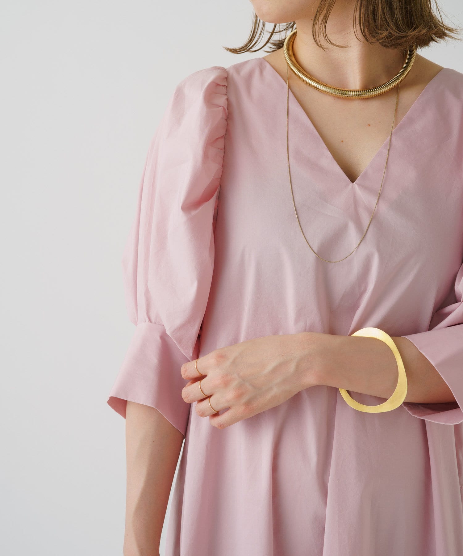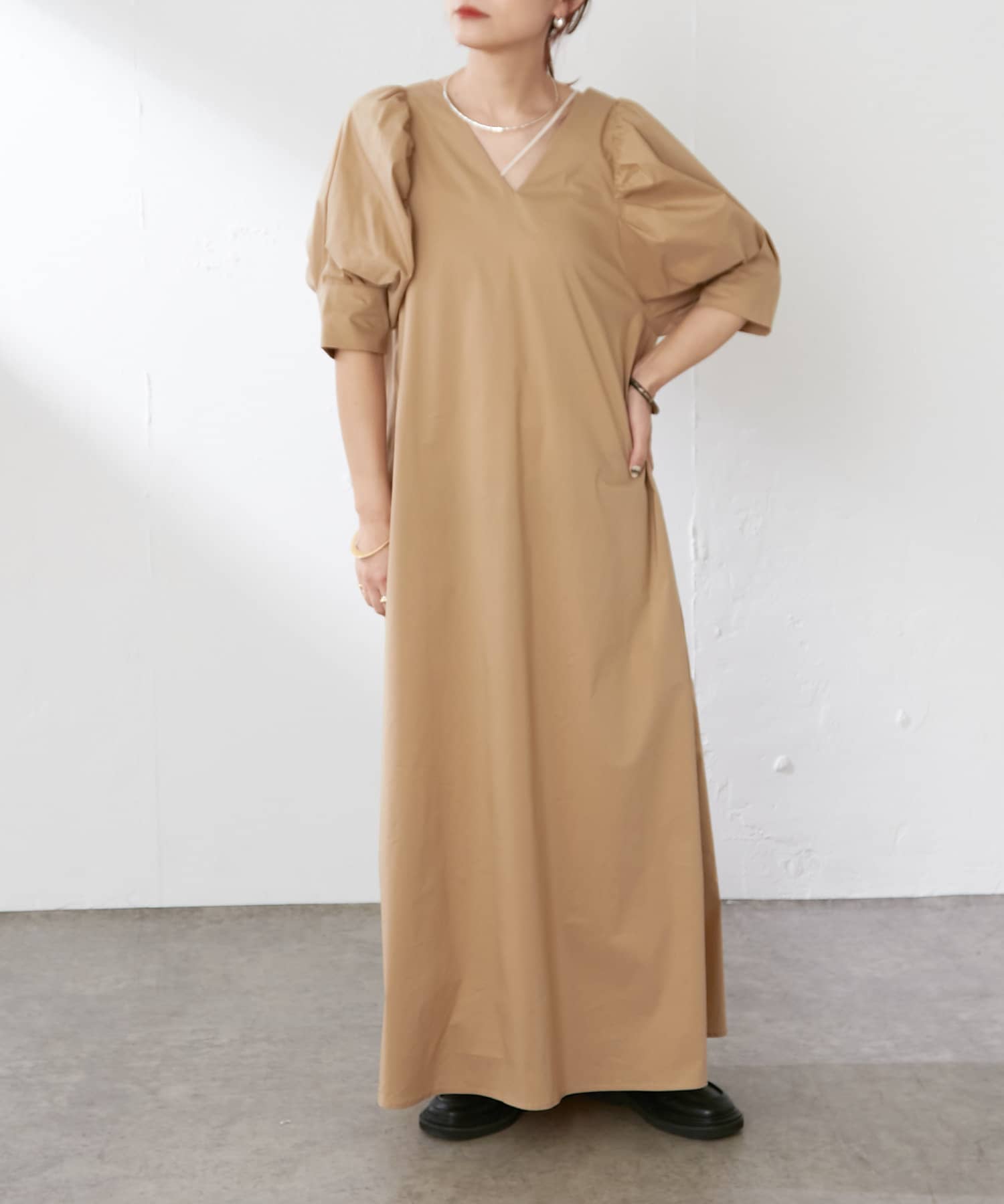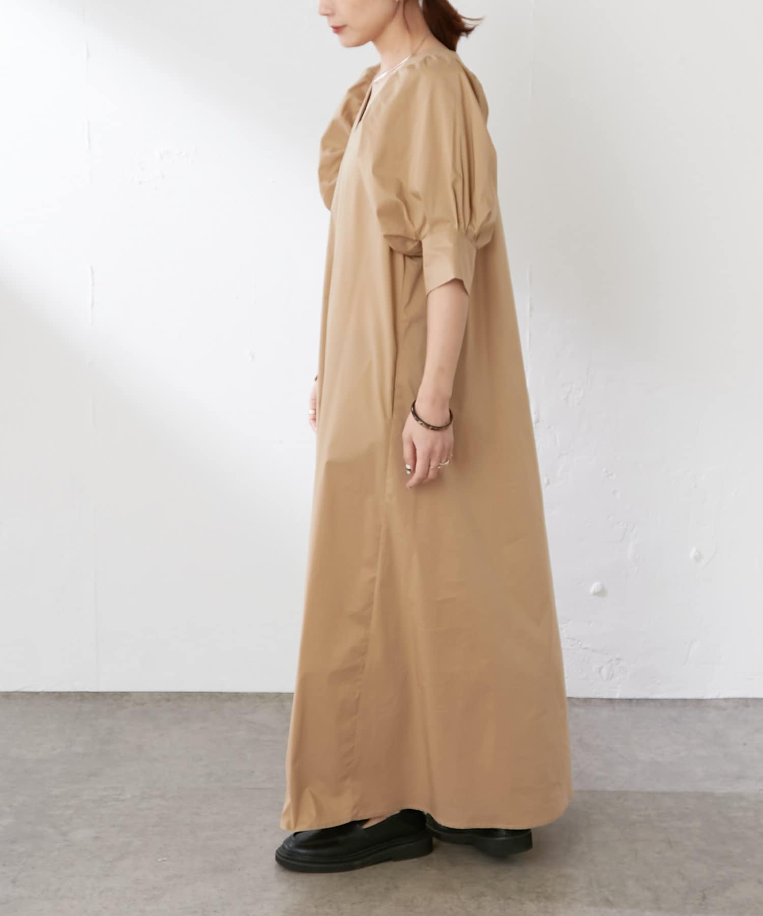 ・袖のタック+ギャザーのボリューム感と肩のバランスに拘り、身体を華奢に見せてくれます。