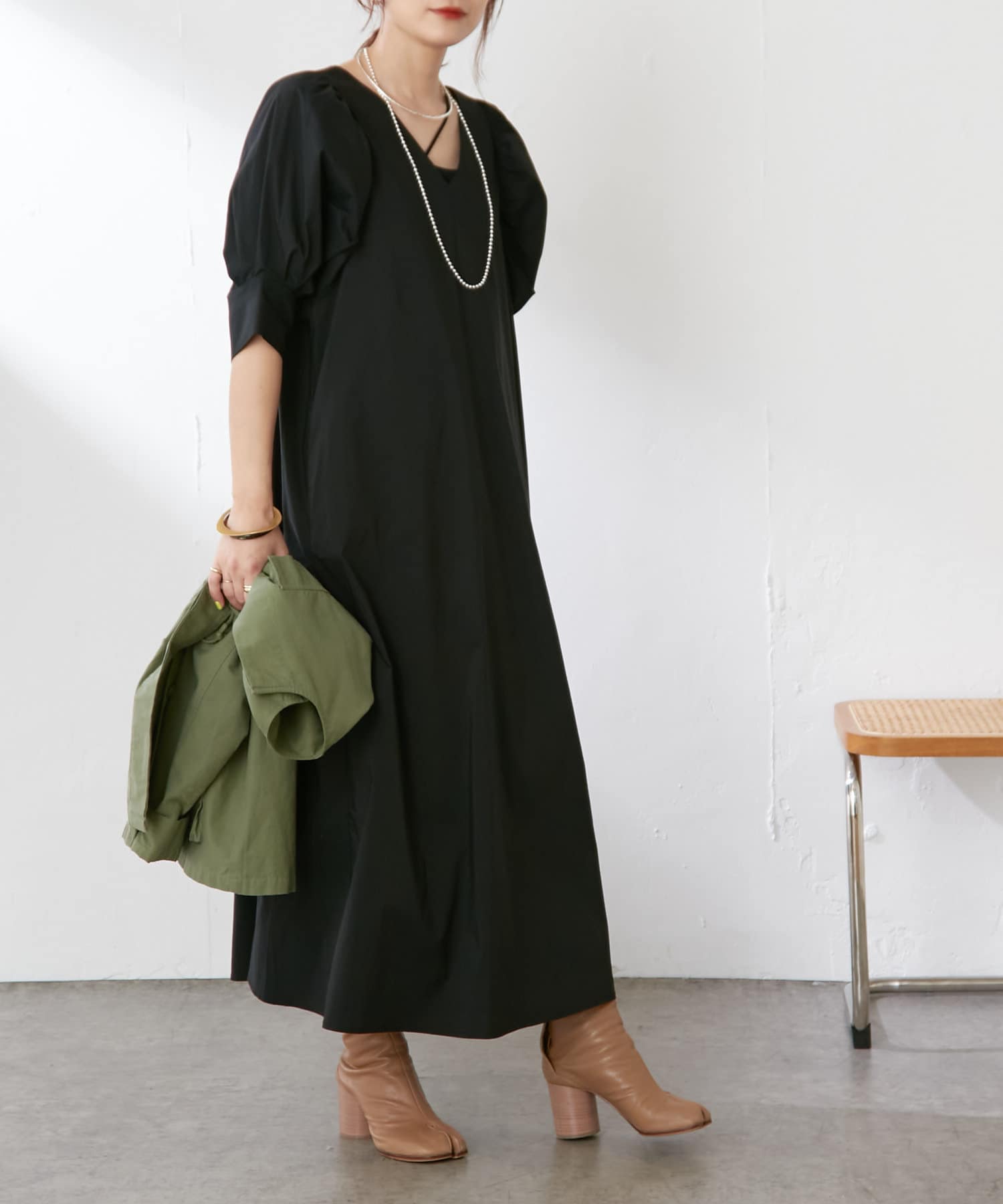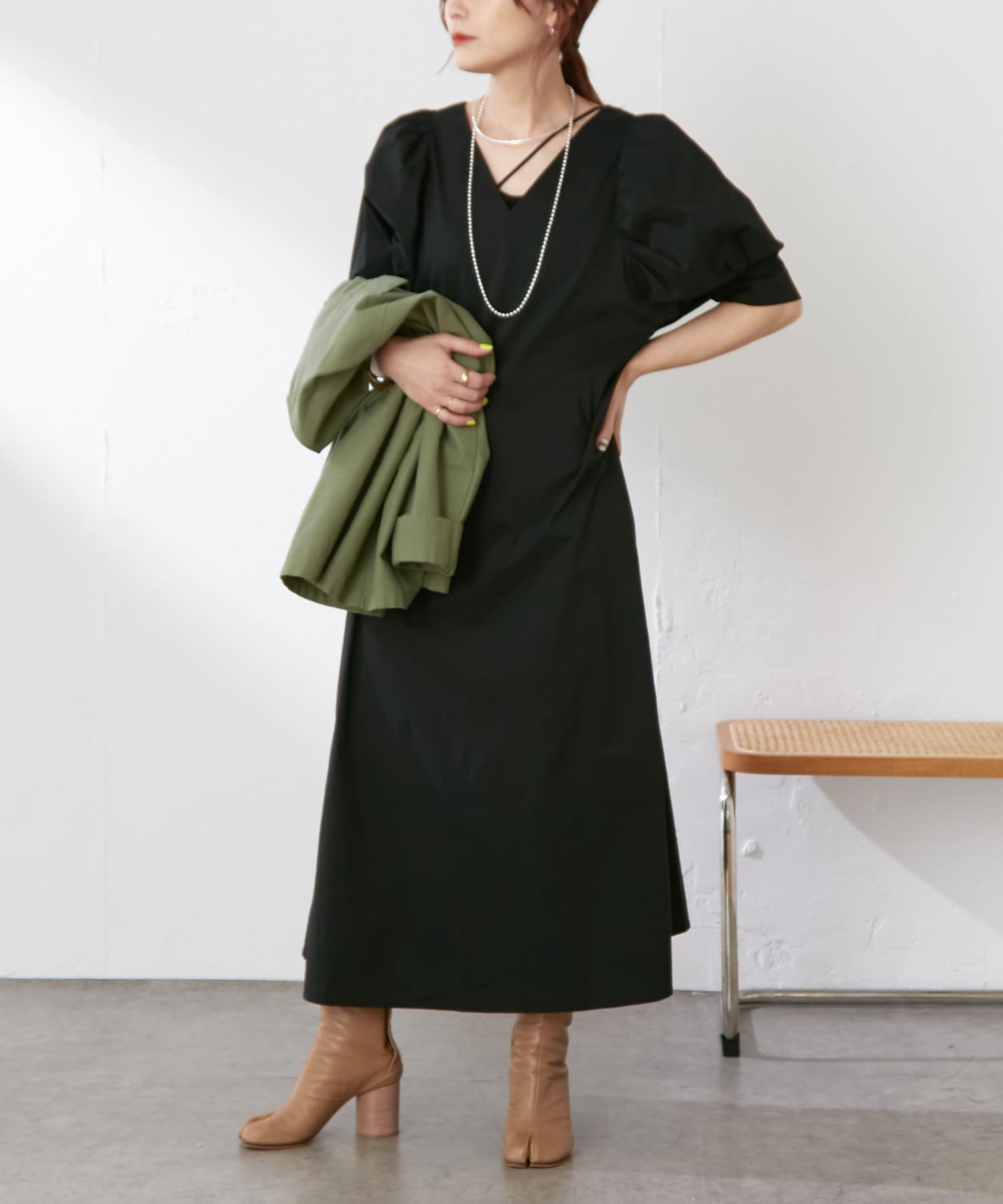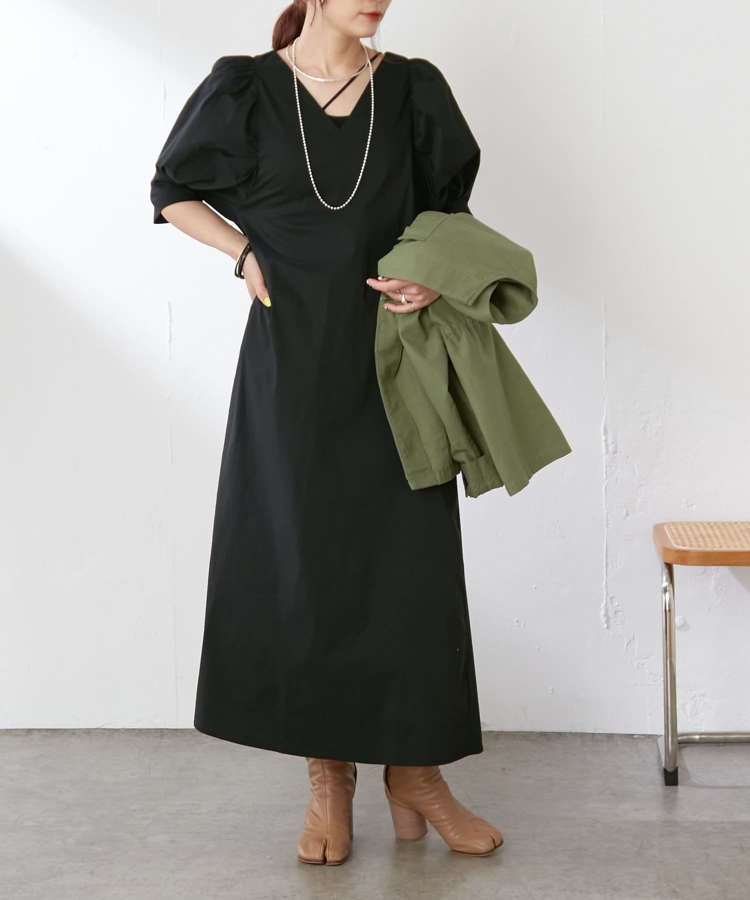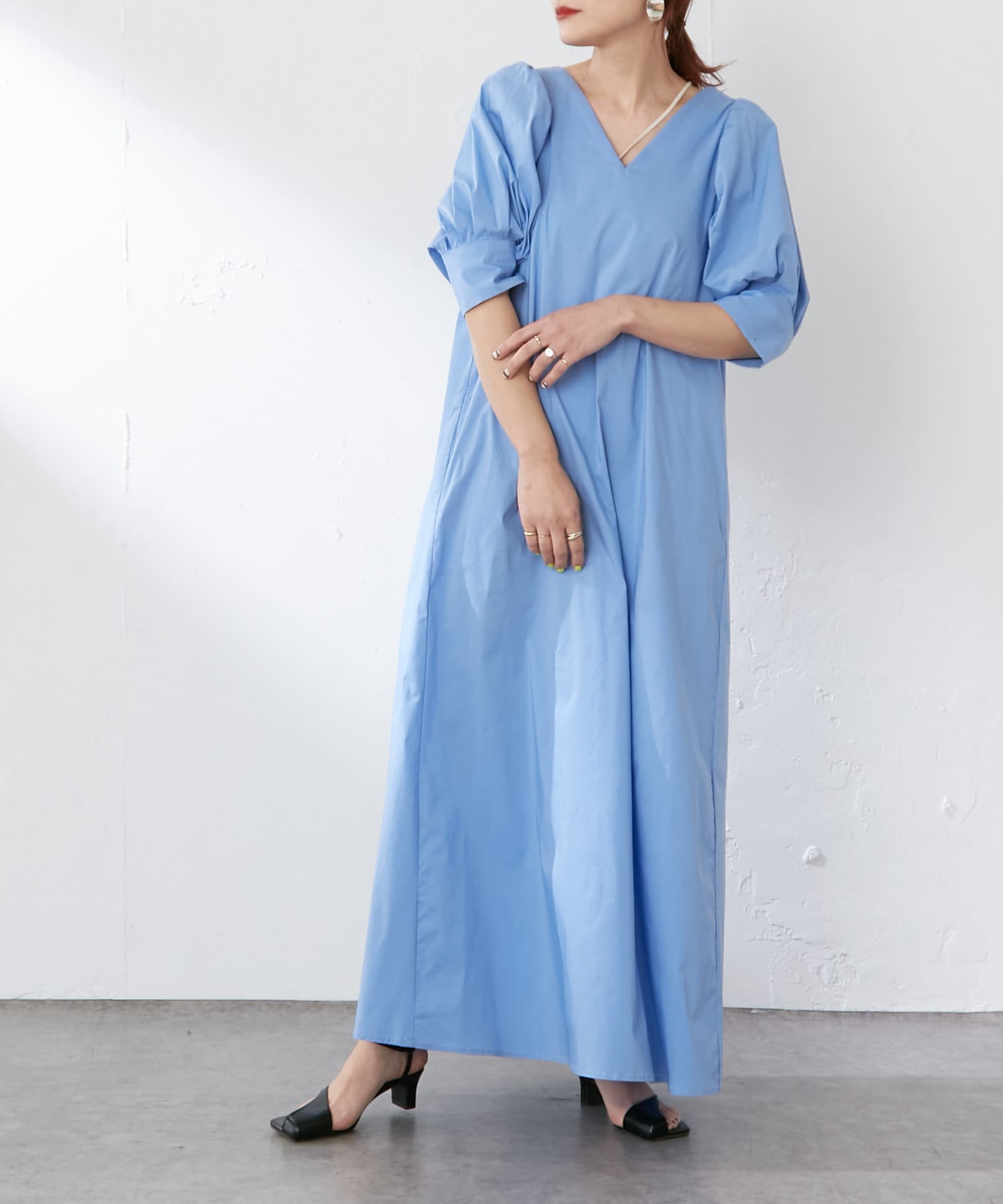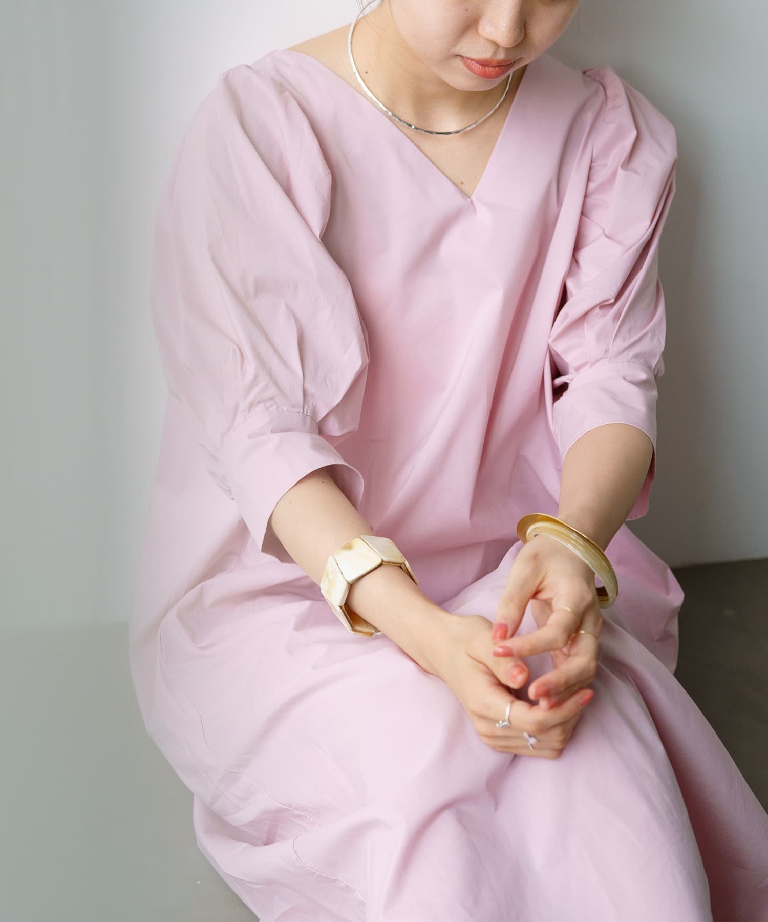 ・袖のタック+ギャザーのボリューム感と肩のバランスに拘り、身体を華奢に見せてくれます。