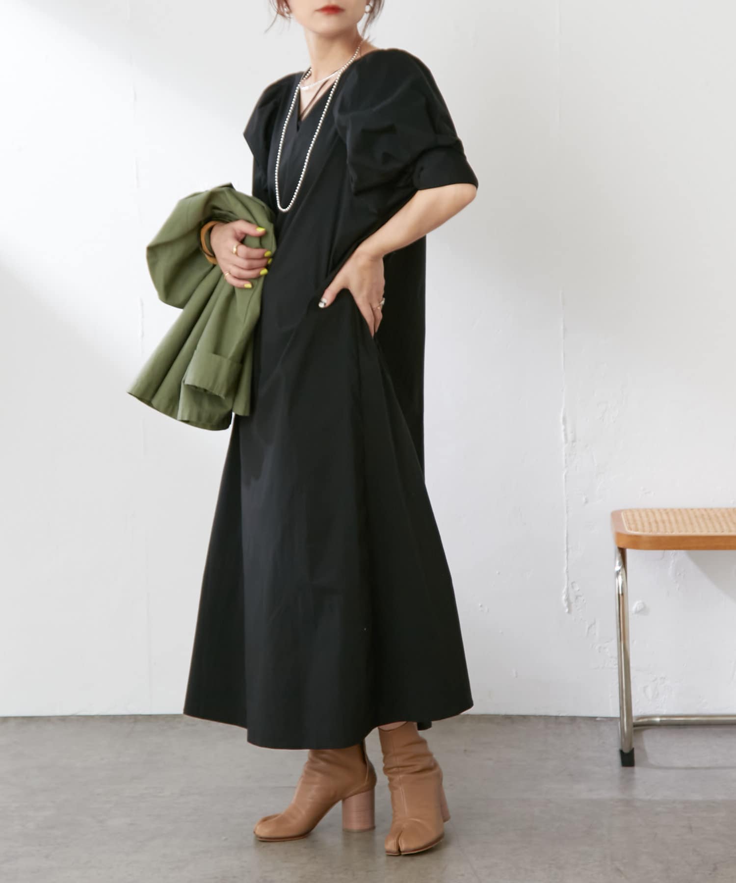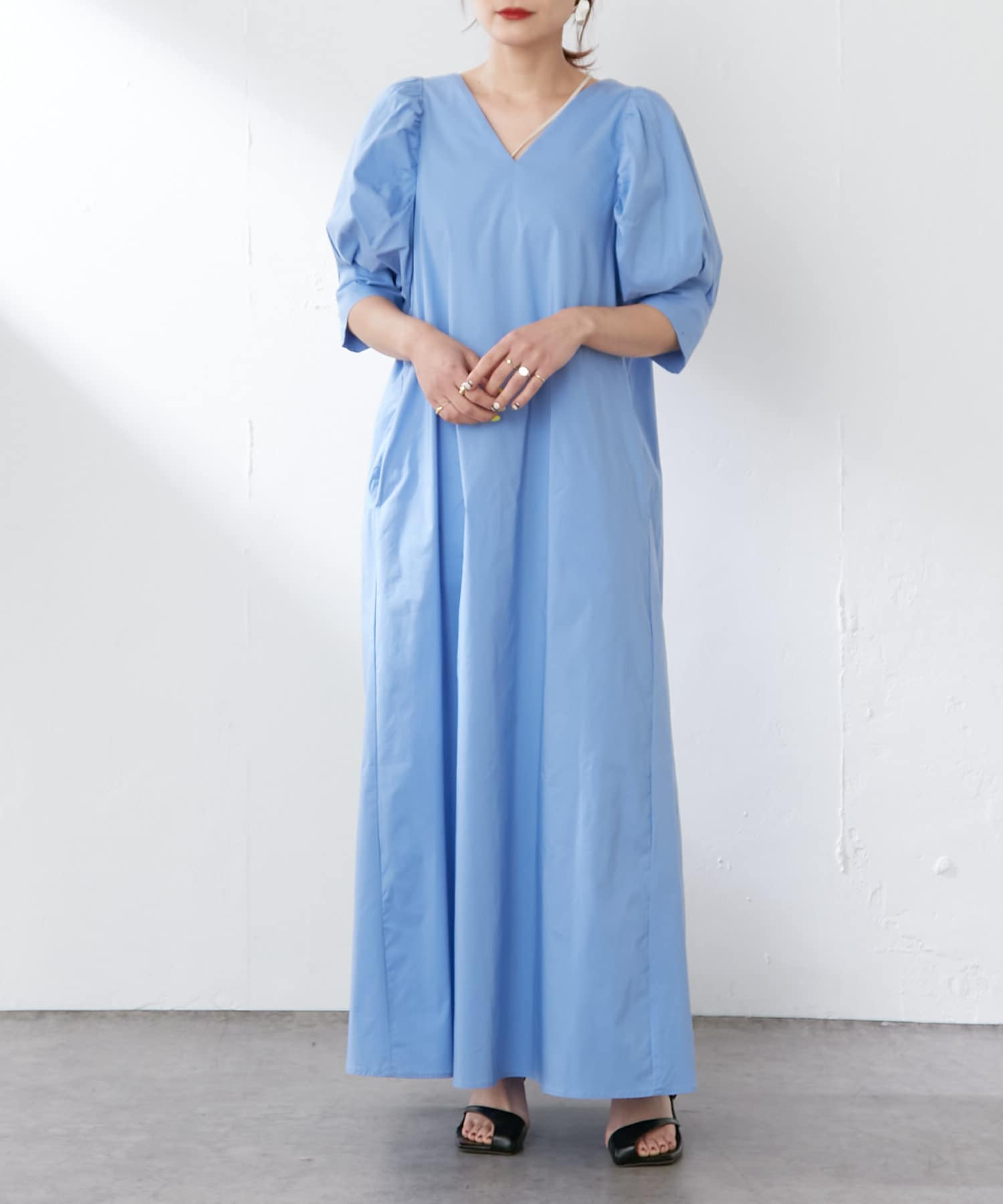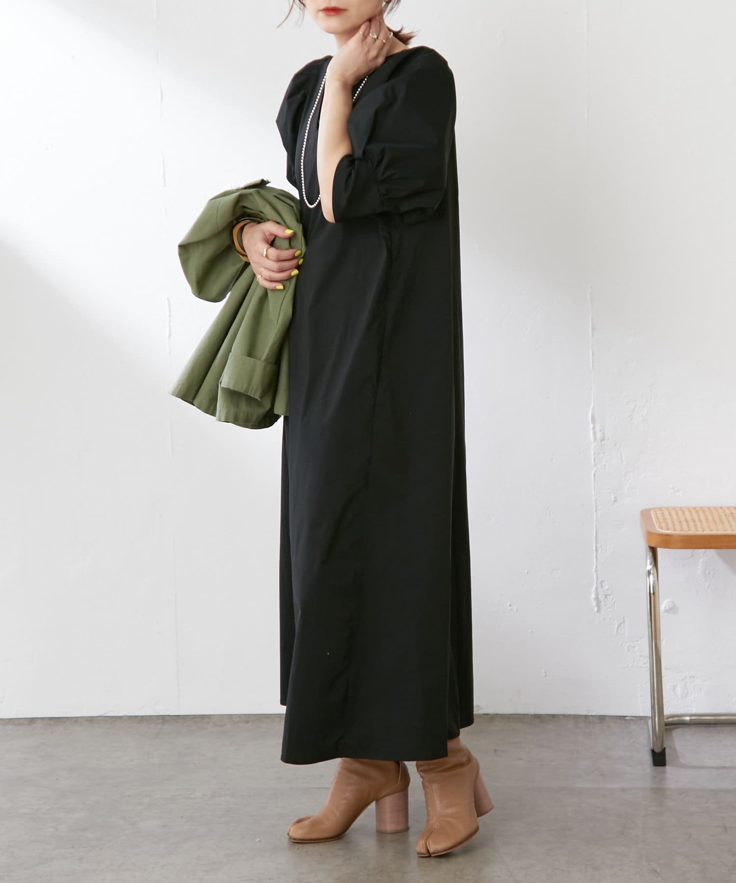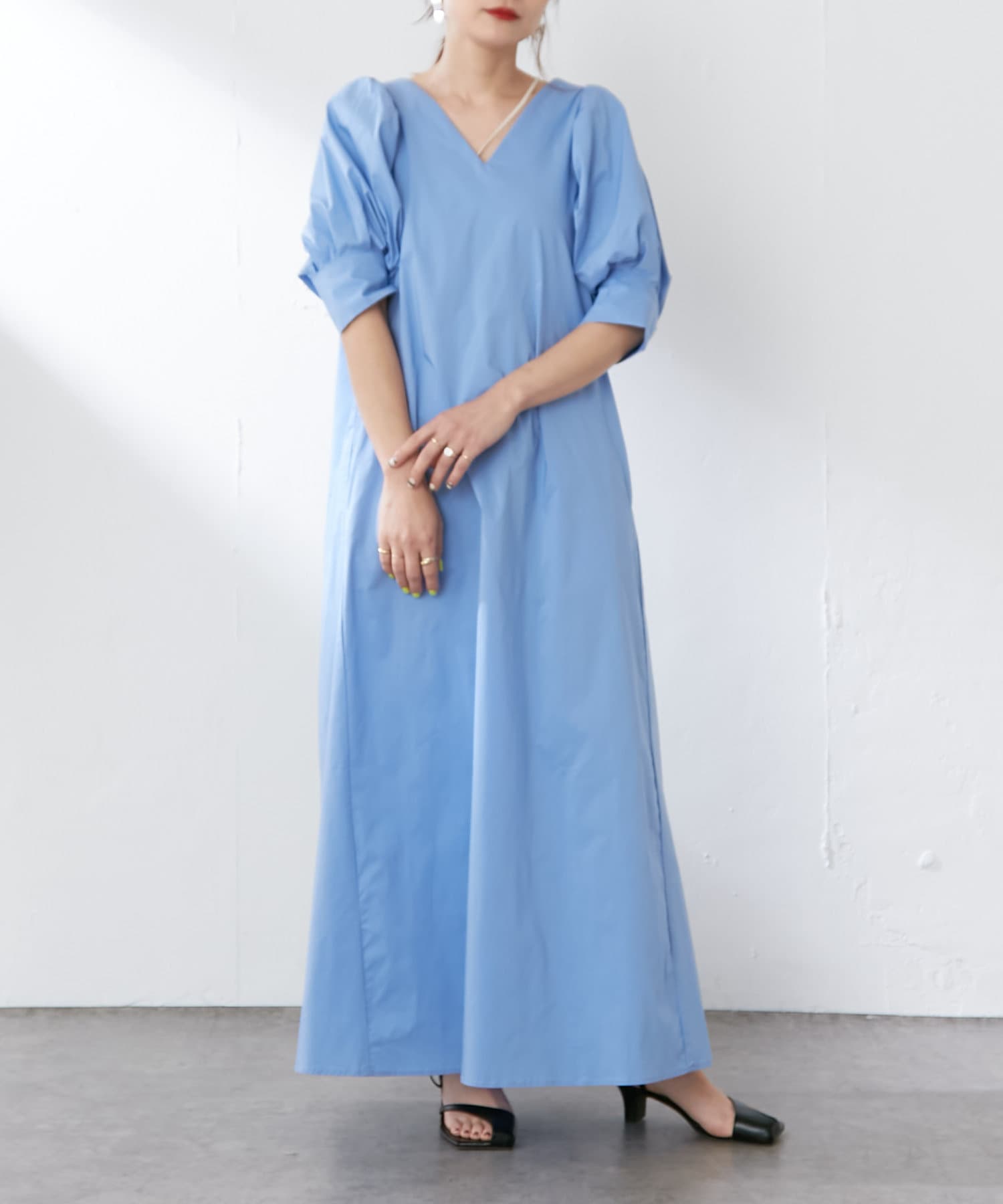 ・袖のタック+ギャザーのボリューム感と肩のバランスに拘り、身体を華奢に見せてくれます。