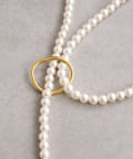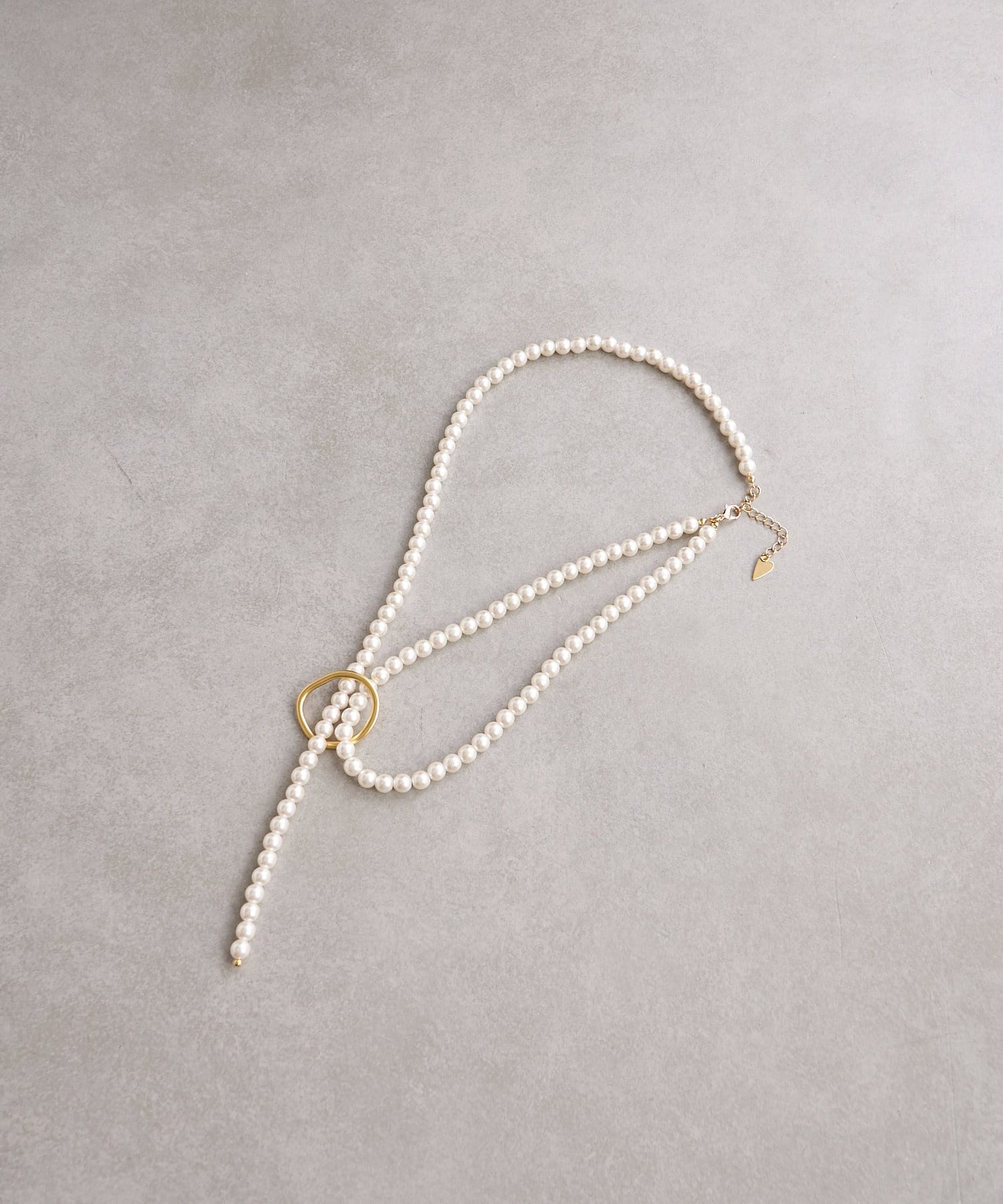 ・女性らしいパールと縦長の変形デザインが特徴のネックレス。ゴールドの金具もポイントになり女性らしい印象に仕上げてくれます。