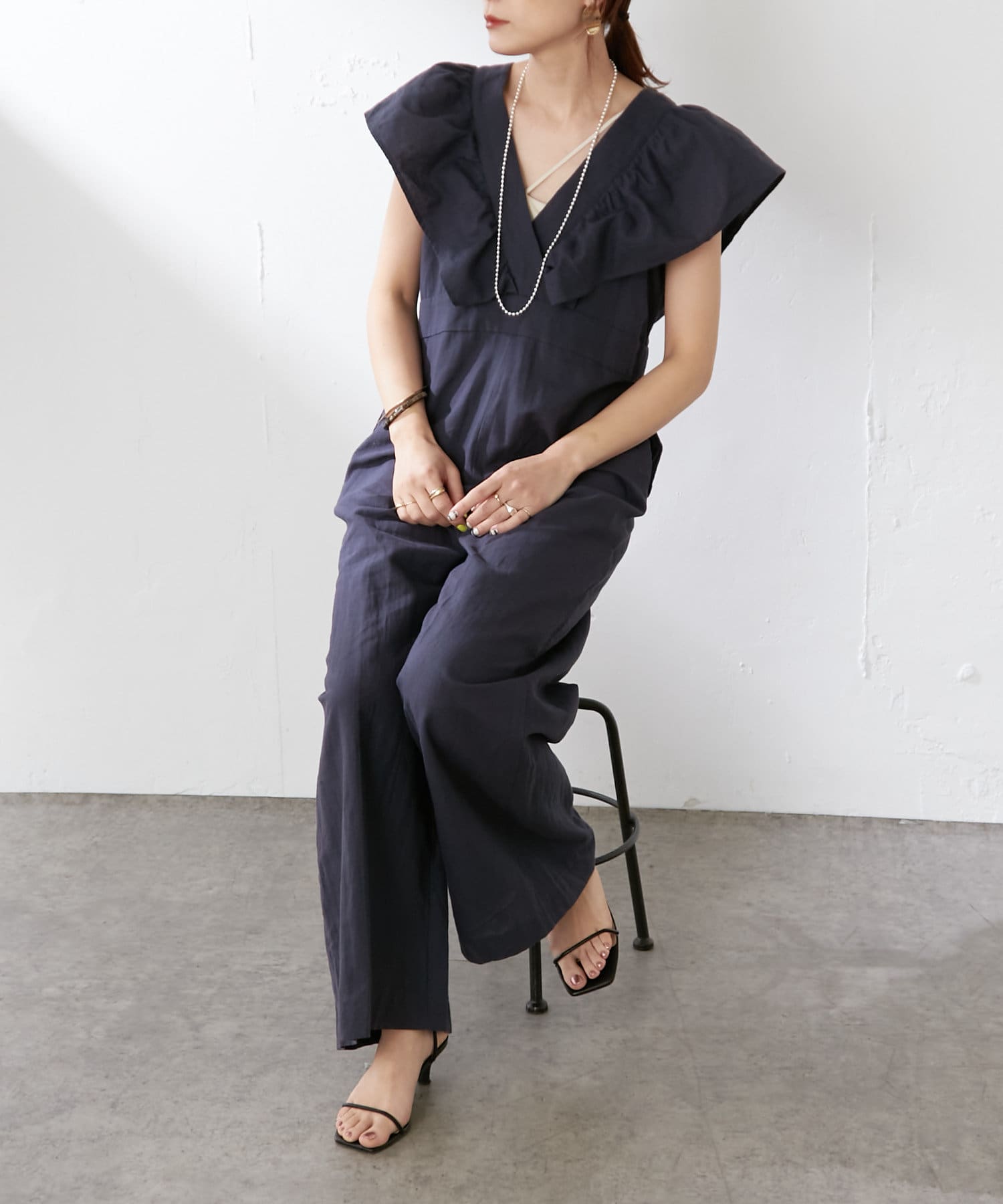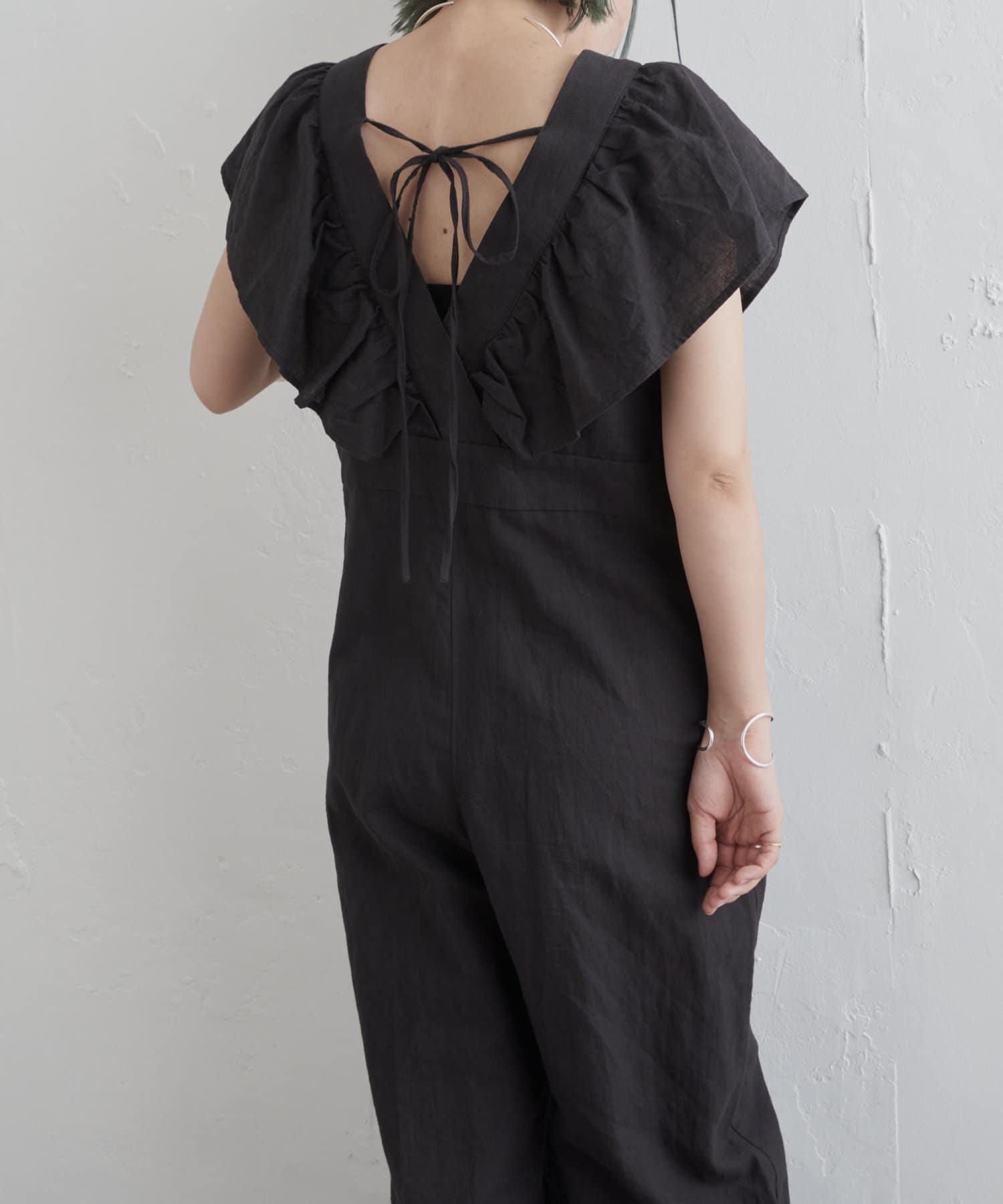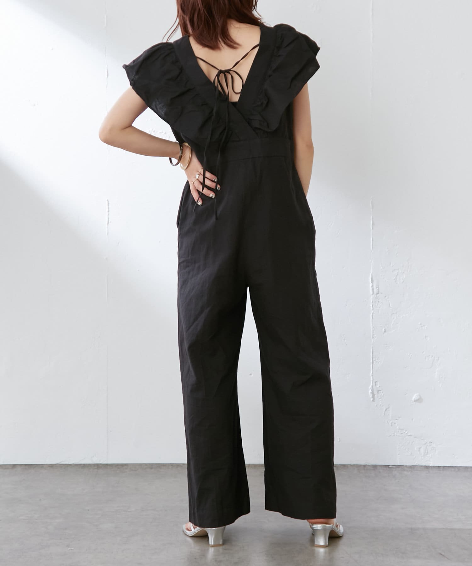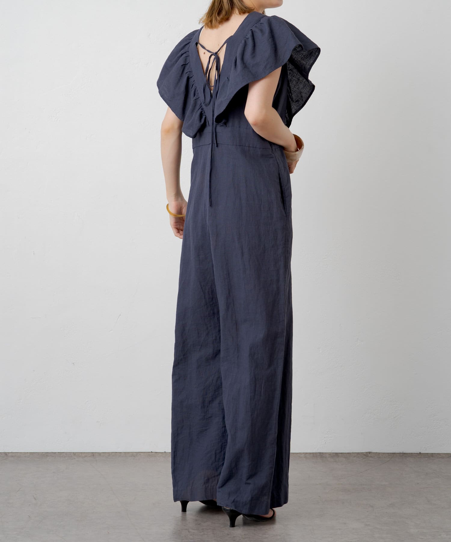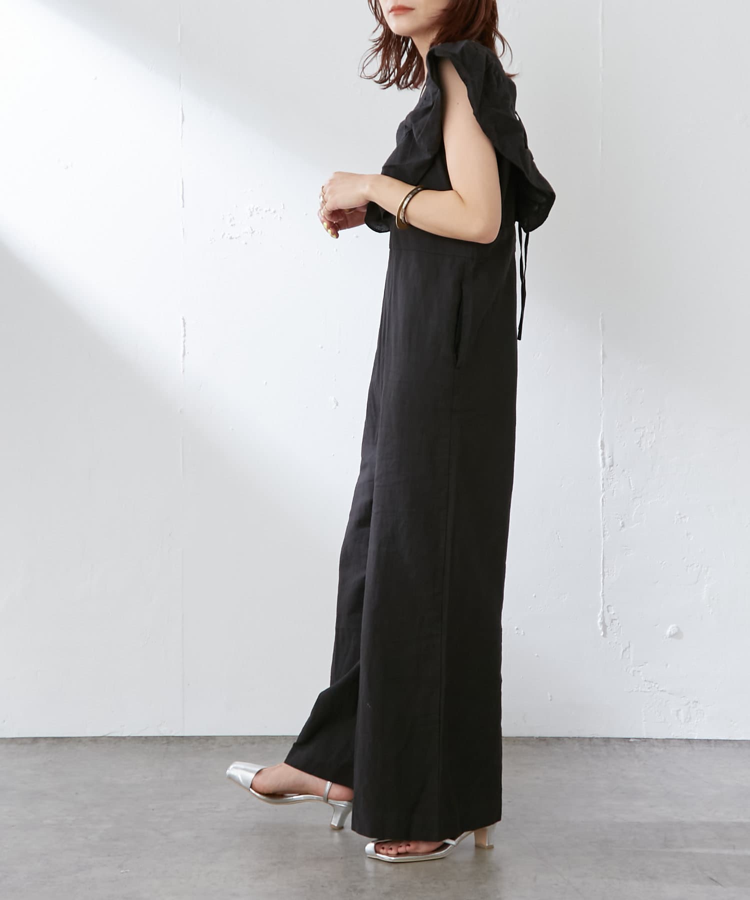 ・大胆なラッフルスリーブが女性らしく、一枚で主役になるオールインワン。