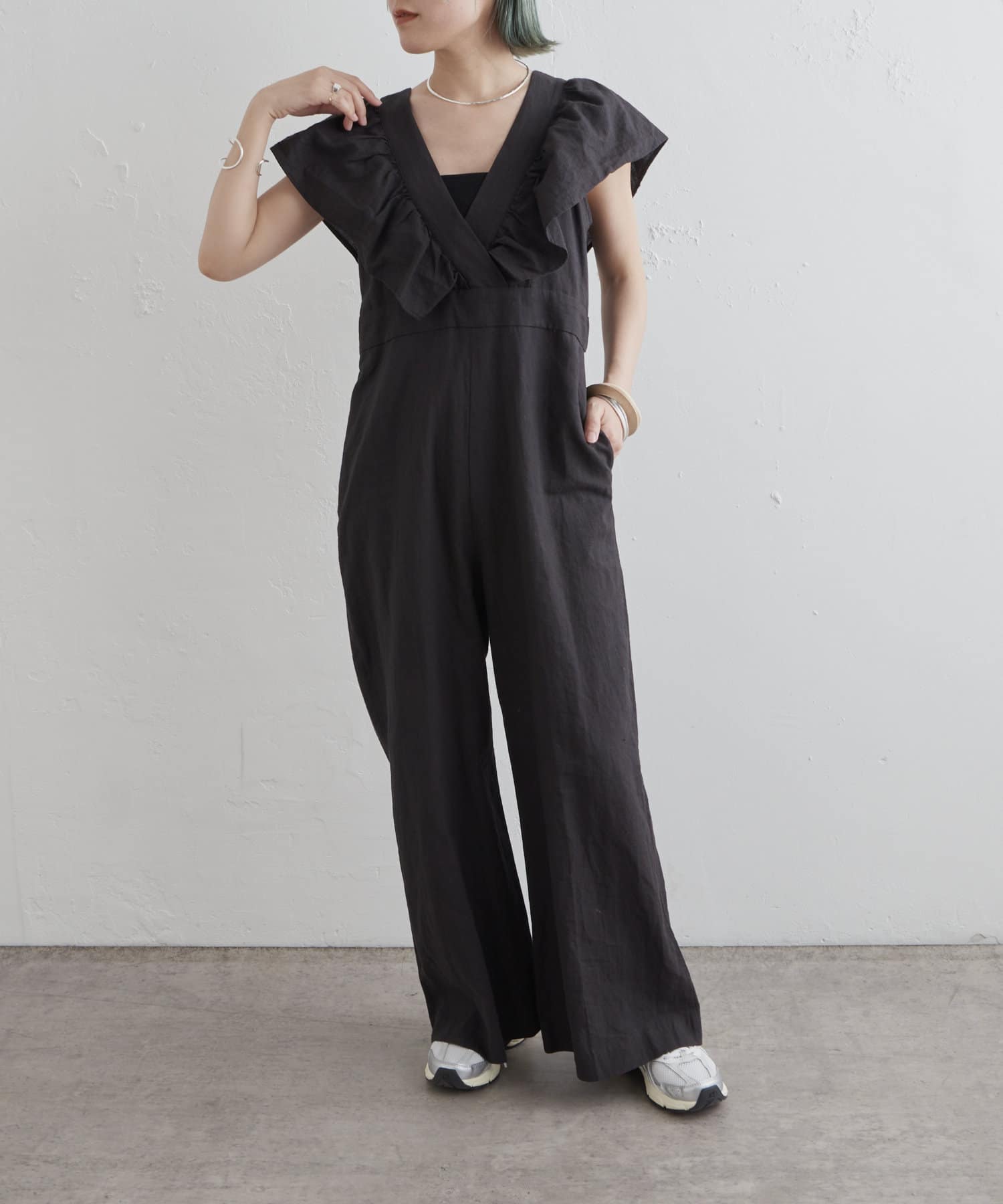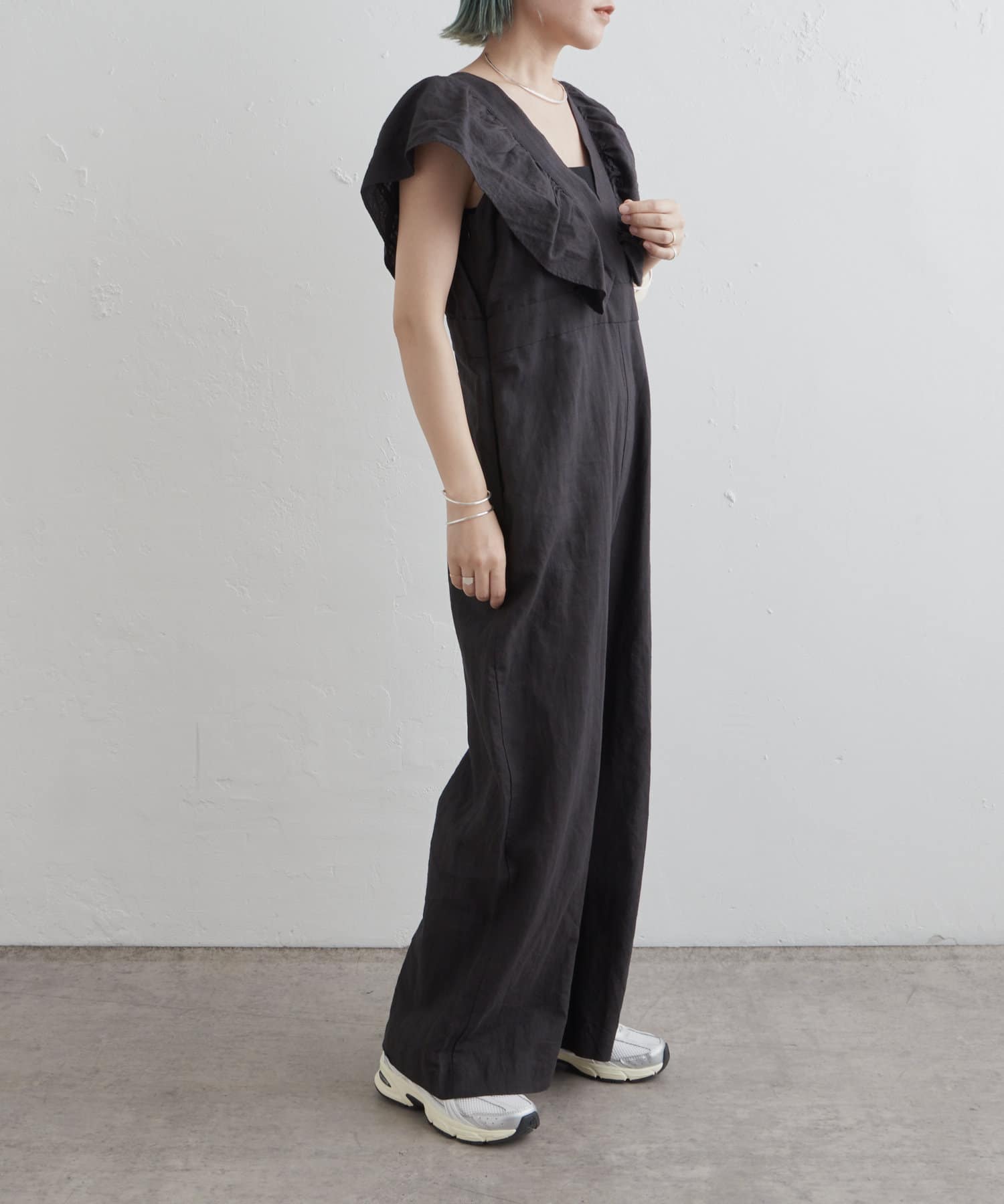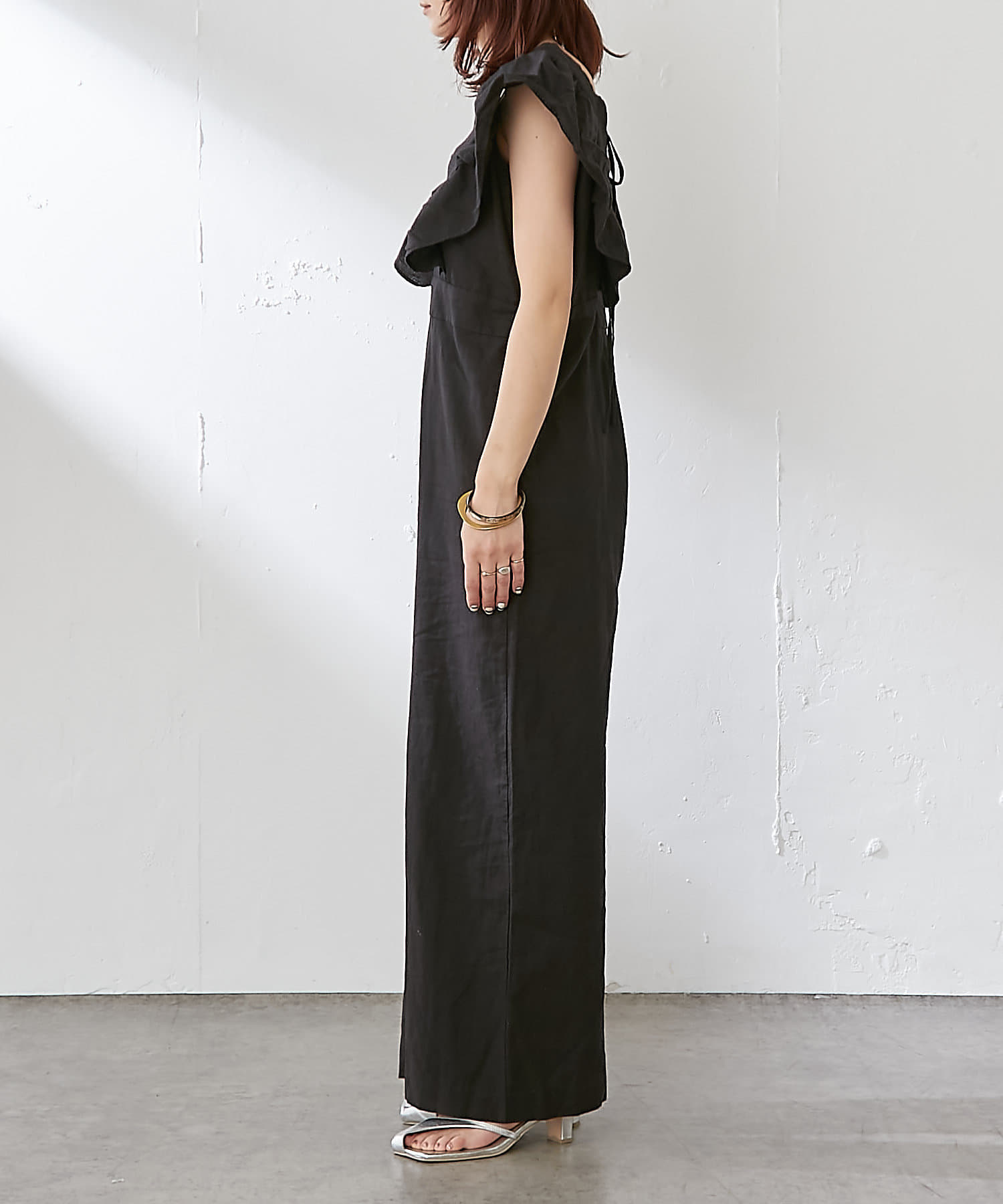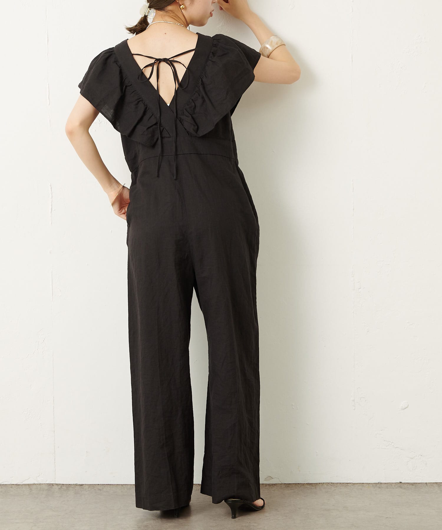 ・大胆なラッフルスリーブが女性らしく、一枚で主役になるオールインワン。