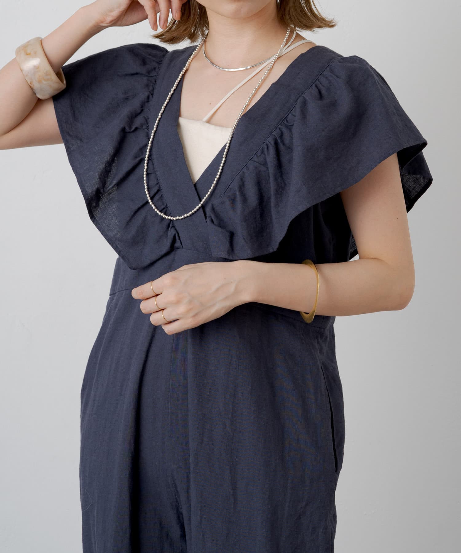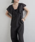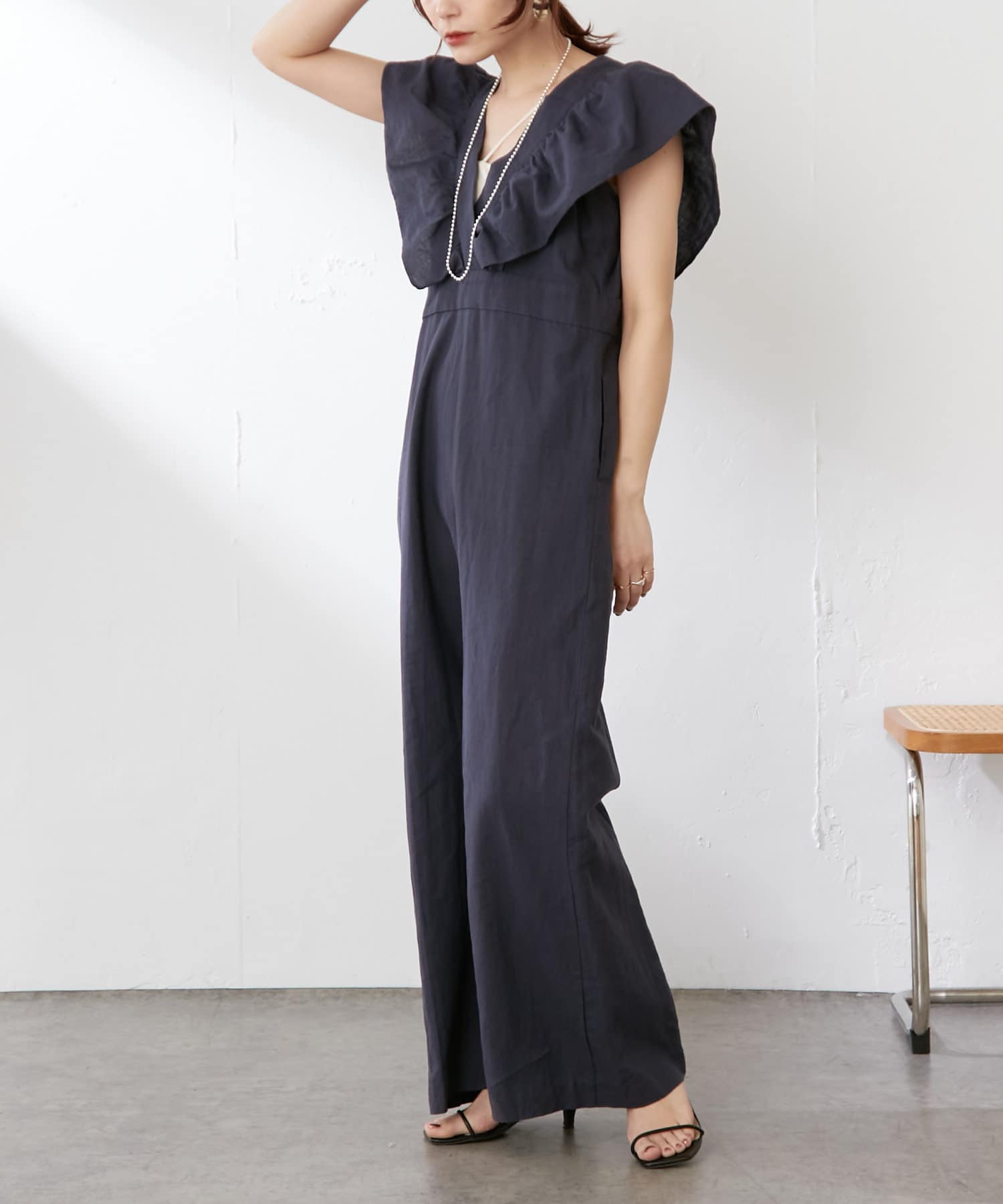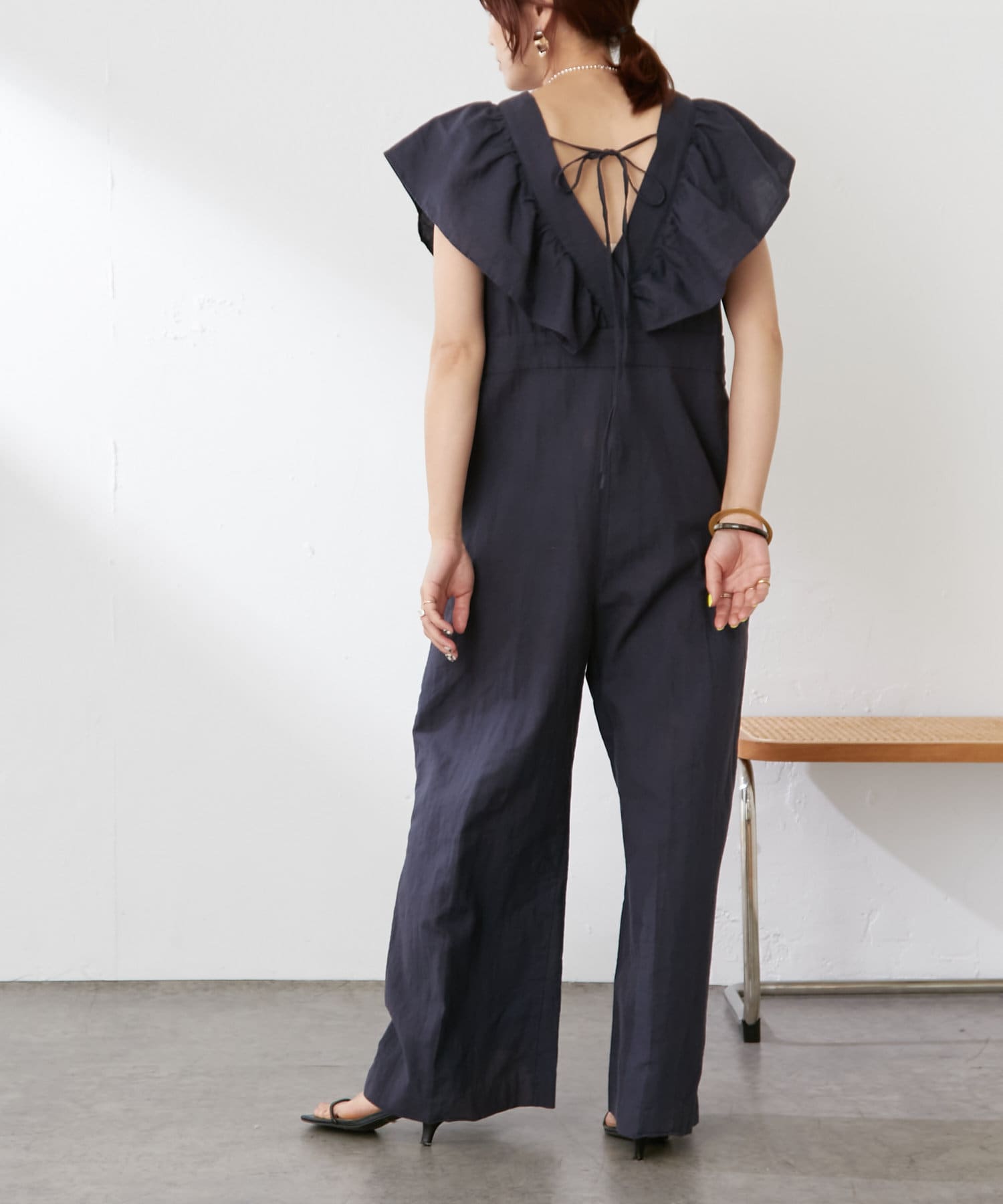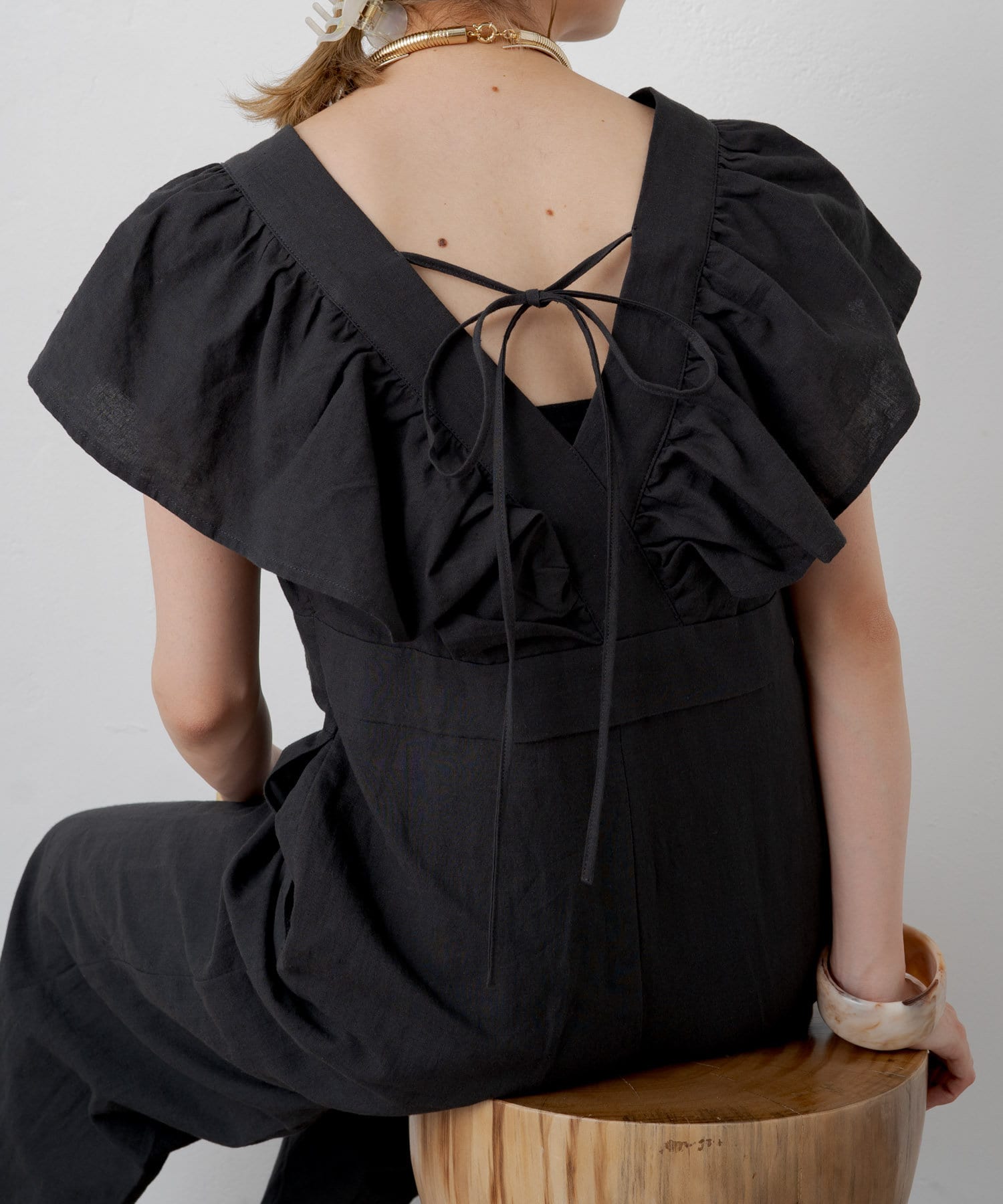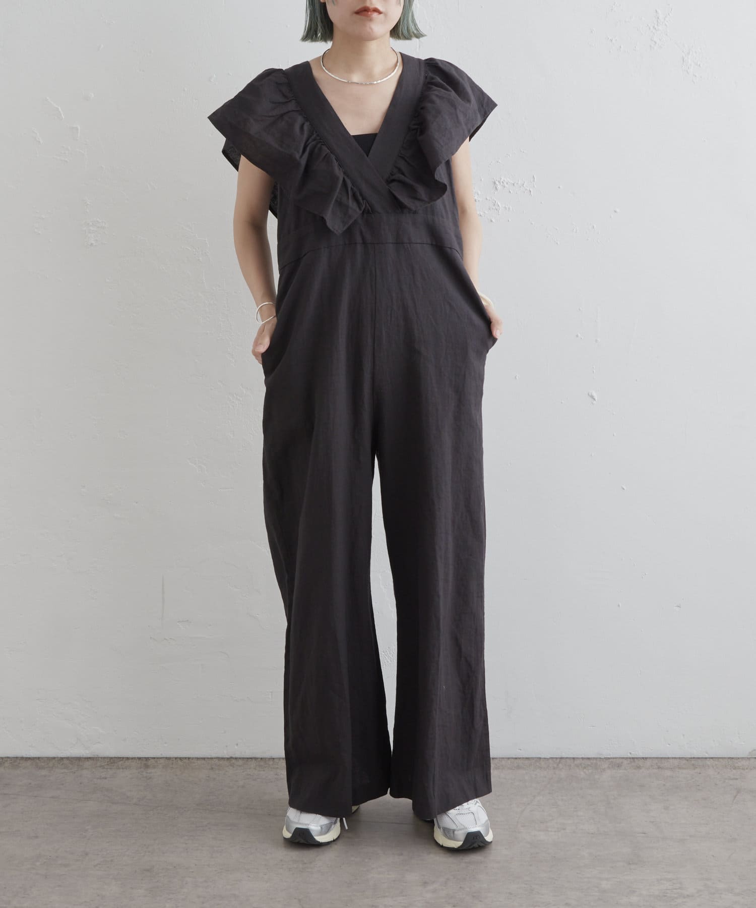 ・大胆なラッフルスリーブが女性らしく、一枚で主役になるオールインワン。