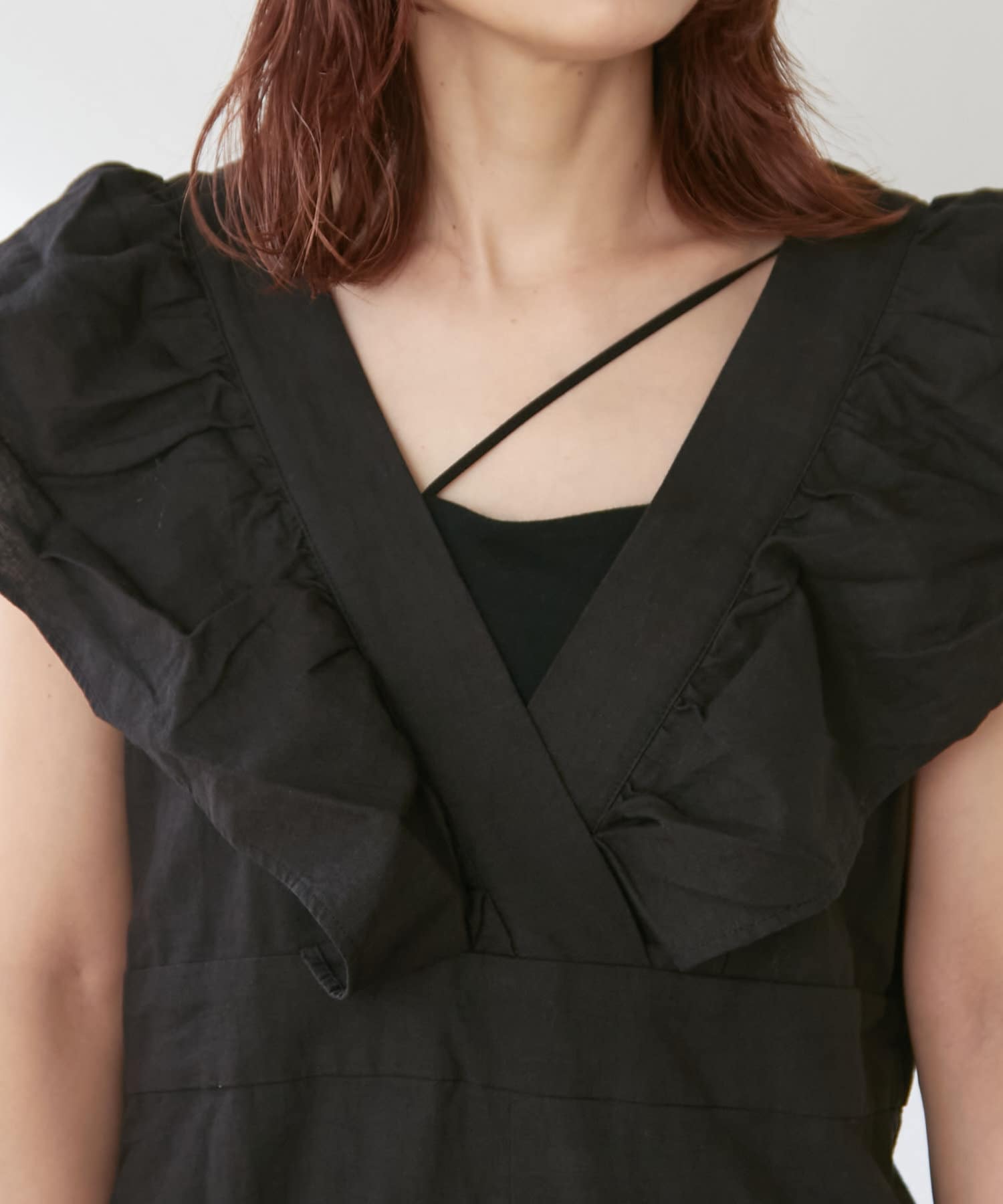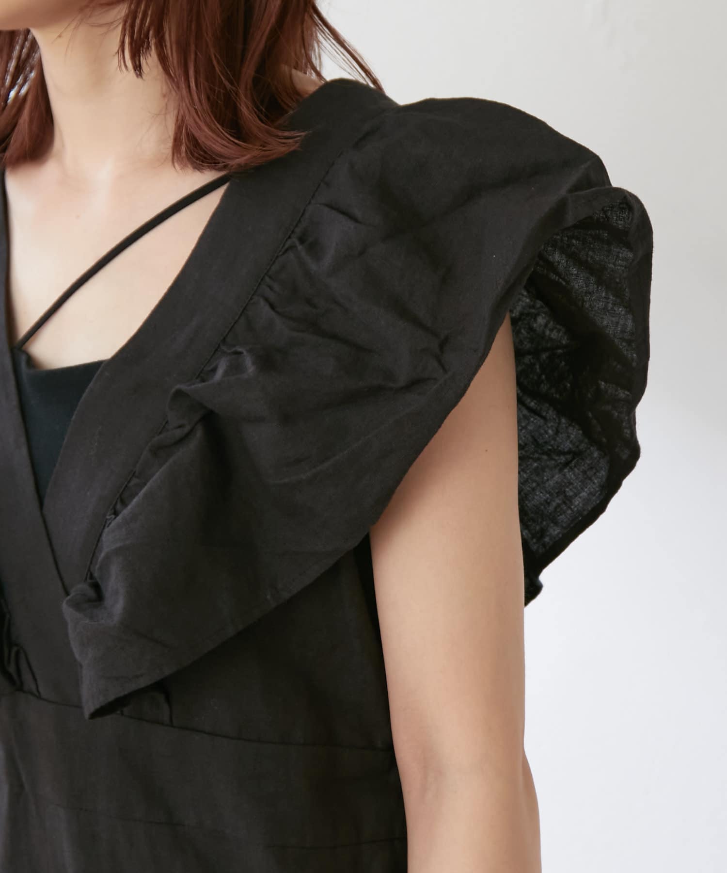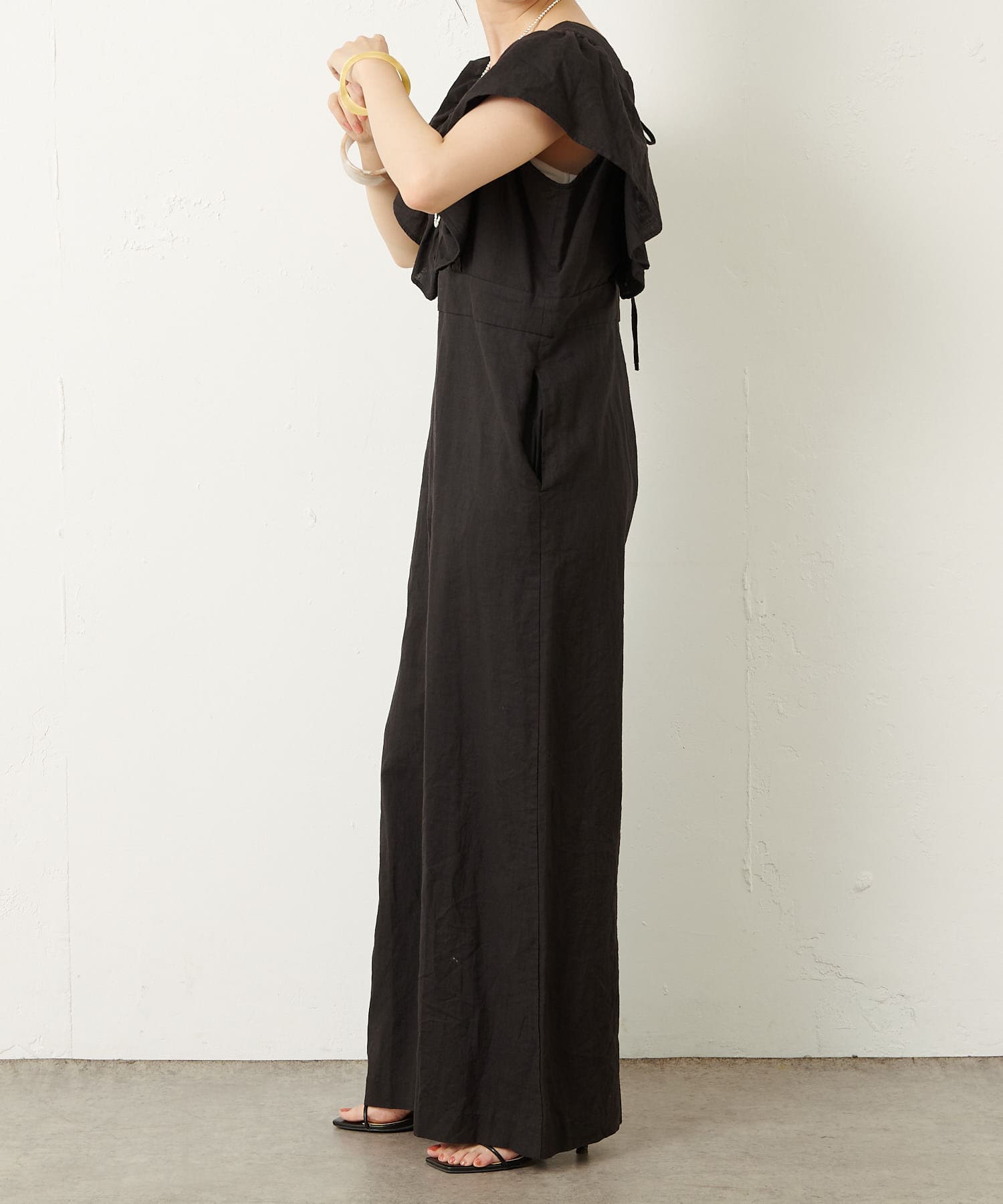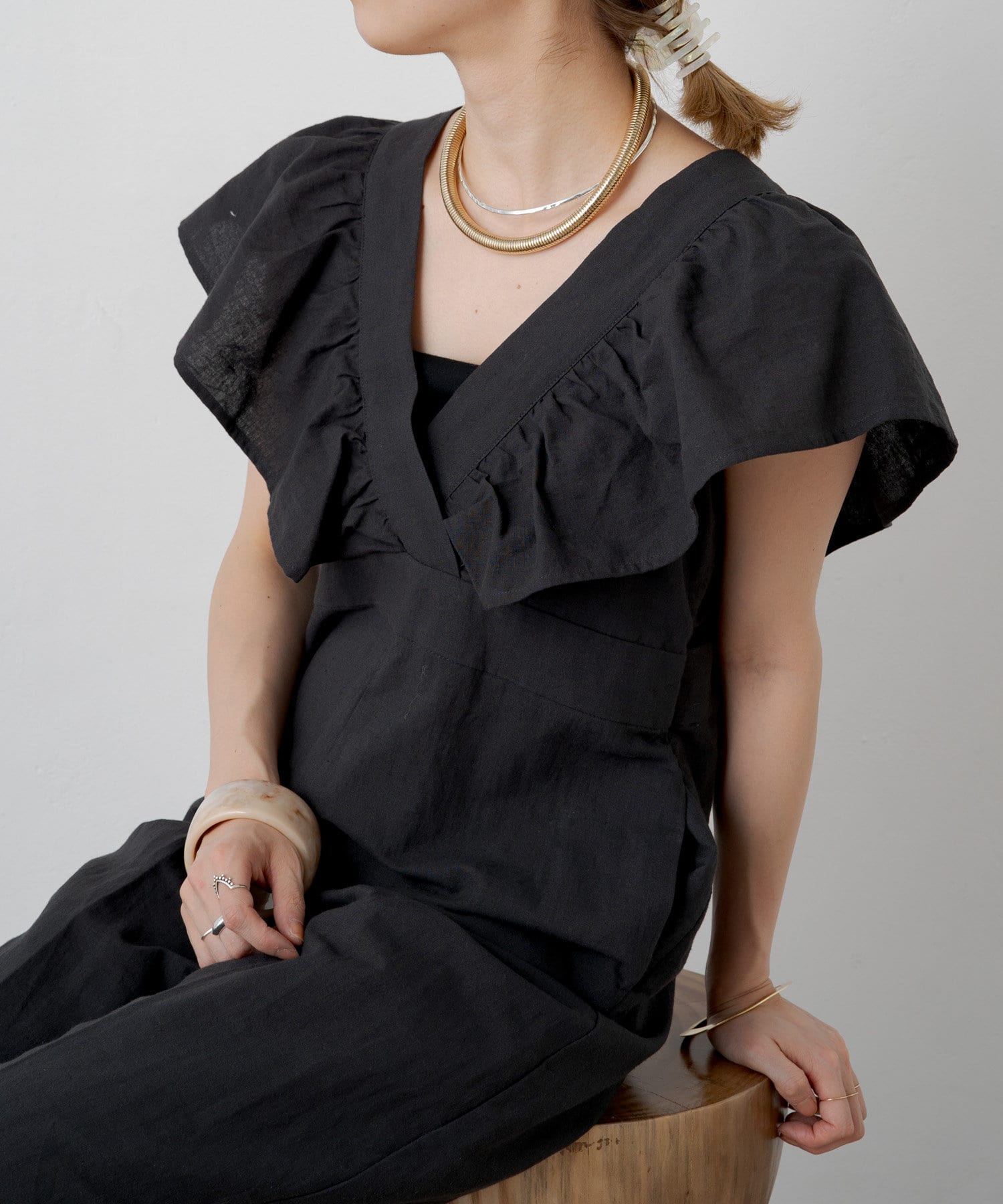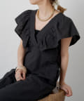 ・大胆なラッフルスリーブが女性らしく、一枚で主役になるオールインワン。