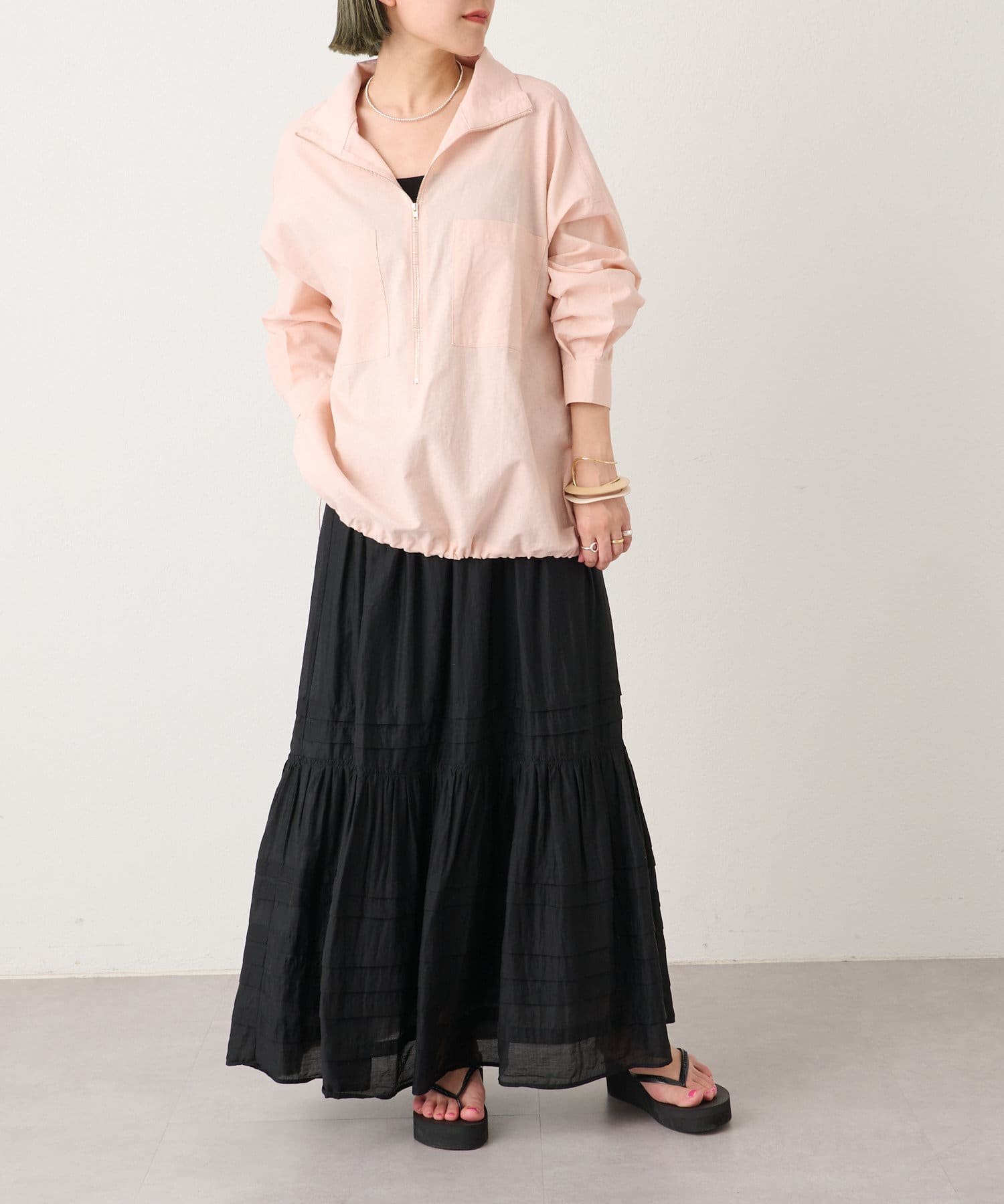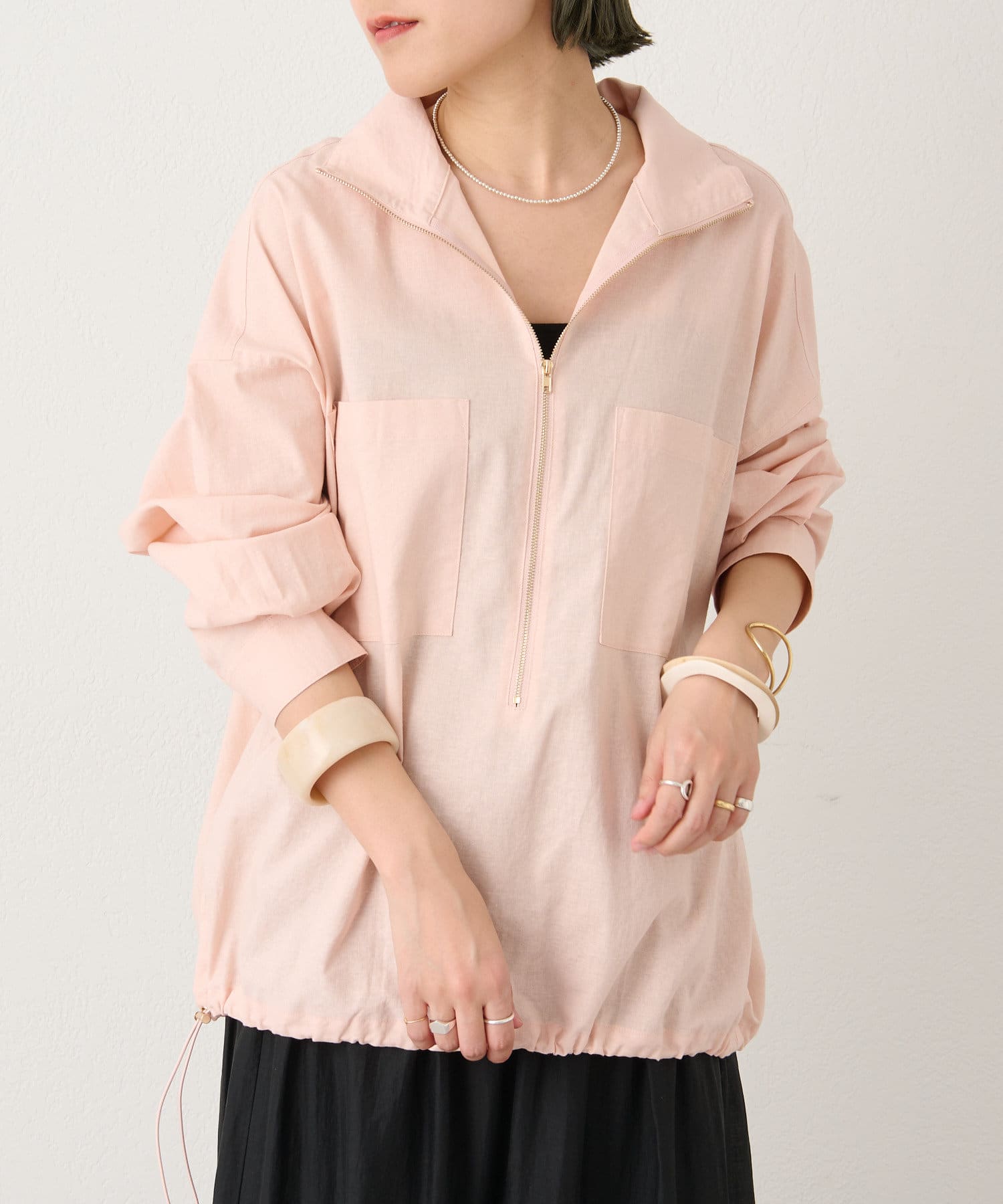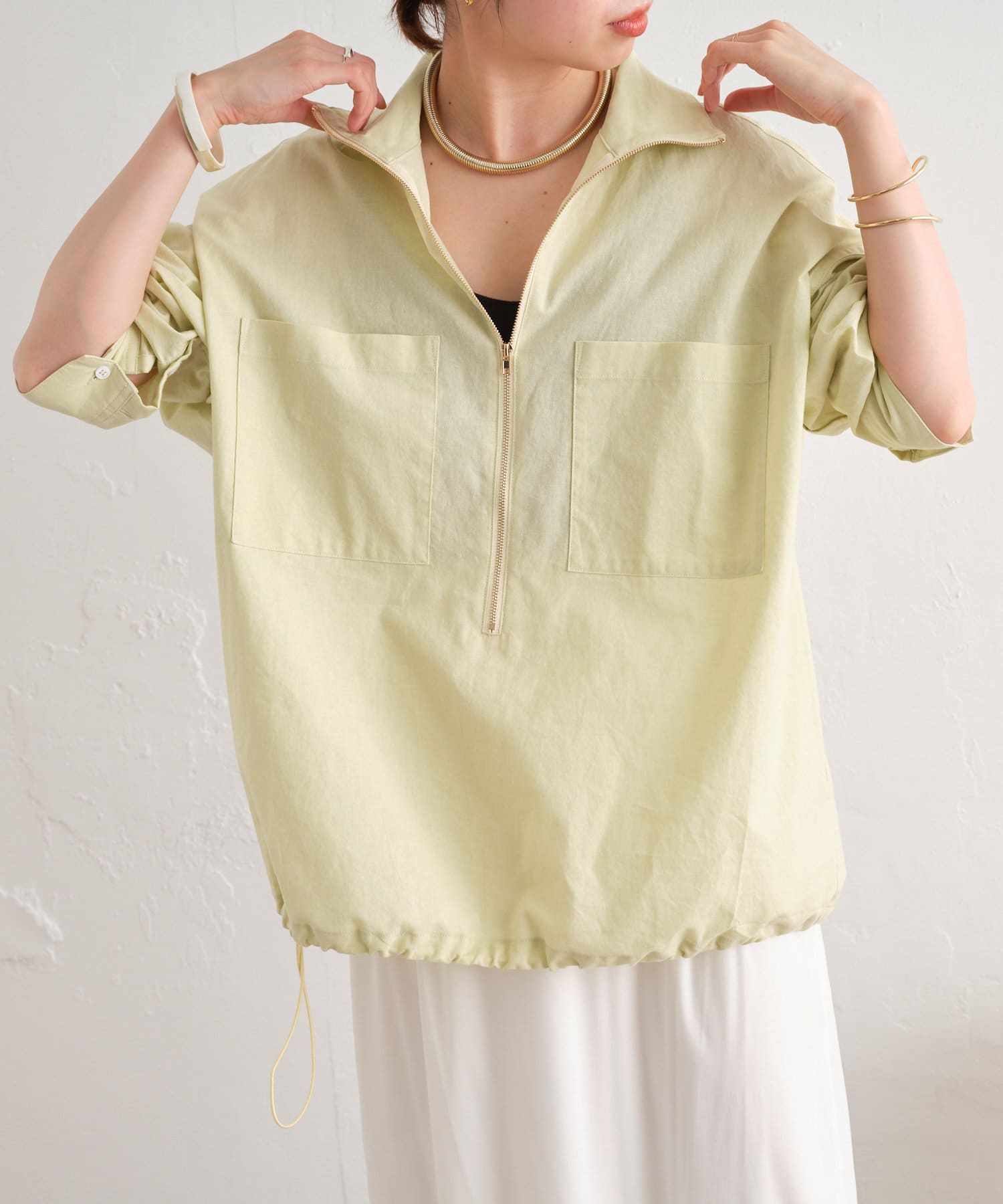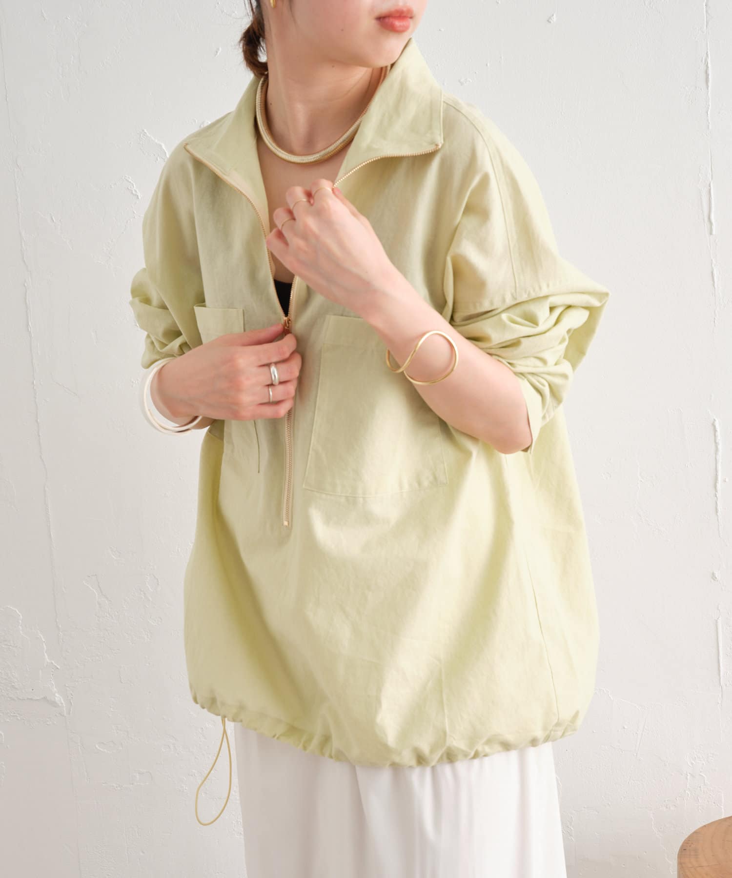 ・一枚ではもちろん、インナーにプリントTシャツを入れるなど、首元のジップをあけてレイヤードスタイルも楽しんでいただけます。