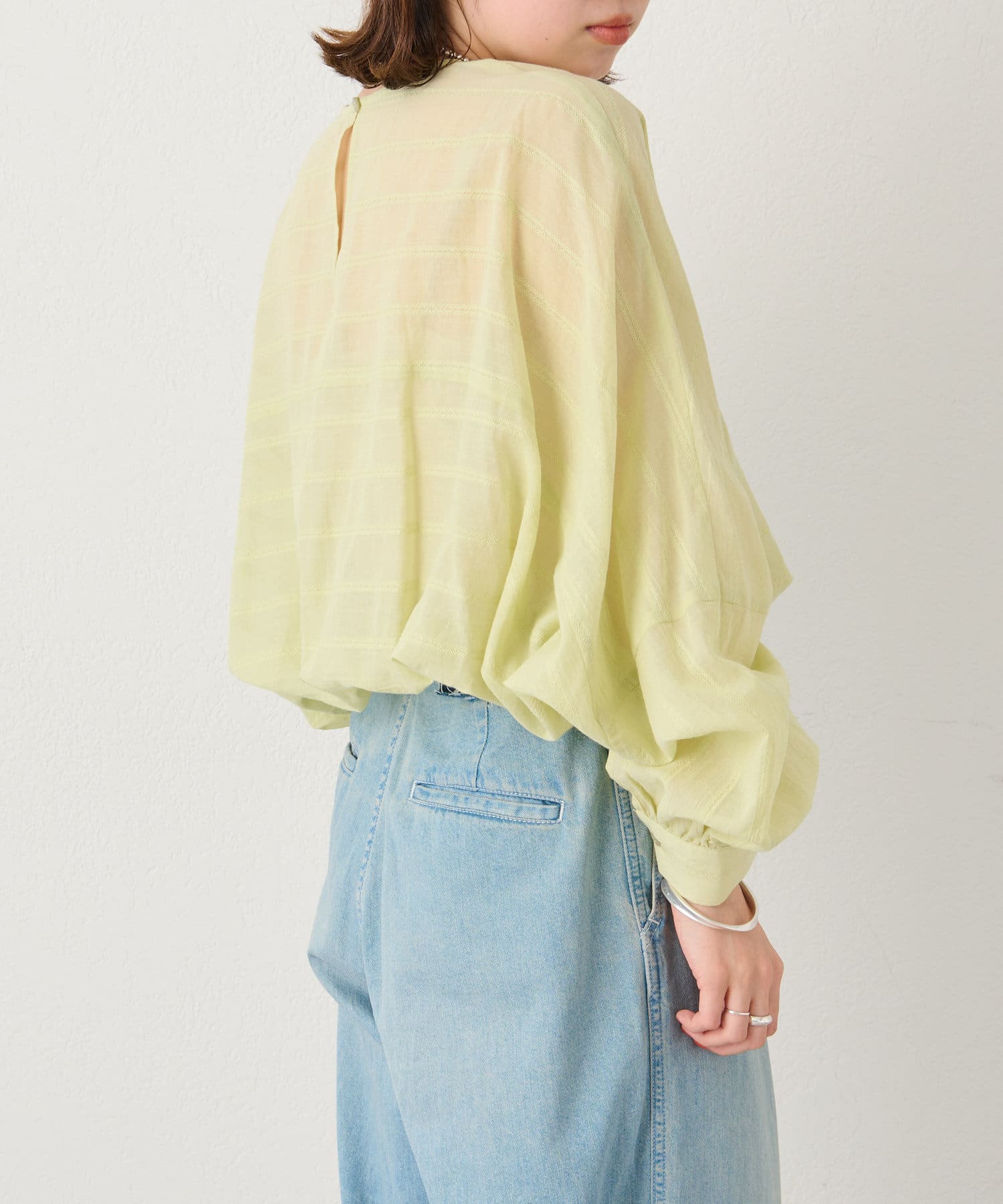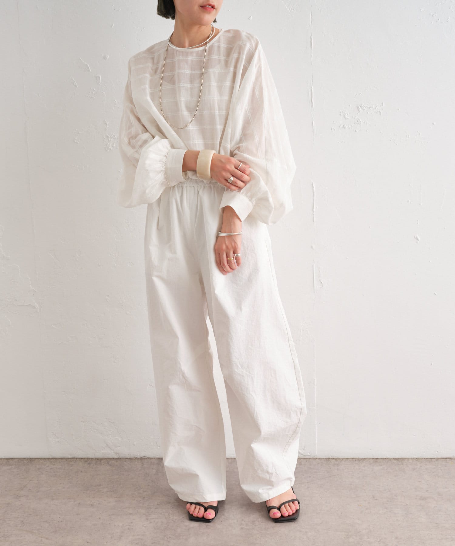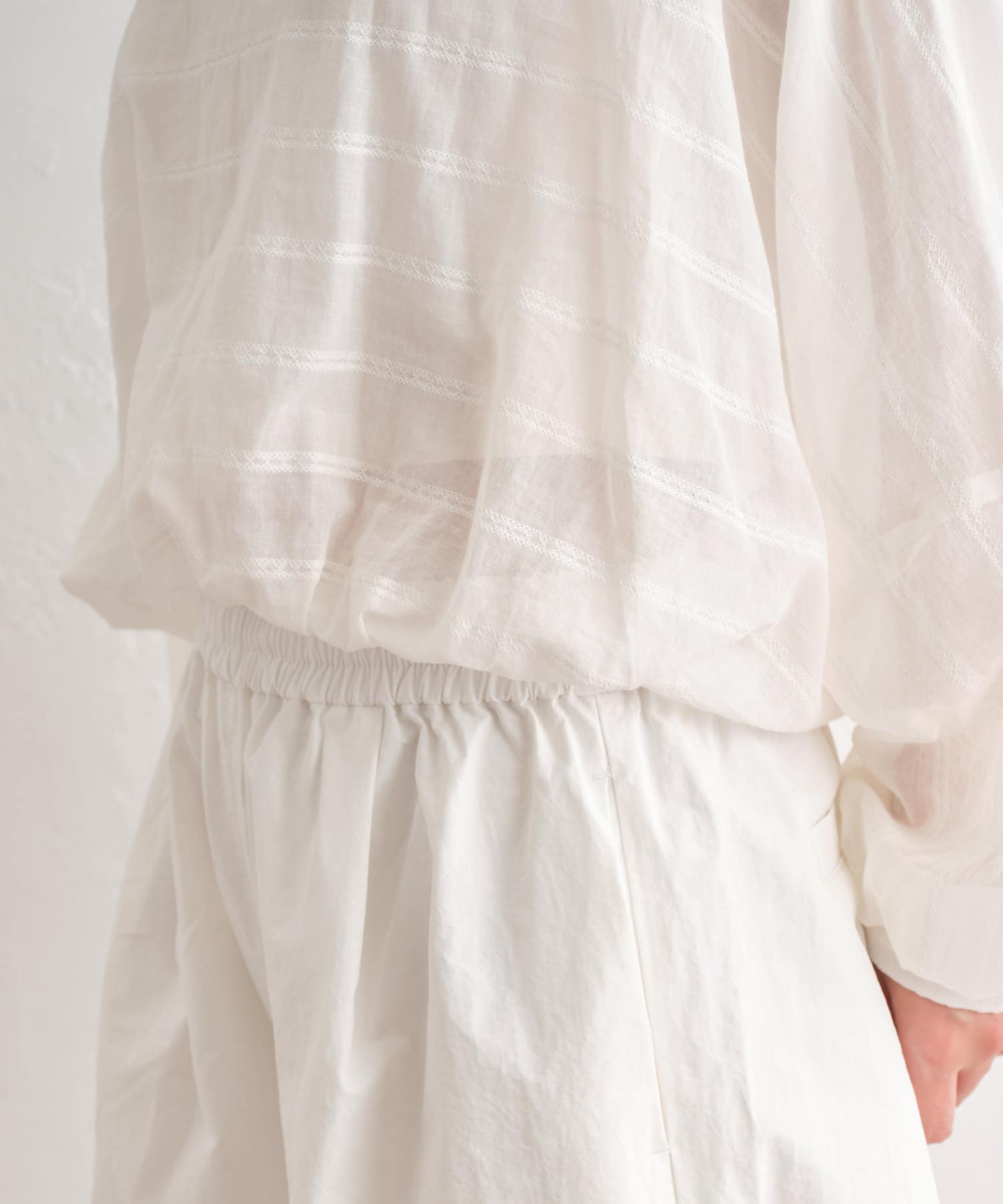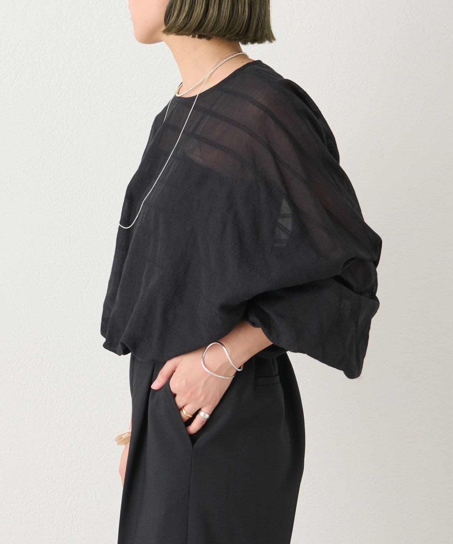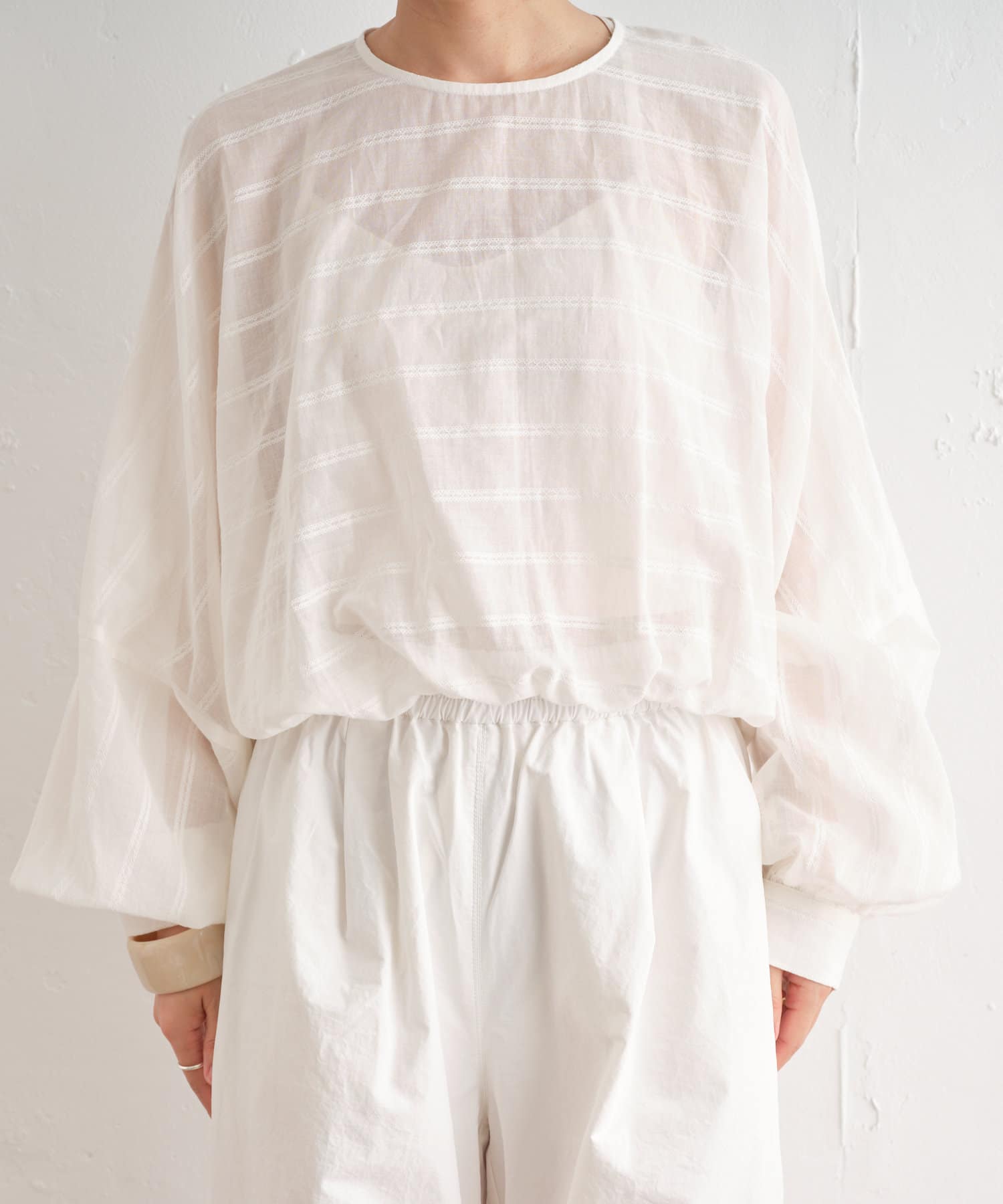 ・身幅はゆったりとしたサイズ感ながらシアー素材なので重くならず、裾にゴムが通っているのでボリューム感と丈を調整して着ていただけます。
