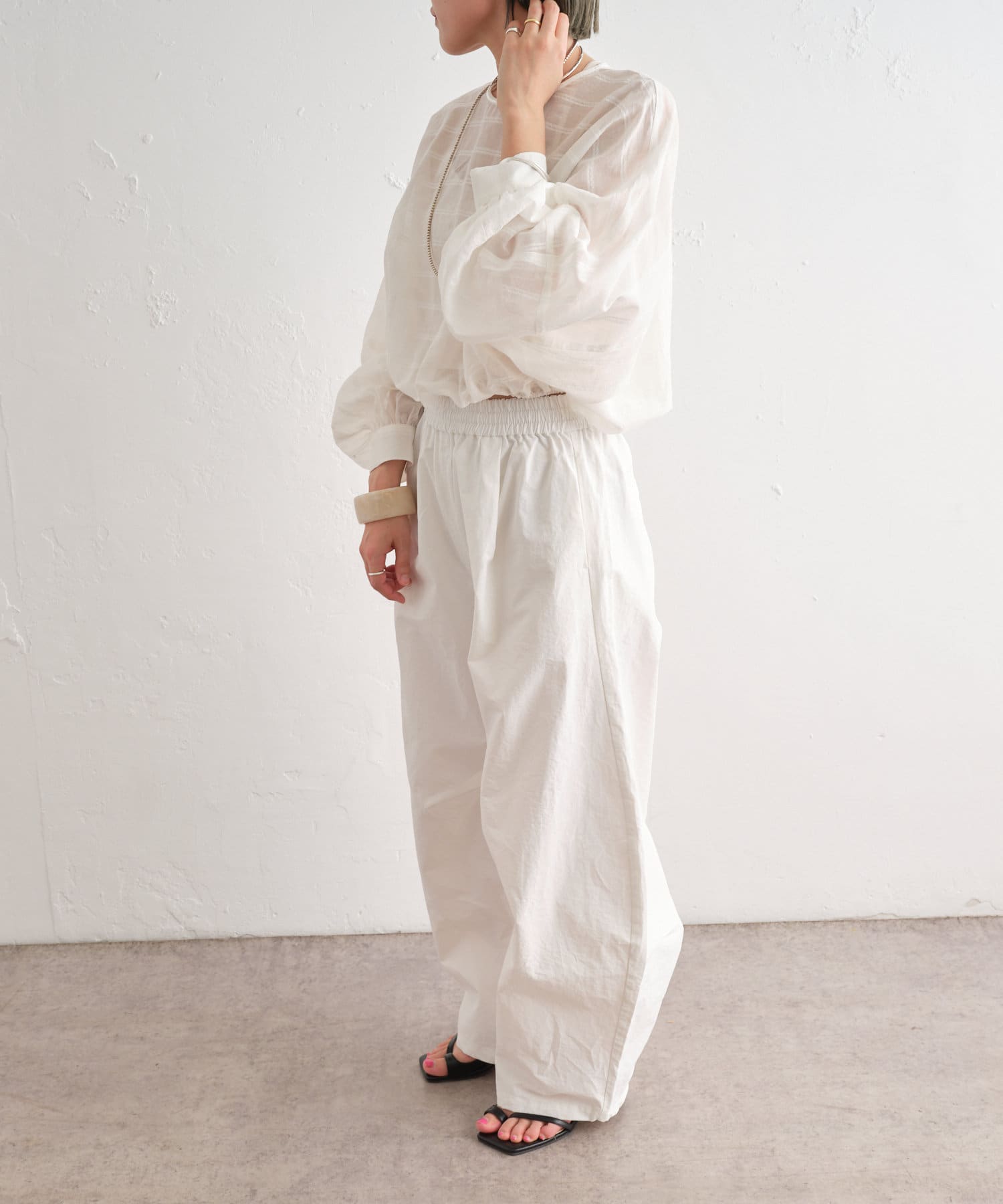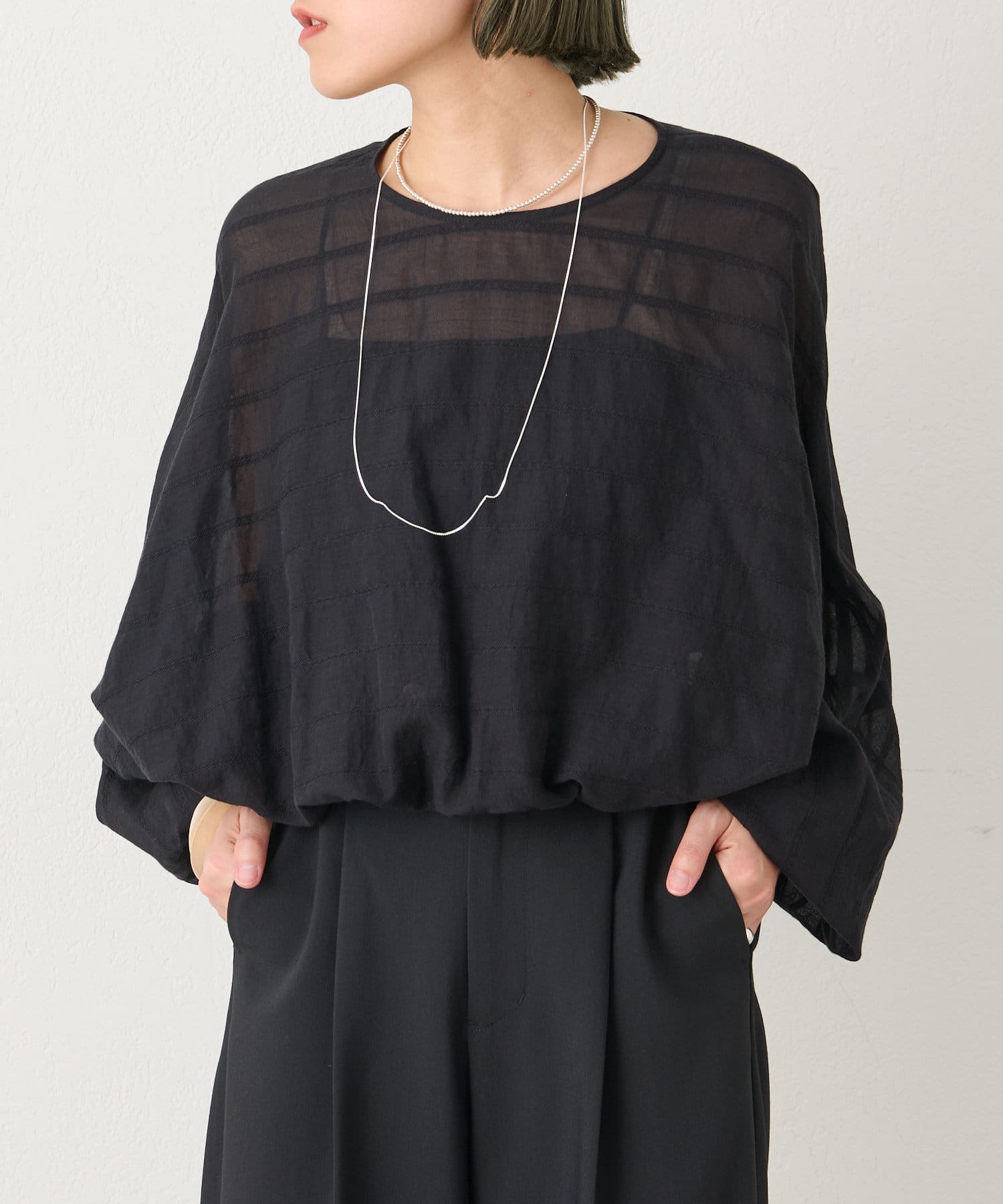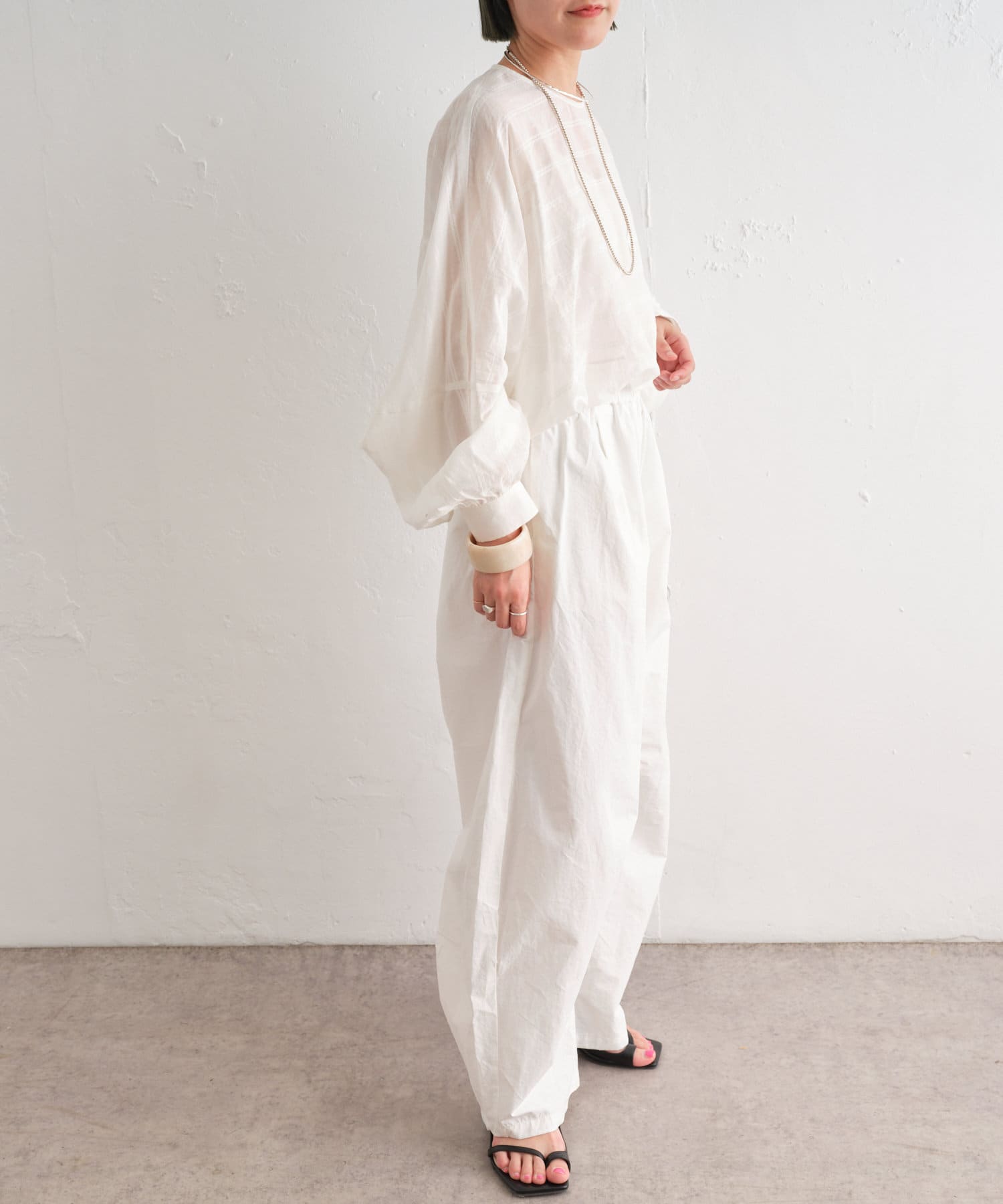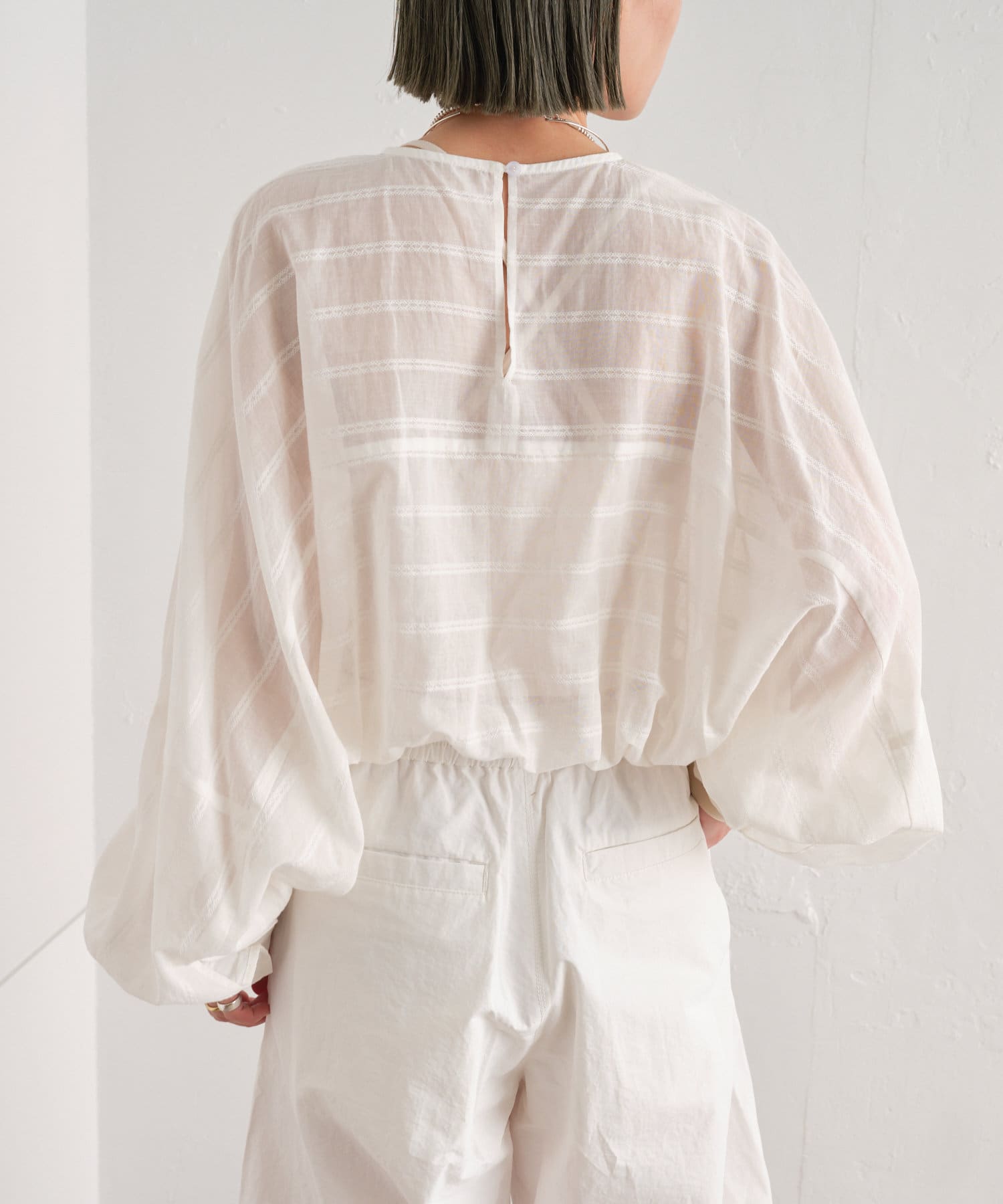 ・身幅はゆったりとしたサイズ感ながらシアー素材なので重くならず、裾にゴムが通っているのでボリューム感と丈を調整して着ていただけます。