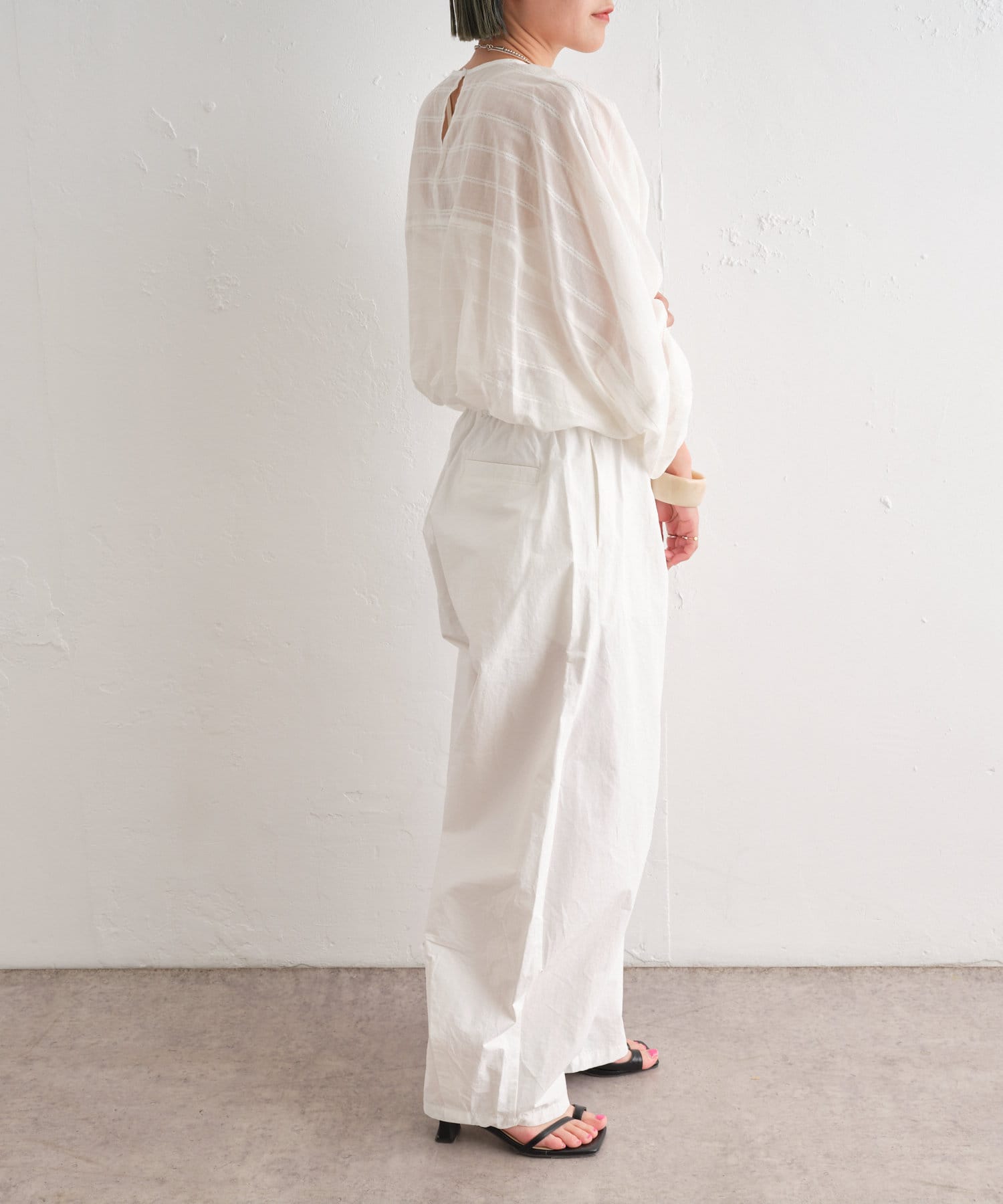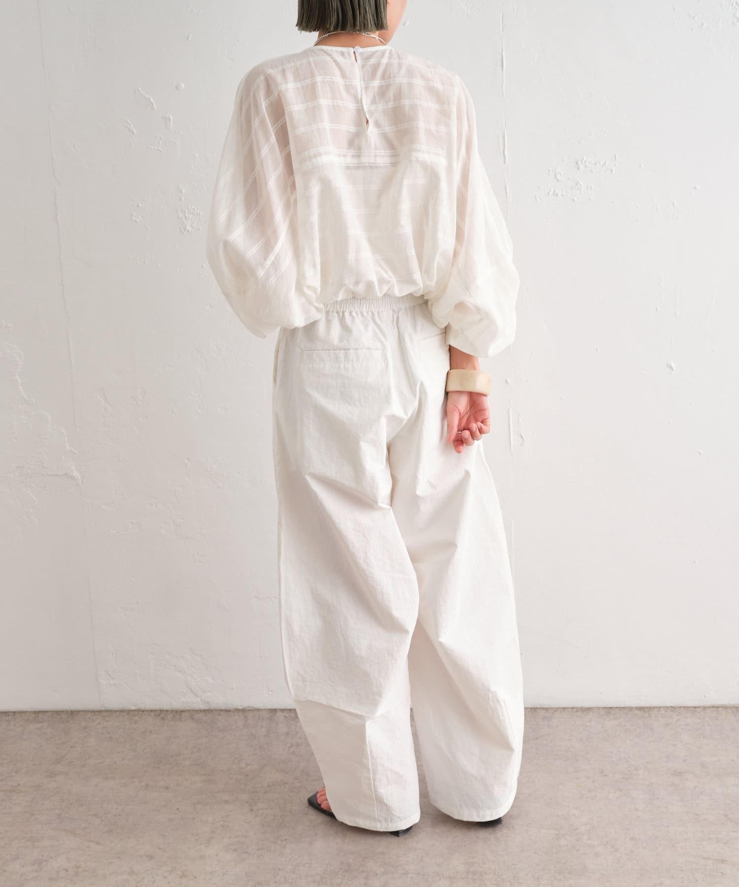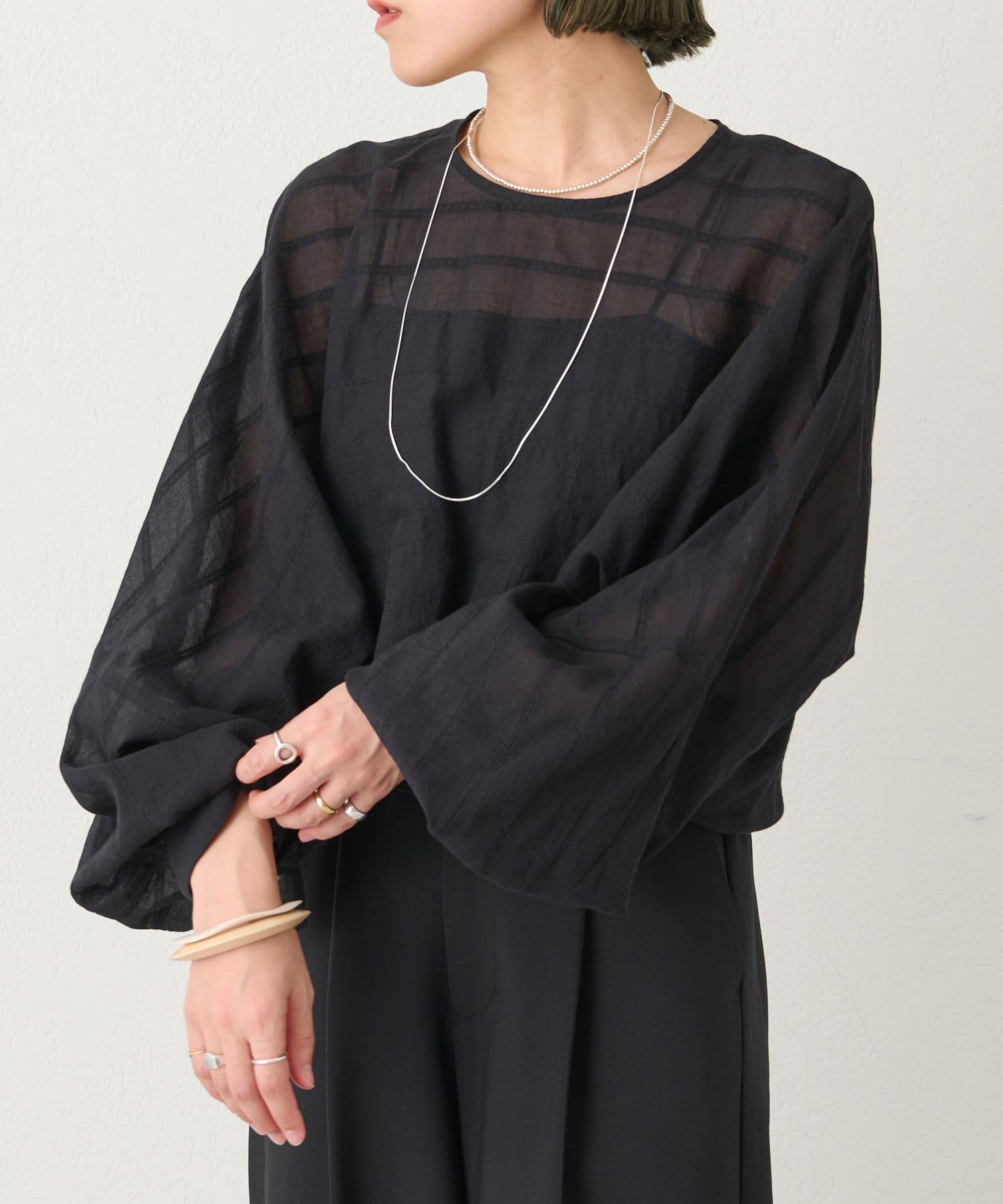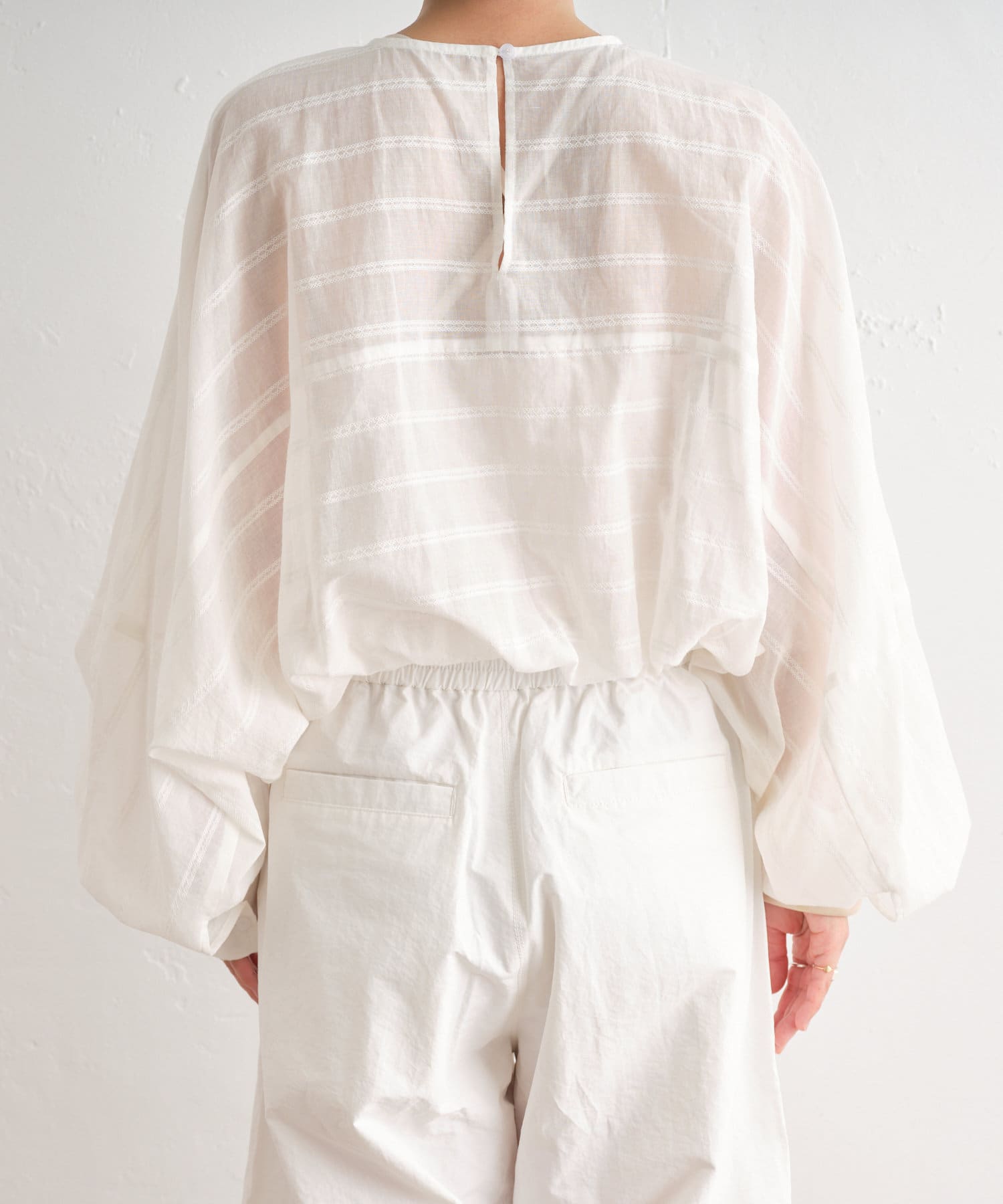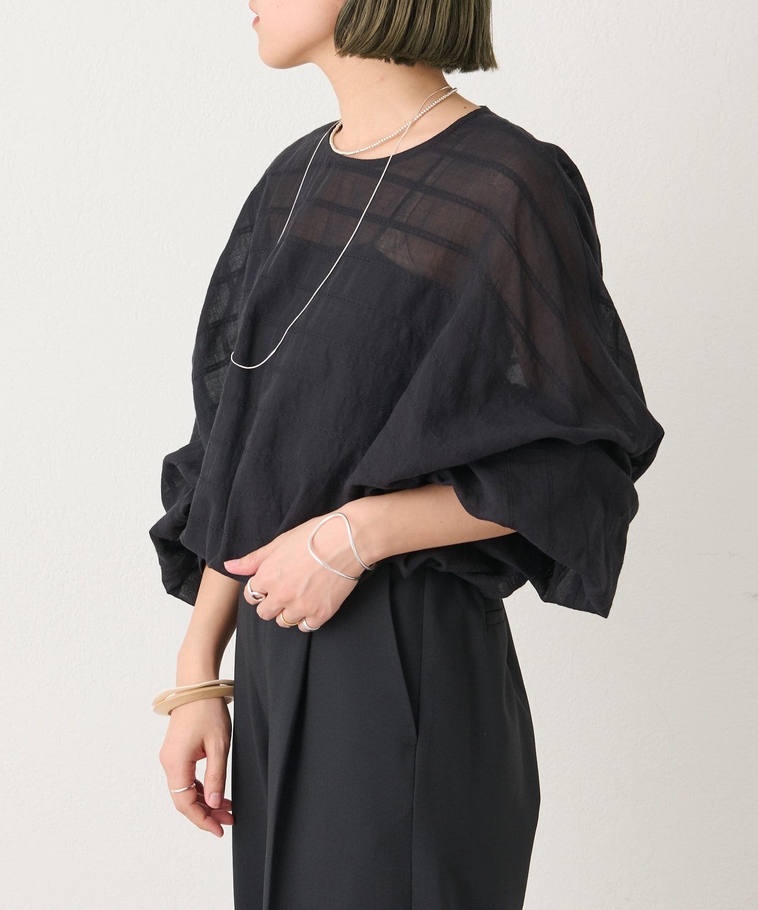 ・身幅はゆったりとしたサイズ感ながらシアー素材なので重くならず、裾にゴムが通っているのでボリューム感と丈を調整して着ていただけます。