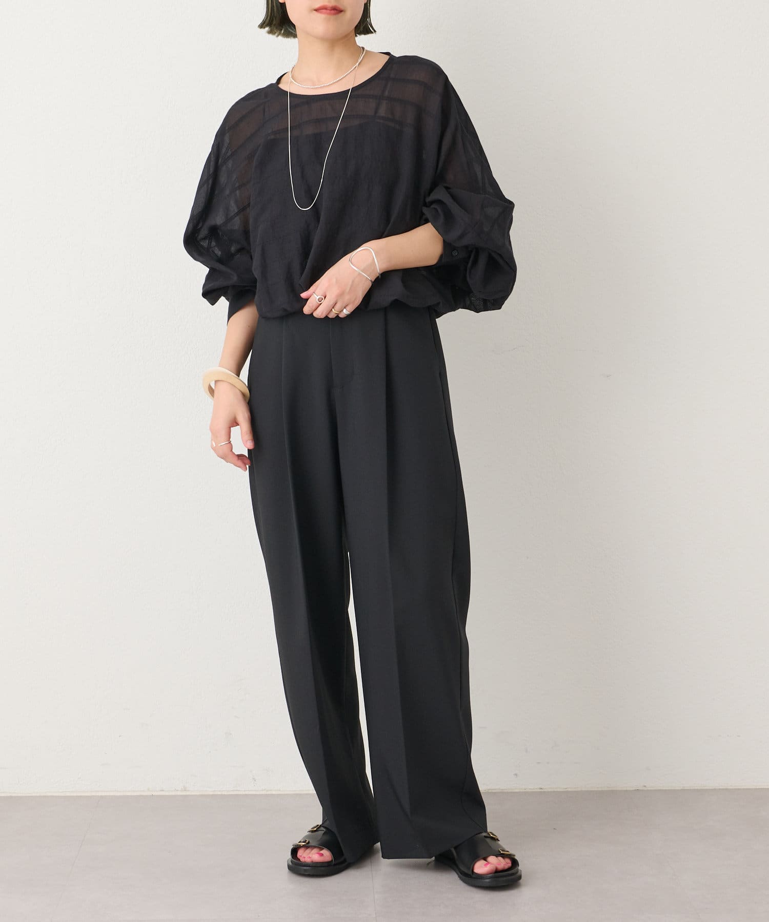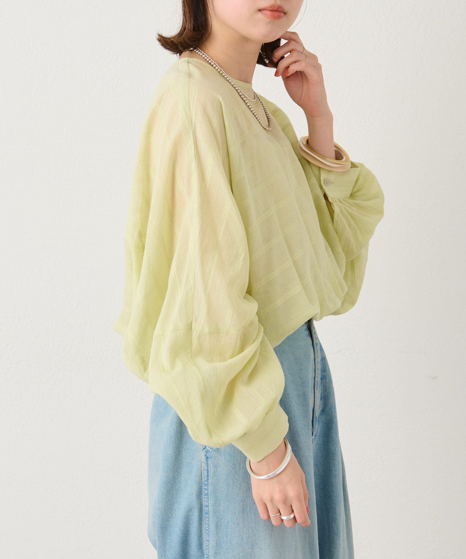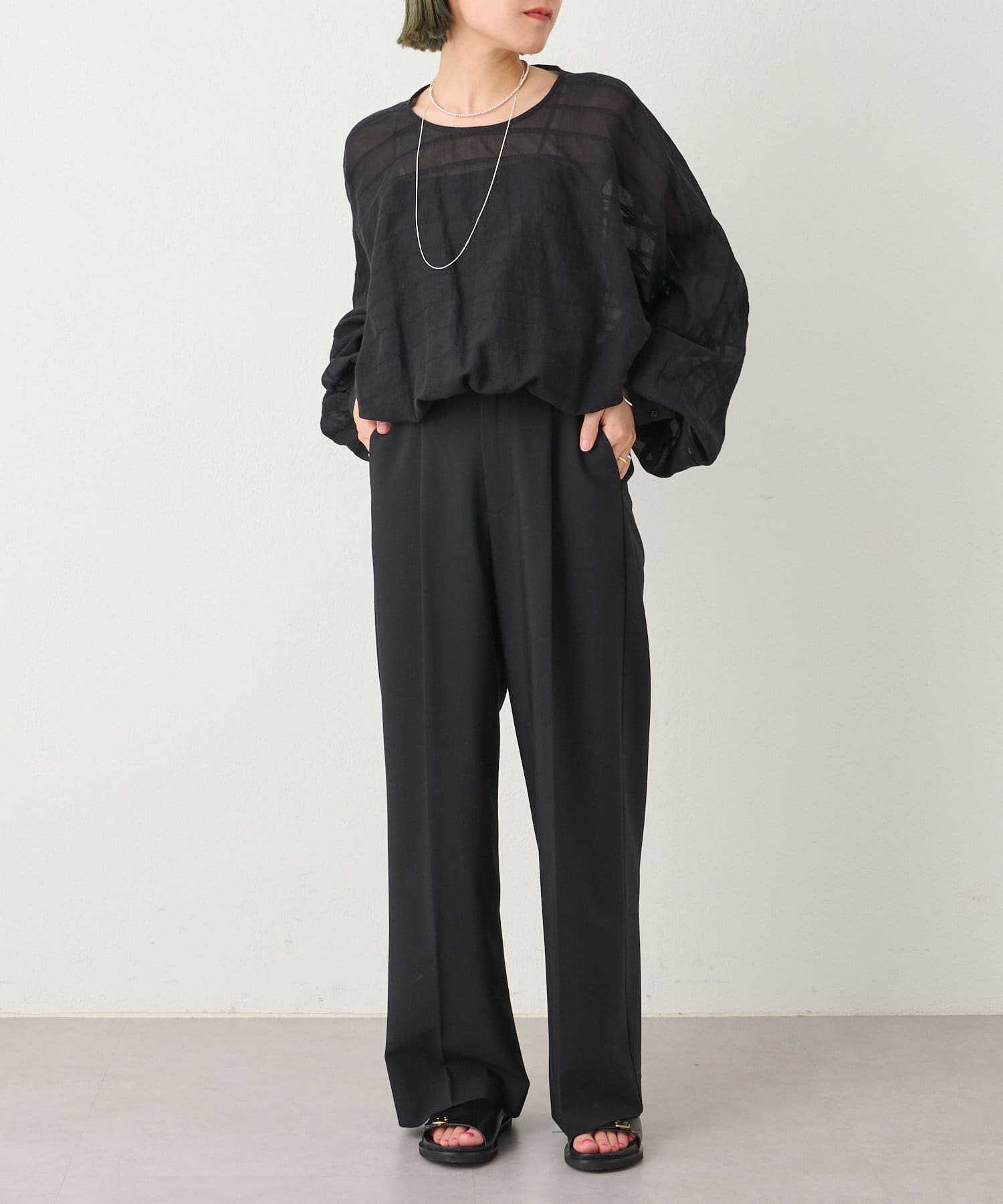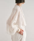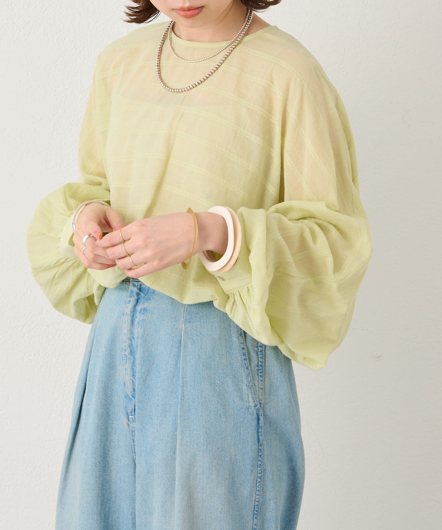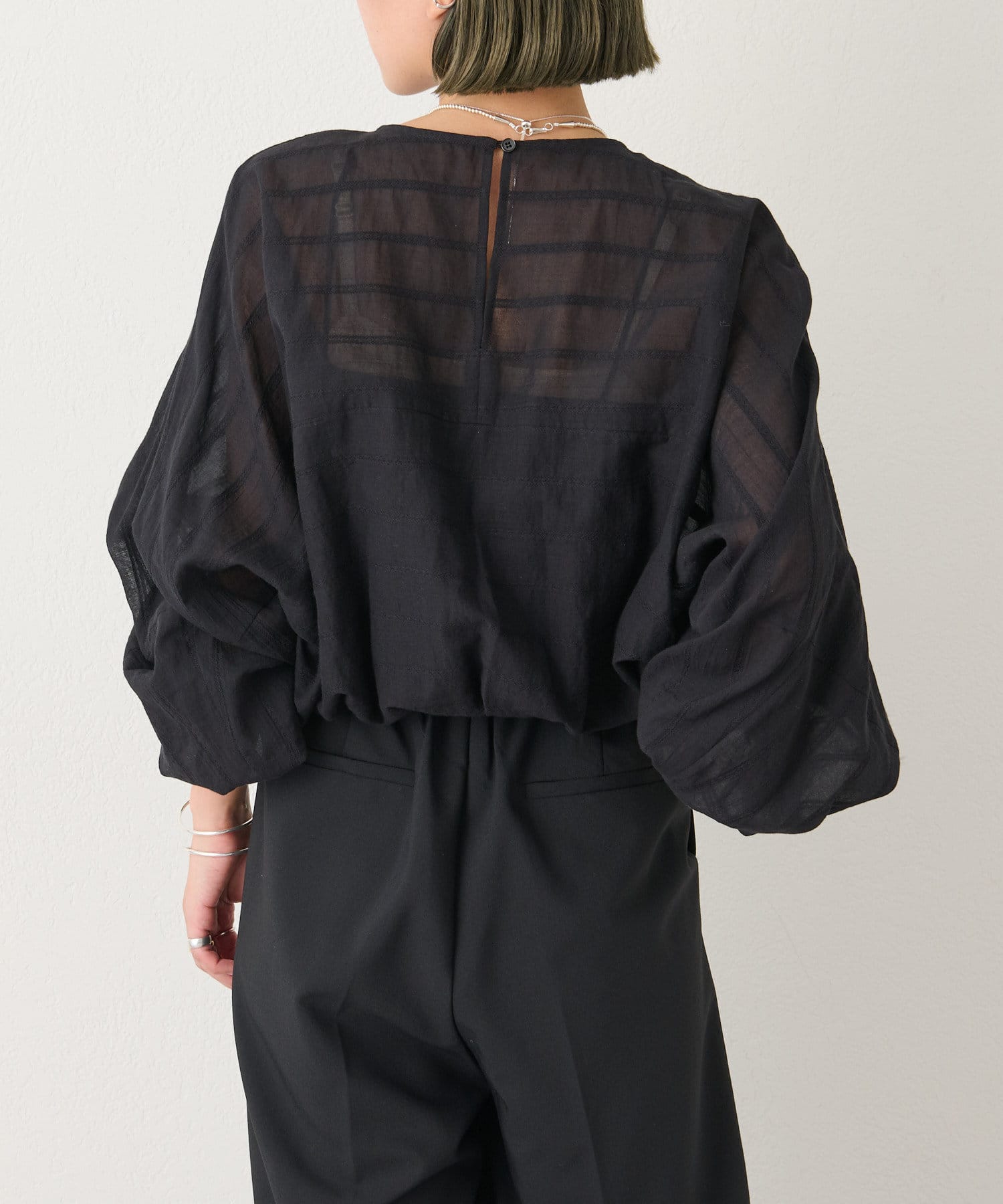 ・身幅はゆったりとしたサイズ感ながらシアー素材なので重くならず、裾にゴムが通っているのでボリューム感と丈を調整して着ていただけます。
